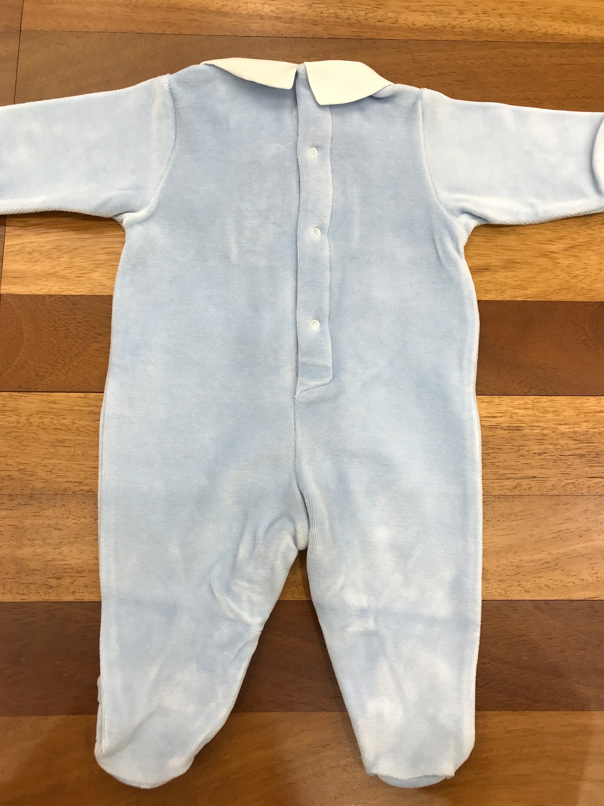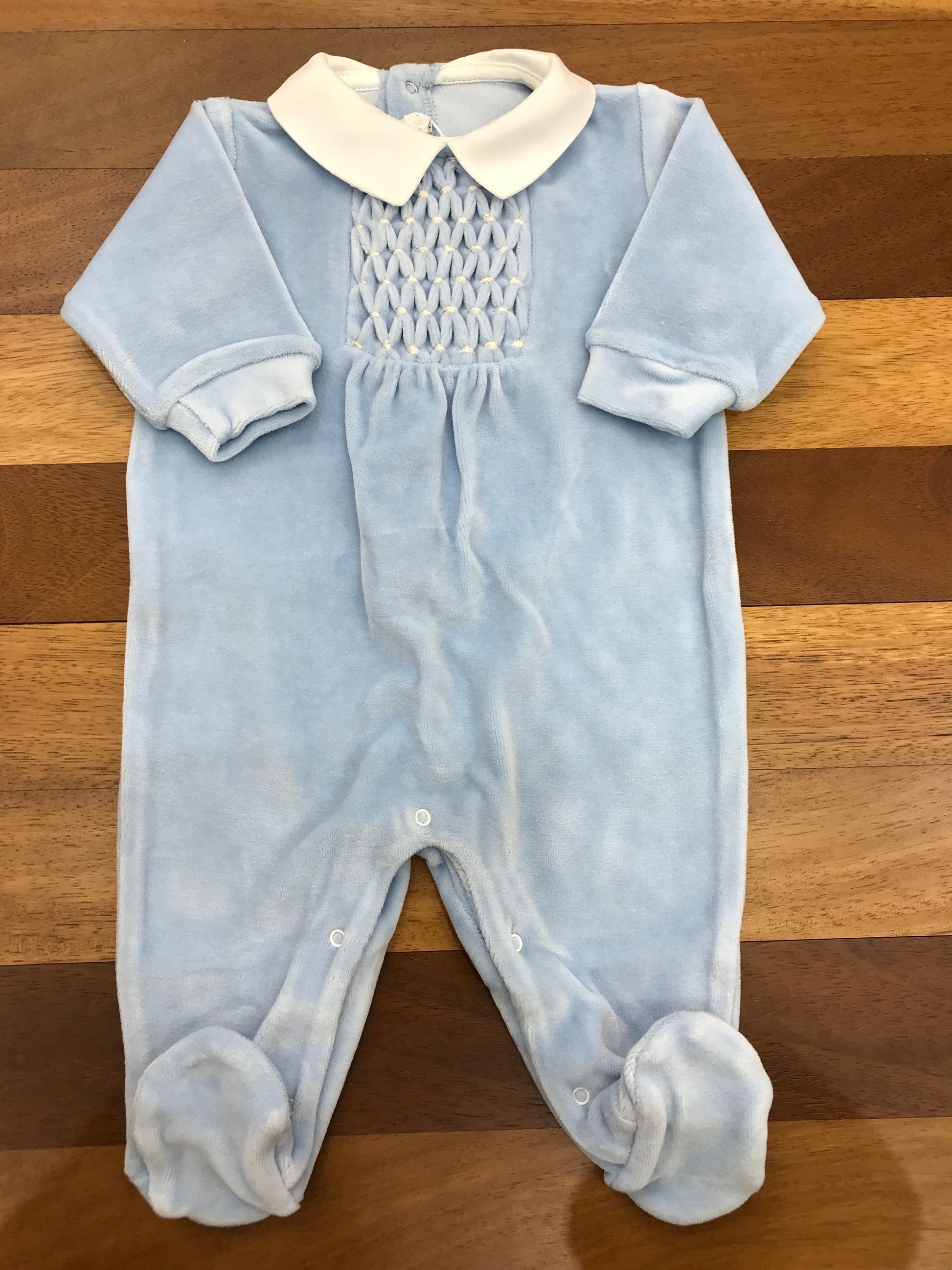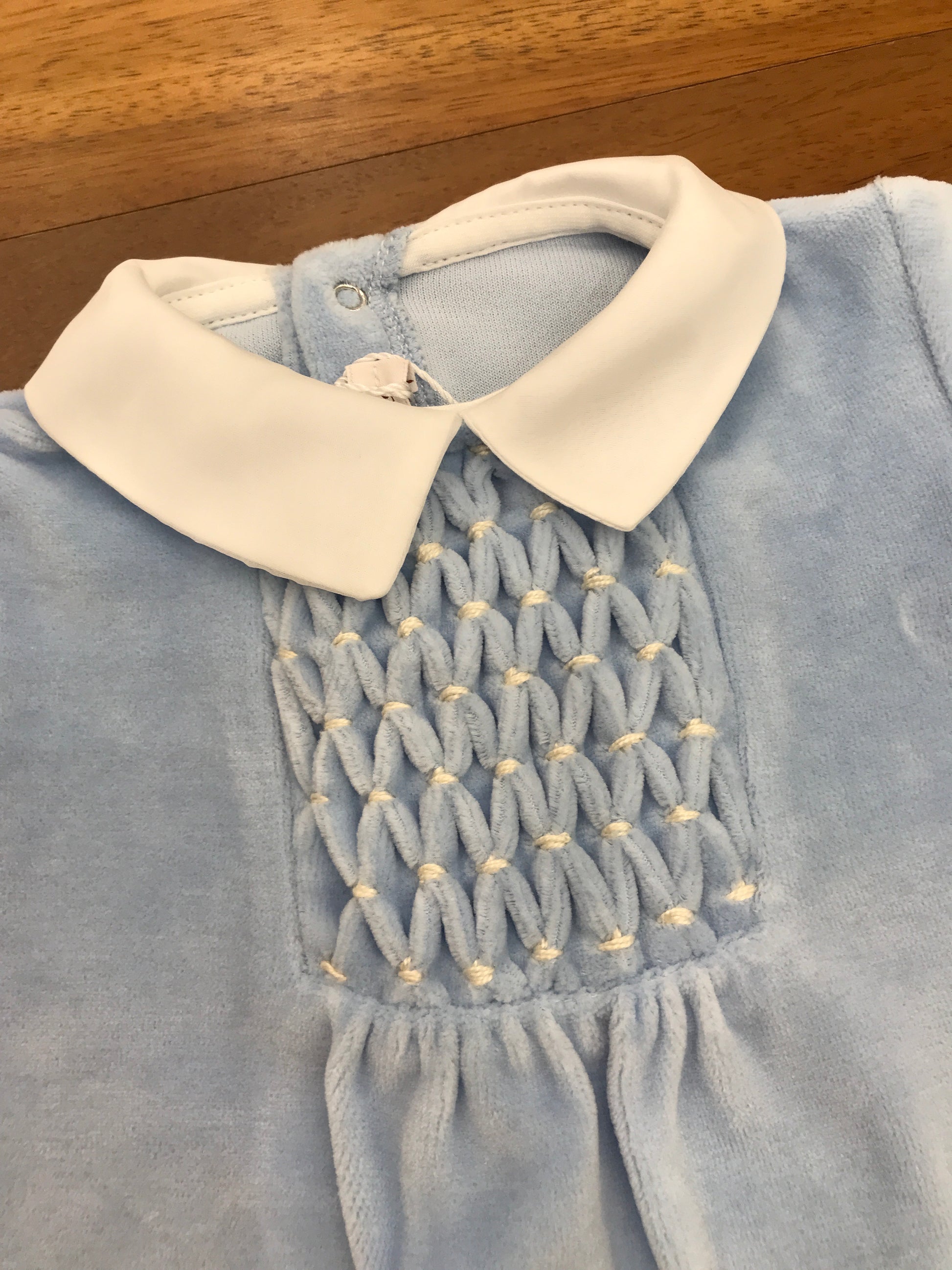 Elegante tutina intera realizzata in morbida ciniglia celeste, arricchita da piedini integrati e colletto bianco. Il corpetto presenta una raffinata lavorazione a punto smock con dettagli bianchi, conferendo al capo un'eleganza senza tempo. Un'opzione sofisticata per i piccoli, che unisce comfort e stile ricercato.