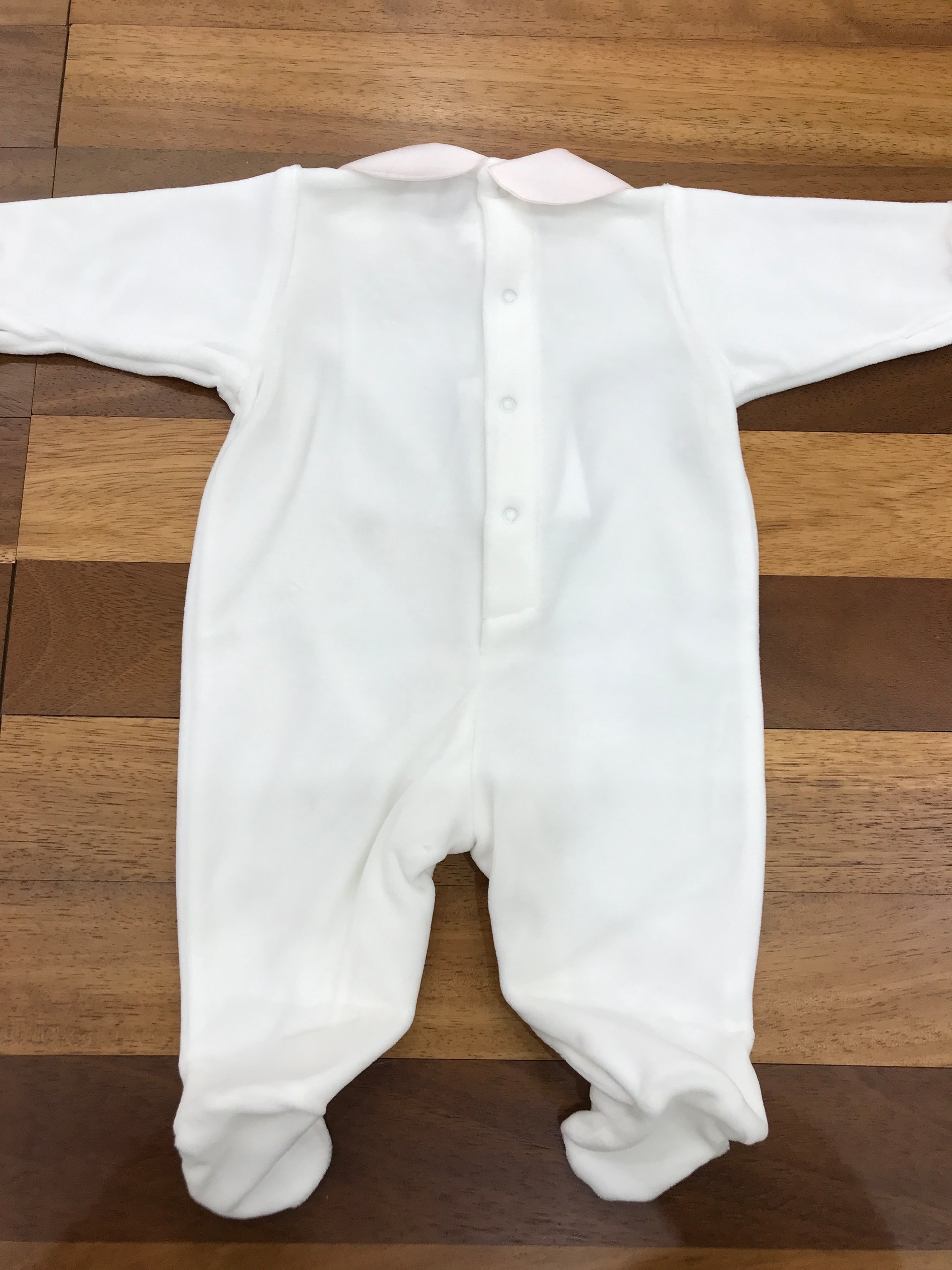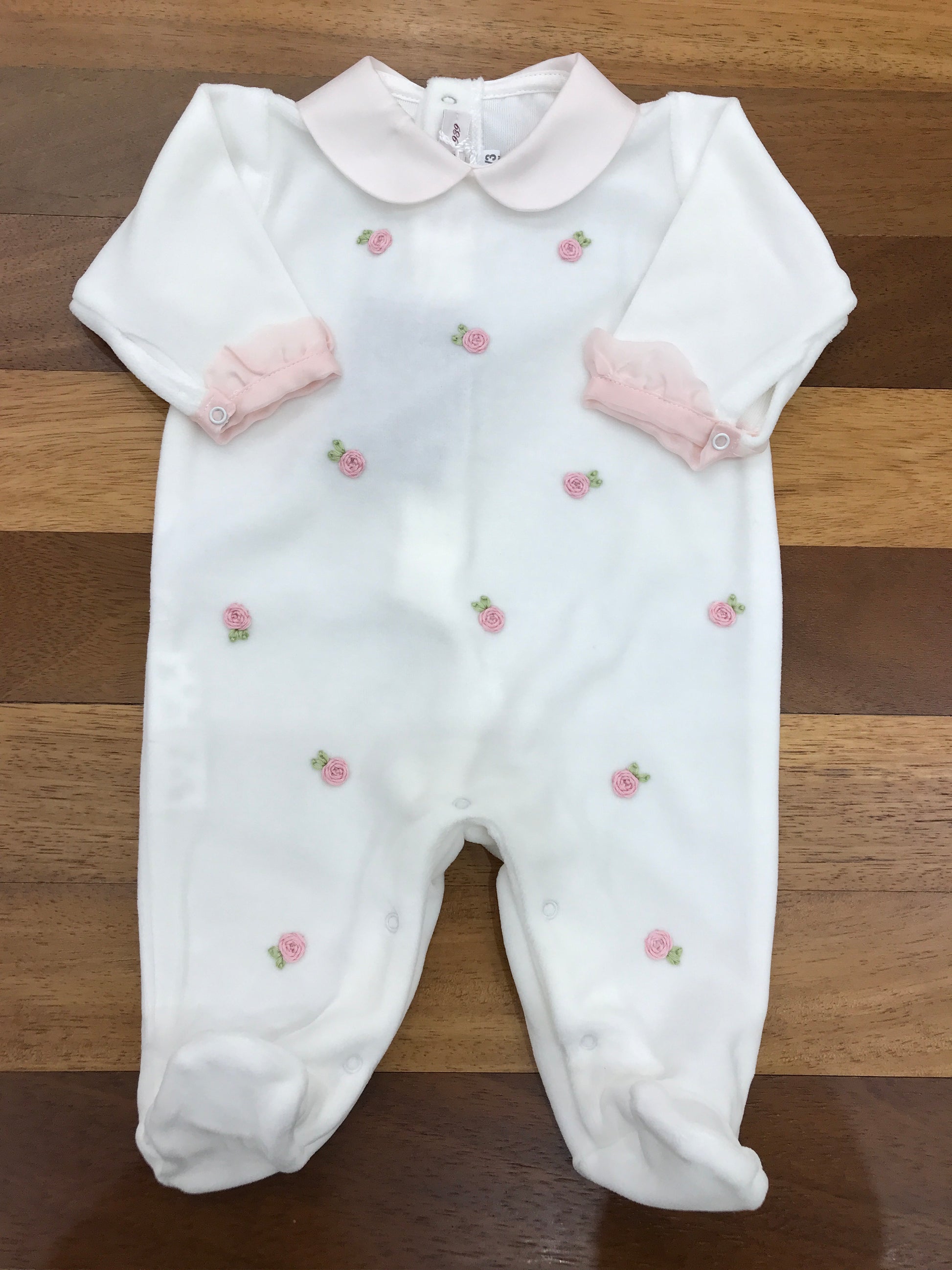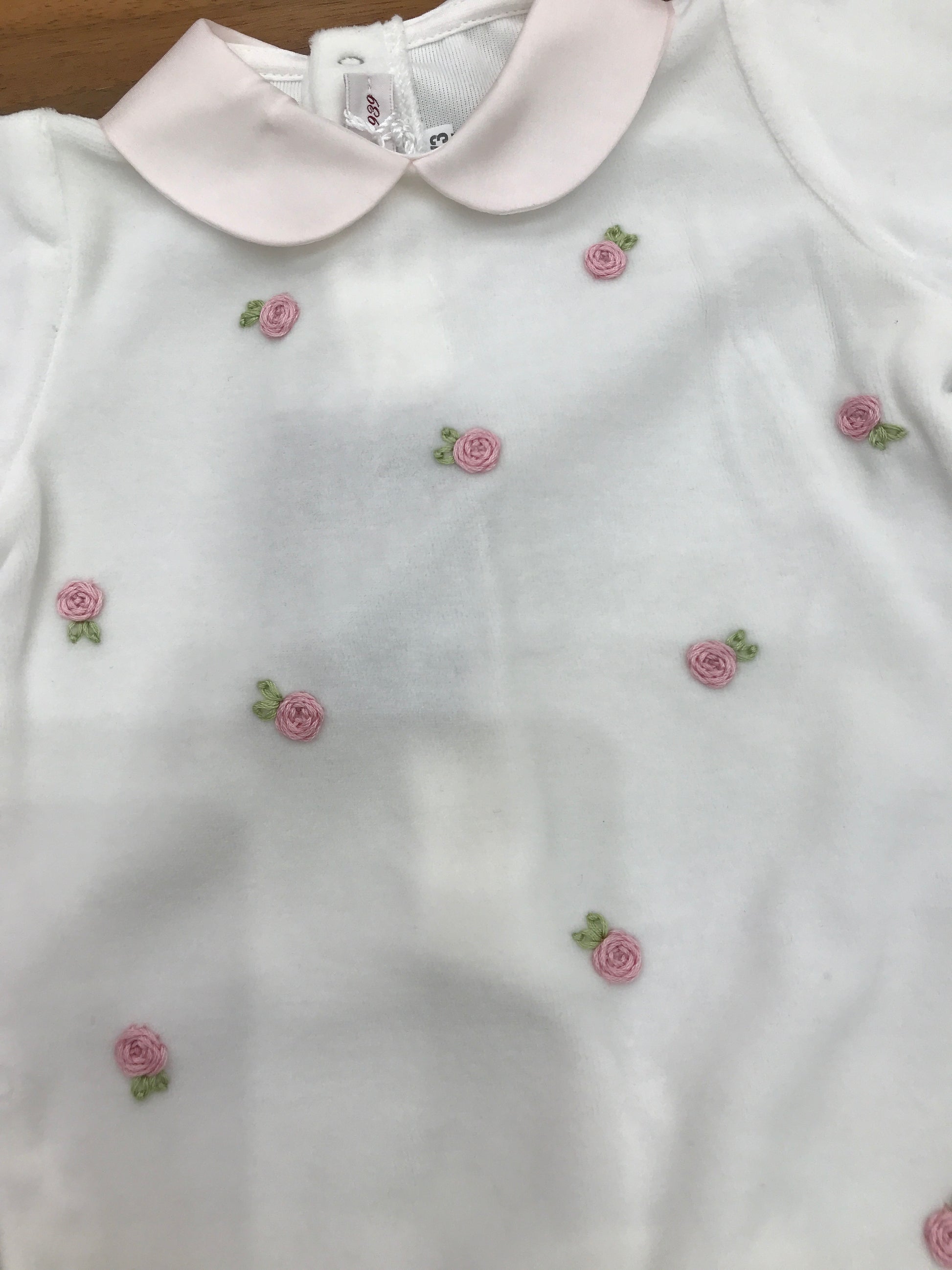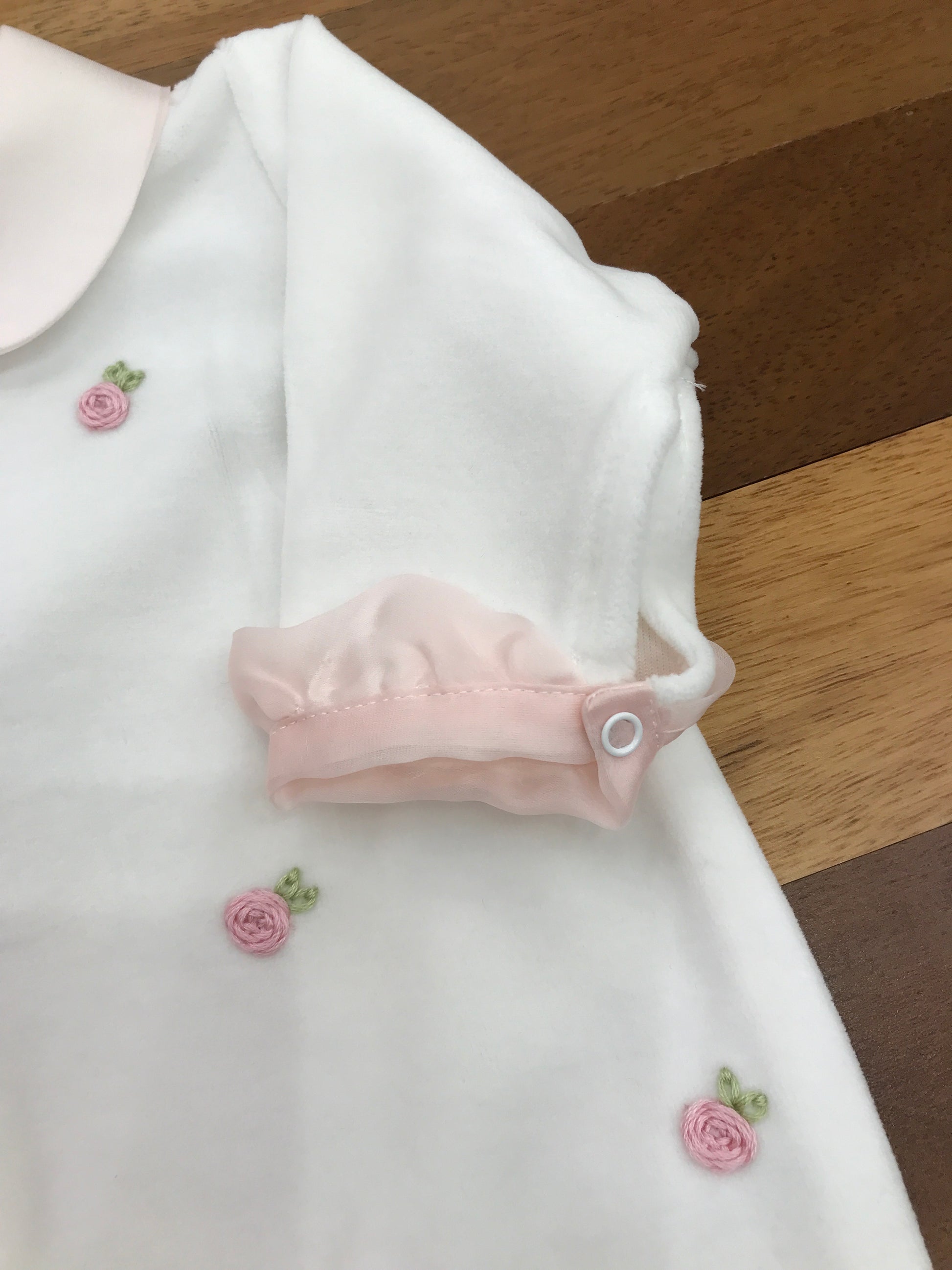 Delicata tutina in ciniglia con ricamo di roselline tridimensionali che decorano elegantemente il fronte. Caratterizzata da un raffinato colletto rosa e da preziose rusche applicate lungo le maniche, questa creazione rappresenta un capo di qualità superiore per i più piccoli. Ogni dettaglio è stato curato con attenzione per garantire comfort e stile.