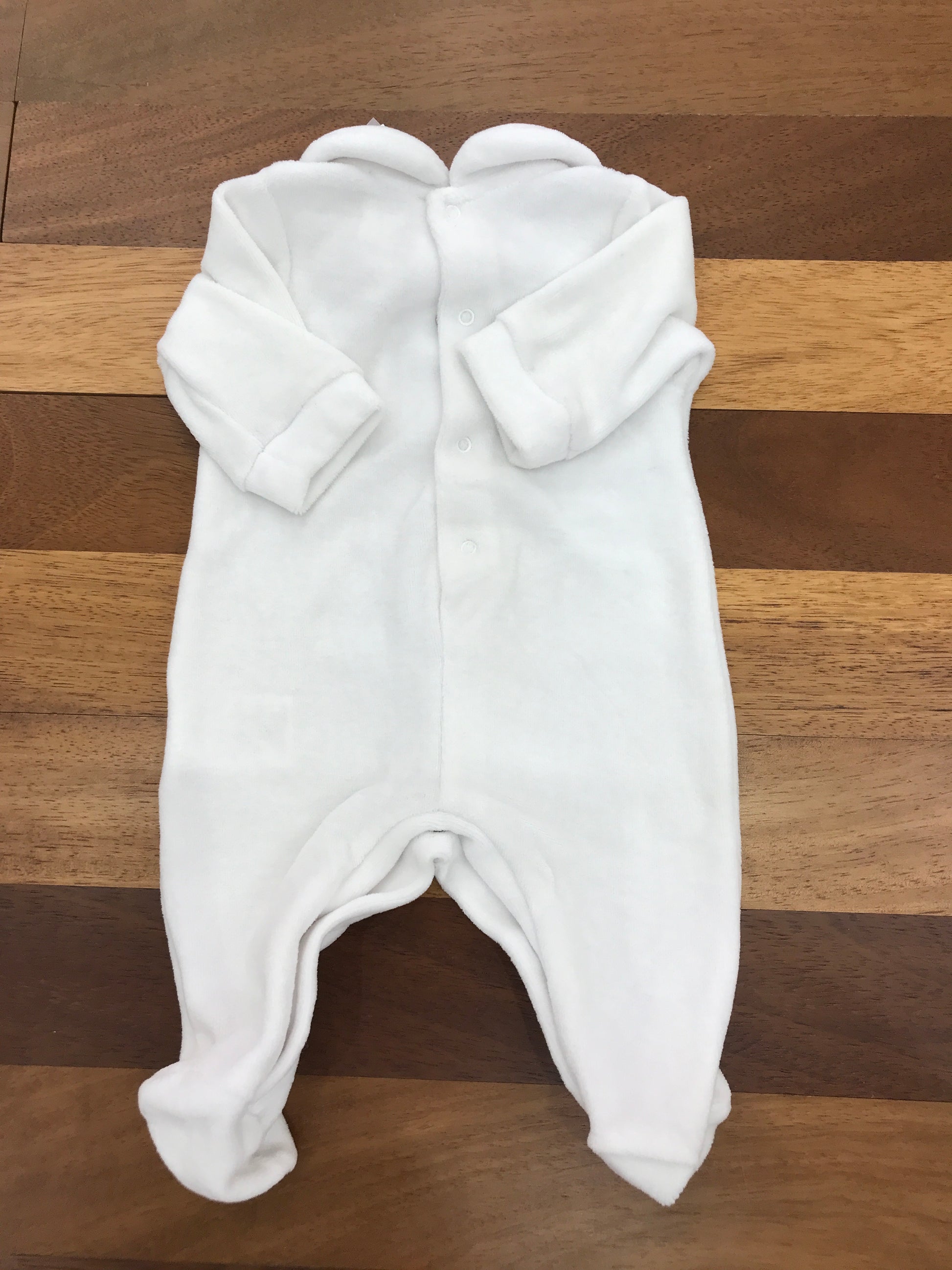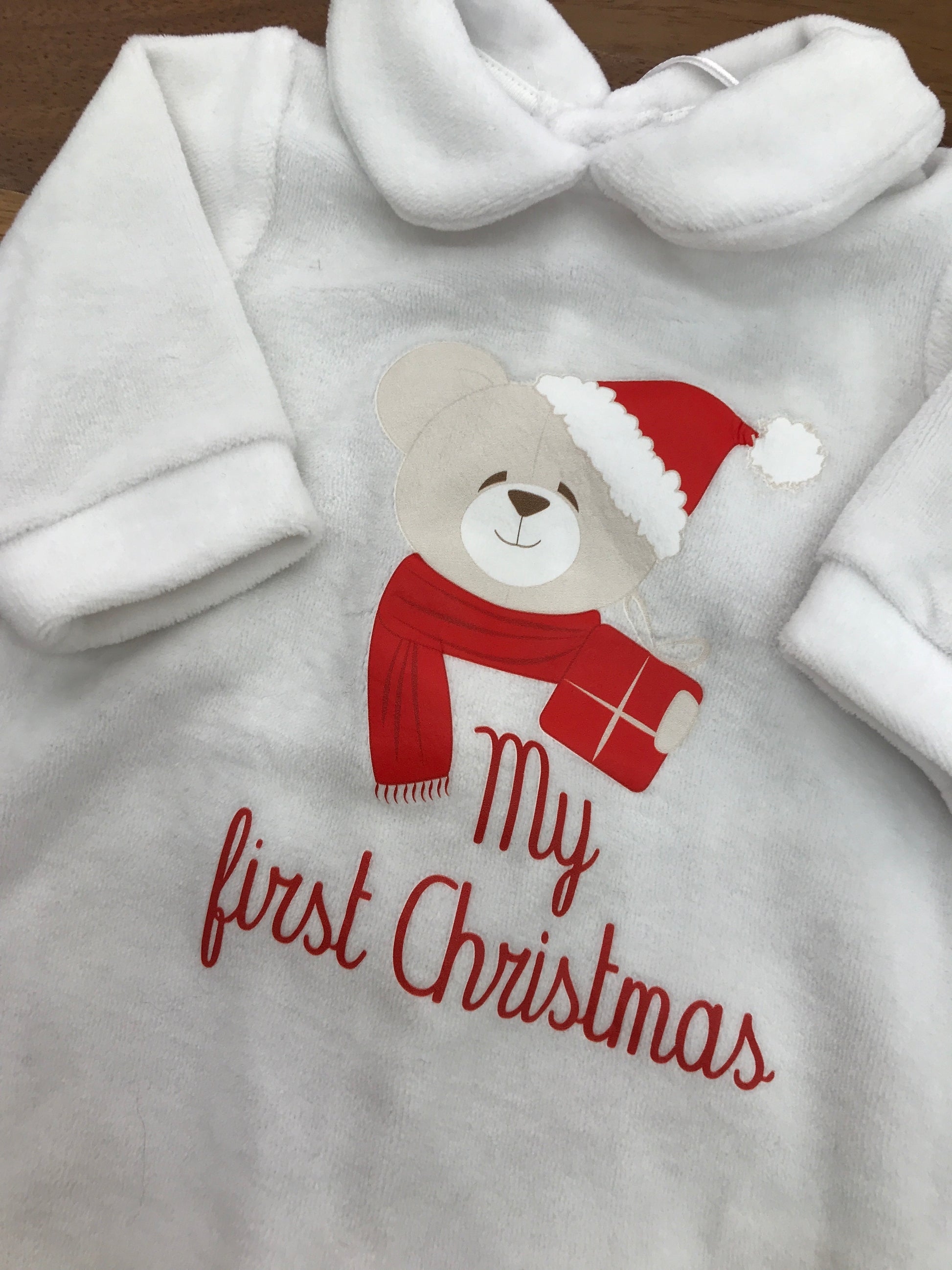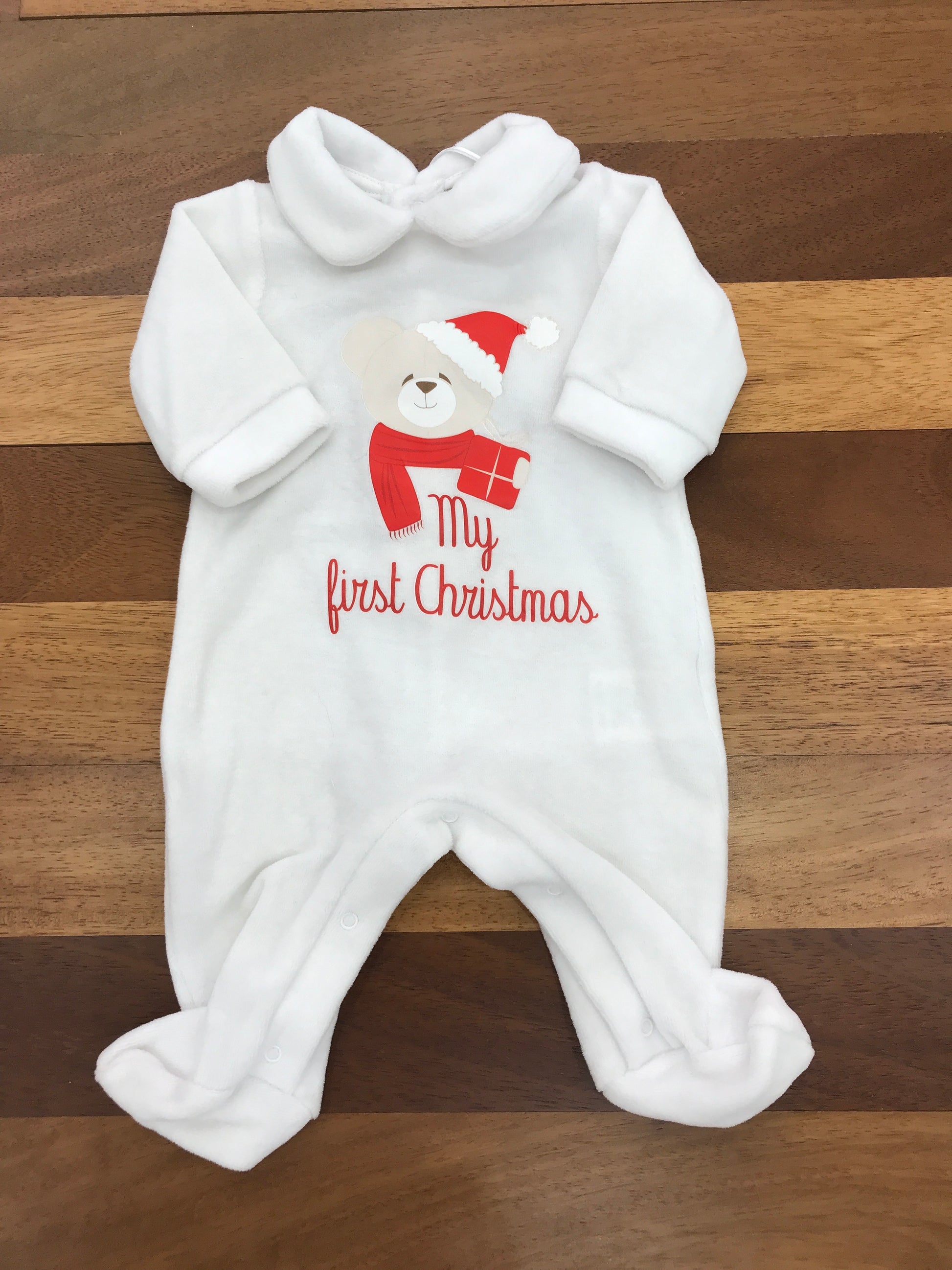 Elegante tutina intera realizzata in morbida ciniglia bianca, arricchita da un delicato orsetto natalizio applicato sul petto. La scritta "My First Christmas" in inglese completa il design, rendendola la scelta ideale per celebrare il primo Natale del vostro bambino con stile e calore.