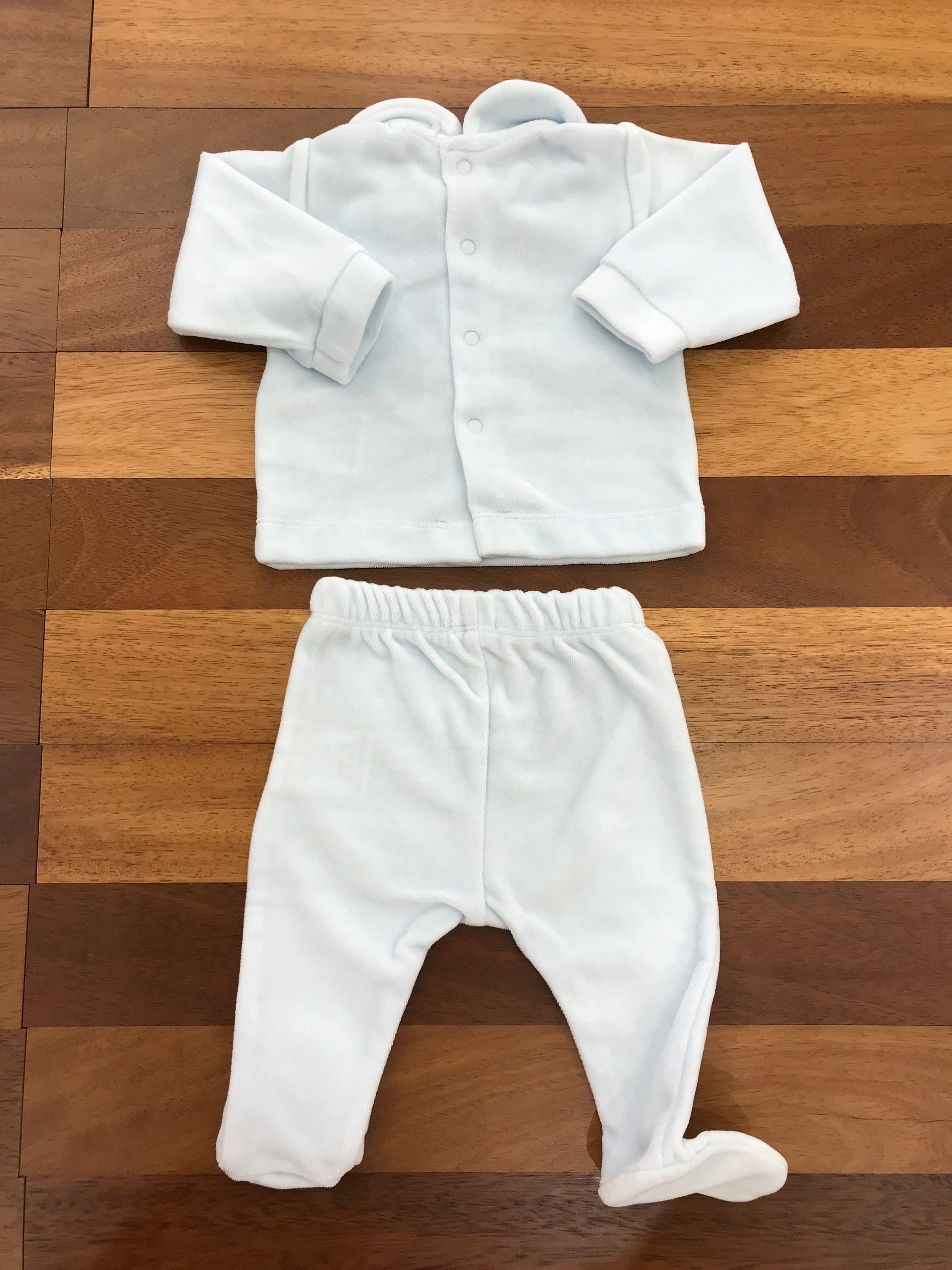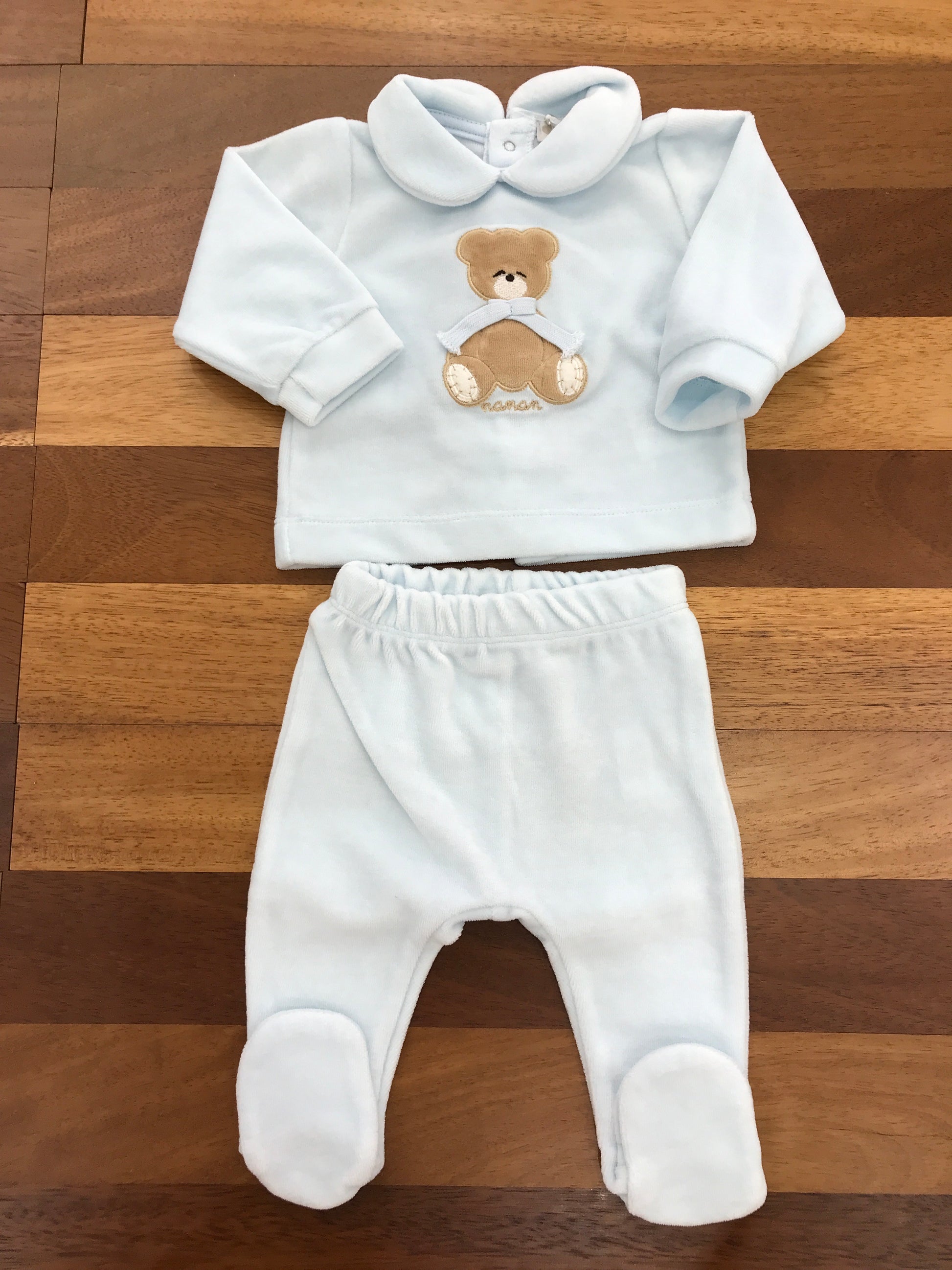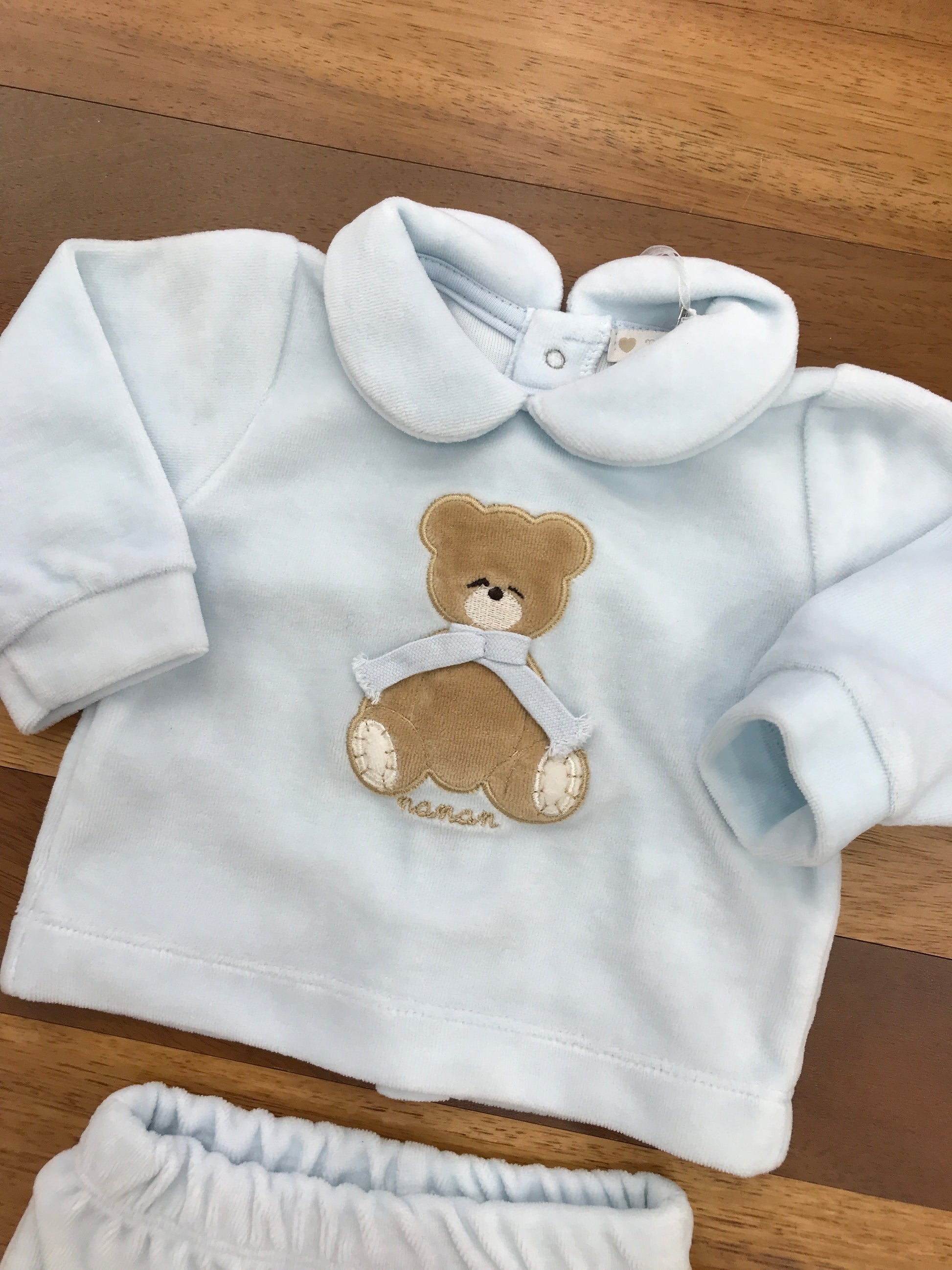 Completo in morbida ciniglia a due pezzi nelle tonalità del celeste. La tutina presenta piedini integrati per una vestibilità comoda e pratica, mentre la parte superiore è impreziosita da un delicato orsetto in peluche applicato sul davanti. Un capo pensato per garantire comfort e dolcezza nei momenti di riposo del vostro bambino.