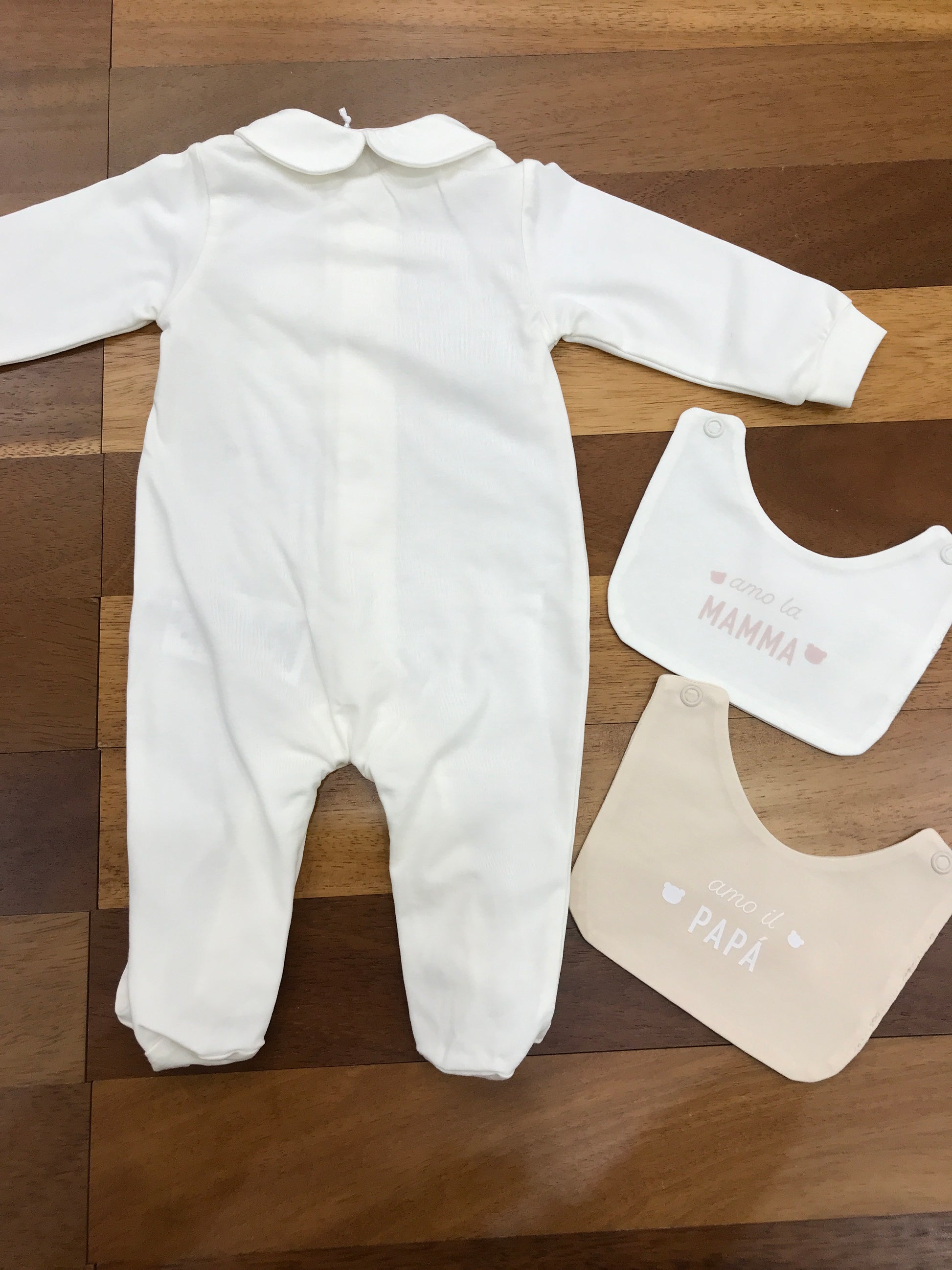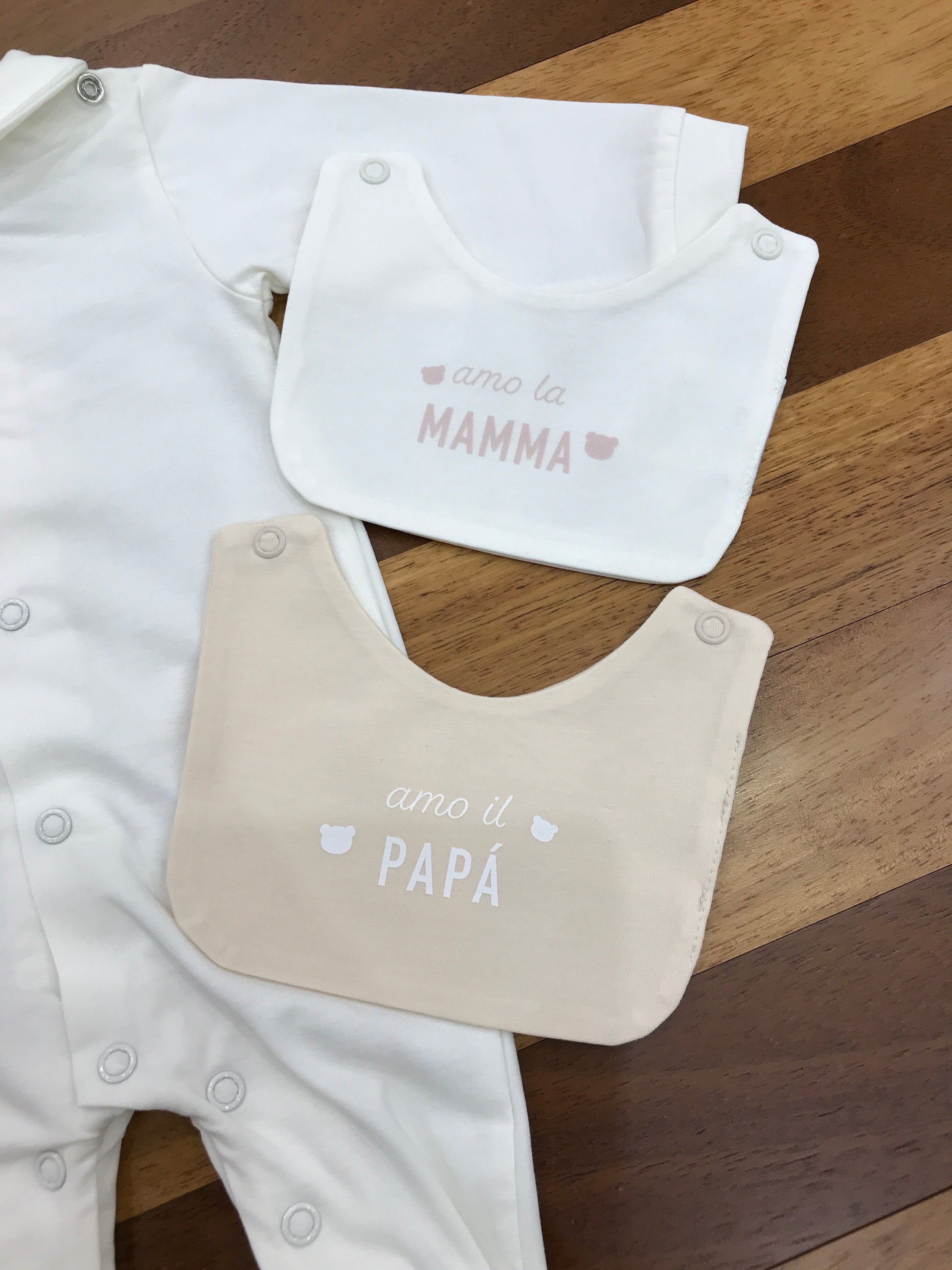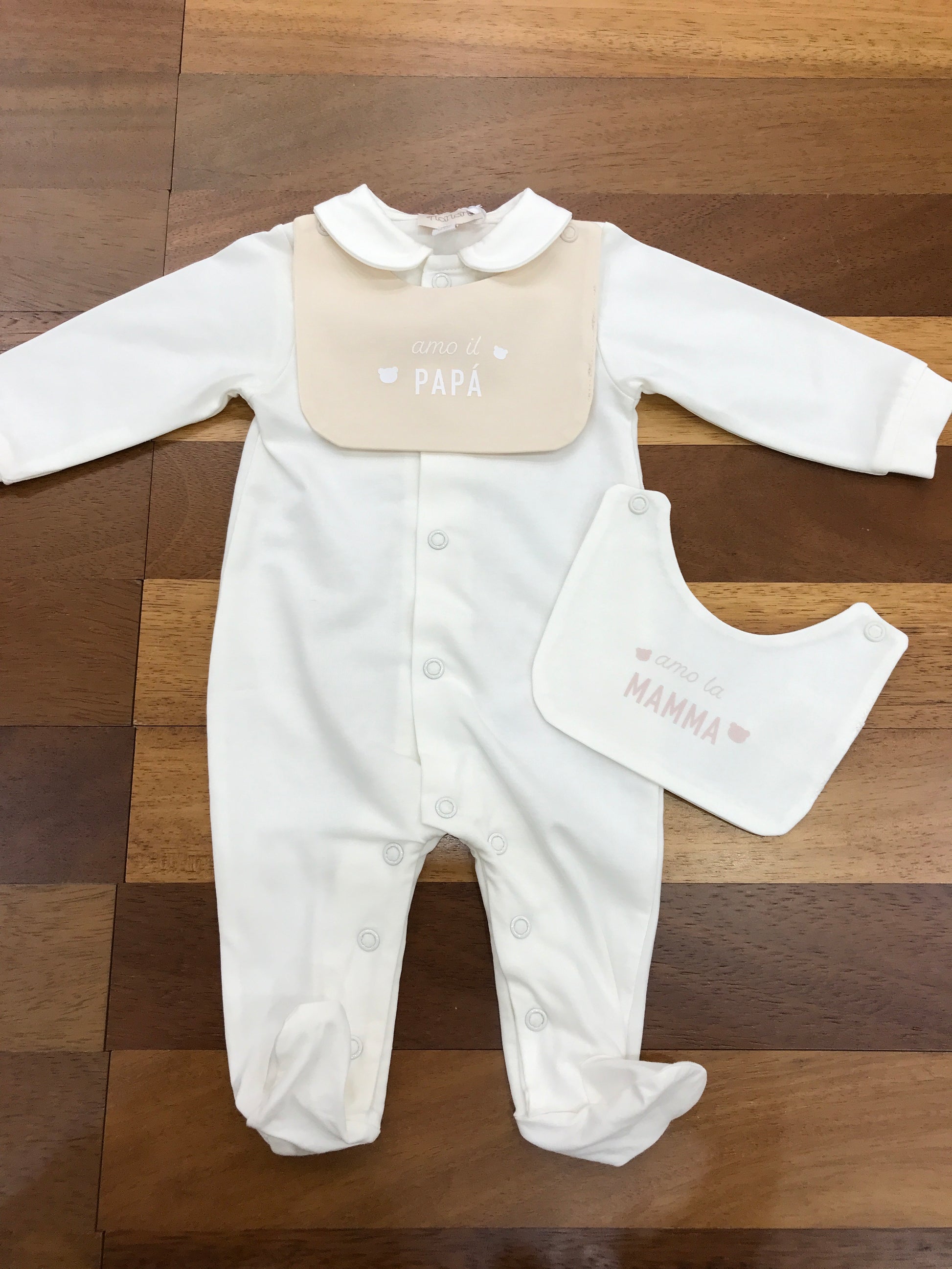 Tutina in puro cotone di qualità superiore, disponibile nella delicata tonalità panna. Il capo presenta una vestibilità intera con piedini integrati, garantendo comfort e praticità durante i cambi. Completa di due bavaglini coordinati: uno beige con la scritta "Amo il papà" e uno in panna con "Amo la mamma". Una scelta elegante e significativa per i piccoli.