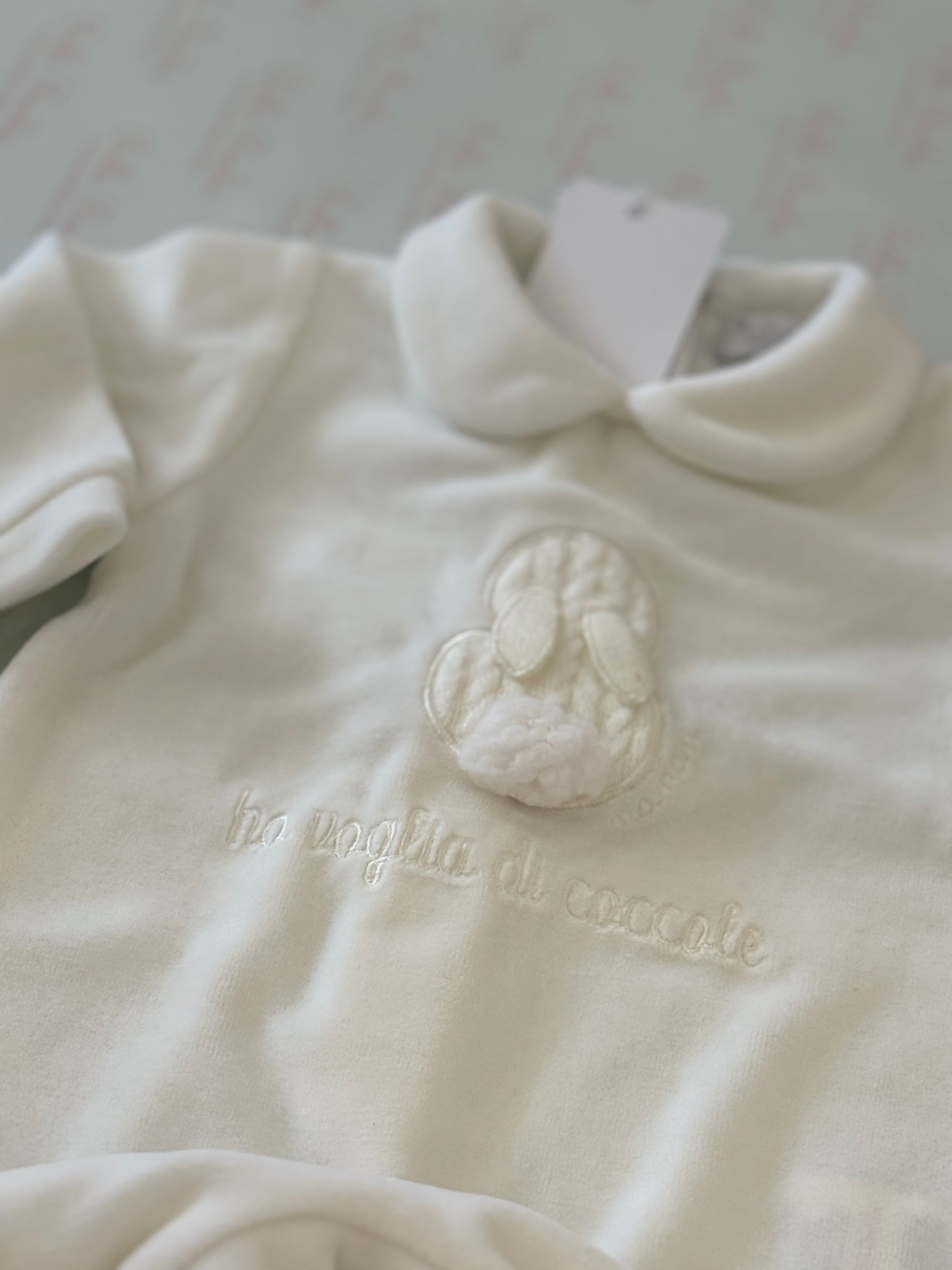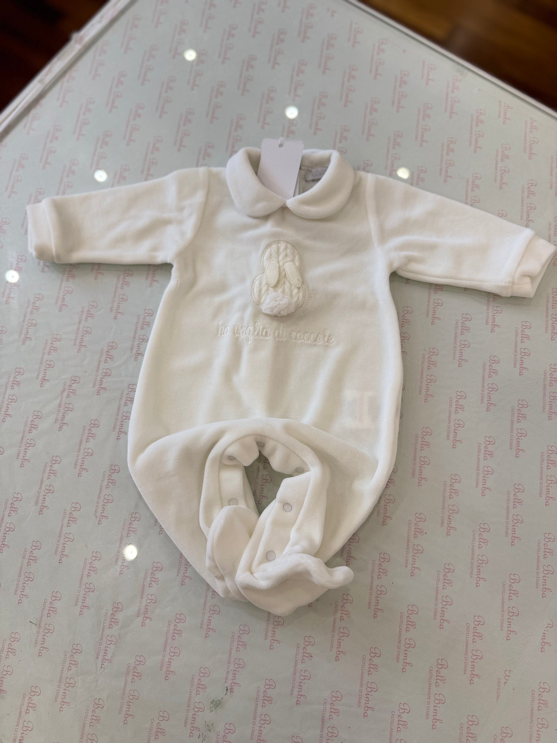 Questa tutina intera in ciniglia è perfetta per tenere al caldo il tuo piccolo . Realizzata con morbidissimo materiale e arricchita con un grazioso coniglio applicato sul davanti, questa tutina è un must-have per i bebè alla moda. Non solo carina ma anche funzionale, per un look adorabile e confortevole.