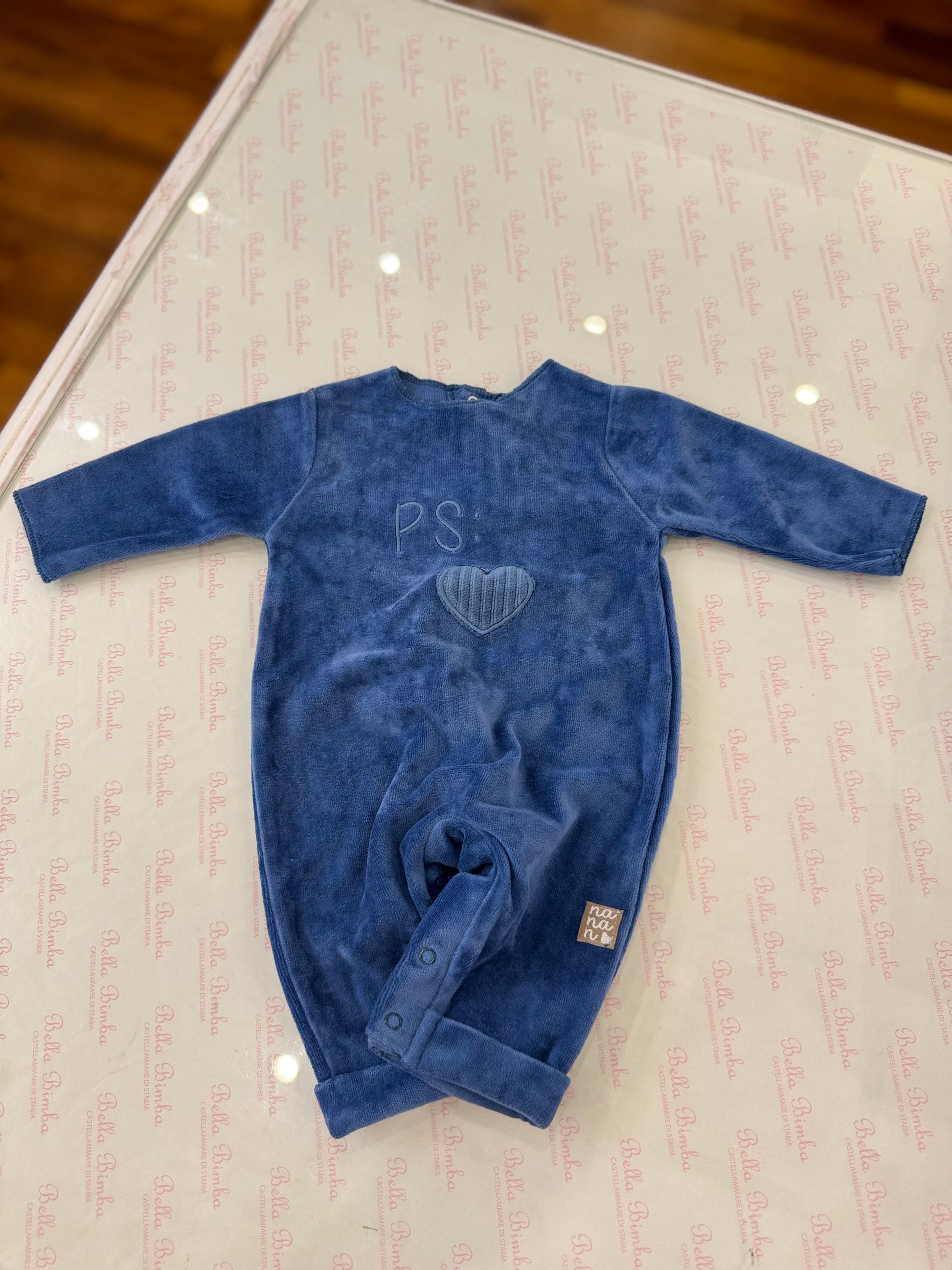 Questa tutina in morbida ciniglia, senza collo, presenta un elegante ricamo del logo Nanan e un cuore centrale. Ideale per tenere il tuo bambino caldo e coccolato, è perfetta per ogni occasione. Realizzata con cura e amore, è un must-have per i genitori attenti allo stile del loro bambino.