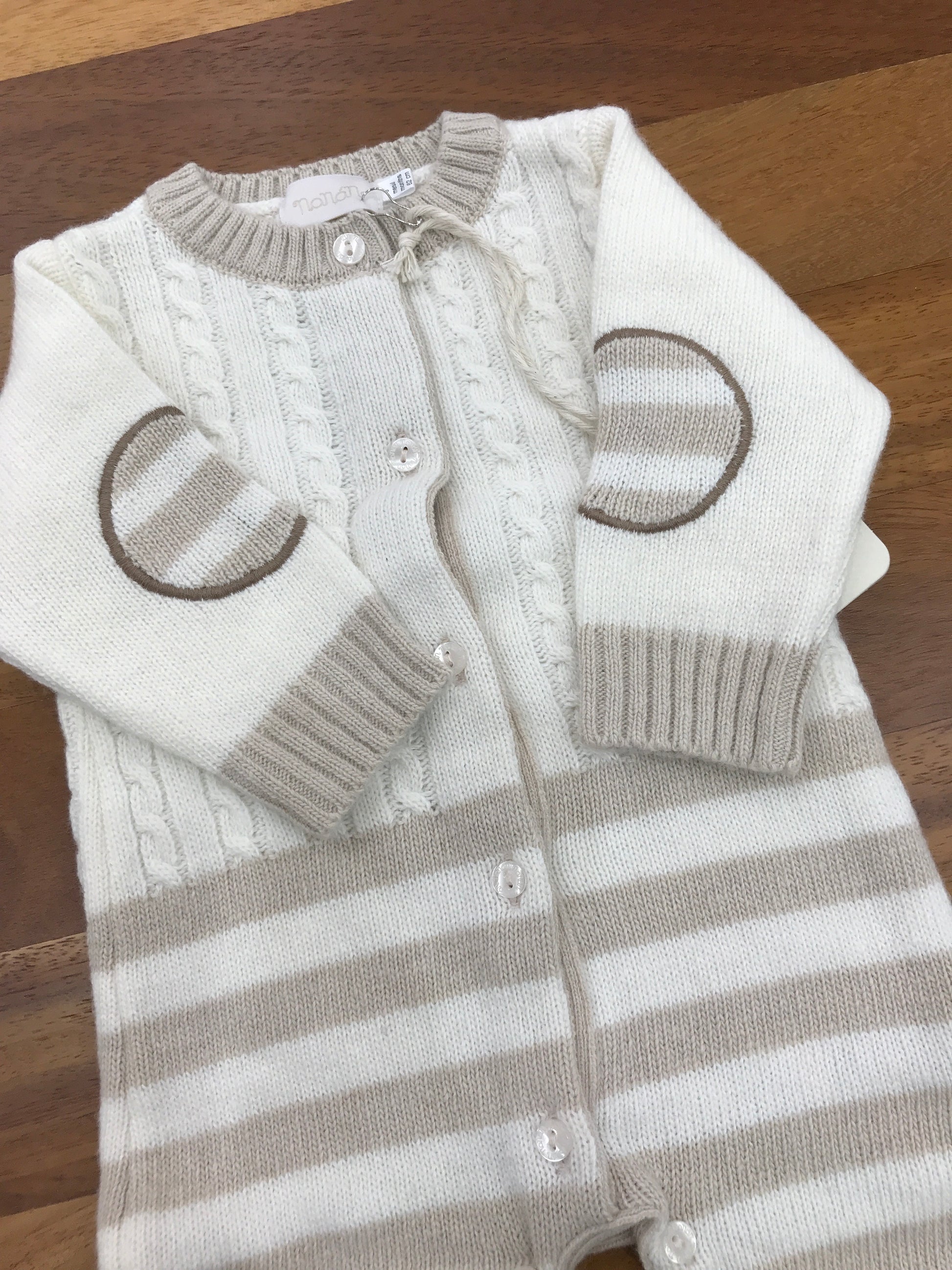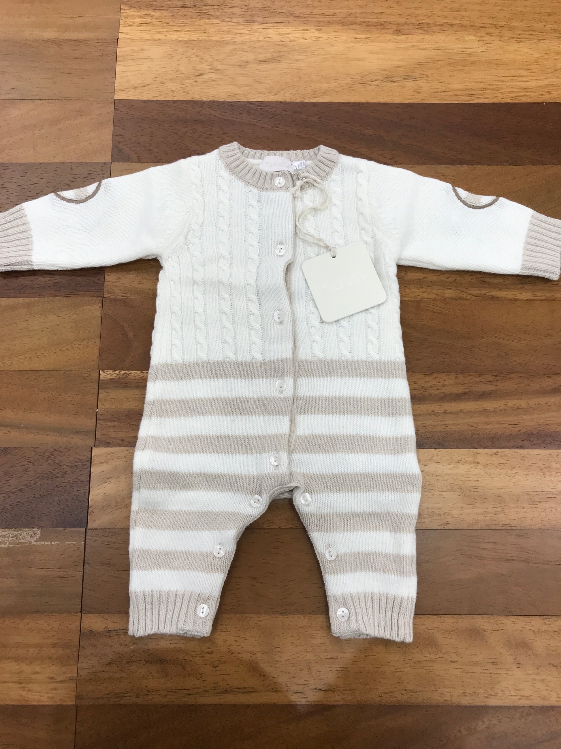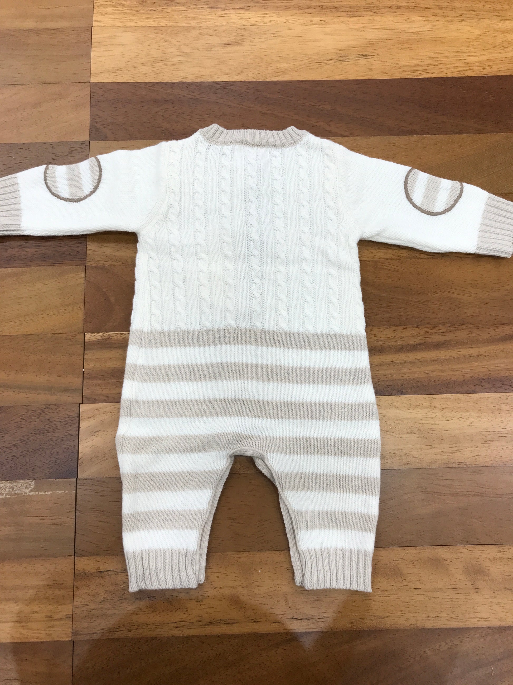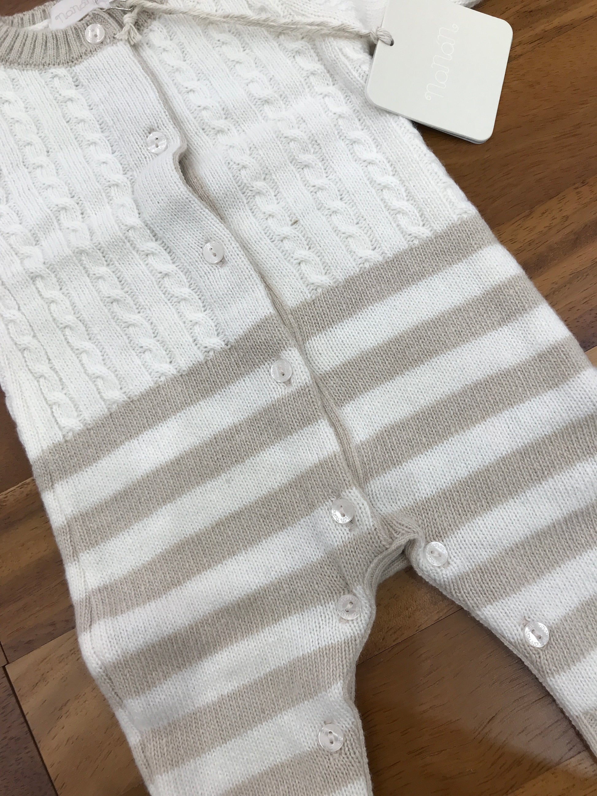 Questa tutina intera, priva di piedini, presenta una raffinata lavorazione a trecce sul davanti e una decorazione a righe nella parte inferiore.