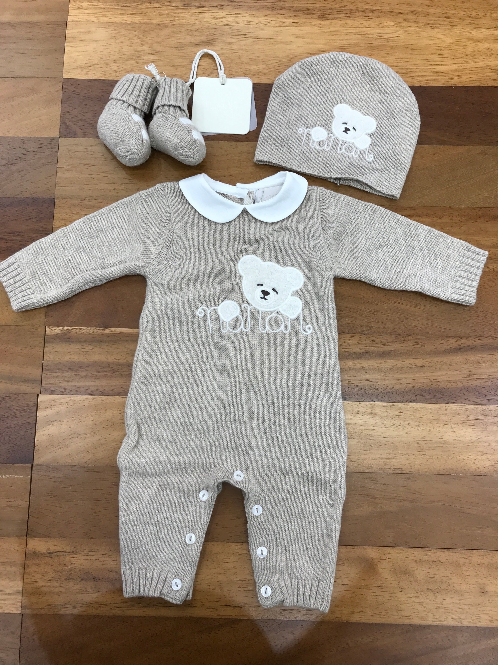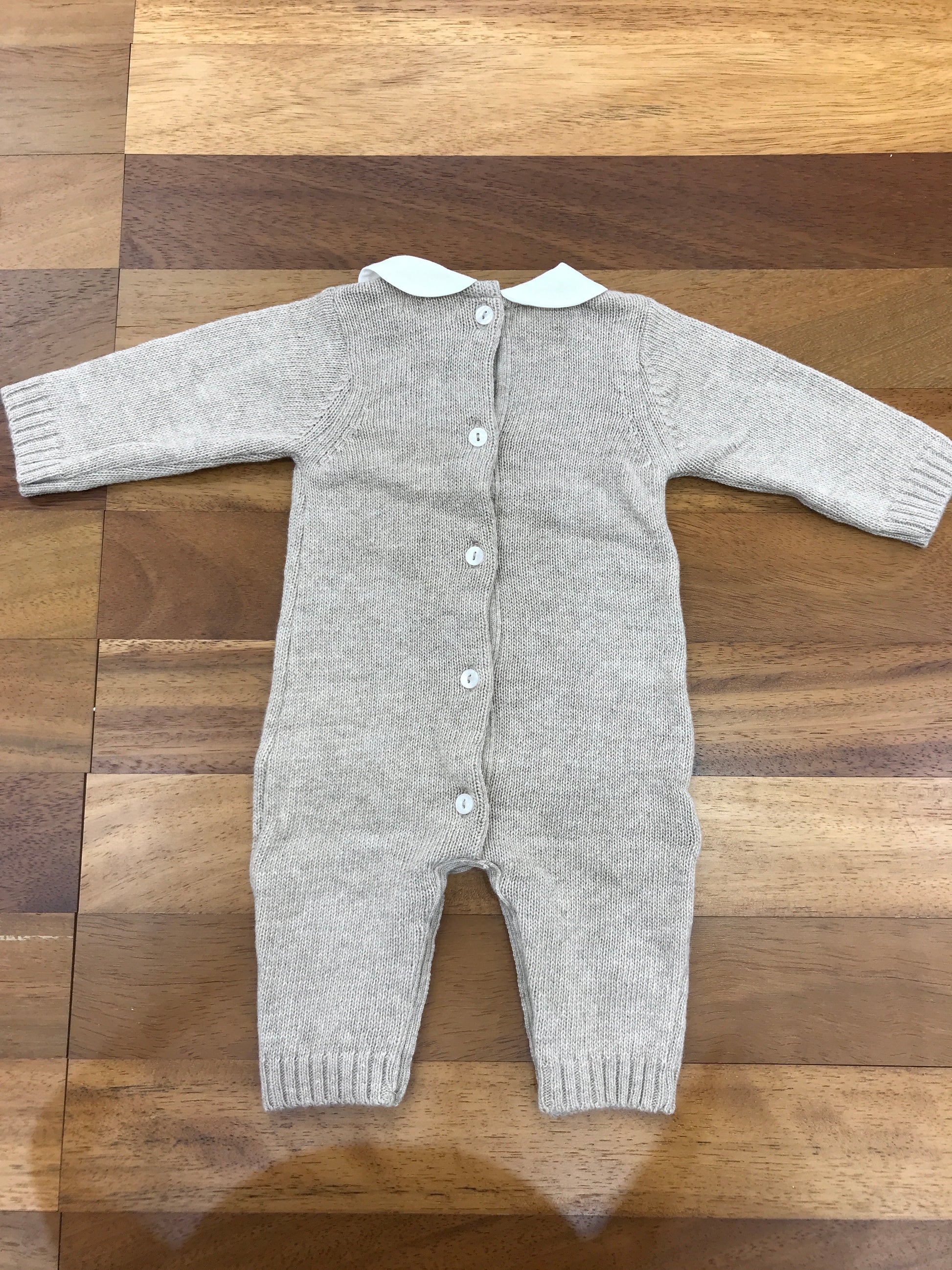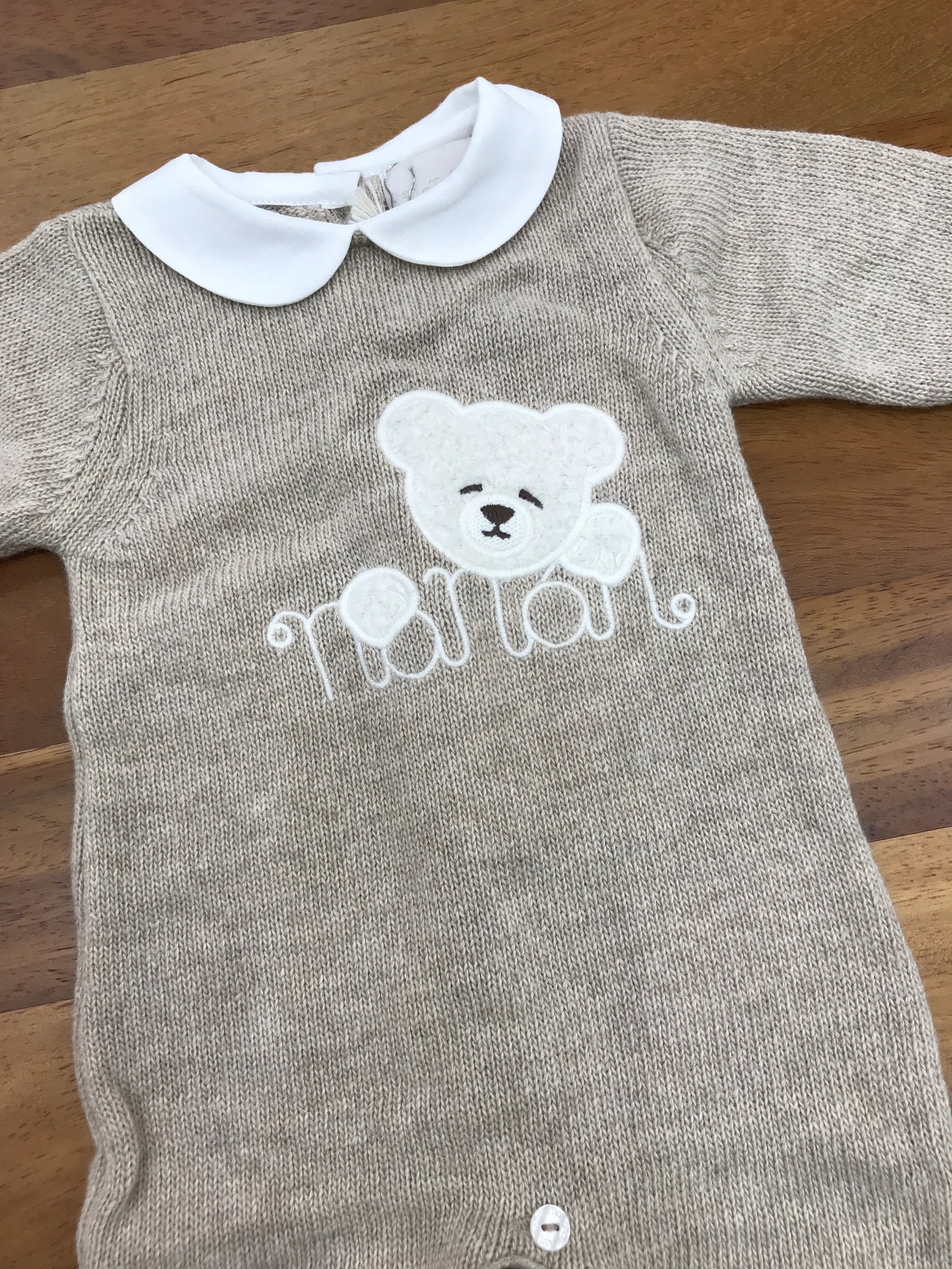 Tutina completa con collo e ricamo a forma di orsetto sul davanti, senza piedini.
