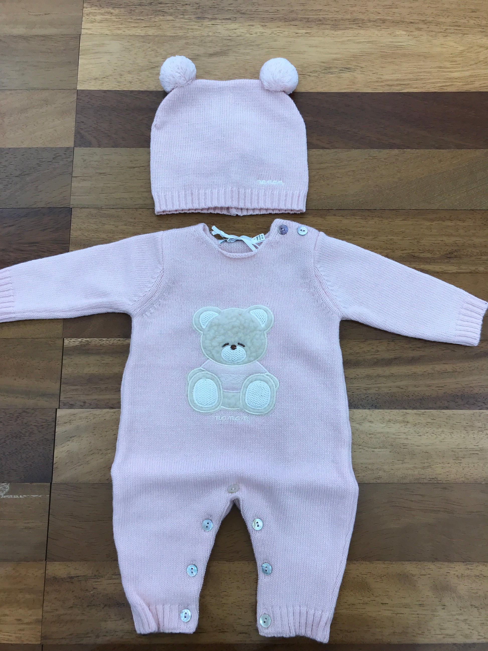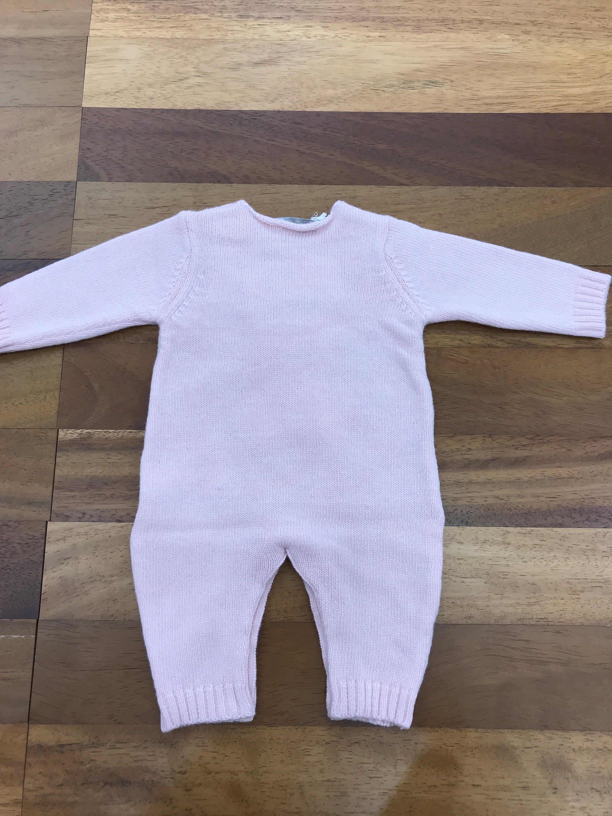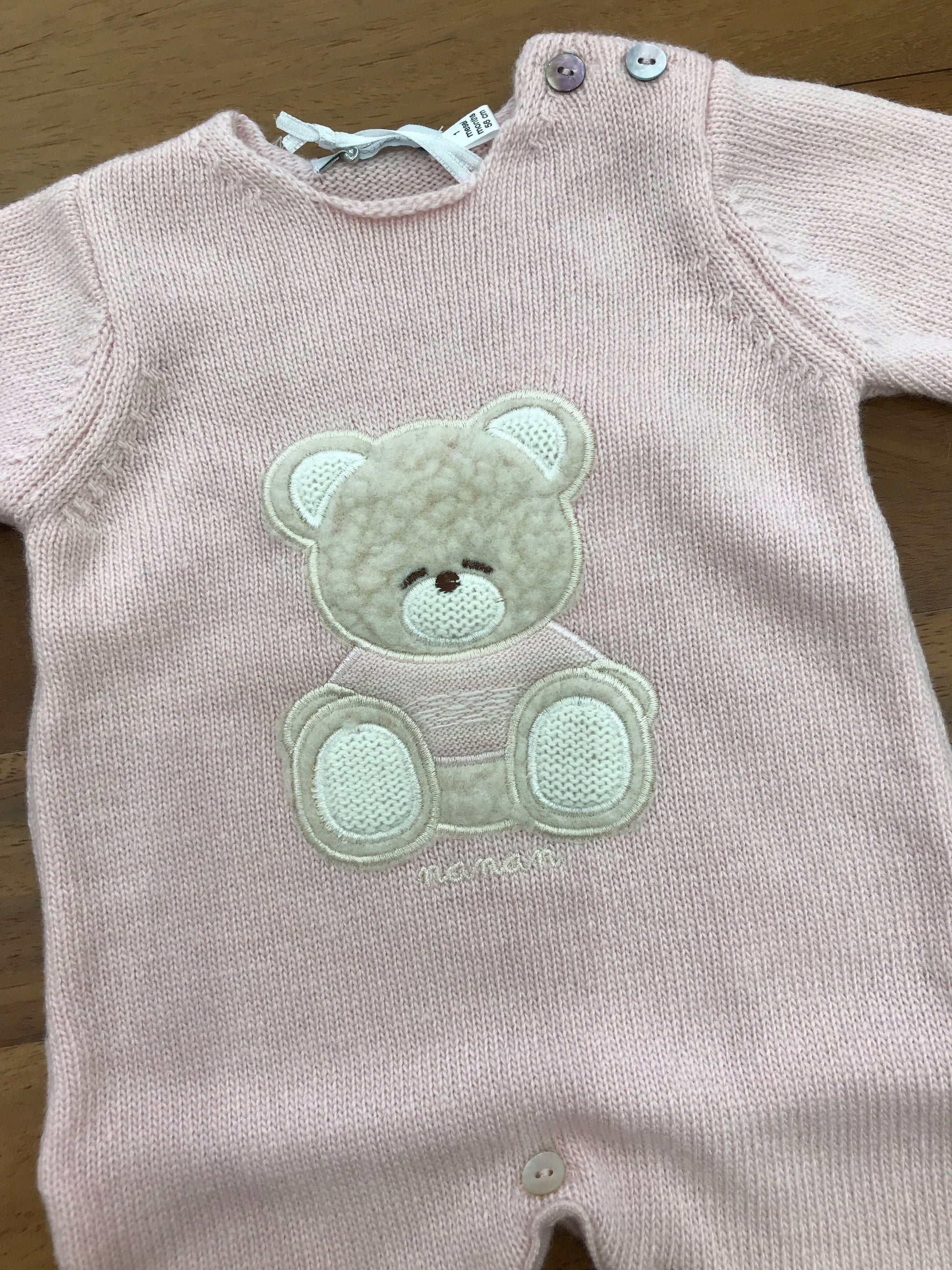 Questa tutina in lana, senza collo né piedini, presenta un delicato ricamo di un orsetto sul davanti, un capo confortevole e raffinato per i più piccoli.