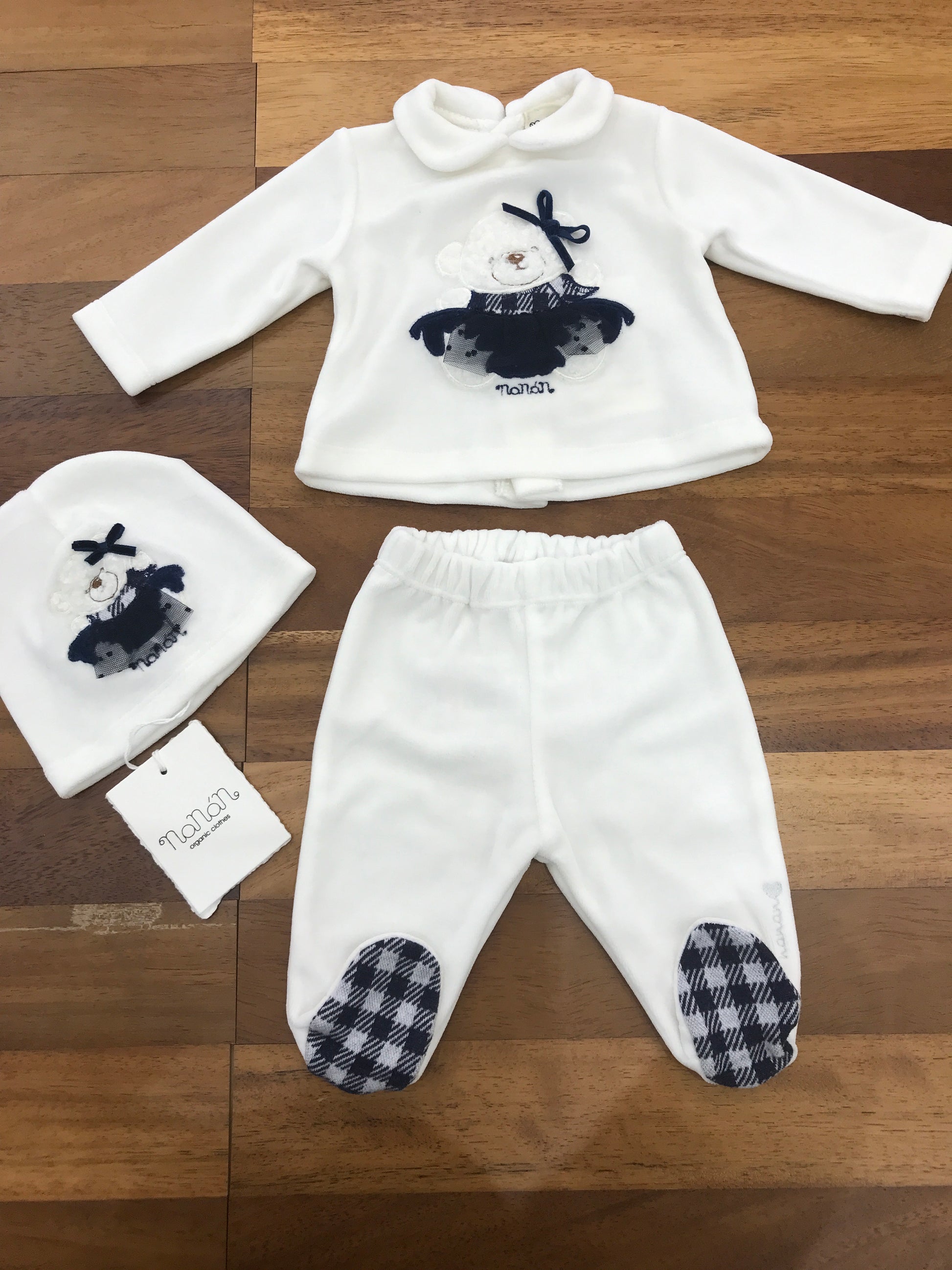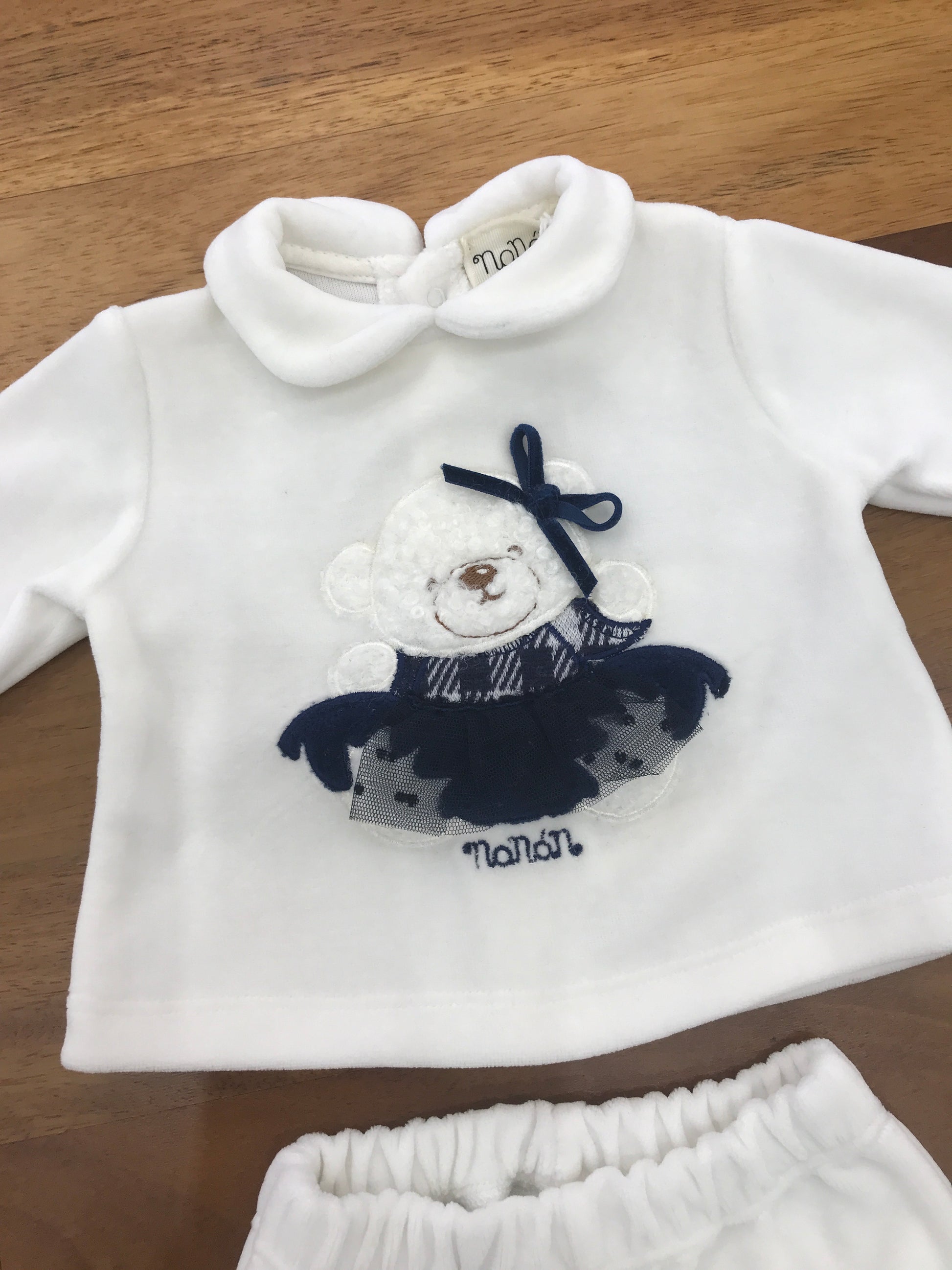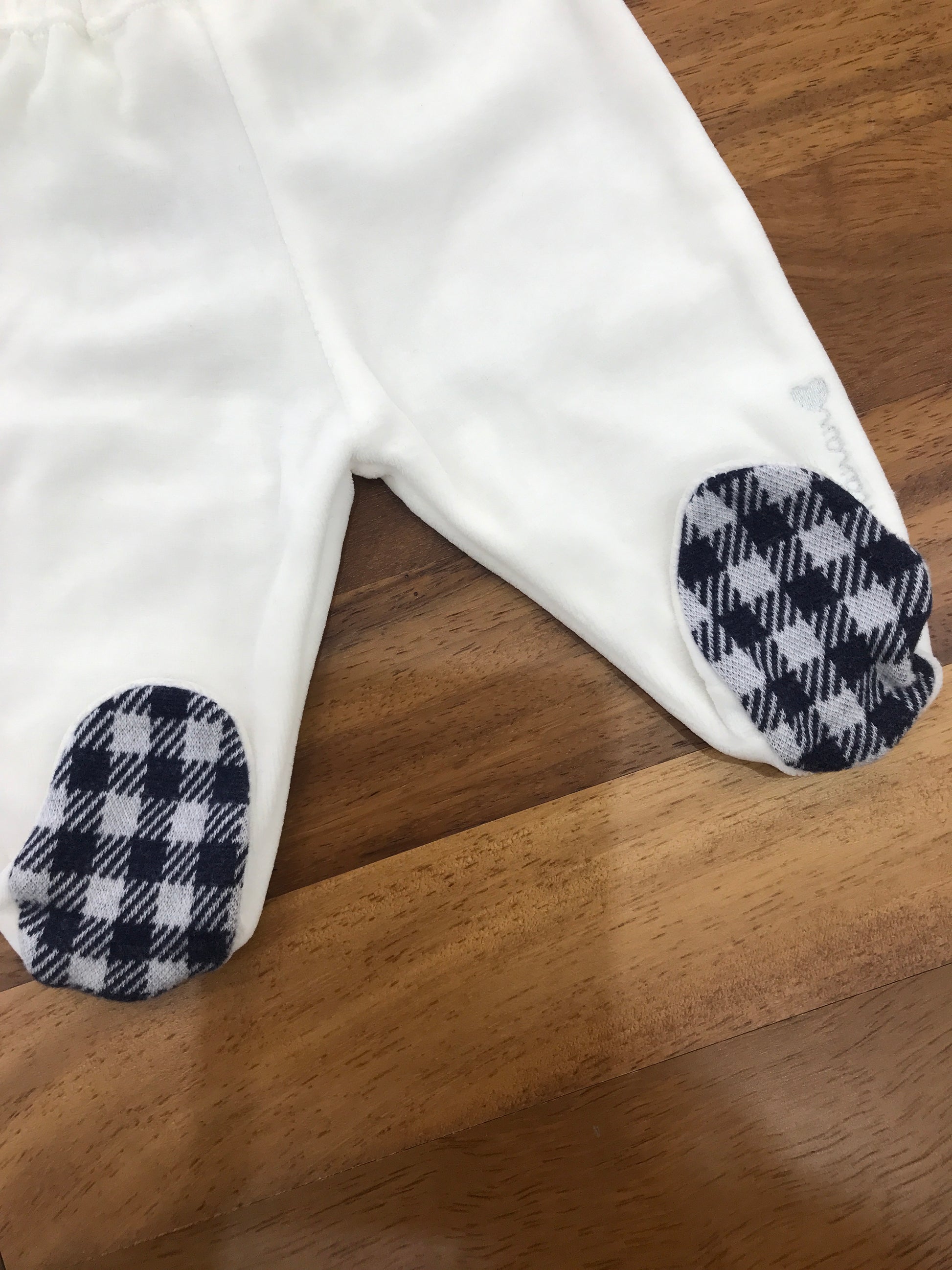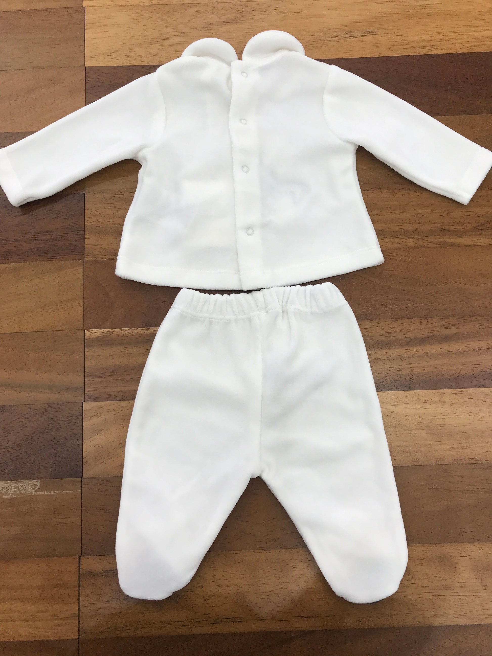 Questo completino in ciniglia presenta piedini decorati e un colletto incluso. Sulla parte superiore è impreziosito da un orsetto decorativo posizionato sul davanti, unendo comfort e stile per il tuo bambino.