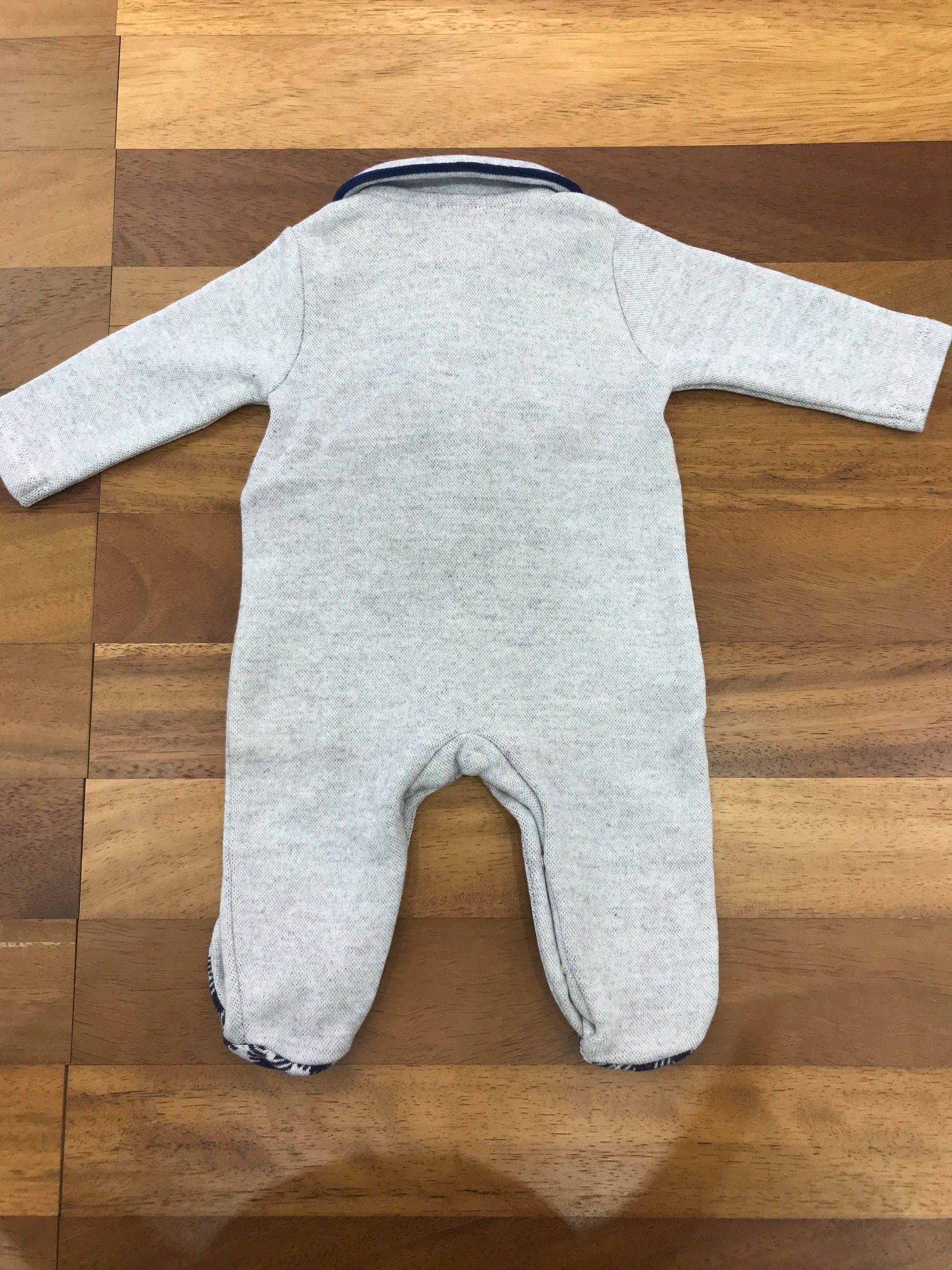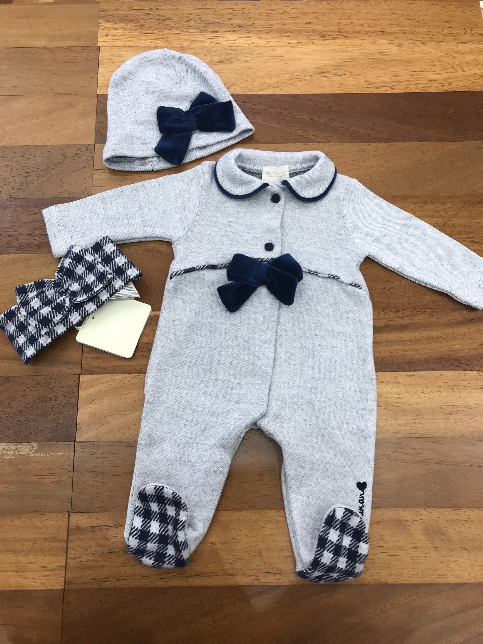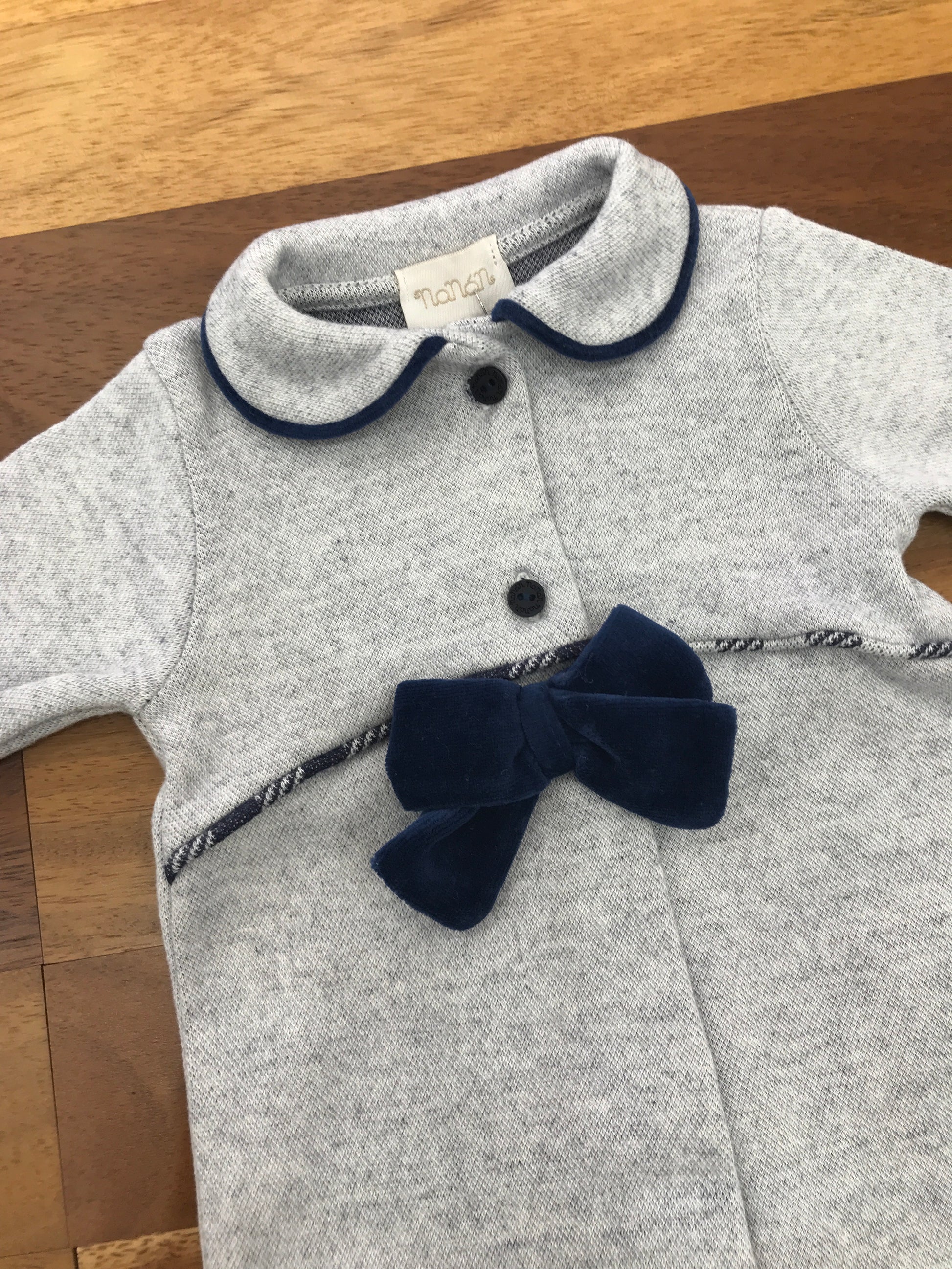 Intera tutina in ciniglia con piedini coperti e colletto rifinito, arricchita da un elegante fiocco centrale.