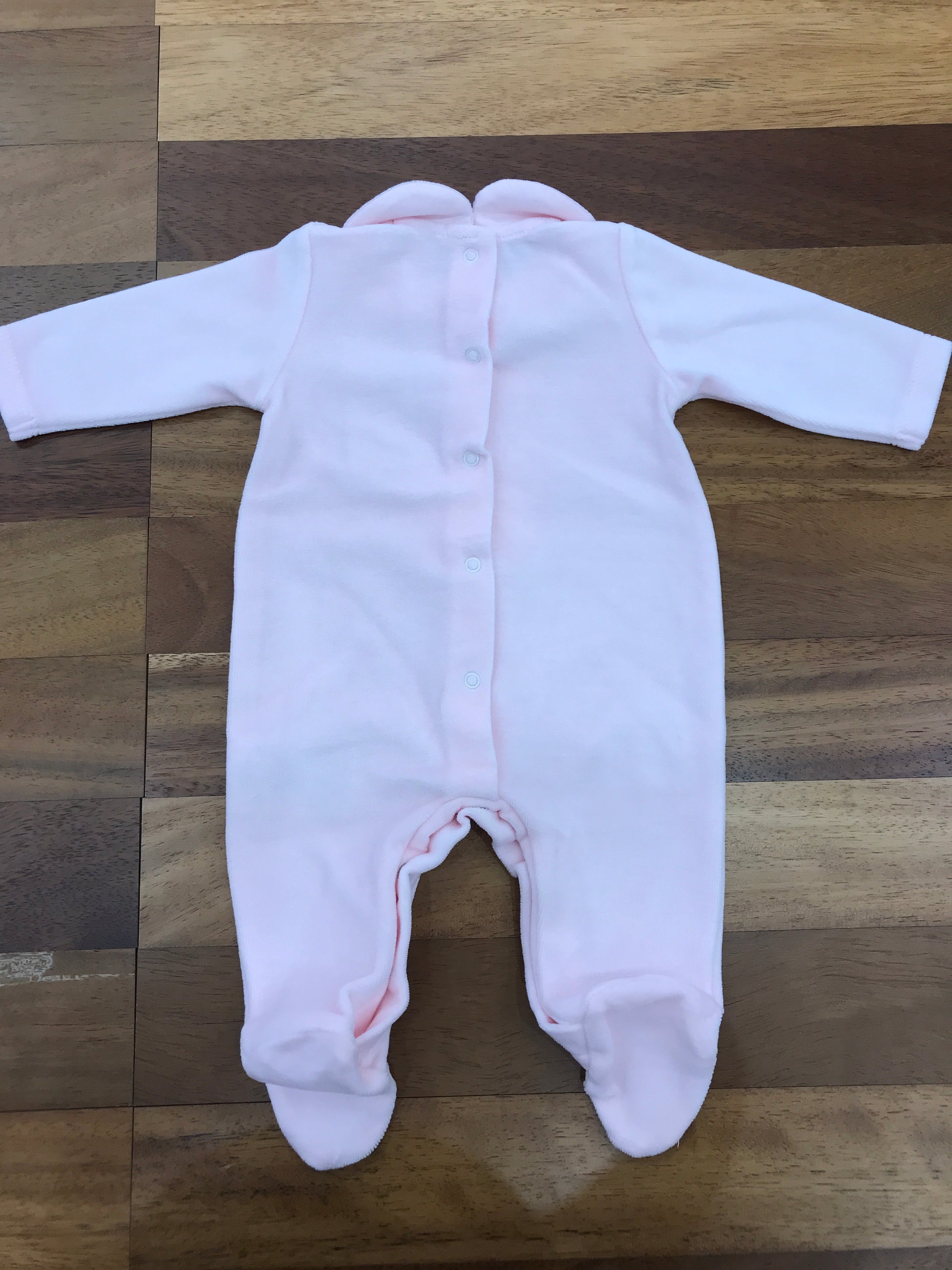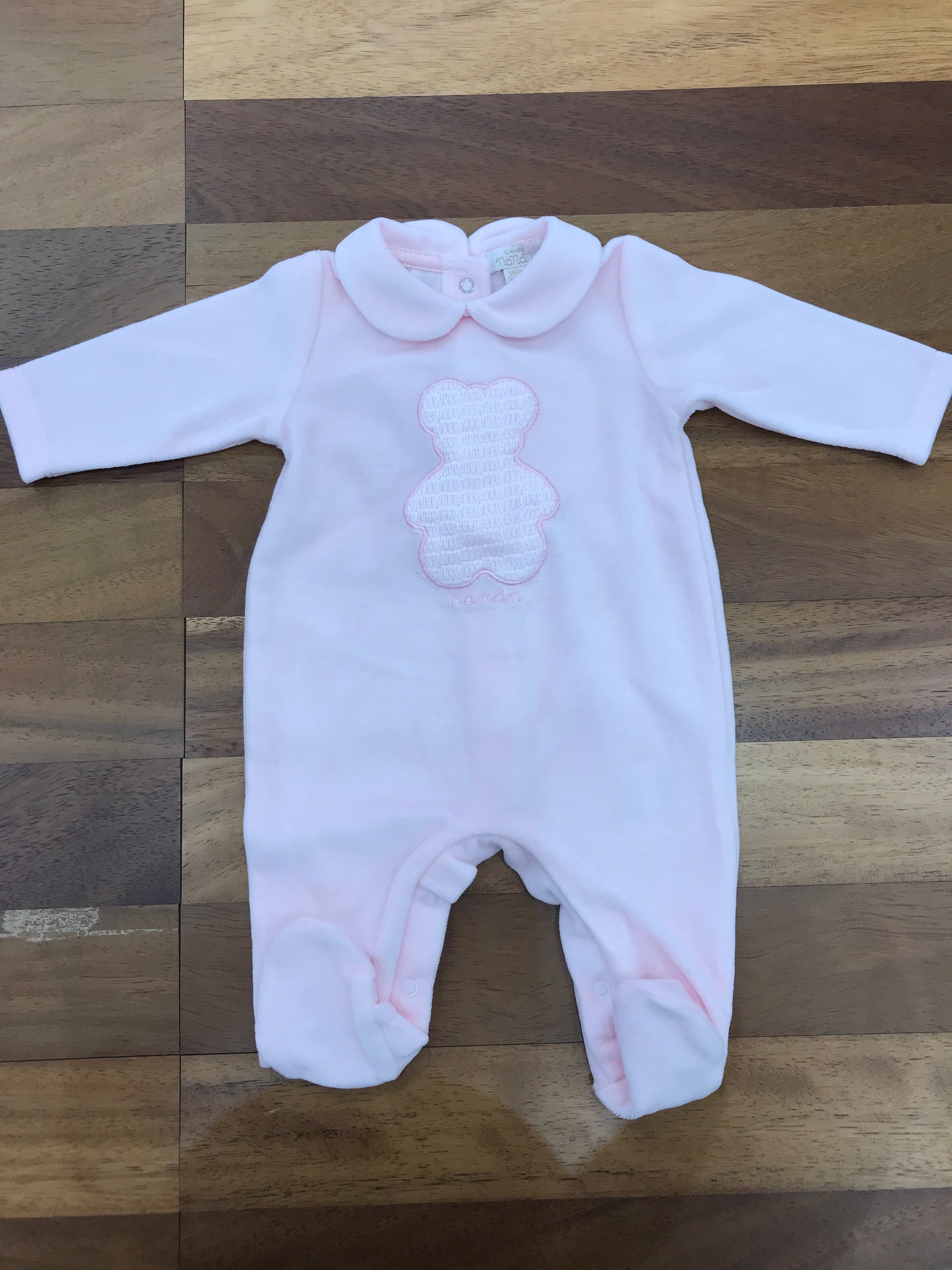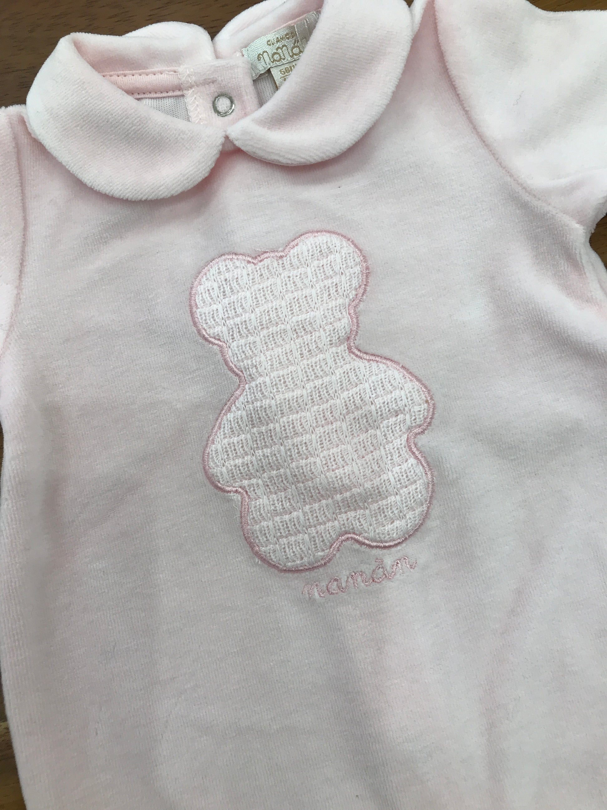 Questa tutina intera in ciniglia, completa di piedini e colletto, presenta un ricamo centrale con un orsetto, unendo comfort e dettagli raffinati per il neonato.