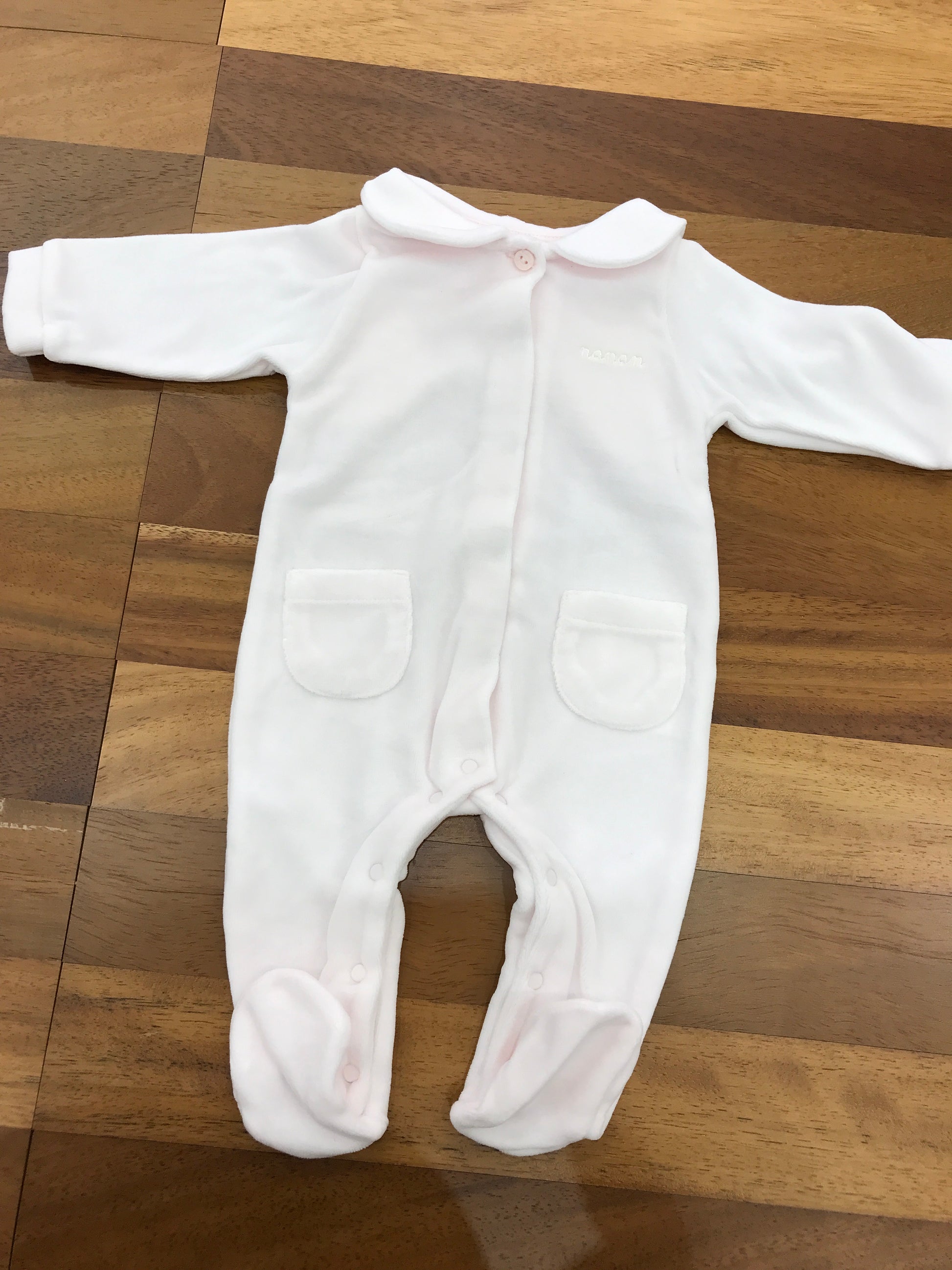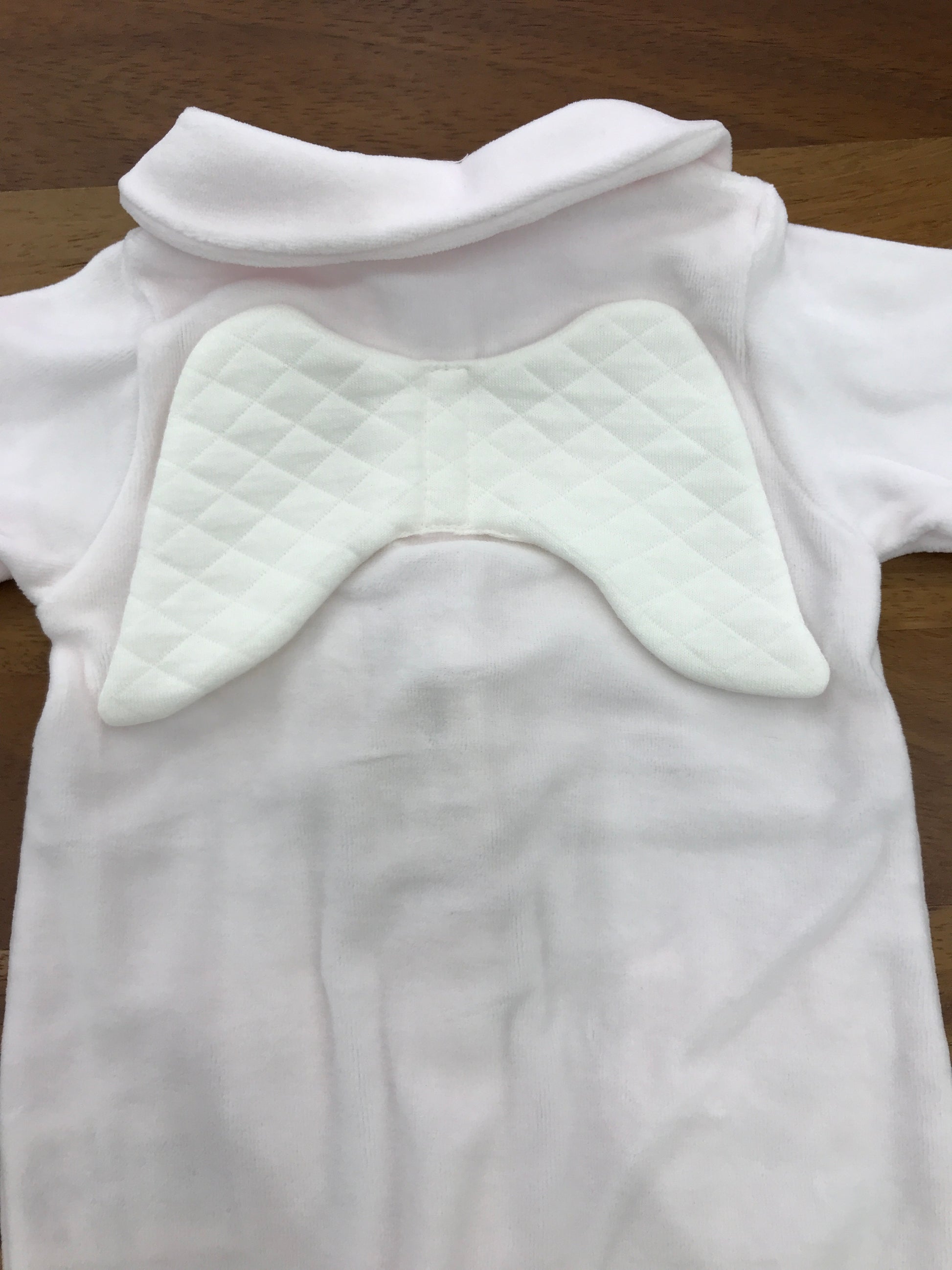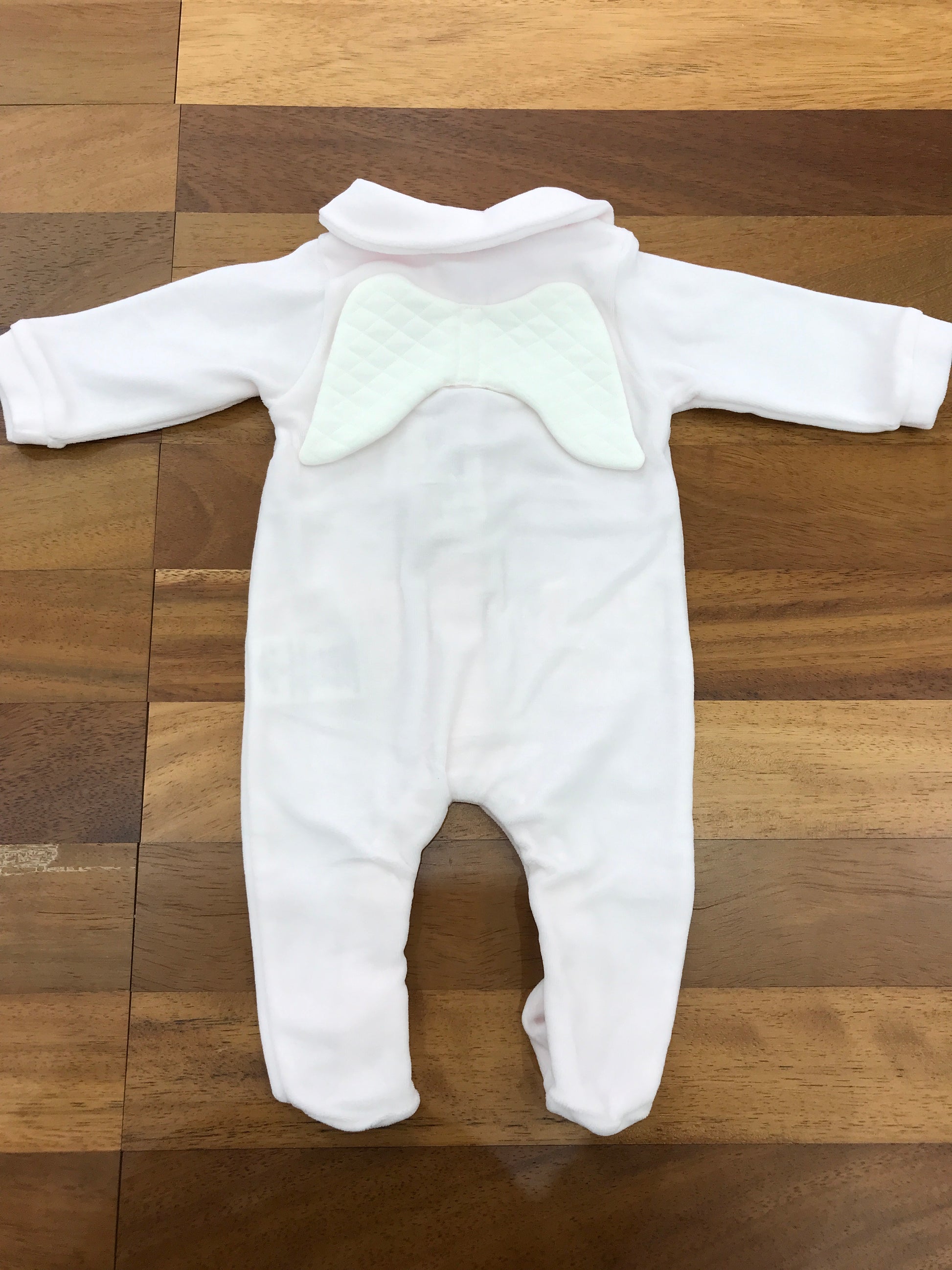 Questa tutina intera in ciniglia è dotata di piedini e colletto, con due tasche decorative sul davanti e ali bianche ornamentali sul retro, unendo comfort e stile raffinato per il tuo bambino.