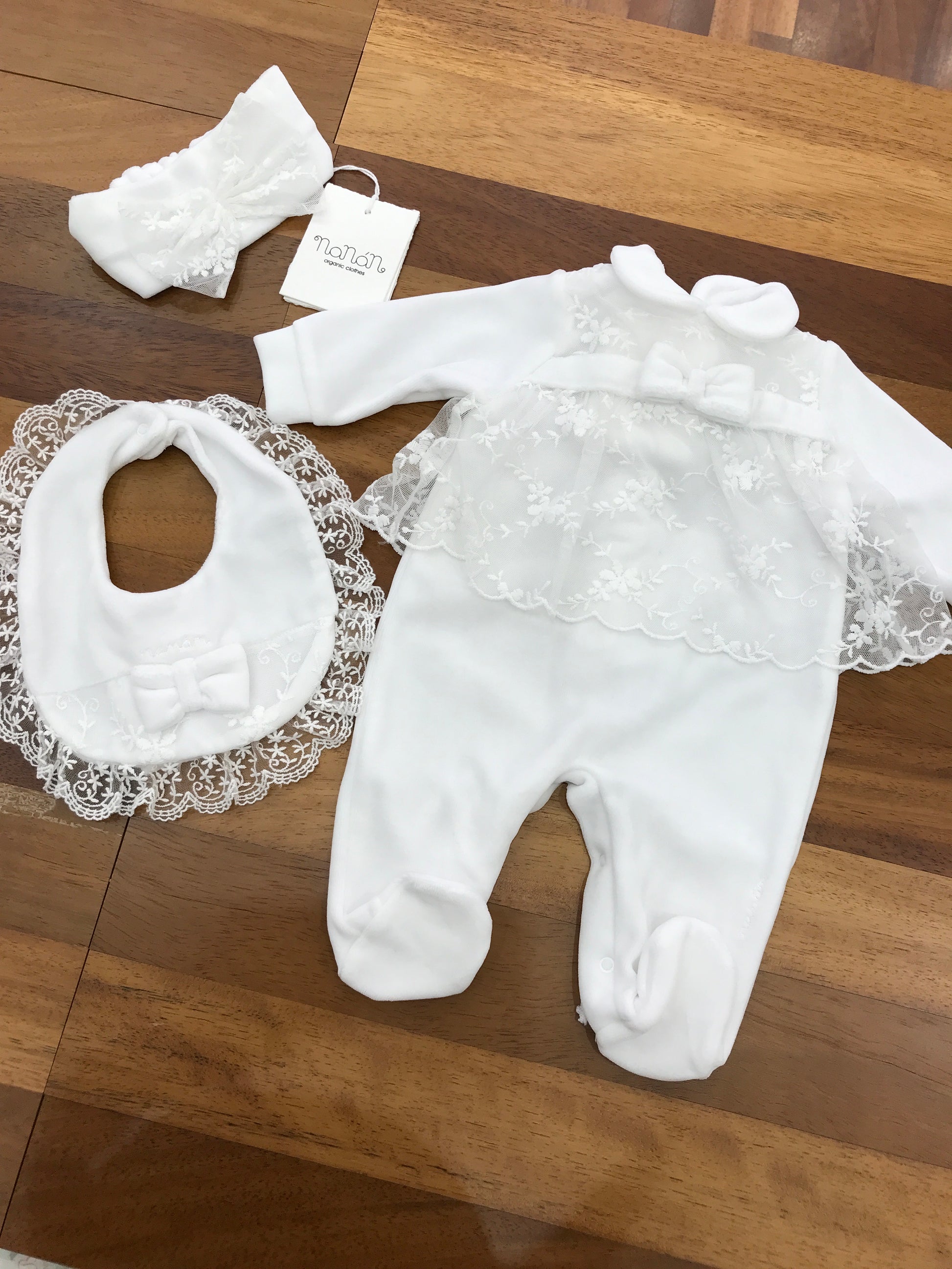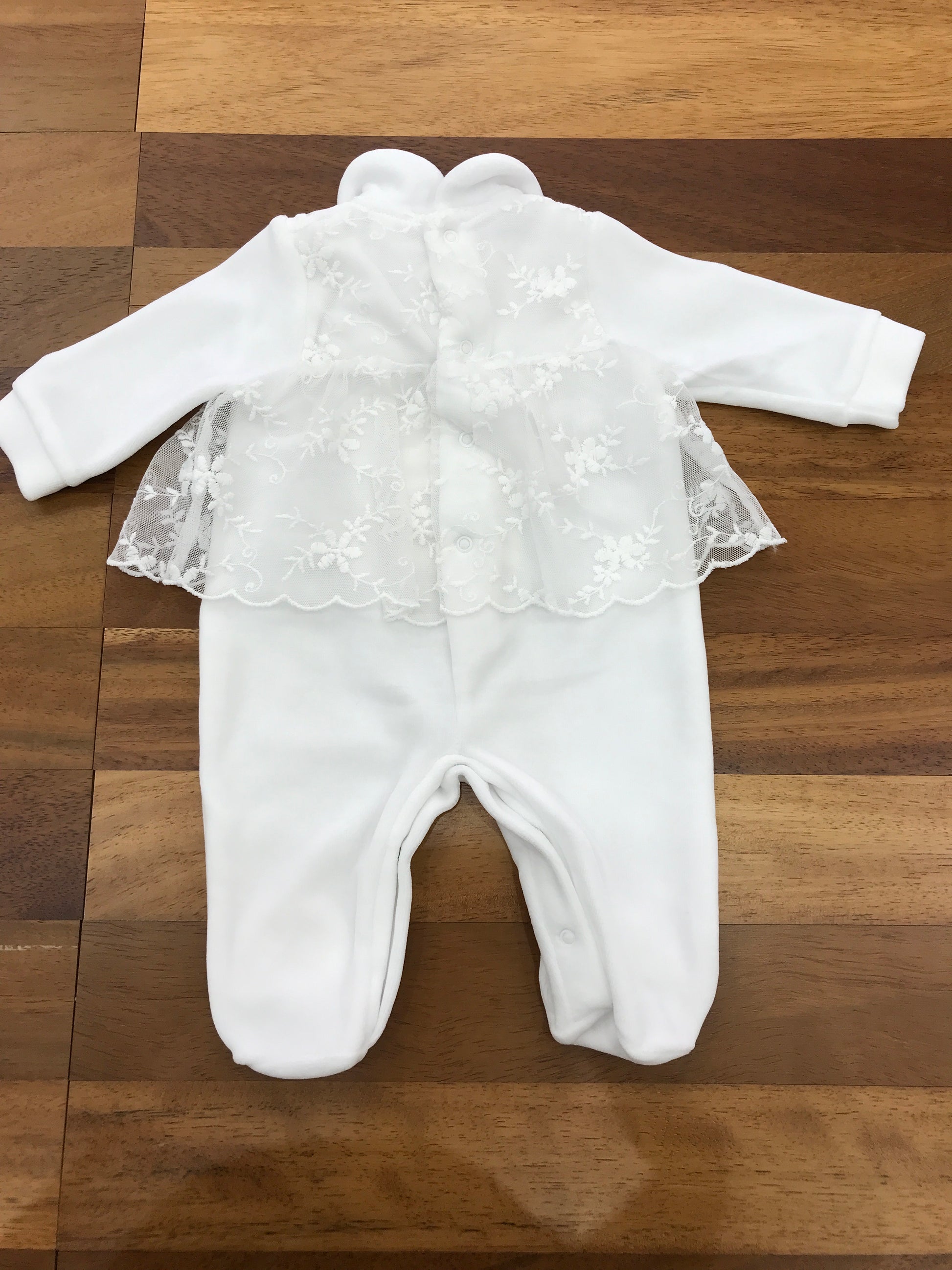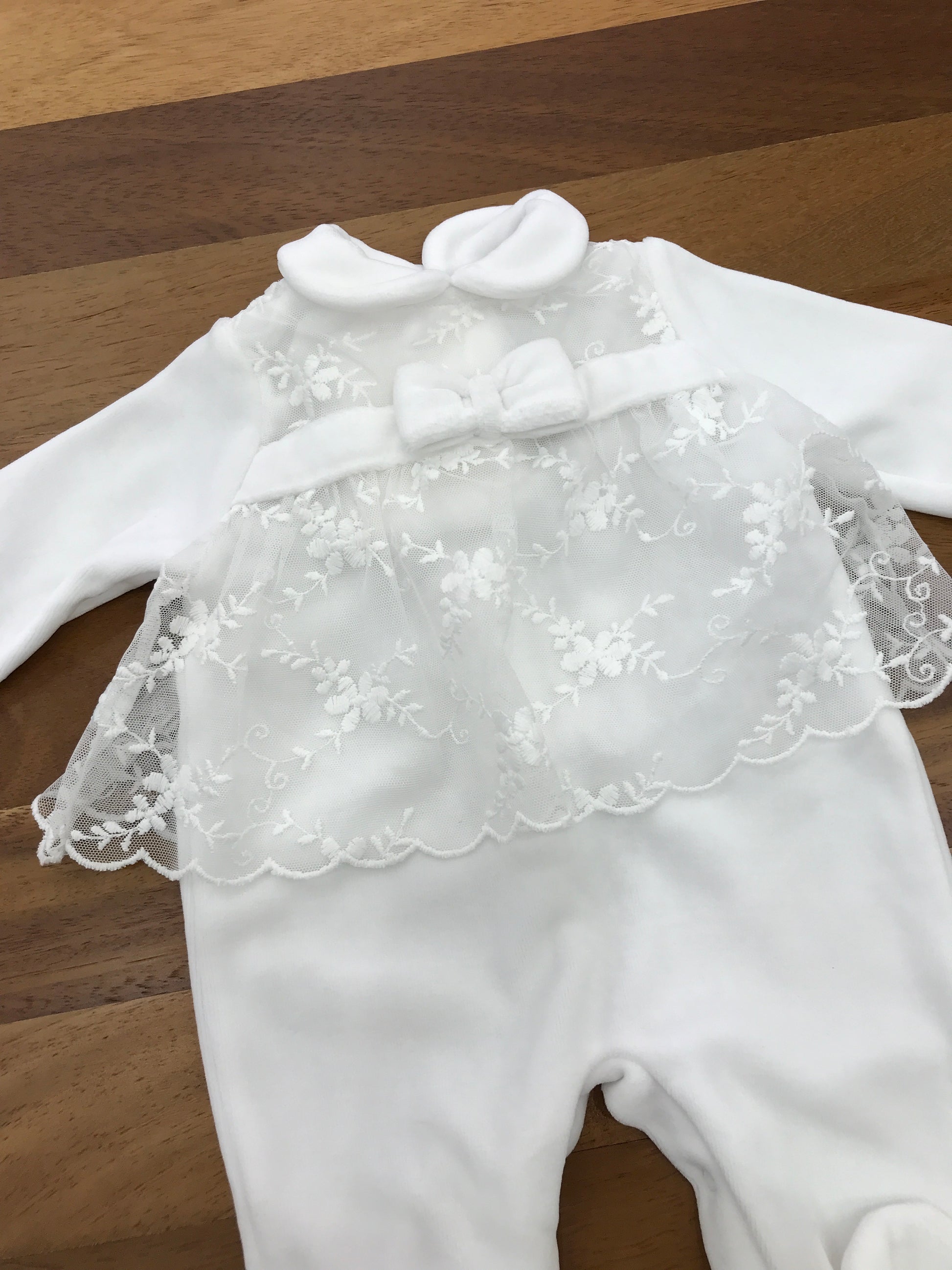 Questa tutina intera in ciniglia è dotata di piedini e colletto, con un delicato merletto ricamato sul davanti e un elegante fiocco realizzato nello stesso tessuto di ciniglia.