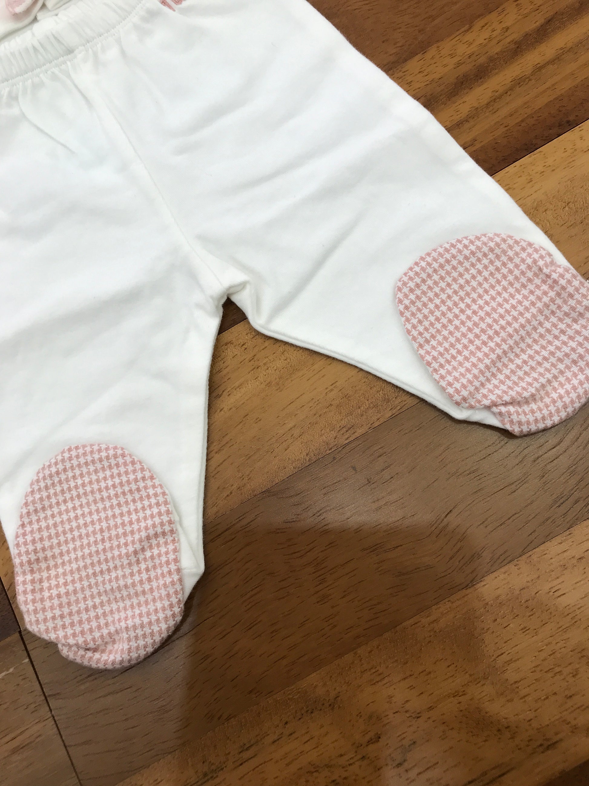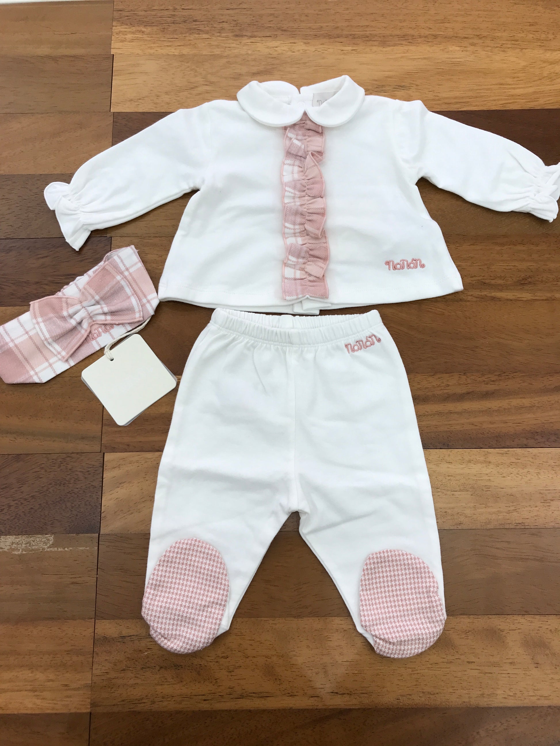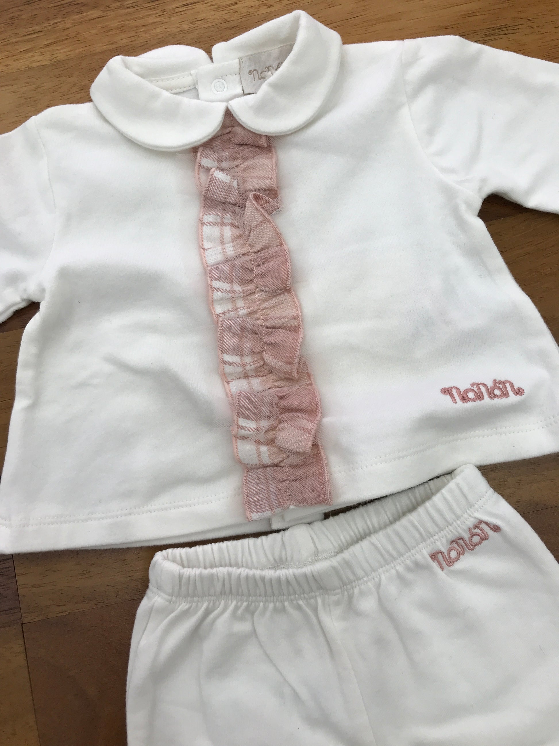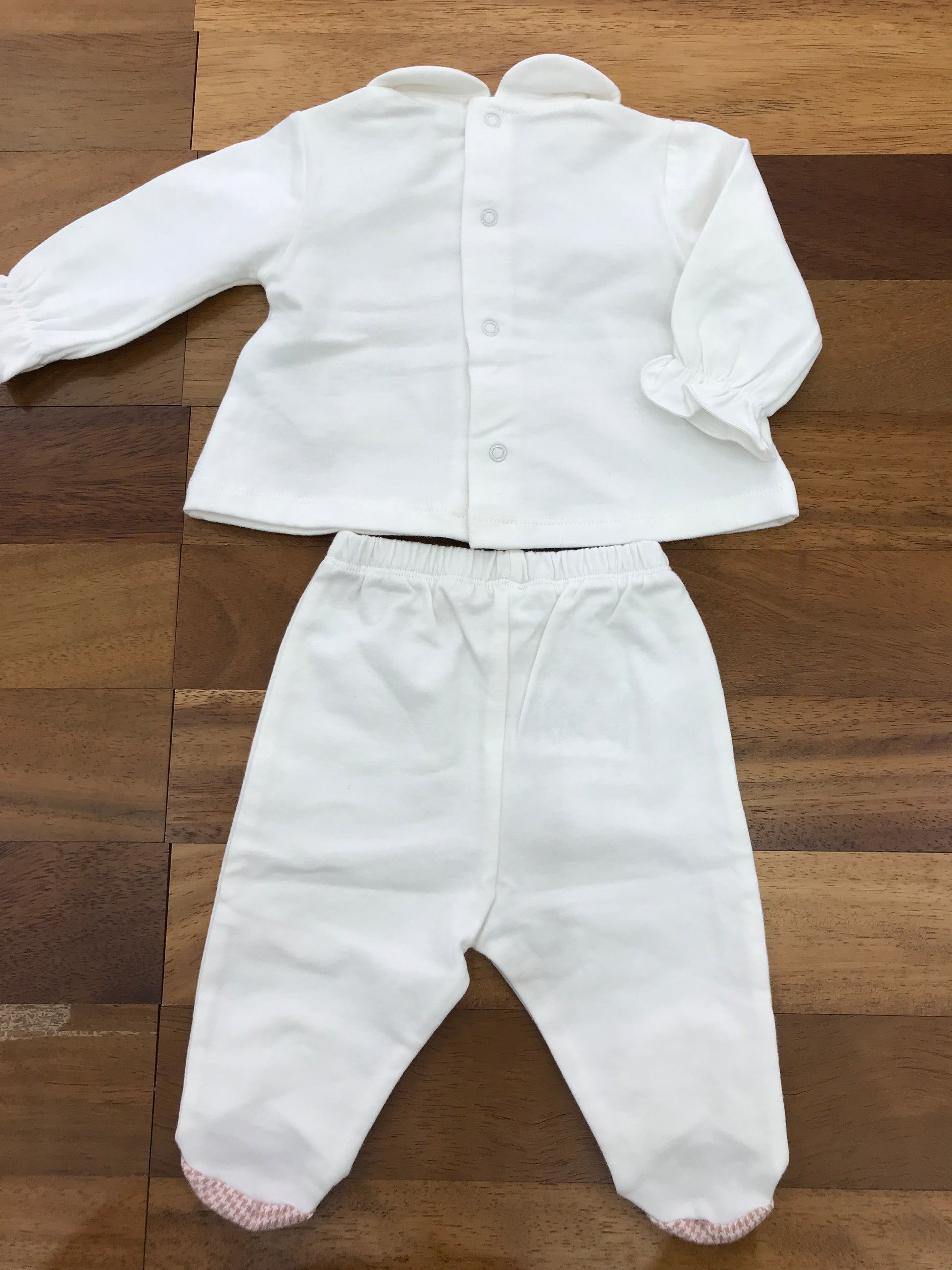 Completo due pezzi con piedini decorati e colletto elegante. Al centro presenta una fascia arricciata decorativa, mentre le maniche sono rifinite con elastico per una migliore vestibilità.e