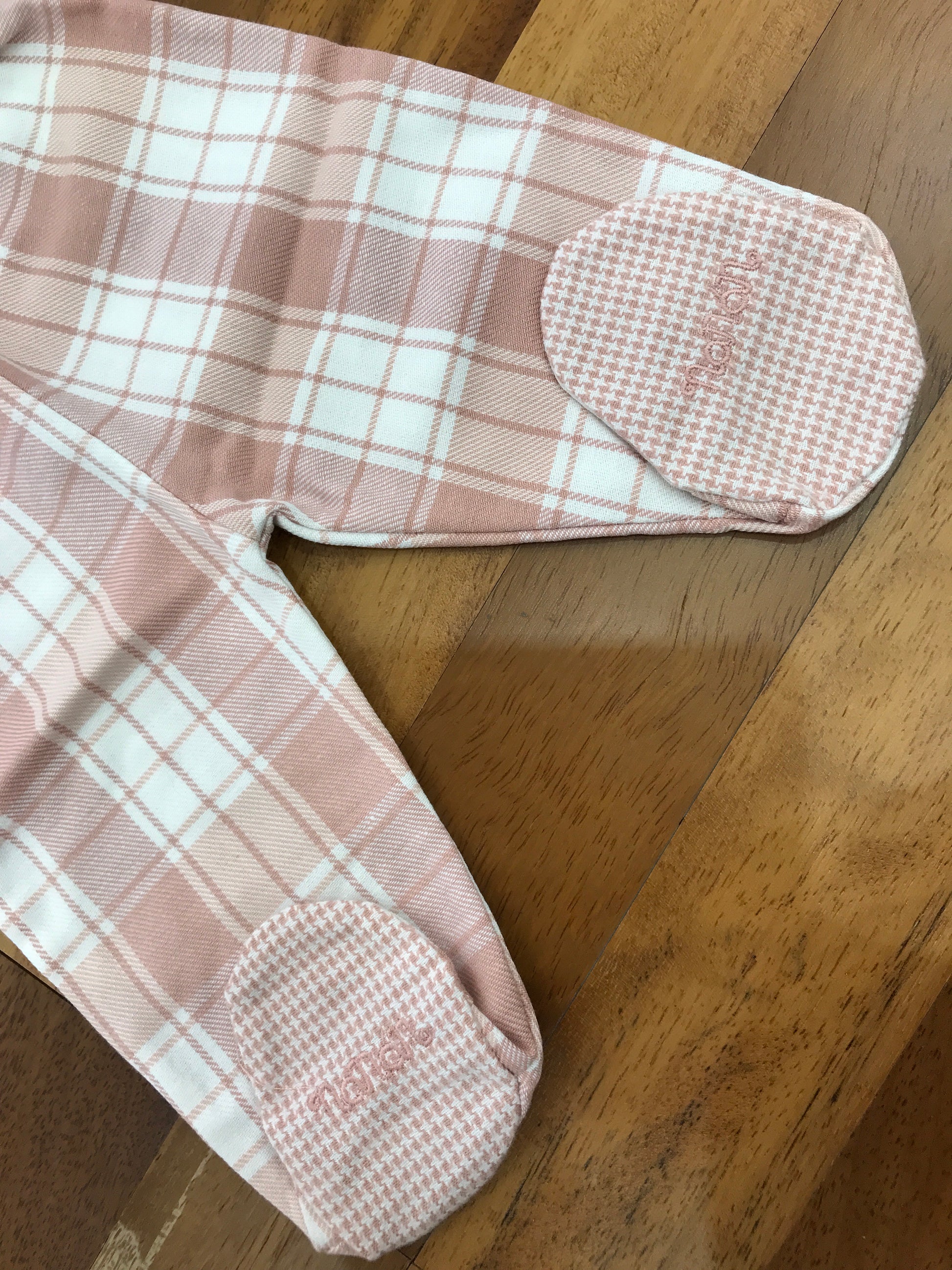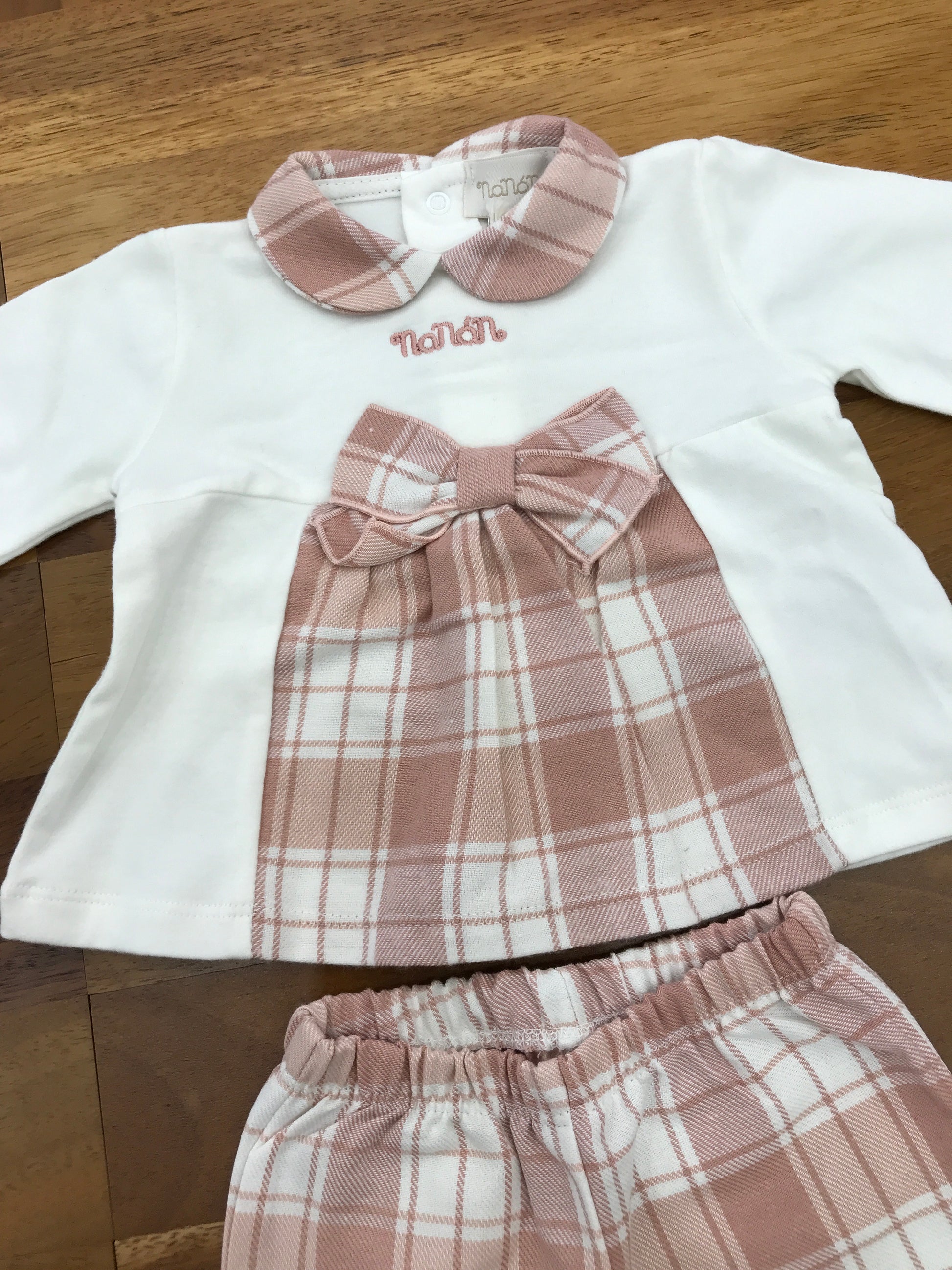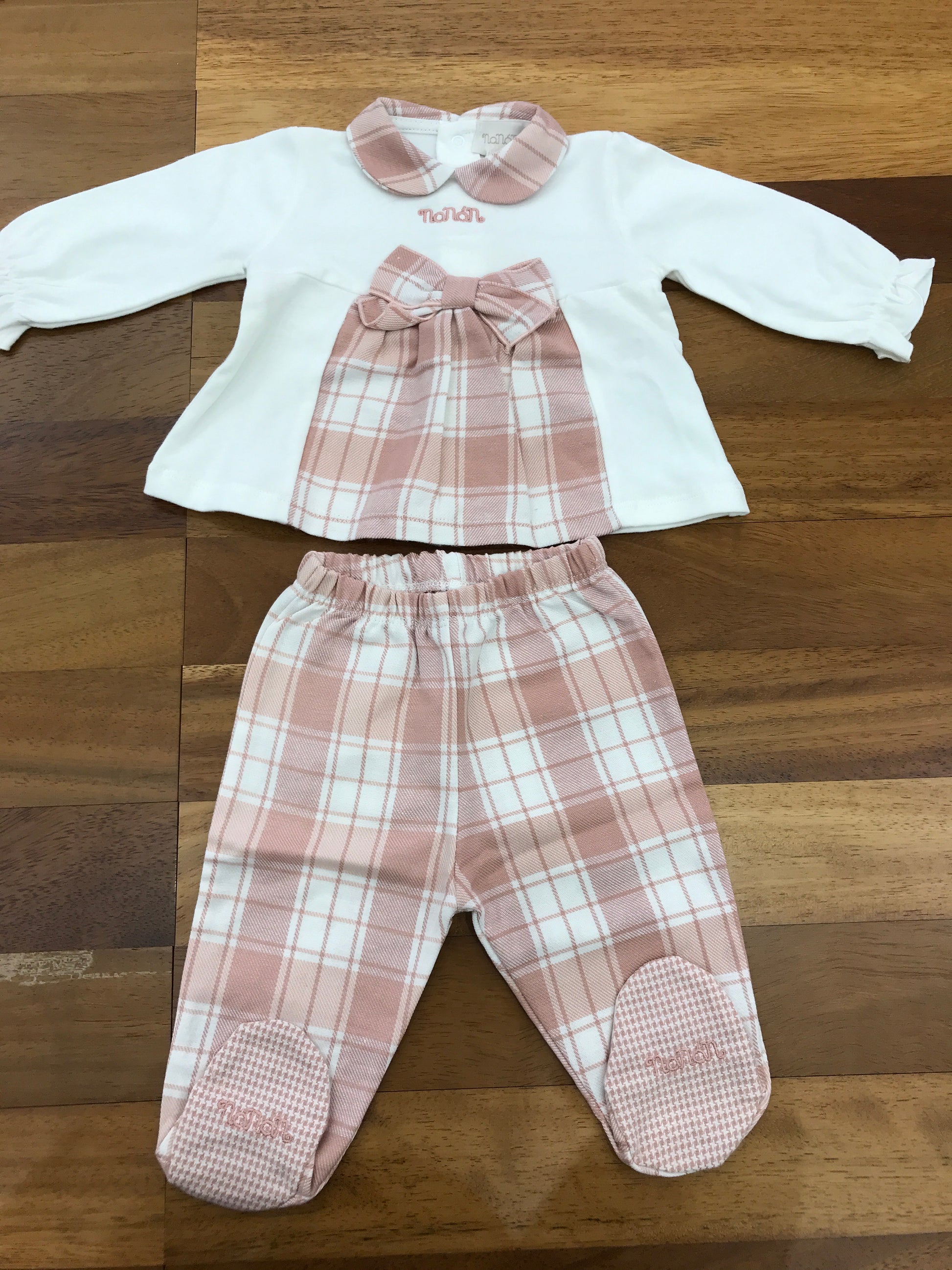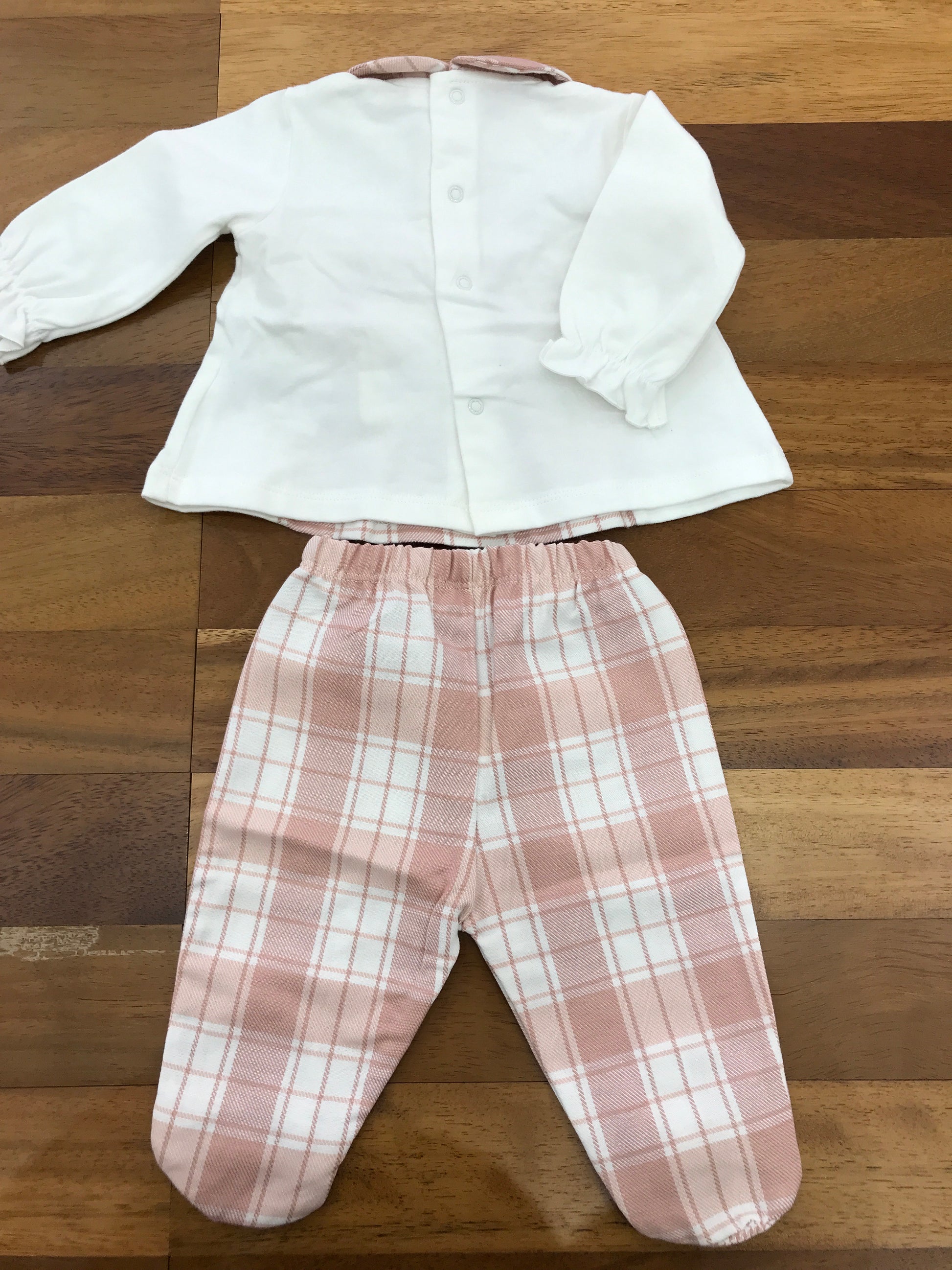 Completo due pezzi in morbido cotone caldo, con pantaloni a quadretti e maglia con colletto a quadretti impreziosita da un elegante fiocco; il set comprende anche i piedini per garantire comfort e protezione.
