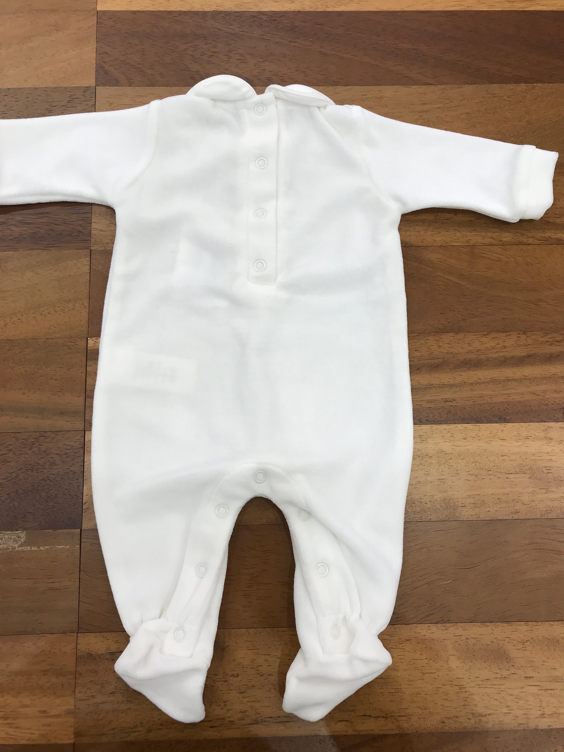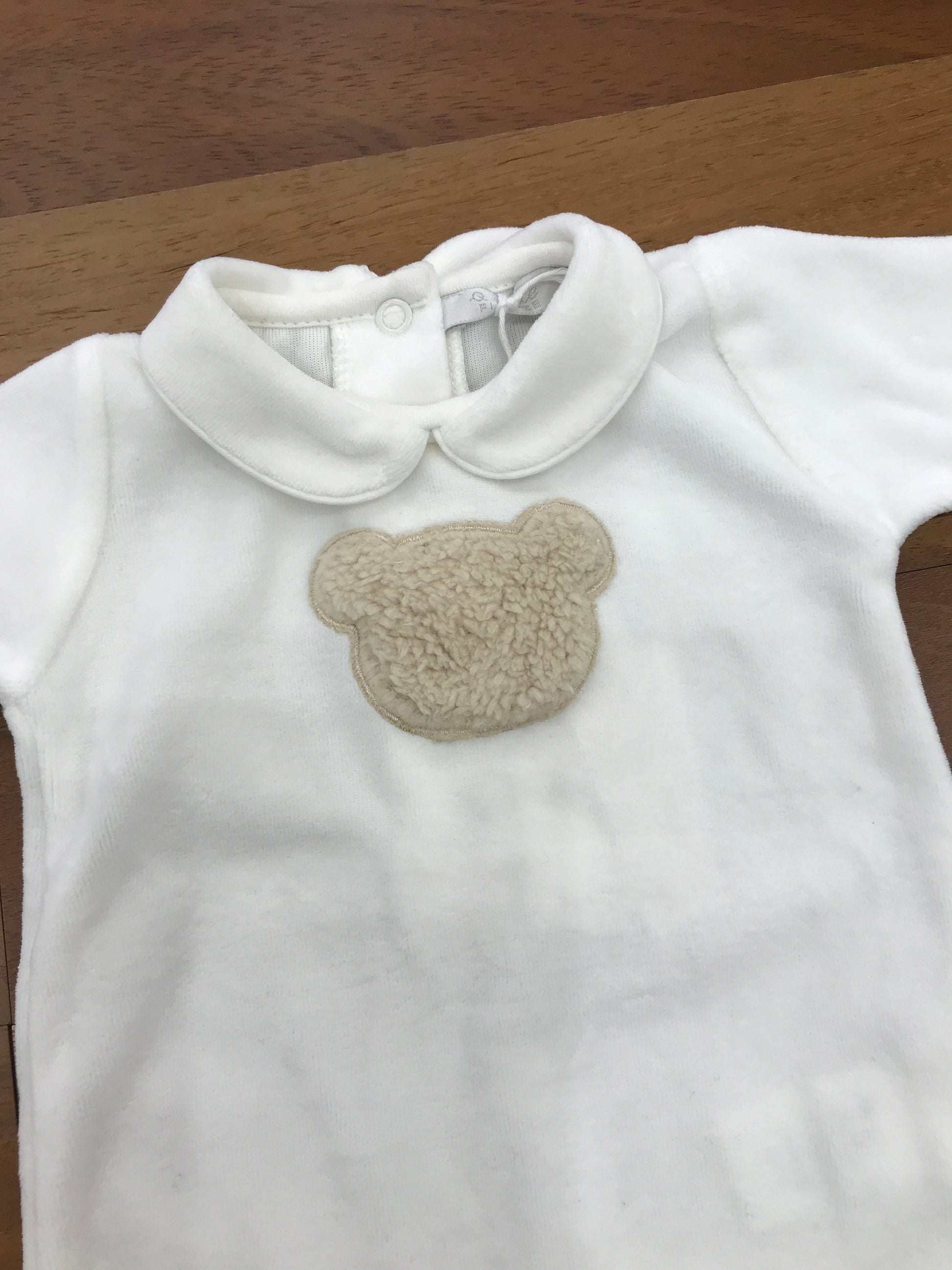 Questa tutina intera realizzata in morbida ciniglia è dotata di piedini integrati e un elegante colletto, garantendo comfort e calore al bambino. Al centro della parte anteriore si distingue un raffinato dettaglio decorativo raffigurante una dolce faccia di orsetto, che aggiunge un tocco di tenerezza e originalità al capo. Ideale per mantenere il piccolo avvolto in morbidezza durante tutto il giorno.