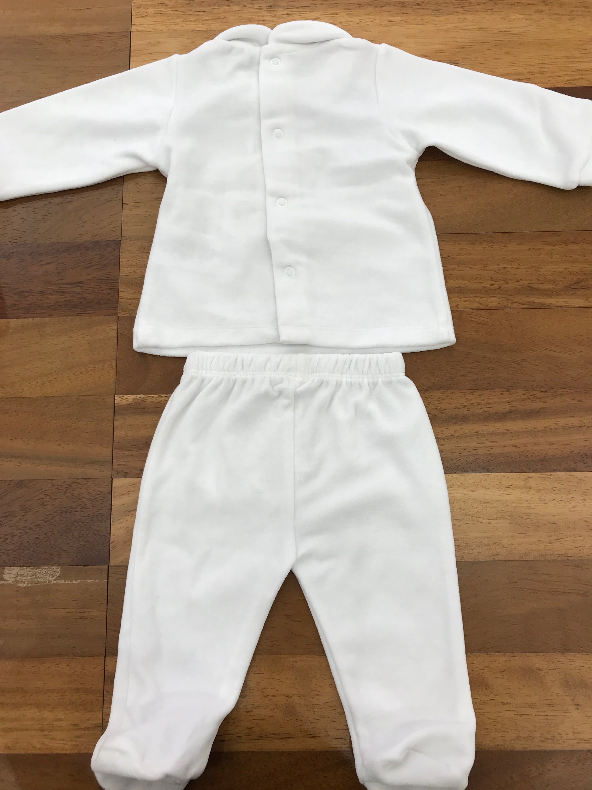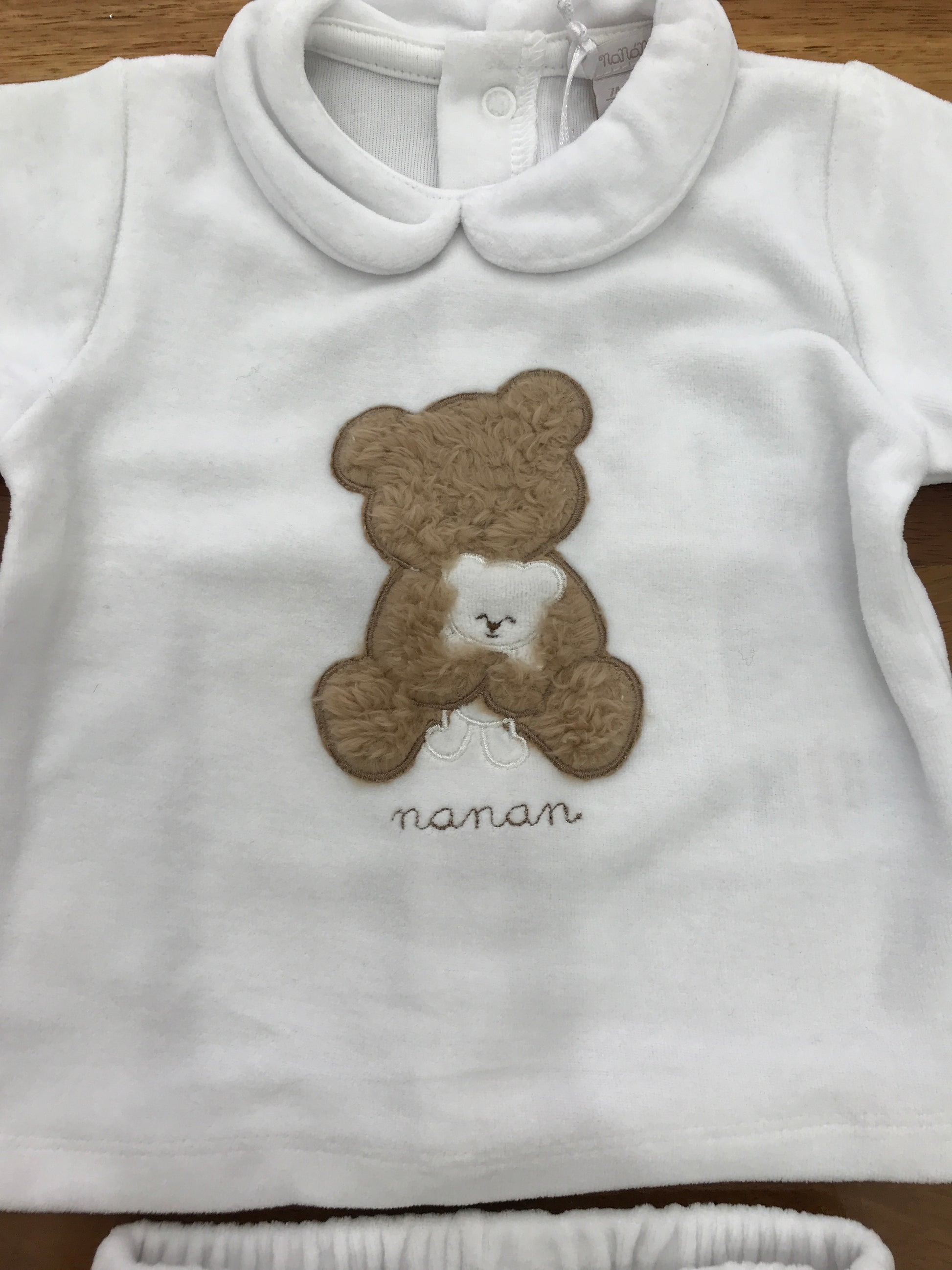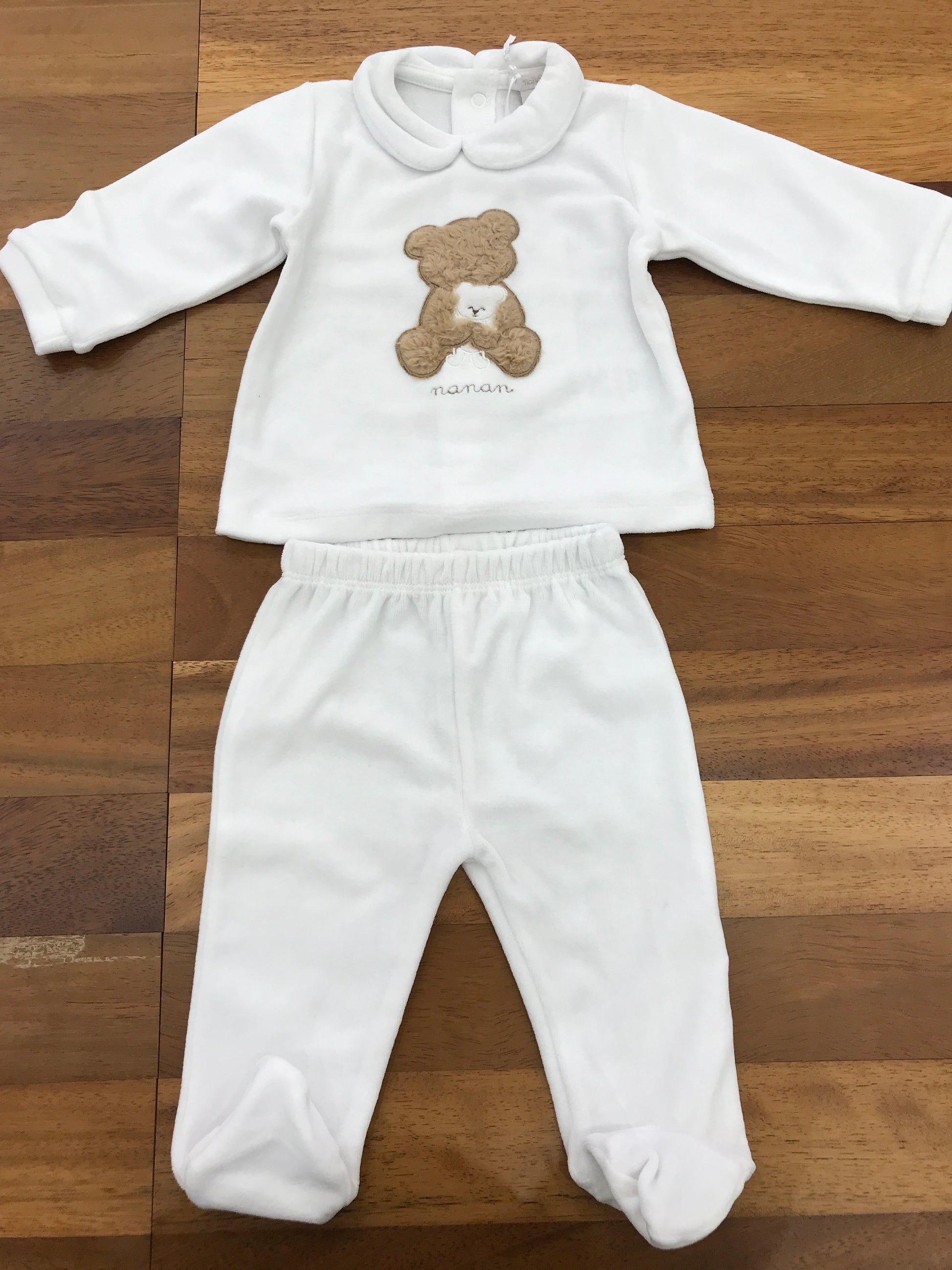 Completo due pezzi realizzato in morbida ciniglia, dotato di piedini coperti per garantire calore e comfort, e un colletto elegante che aggiunge un tocco di stile. Il capo è impreziosito da un orsetto decorativo in rilievo con pelliccia soffice e più lunga, che conferisce un dettaglio distintivo e accattivante, ideale per i più piccoli.