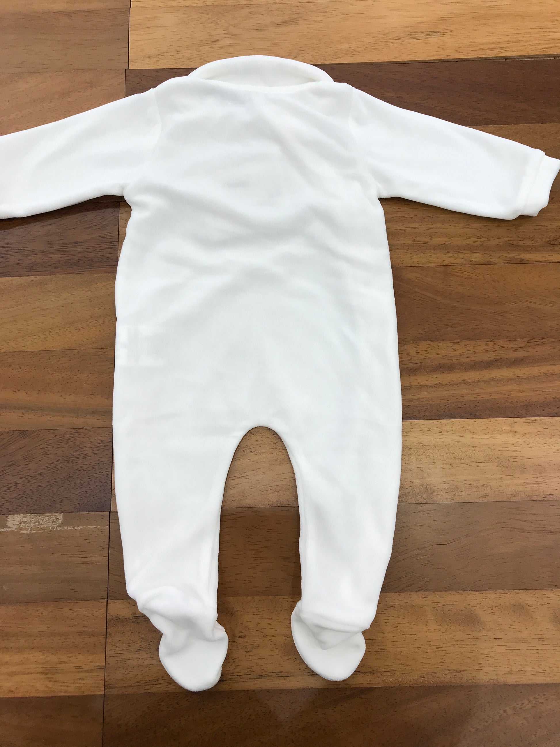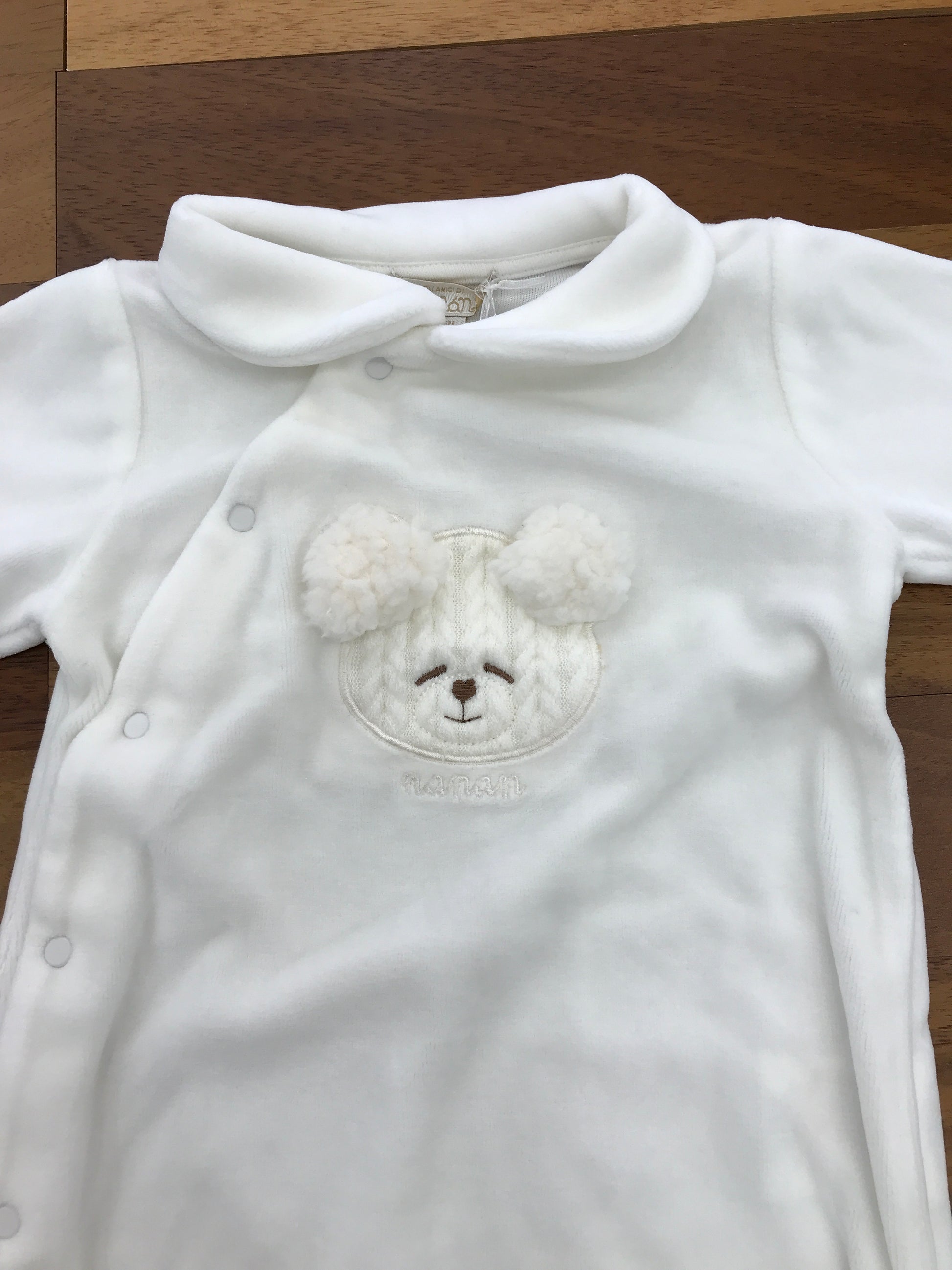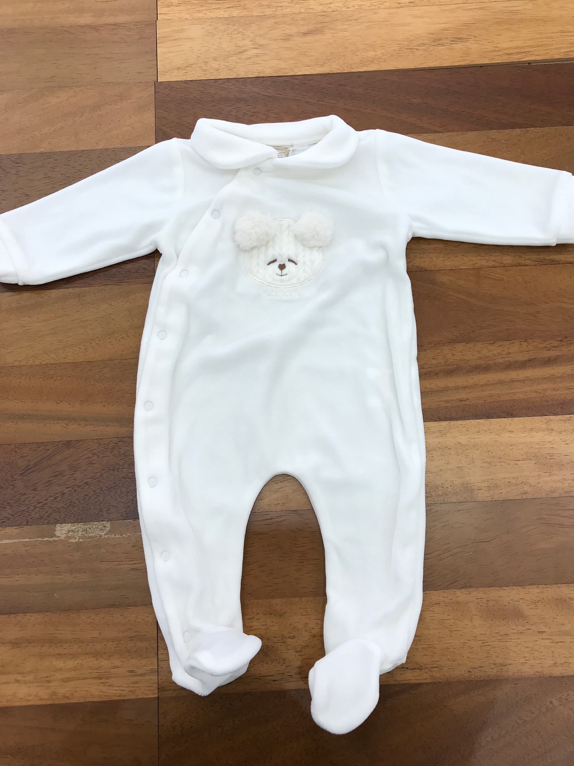 Intera tutina in ciniglia con colletto e piedini integrati, dotata di chiusura frontale laterale con bottoni a pressione. Presenta come dettaglio decorativo un cagnolino con orecchie pelose in rilievo.