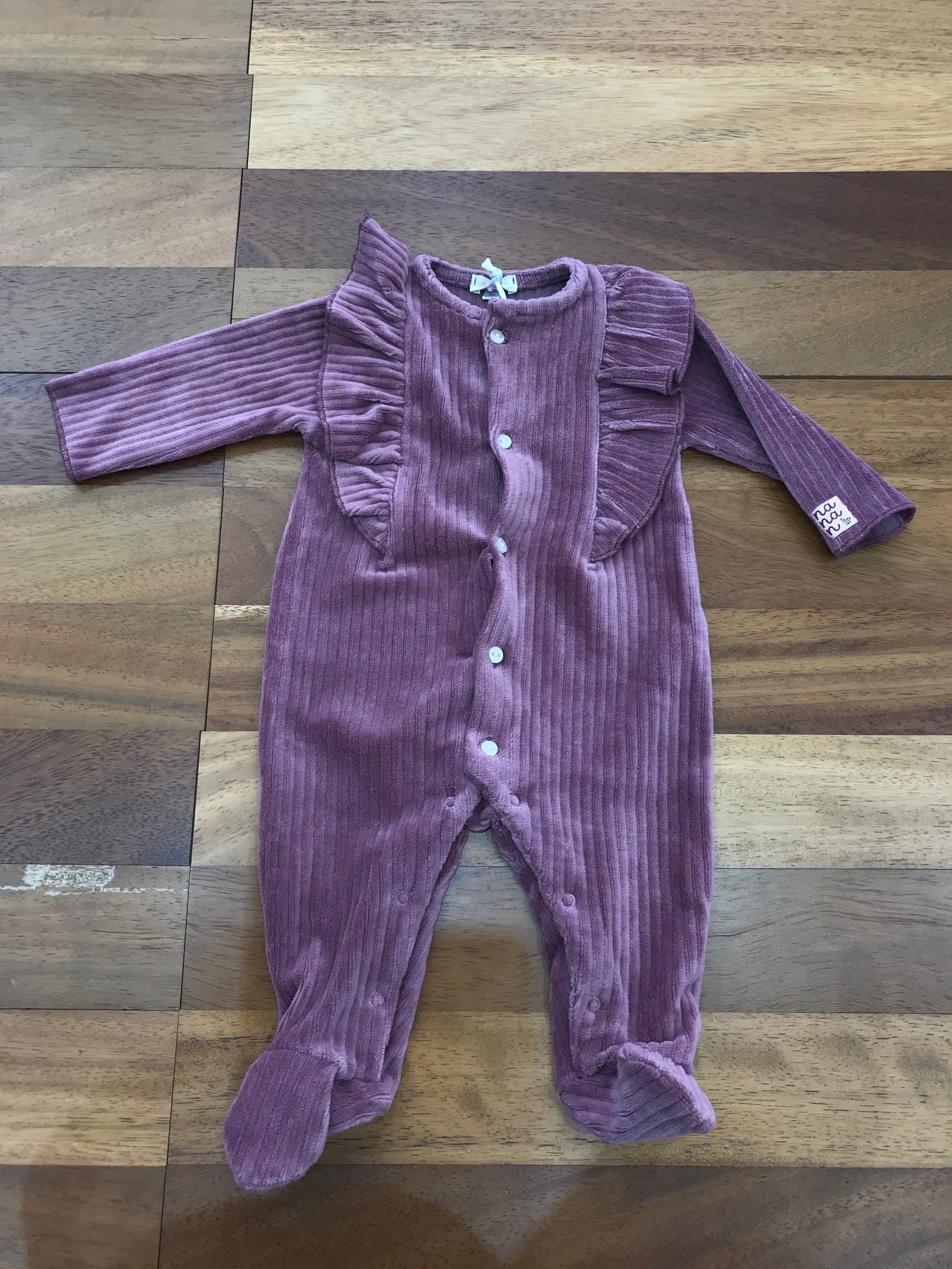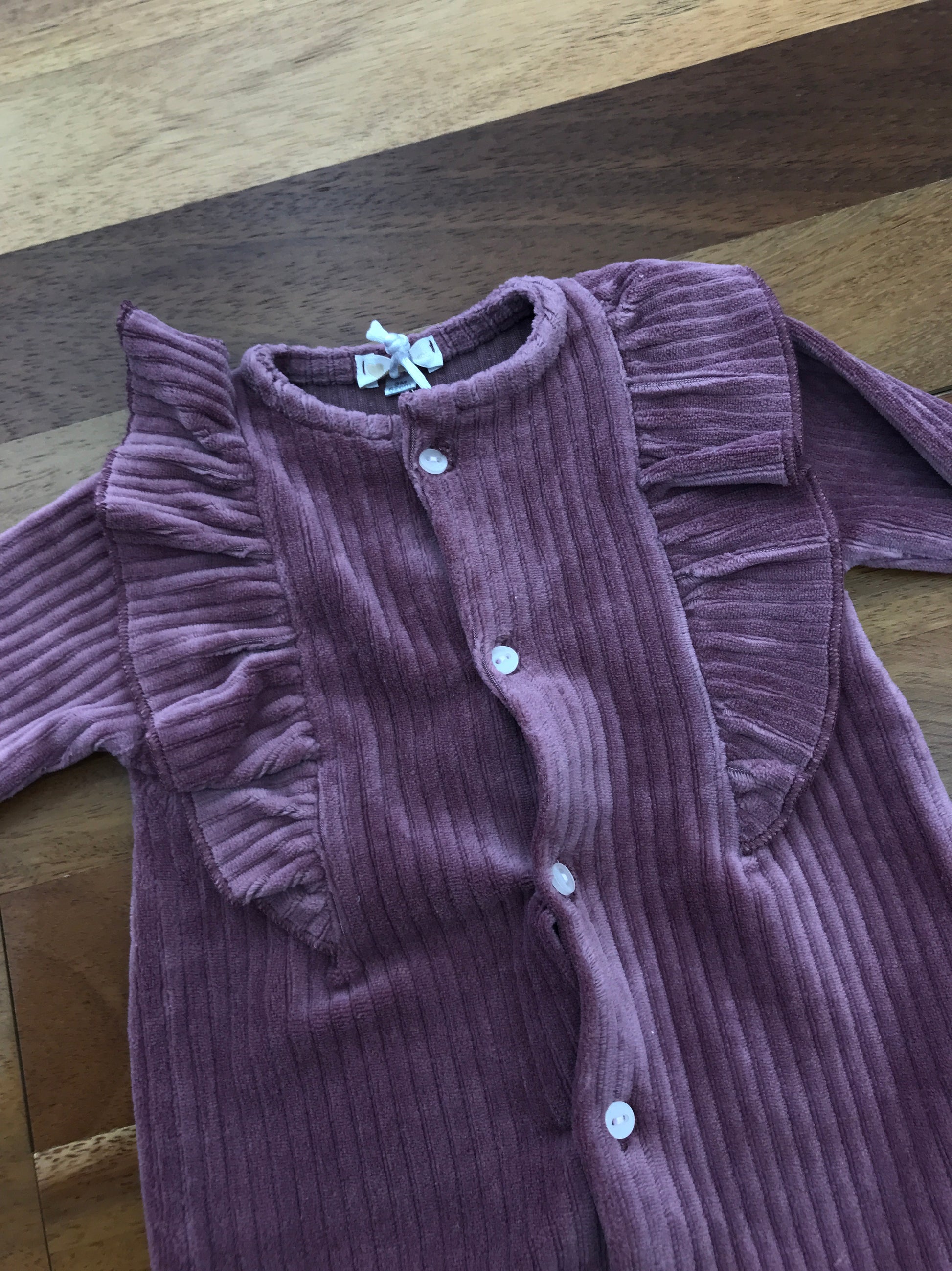 Intera tutina in ciniglia con tessuto rigato sotto le mani, dotata di piedini integrati e senza collo, arricchita da ruches sulle spalle per un tocco elegante.