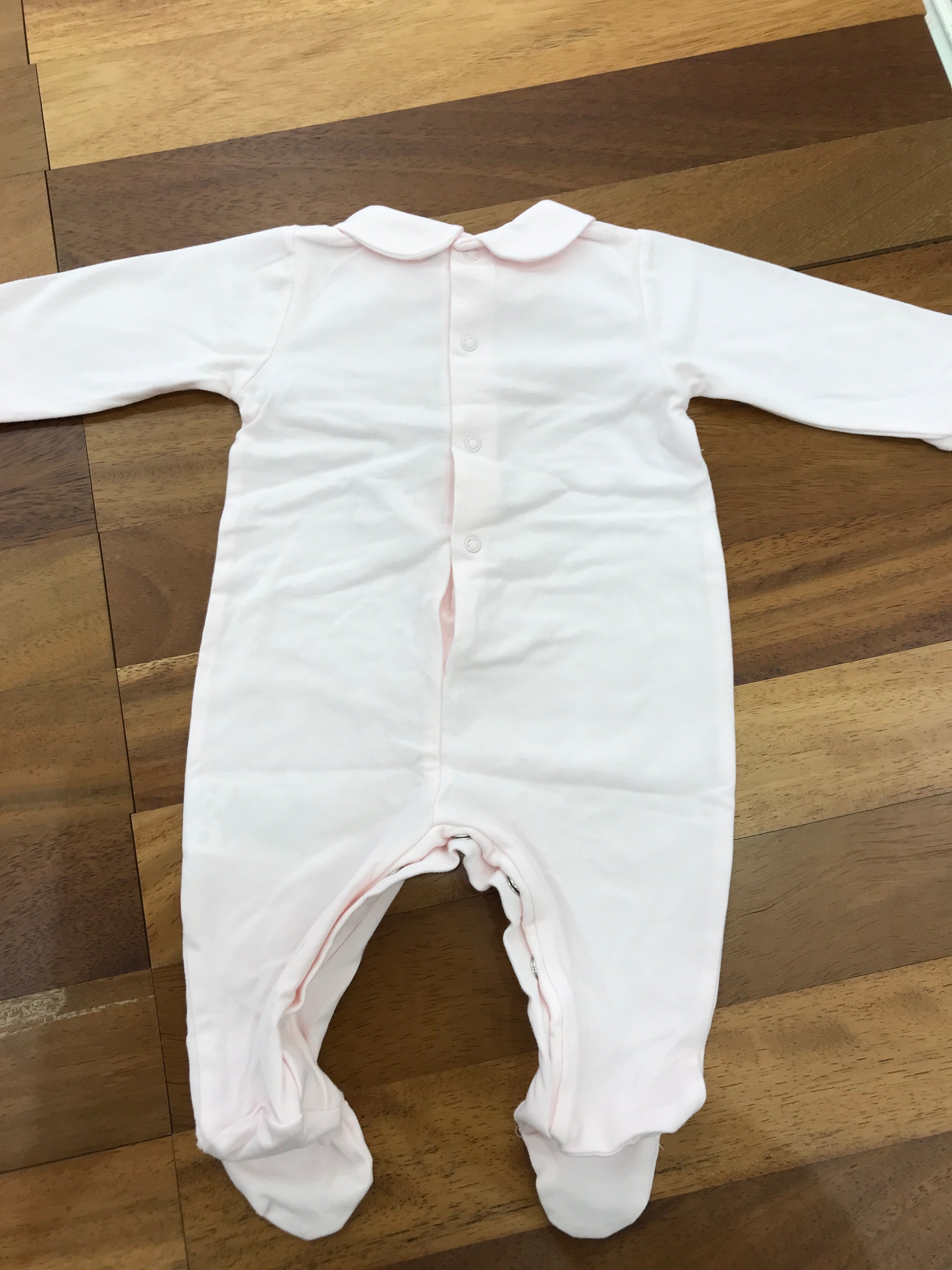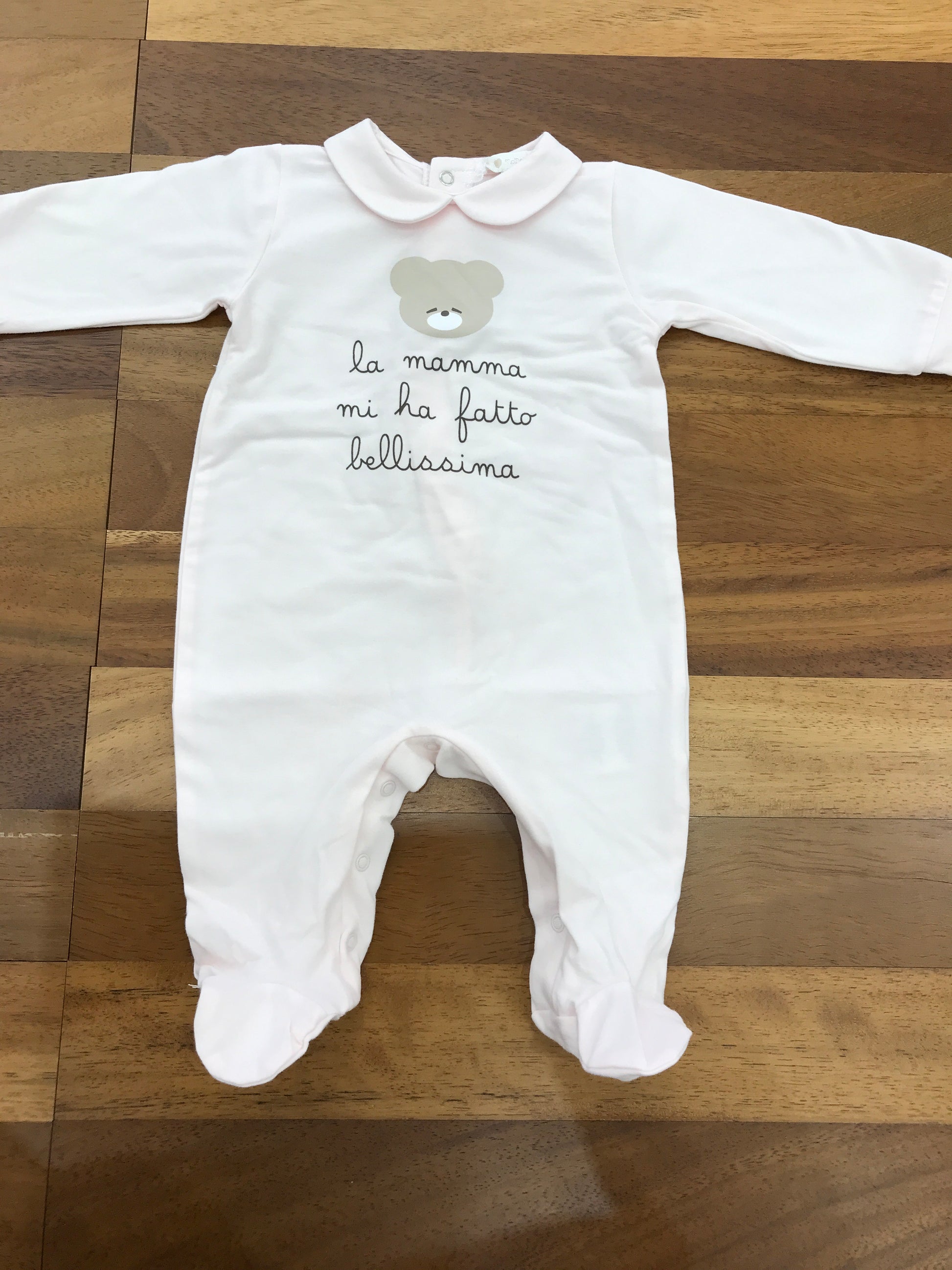 Questa tutina completa in morbido cotone caldo include piedini coperti e un colletto, con una frase applicata che recita "la mamma mi ha fatto bellissima" e un orsetto decorativo posizionato accanto alla scritta.