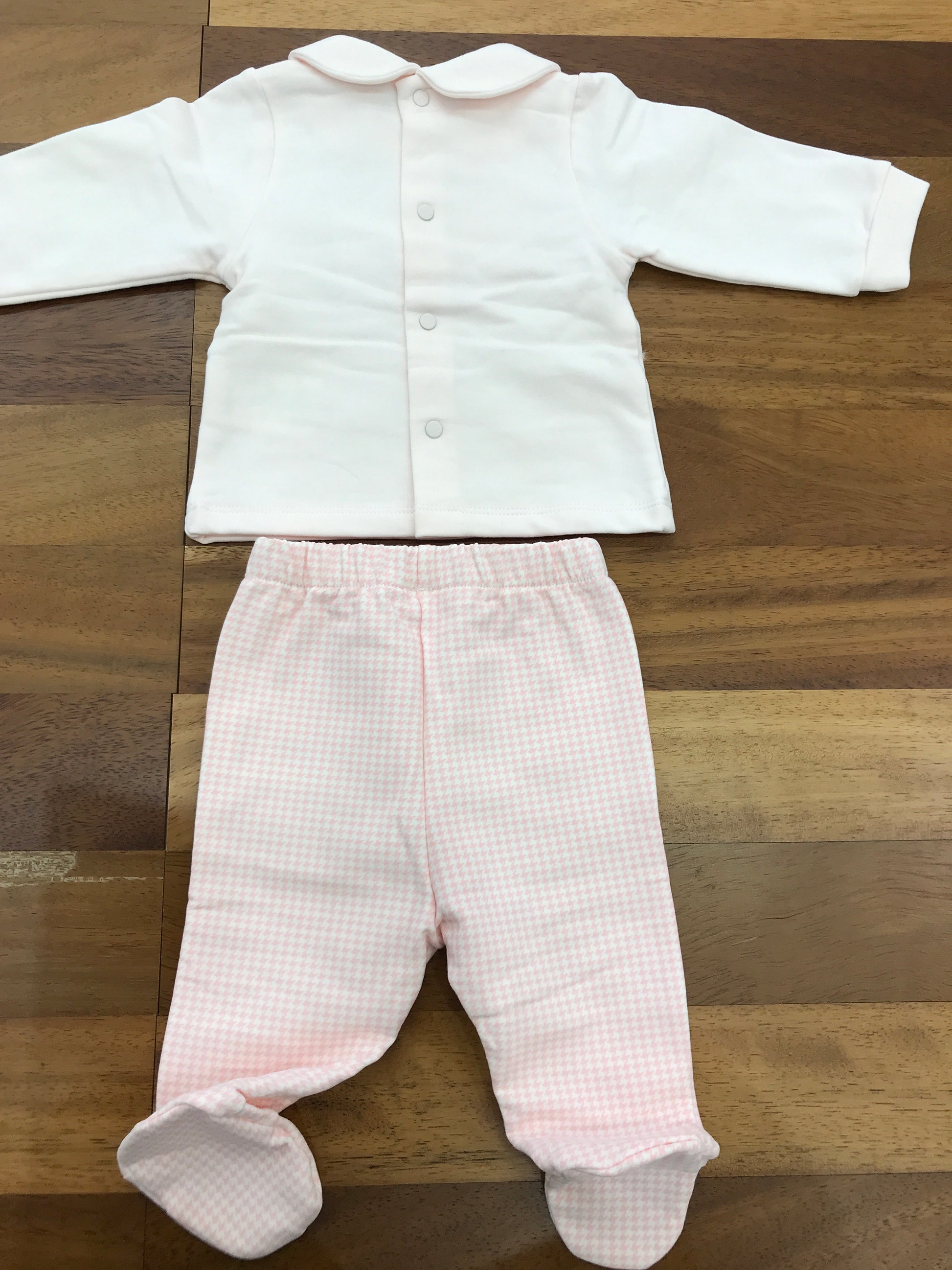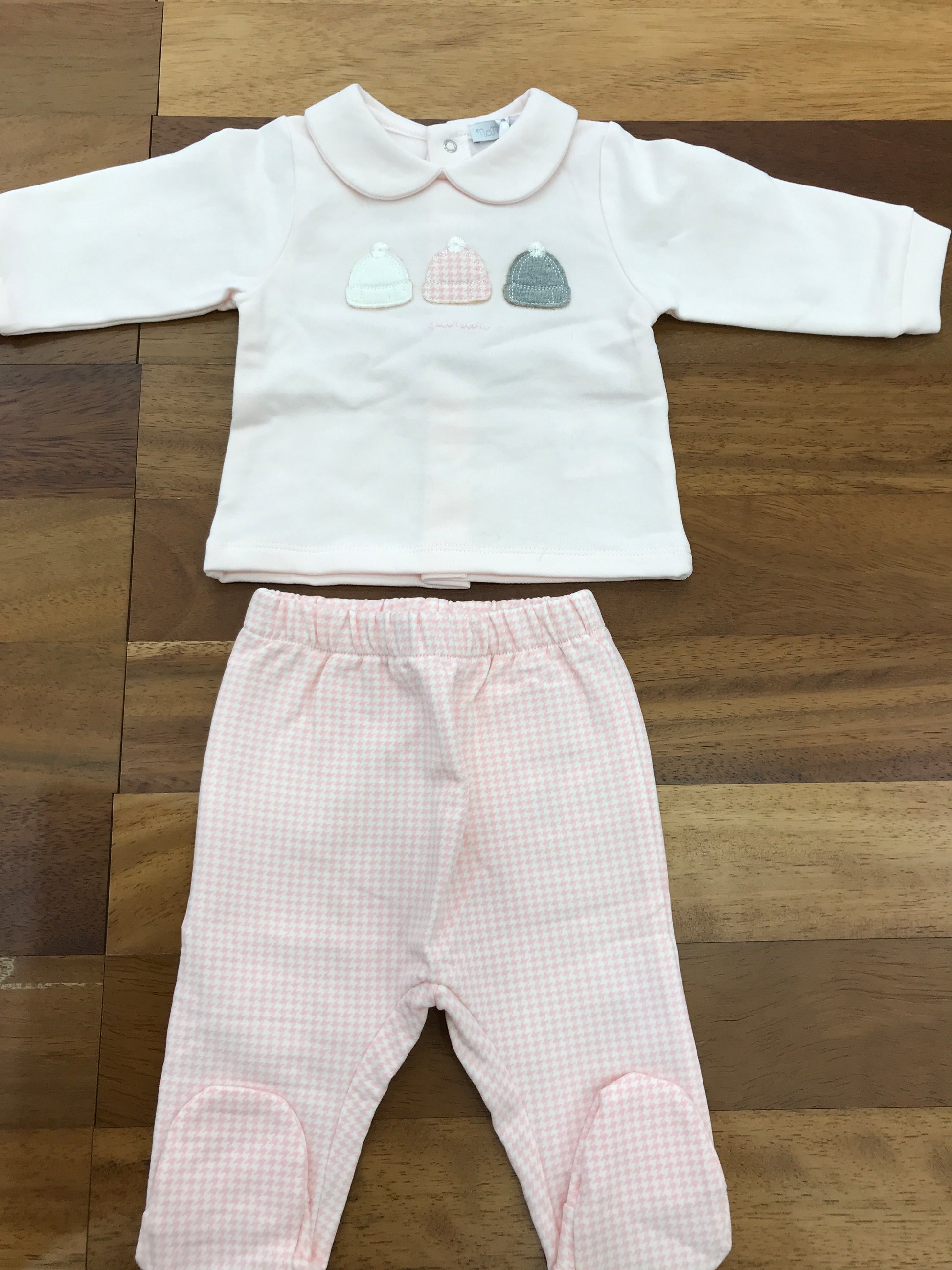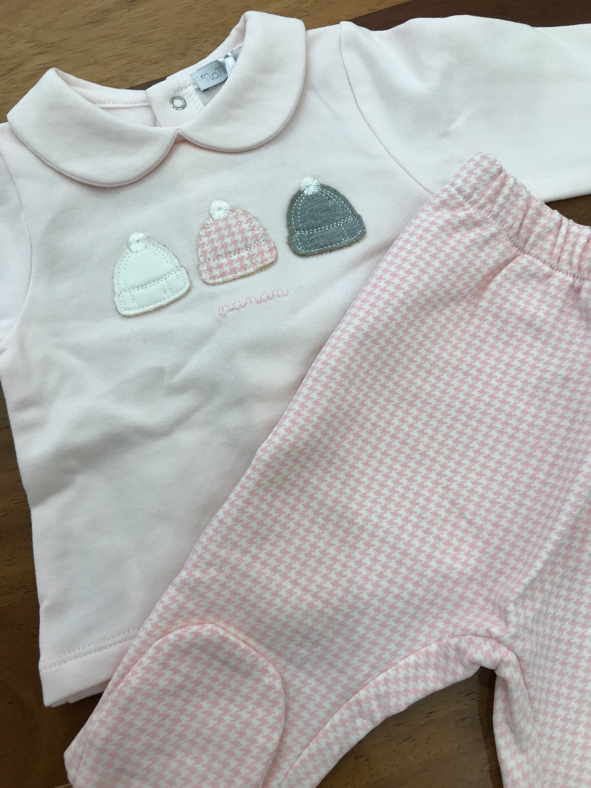 Completo due pezzi realizzato in caldo cotone, ideale per mantenere il bambino al caldo con comfort. La parte inferiore presenta un motivo a quadretti e include pratici piedini per proteggere i piedini del piccolo. La parte superiore è arricchita da tre piccoli cappellini ricamati in rilievo, che aggiungono un tocco decorativo raffinato, e dispone di un colletto elegante che completa il design con stile e cura nei dettagli.