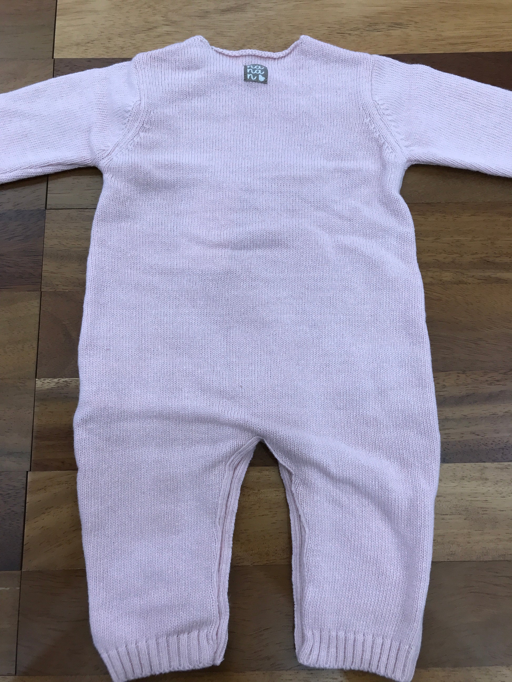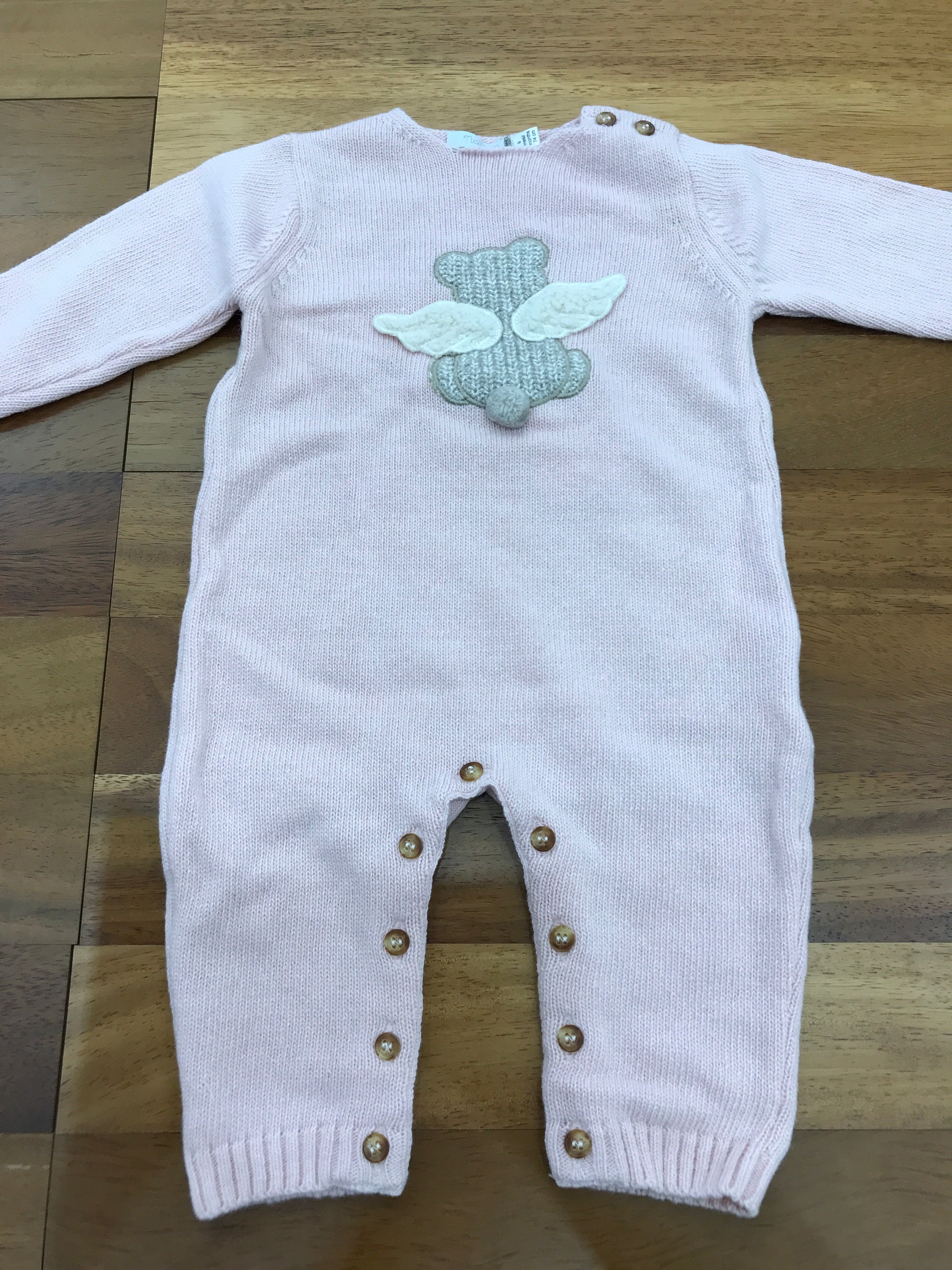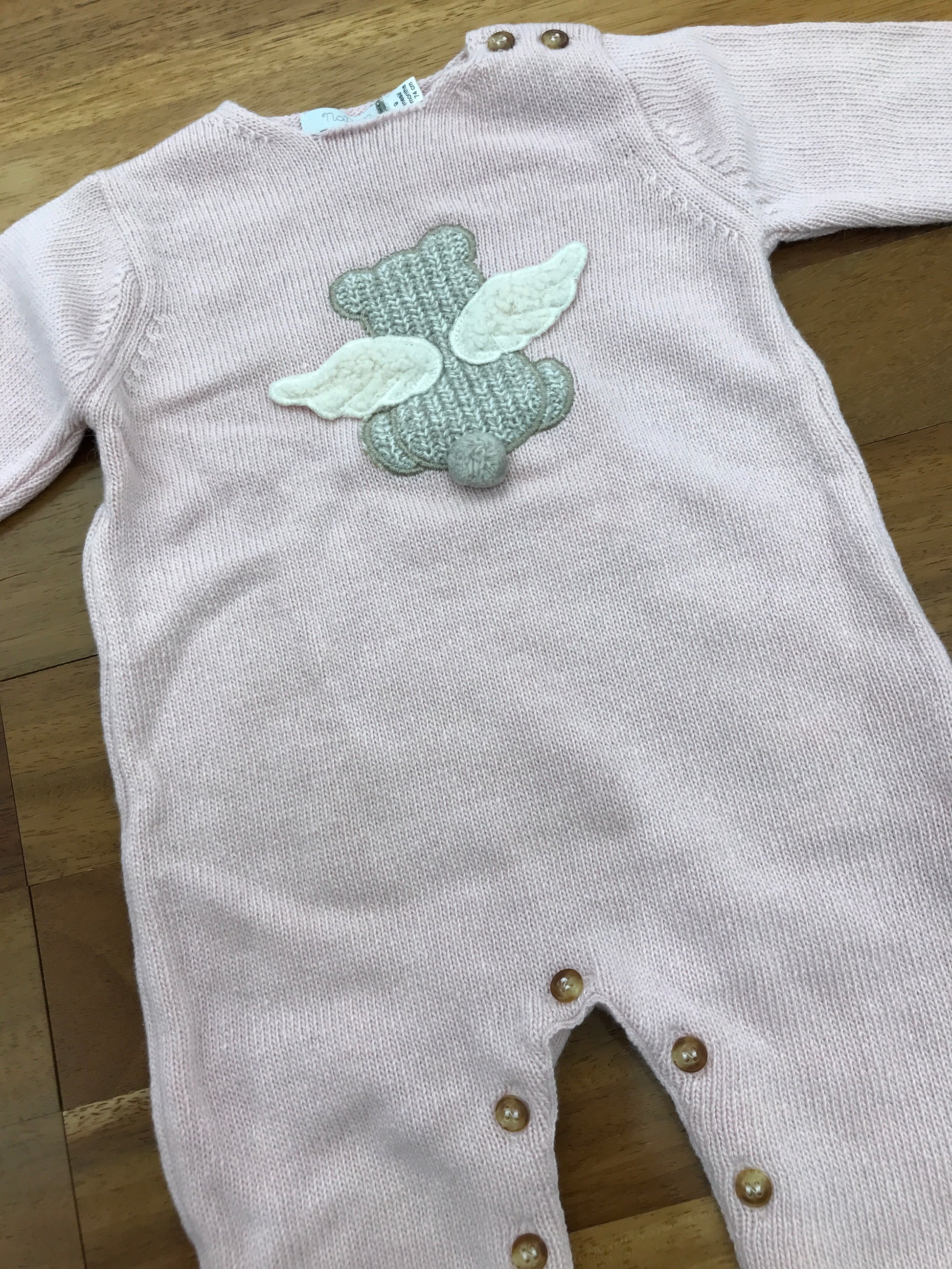 Tutina in lana a corpo unico, priva di piedini e colletto, decorata con un orsetto in rilievo che presenta due ali bianche sulla schiena.