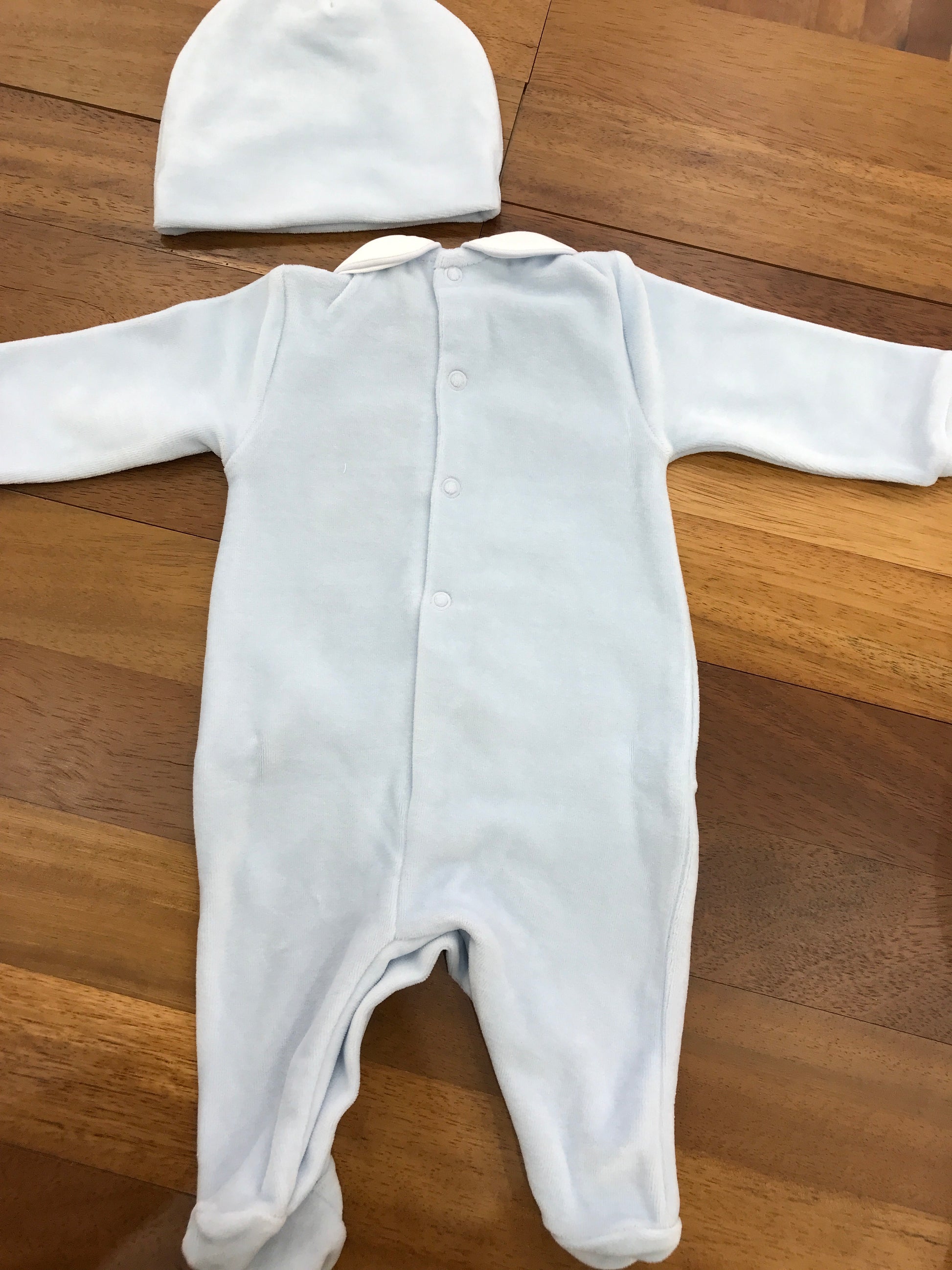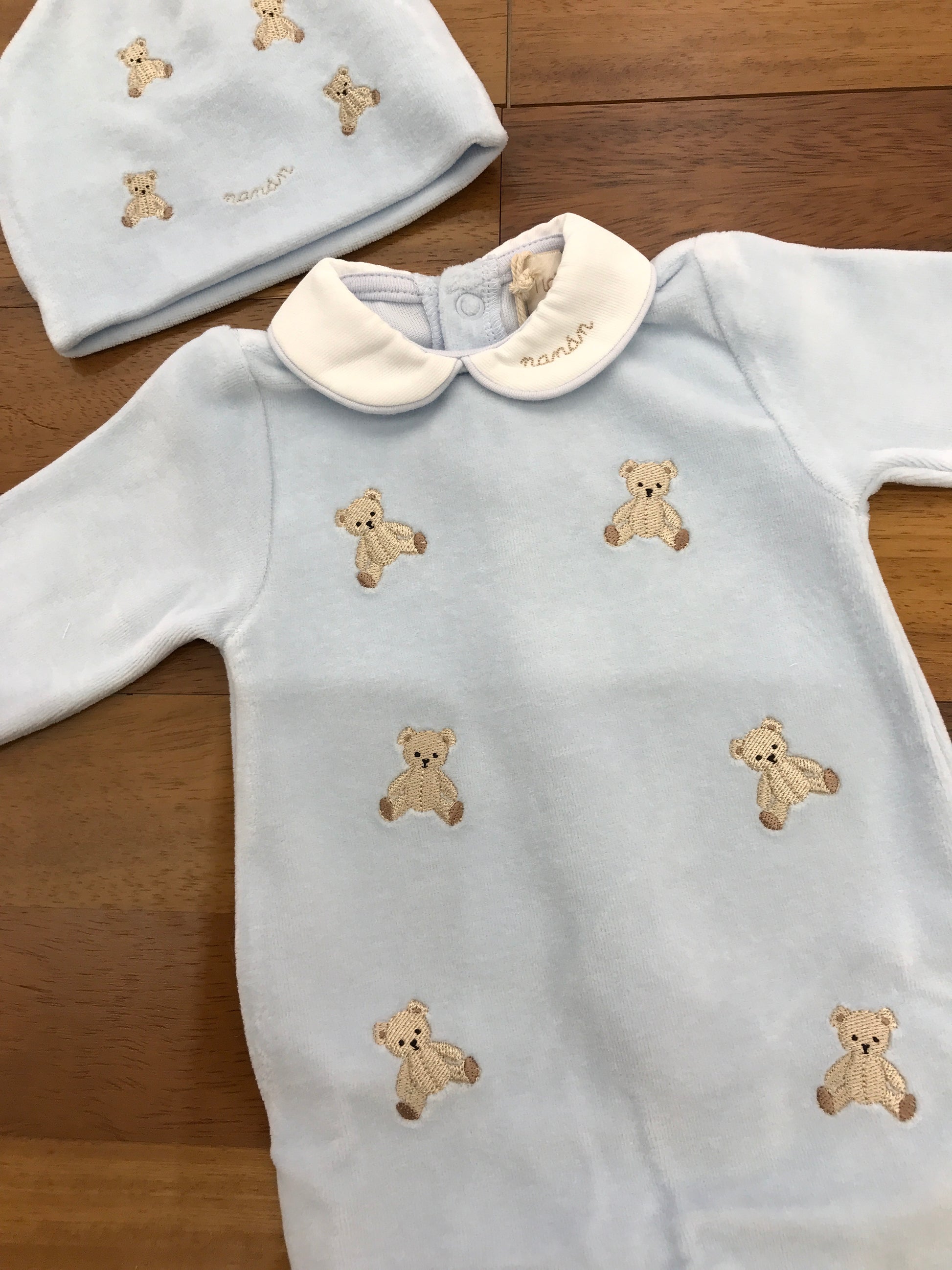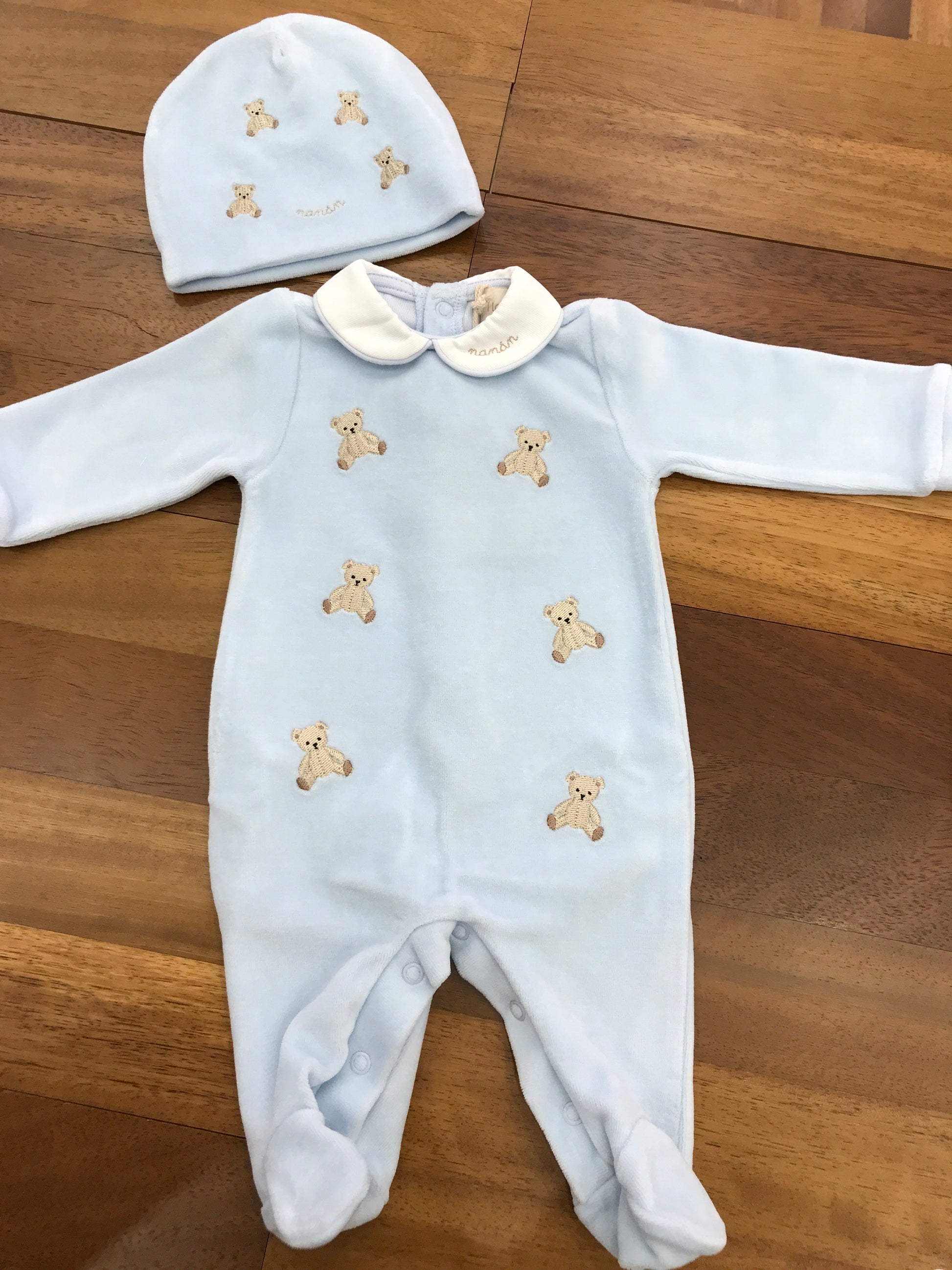 La tutina intera in ciniglia è completa di un cappellino coordinato e presenta delicati ricami di orsetti su entrambi gli elementi. La tutina è dotata di piedini chiusi e un colletto elegante, mentre il cappellino si distingue per la sua linea semplice, priva di risvolti, garantendo comfort e stile raffinato per il neonato.
