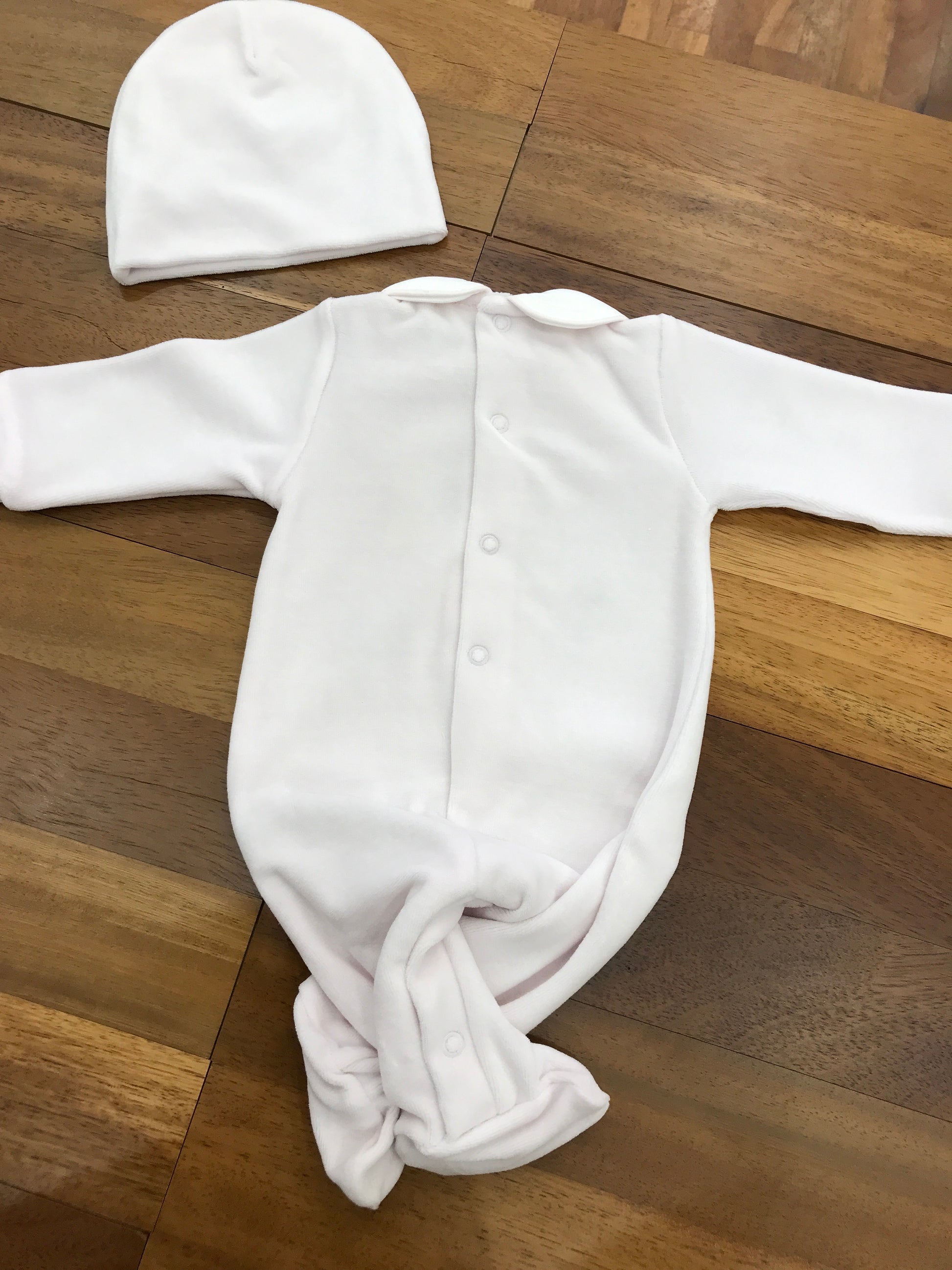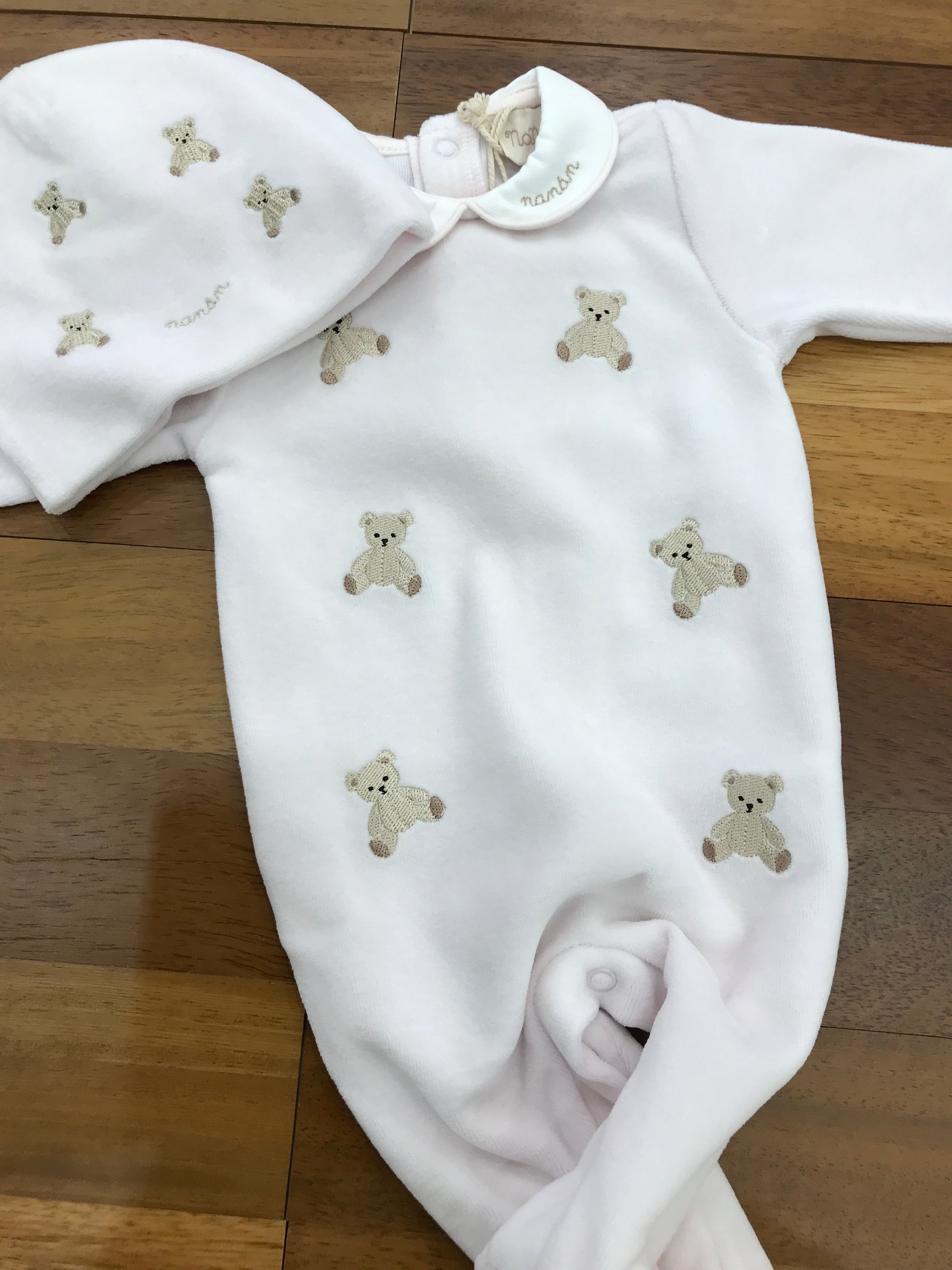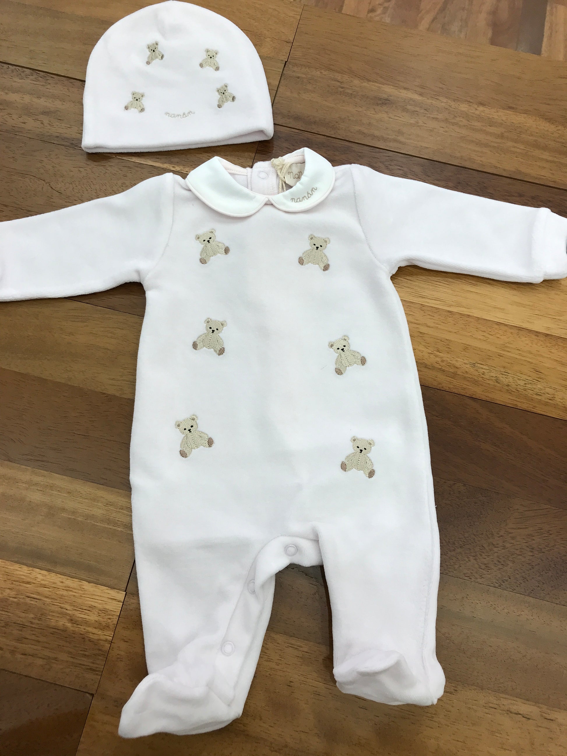 Questa tutina intera in morbida ciniglia è dotata di piedini integrati e un elegante colletto, offrendo comfort e protezione per il neonato. Il set comprende anche un cappellino coordinato, impreziosito dagli stessi delicati orsetti ricamati in beige, per un look armonioso e curato nei dettagli.