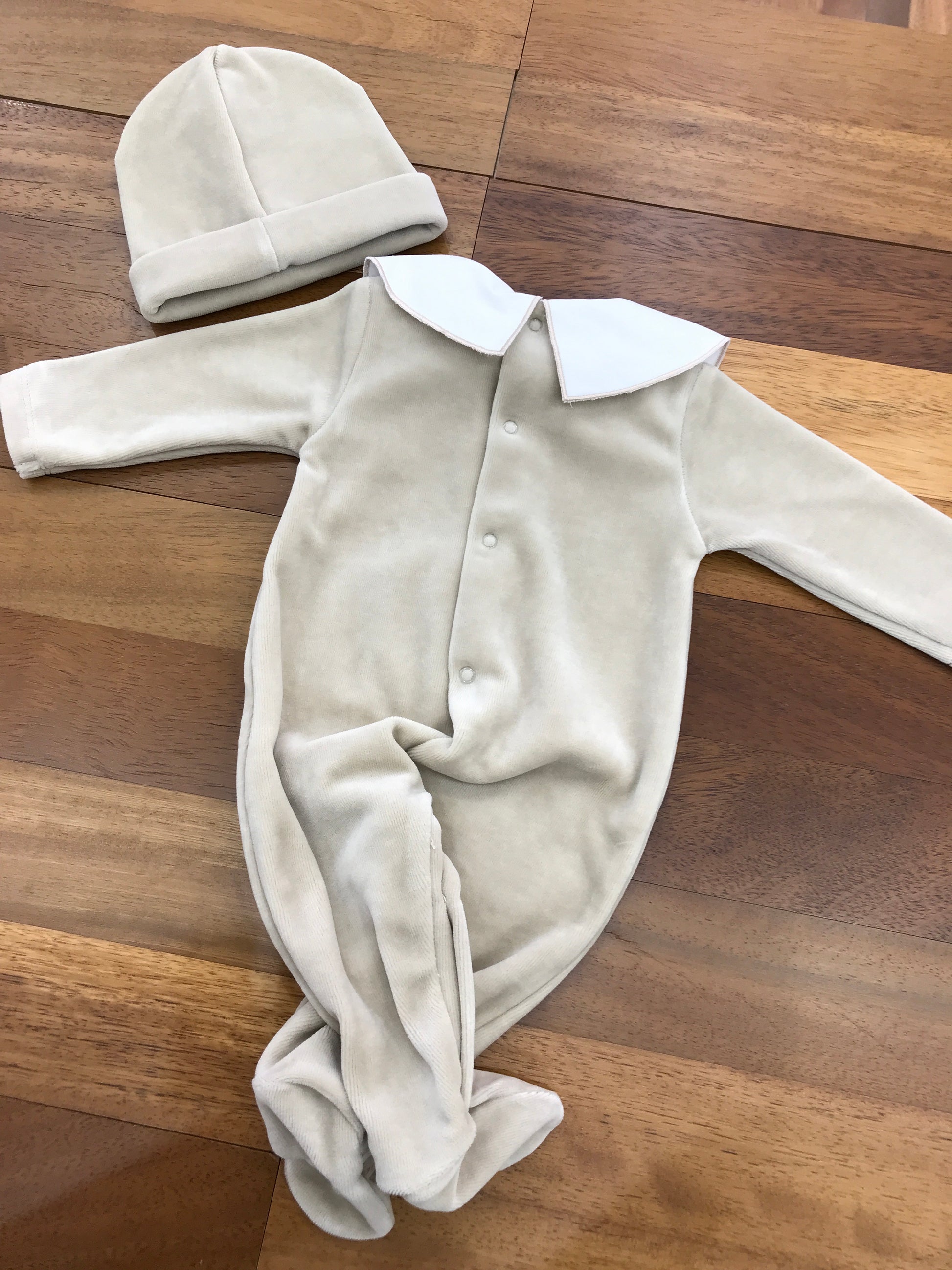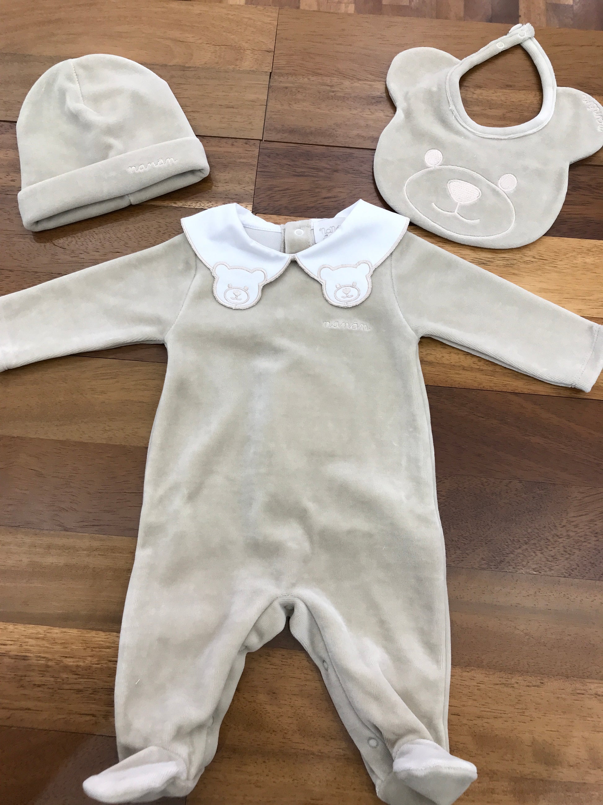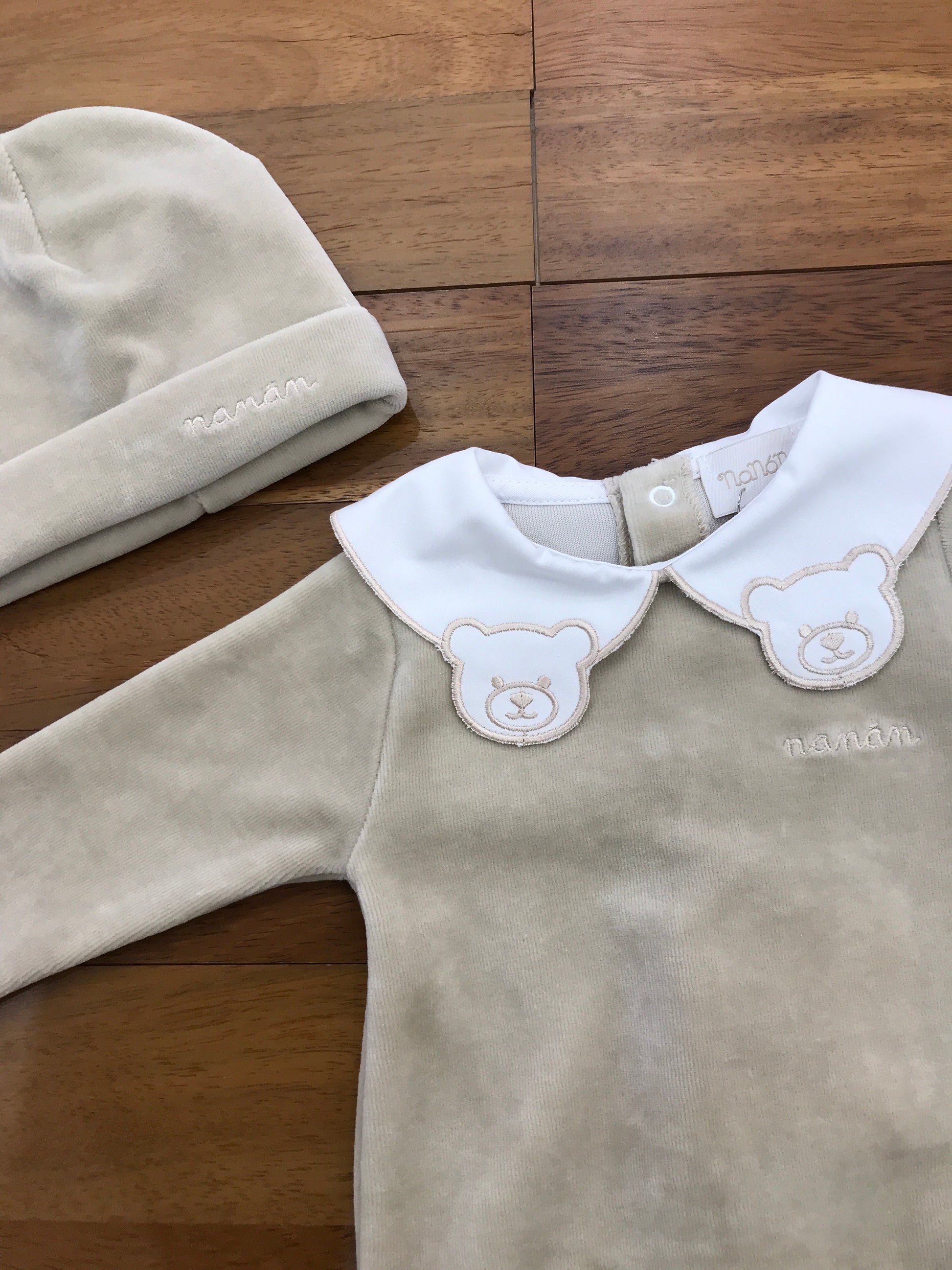 Questa tutina intera in ciniglia è progettata per garantire il massimo comfort ai neonati, grazie alla morbidezza del tessuto e alla presenza di piedini integrati che mantengono i piedini caldi senza bisogno di calze aggiuntive. Il colletto bianco, impreziosito da due orsetti ricamati, aggiunge un tocco di eleganza e dolcezza al capo. Il set include anche un cappellino coordinato con un piccolo risvolto e il logo Nanan, che completa l’outfit con stile e cura dei dettagli, ideale per le prime uscite o per il riposo quotidiano.