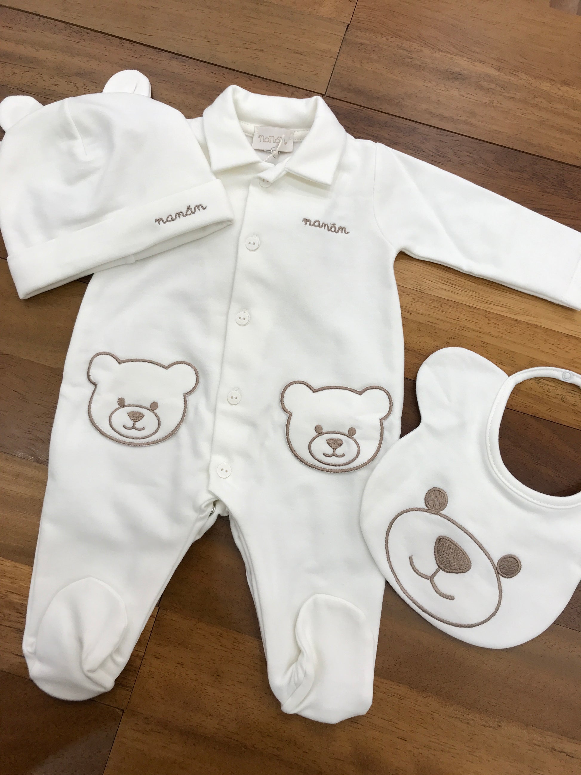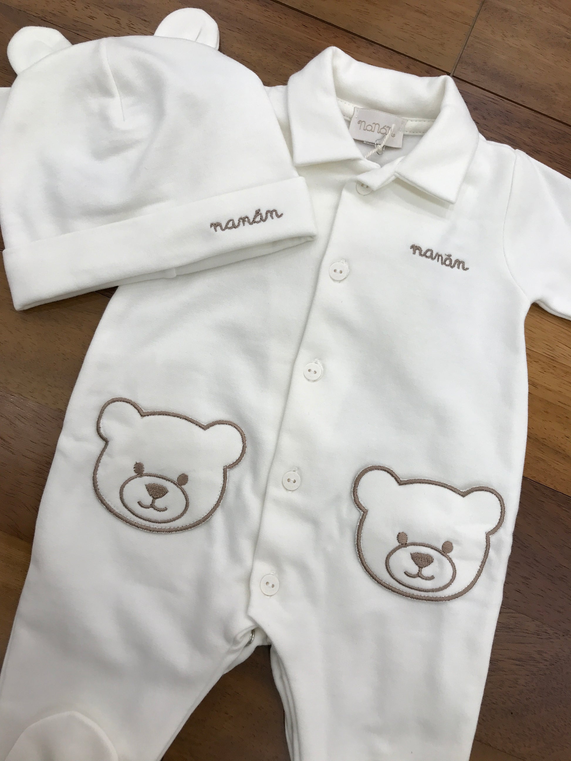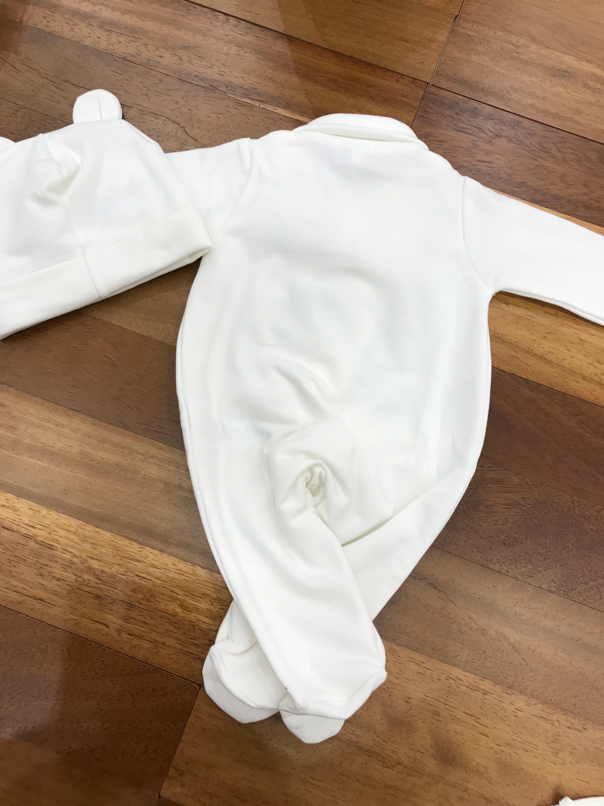 Questa tutina intera, realizzata in caldo cotone, è pensata per offrire comfort e protezione al neonato. Presenta piedini integrati e un colletto delicato, arricchita da due orsetti ricamati sul davanti che donano un tocco di tenerezza. Il completo include anche un cappellino coordinato, anch’esso in caldo cotone, caratterizzato da un piccolo risvolto e due orecchie decorative, ideale per mantenere la testa del bambino al caldo con stile. Un capo pratico e raffinato, perfetto per le stagioni più fresche.