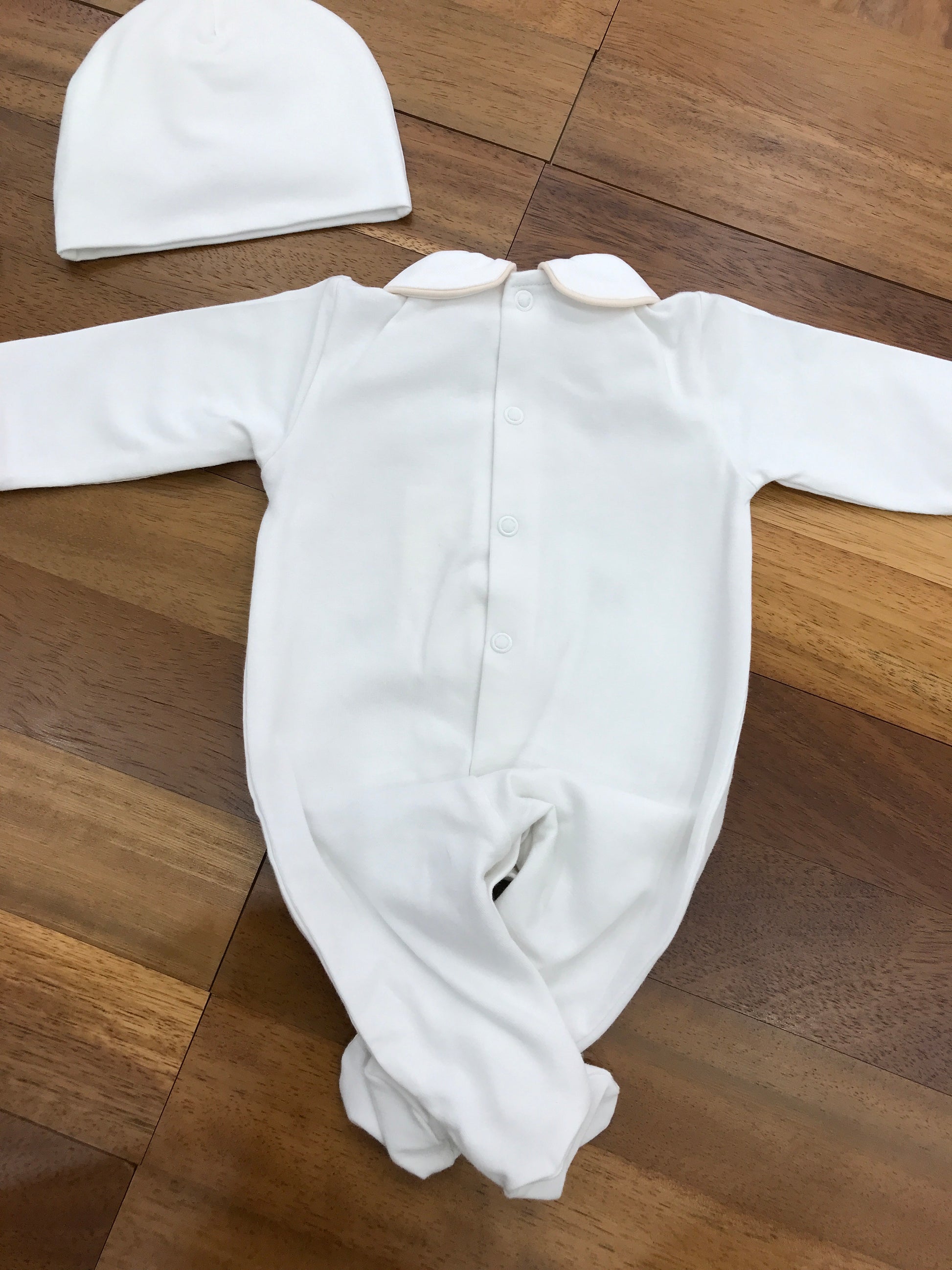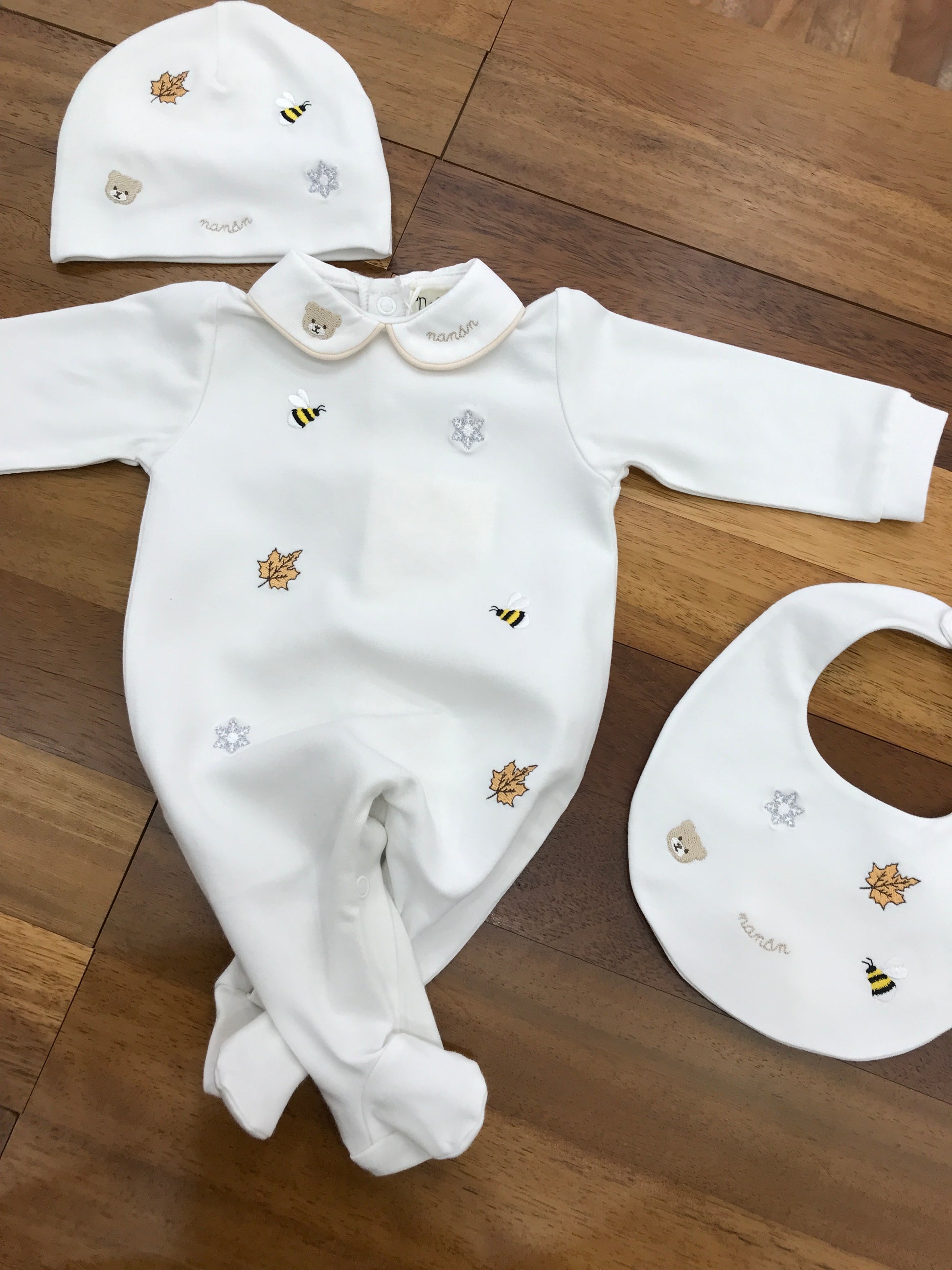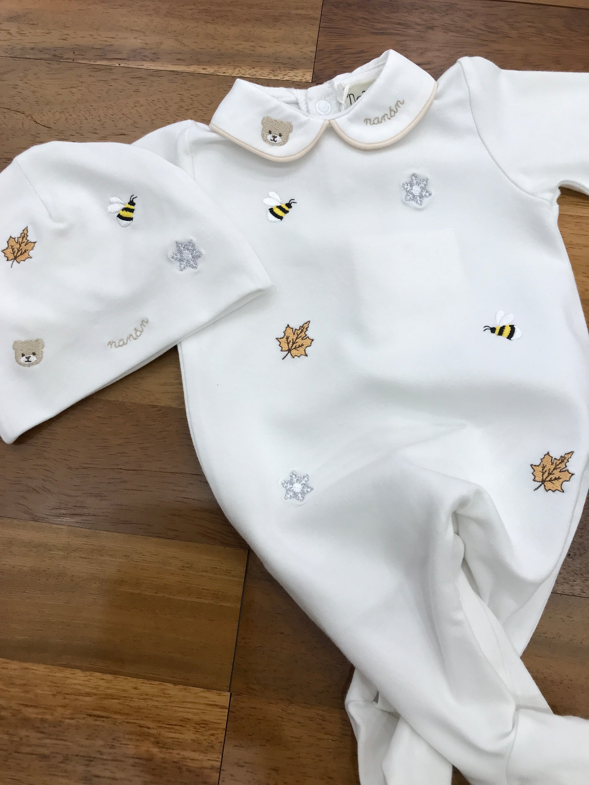 Questa tutina intera, realizzata in caldo cotone, è progettata per garantire comfort e calore al neonato. Presenta piedini integrati e un colletto delicato, offrendo una vestibilità completa e protettiva. La superficie è decorata con ricami raffinati che includono motivi come fiocchi di neve, api, orsetti e foglie, aggiungendo un tocco di dolcezza e originalità al capo. Il set comprende anche un cappellino coordinato, impreziosito dagli stessi ricami della tutina, per completare l’outfit con eleganza e cura nei dettagli.