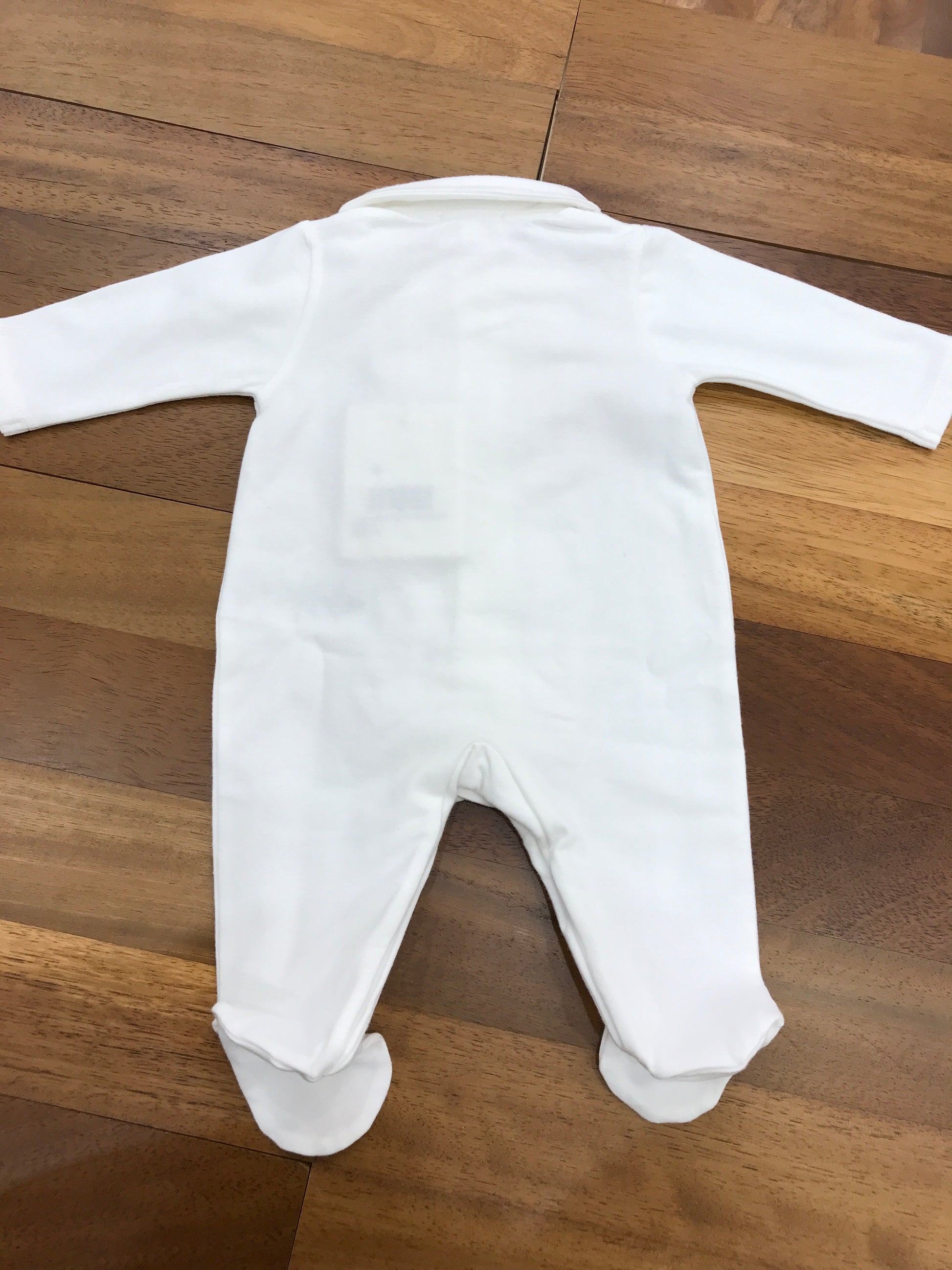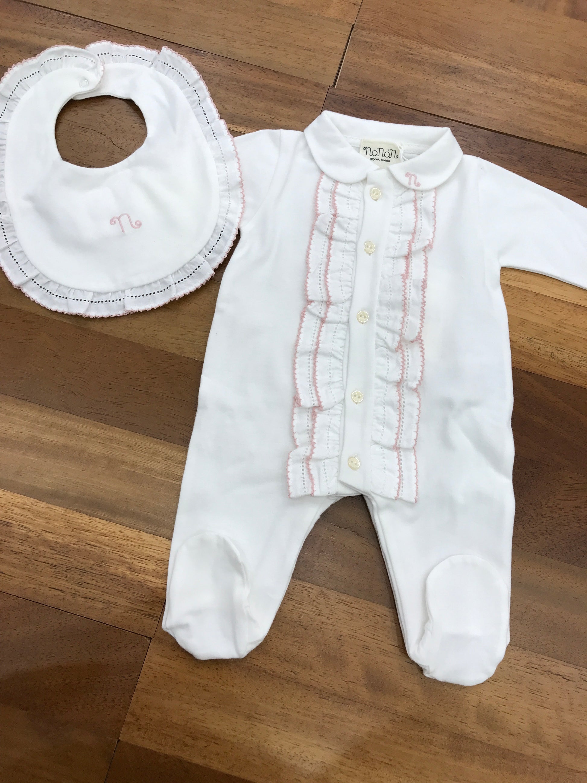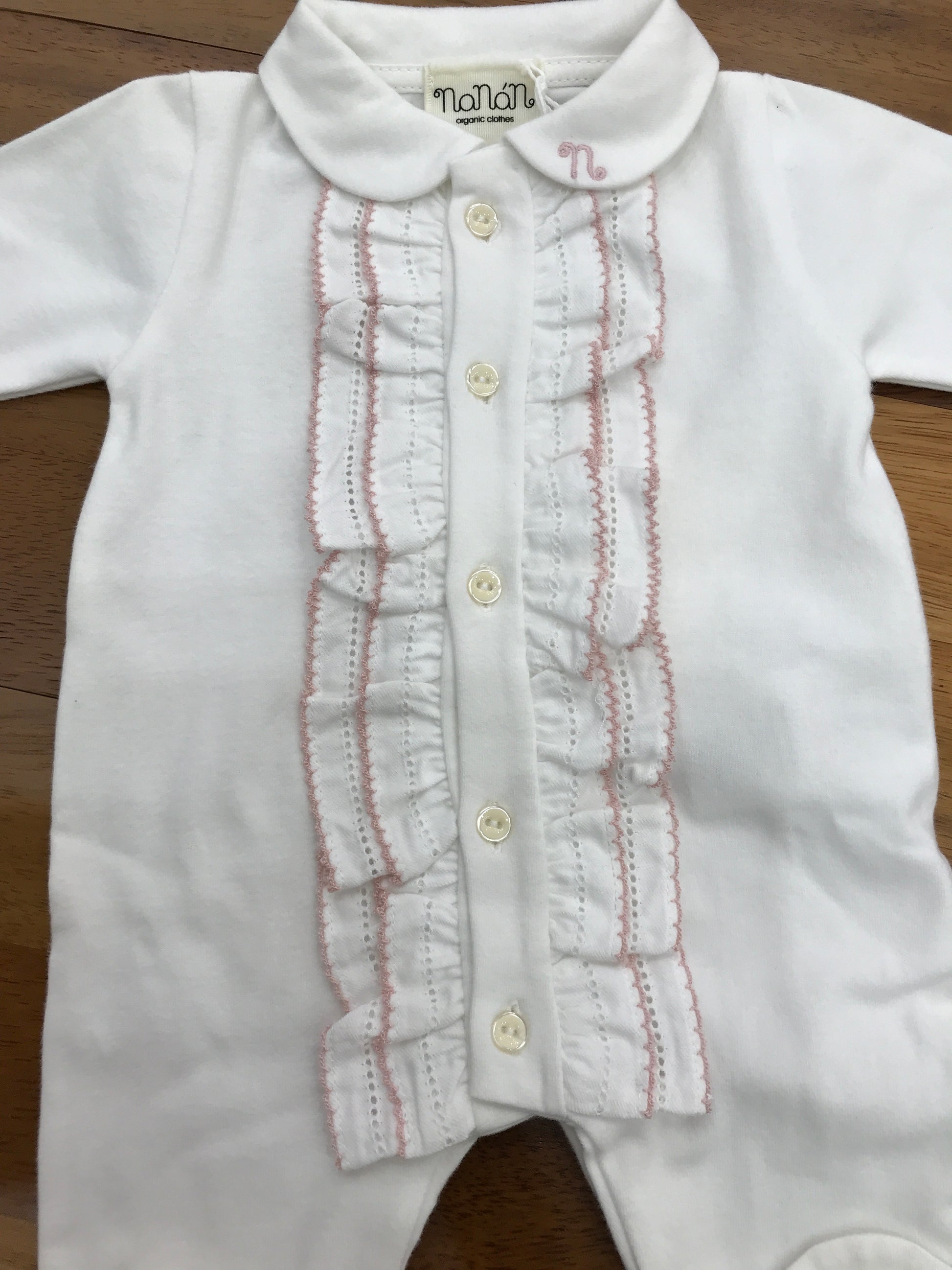 Questa tutina intera, realizzata in caldo cotone, è caratterizzata da delicate ruches bianche con bordi rosa che decorano la parte frontale, conferendo un tocco di eleganza e dolcezza. Progettata per offrire comfort totale, la tutina include piedini integrati per mantenere i piedini del bambino sempre caldi e un colletto che aggiunge un dettaglio raffinato, garantendo al contempo una vestibilità comoda e protettiva.