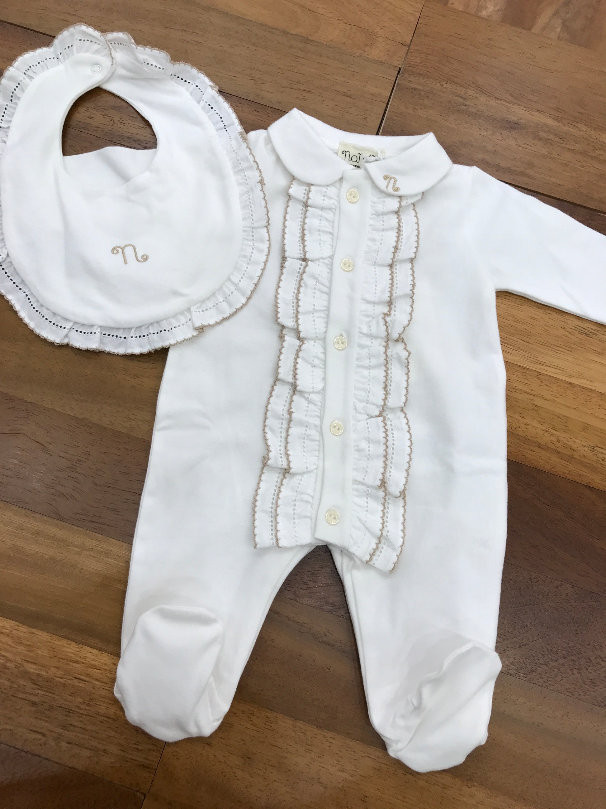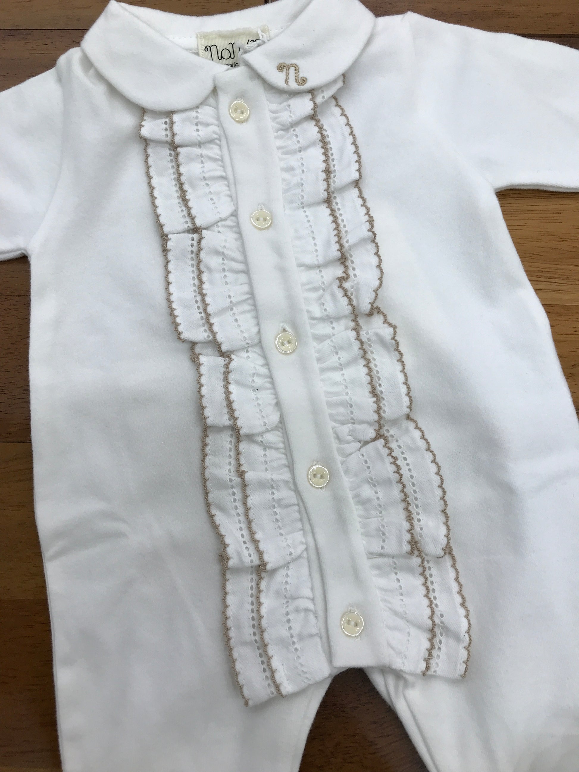 Questa tutina intera, realizzata in caldo cotone, è caratterizzata da delicate ruches bianche con bordi beige che decorano la parte frontale, conferendo un tocco di eleganza e dolcezza. Progettata per offrire comfort totale, la tutina include piedini integrati per mantenere i piedini del bambino sempre caldi e un colletto che aggiunge un dettaglio raffinato, garantendo al contempo una vestibilità comoda e protettiva.