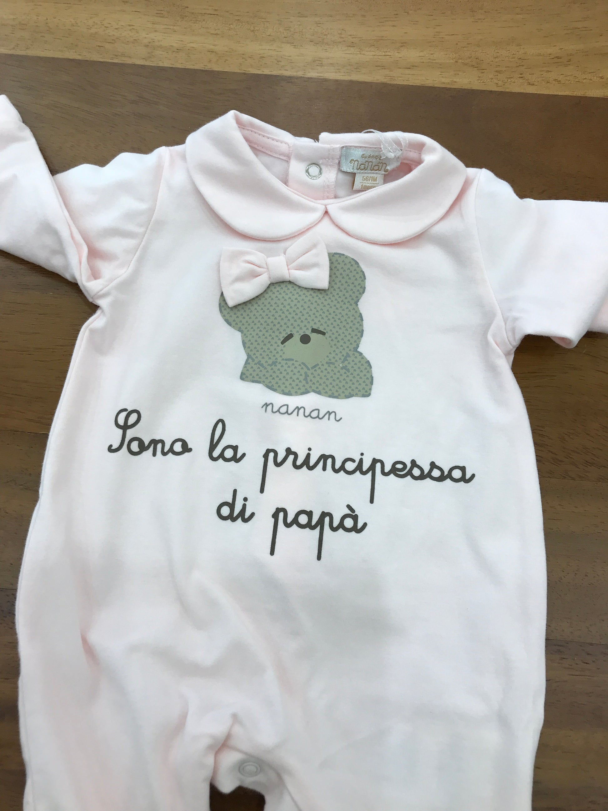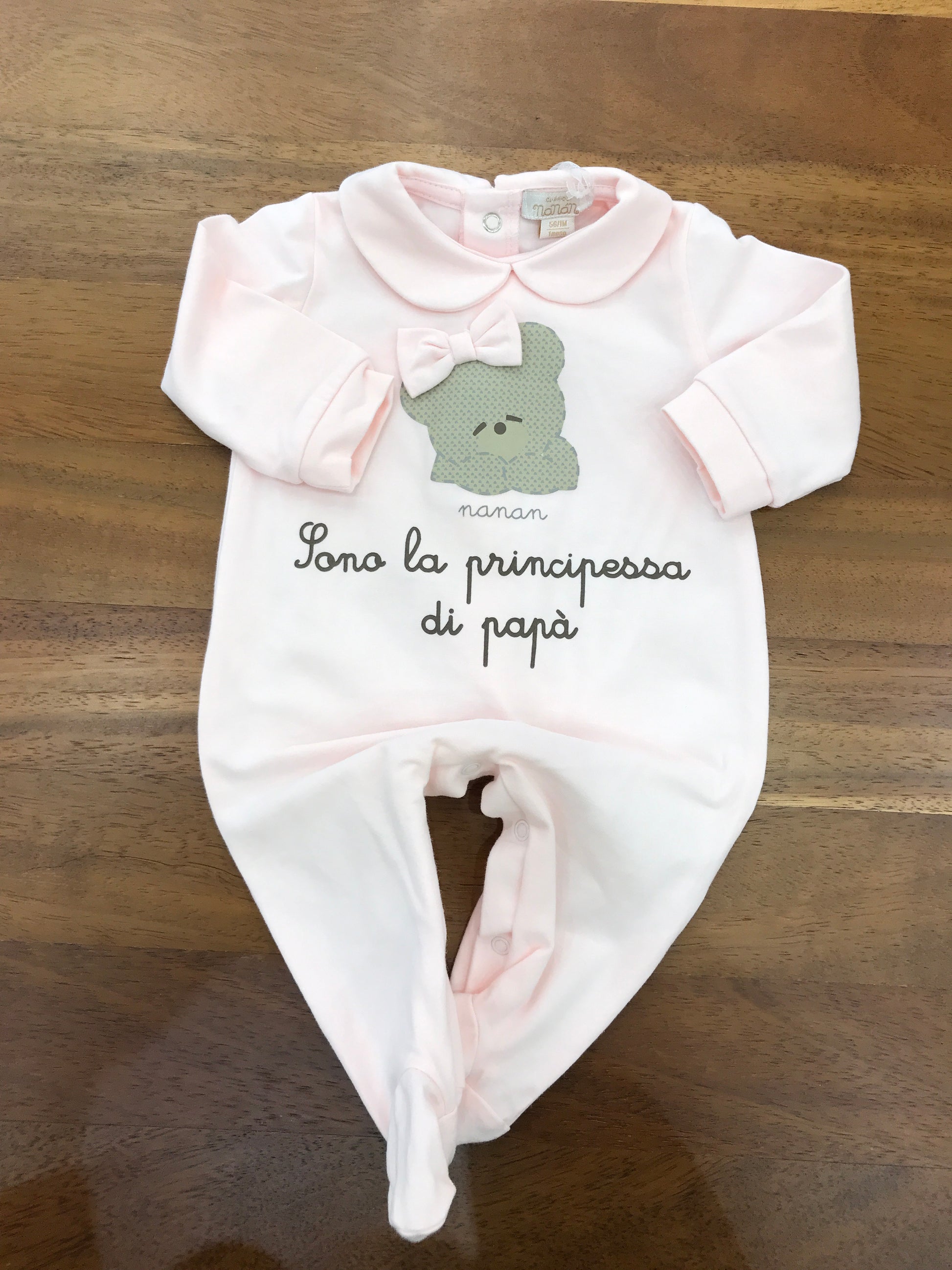 Questa tutina intera è realizzata in caldo cotone, ideale per mantenere il bambino avvolto nel comfort. Include piedini integrati per proteggere i piedini senza bisogno di calzini e un delicato colletto che aggiunge un tocco di eleganza. Sulla parte frontale è decorata con un orsetto in rilievo dal fiocchetto rosa, accompagnato dalla scritta "sono la principessa di papà", che rende il capo unico e affettuoso.
