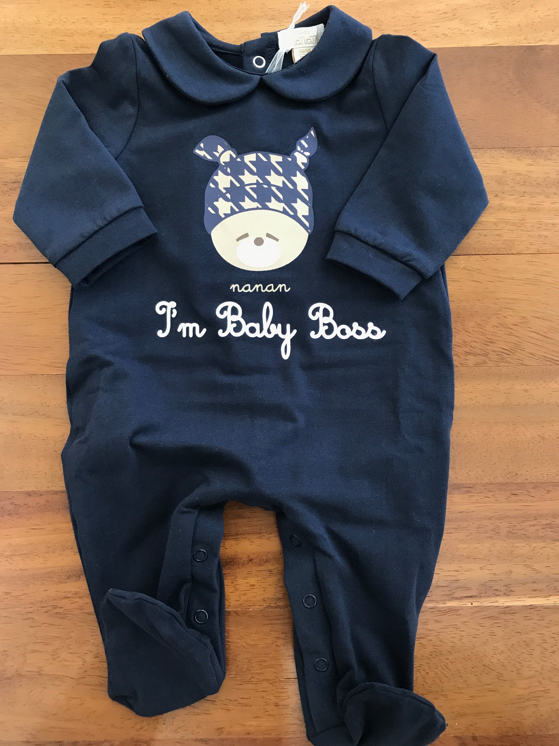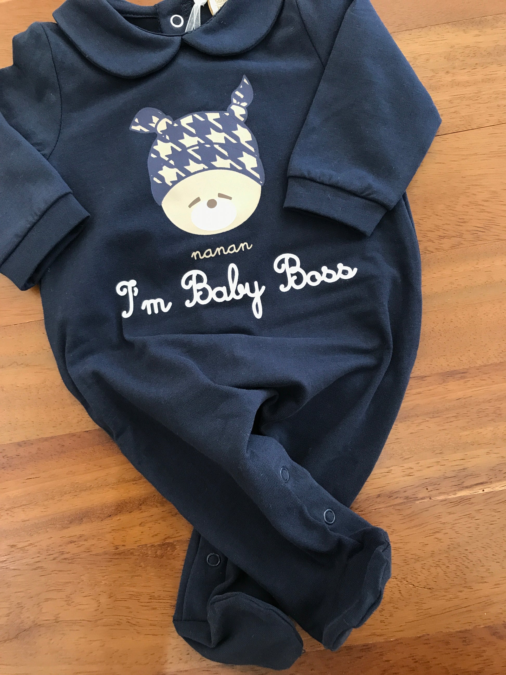 Questa tutina in morbido cotone caldo è dotata di piedini e colletto, con un design intero che assicura comfort completo. Sul davanti è decorata con un tenero orsetto e la scritta "I'm baby boss".