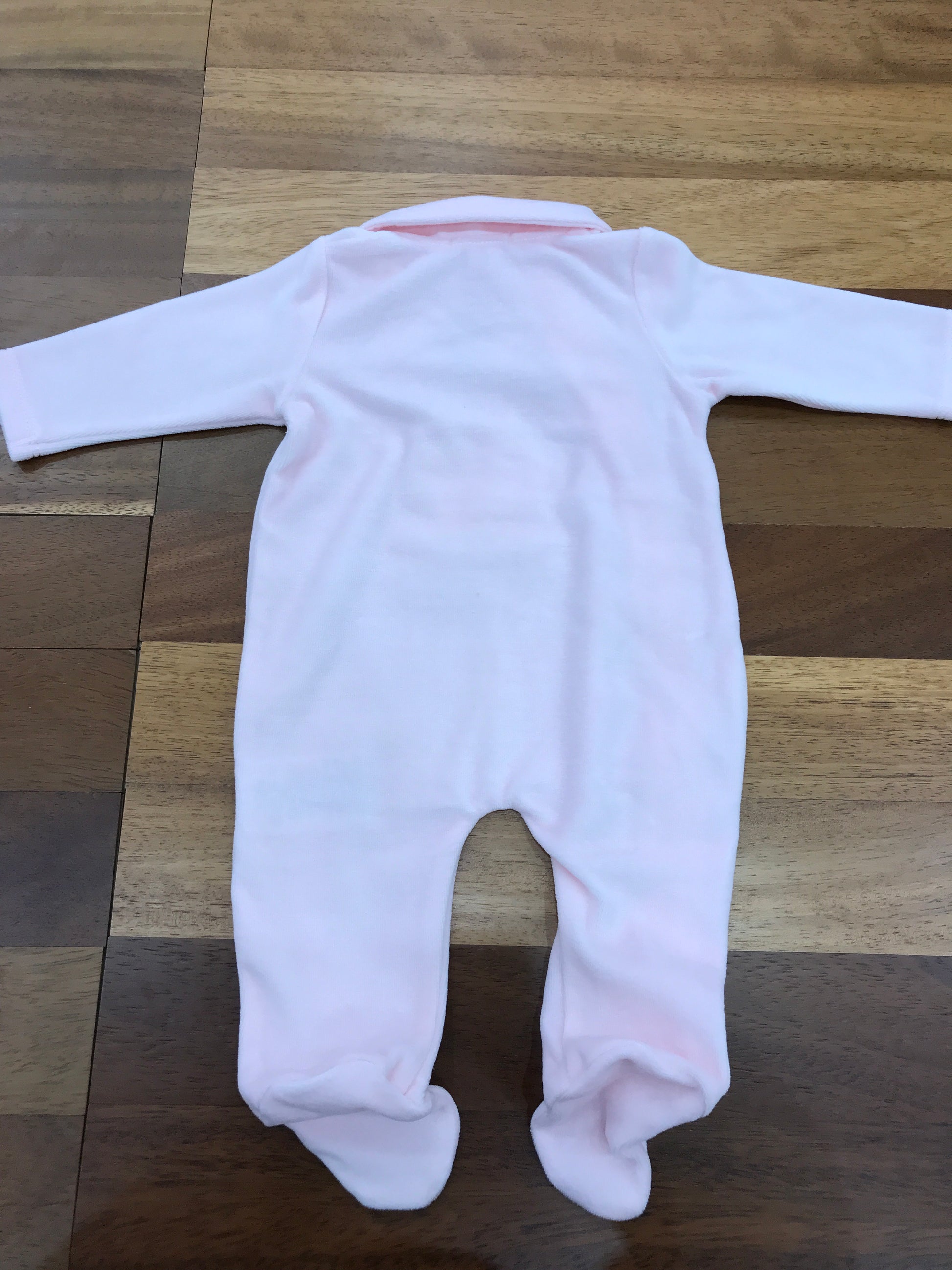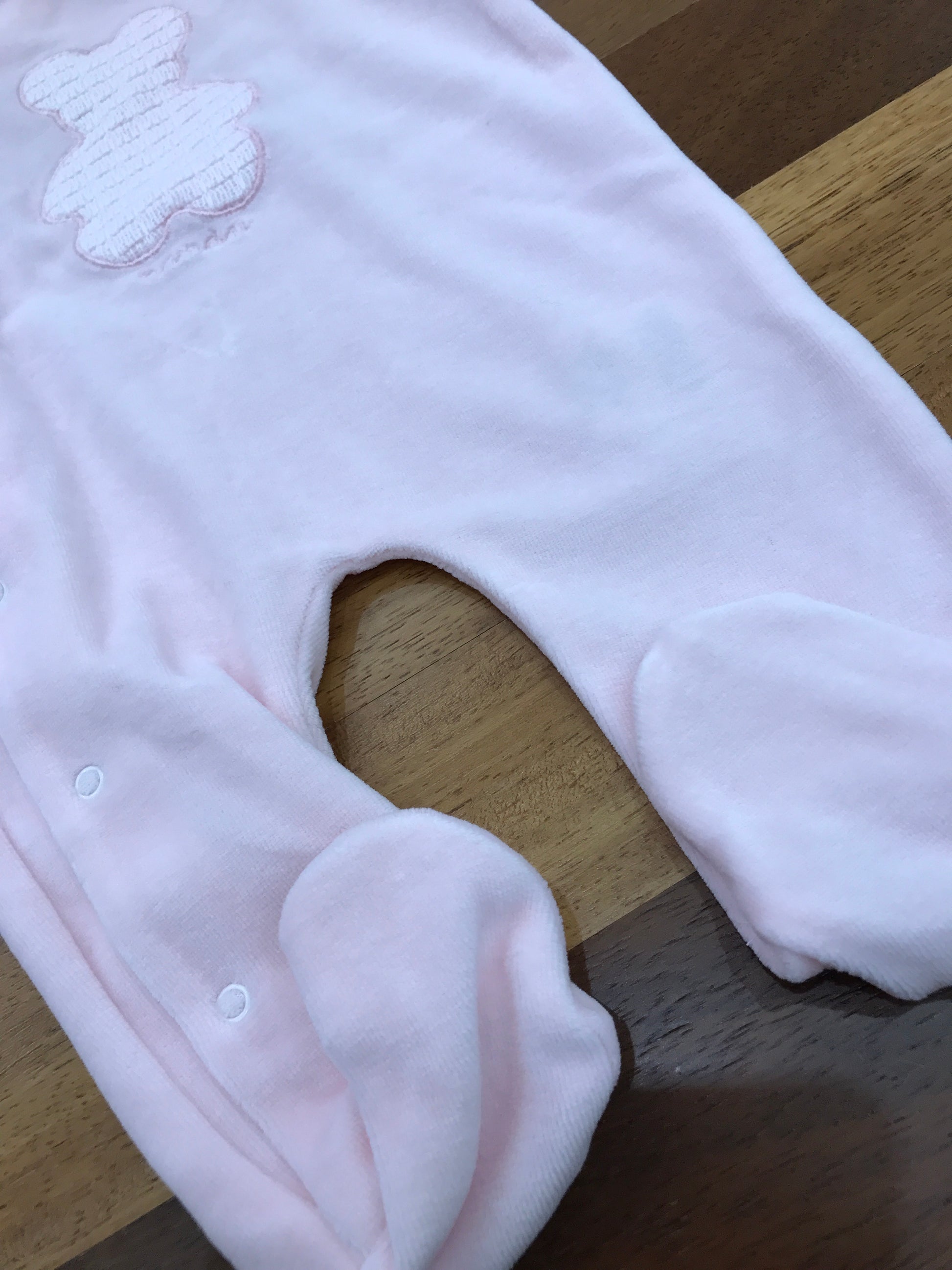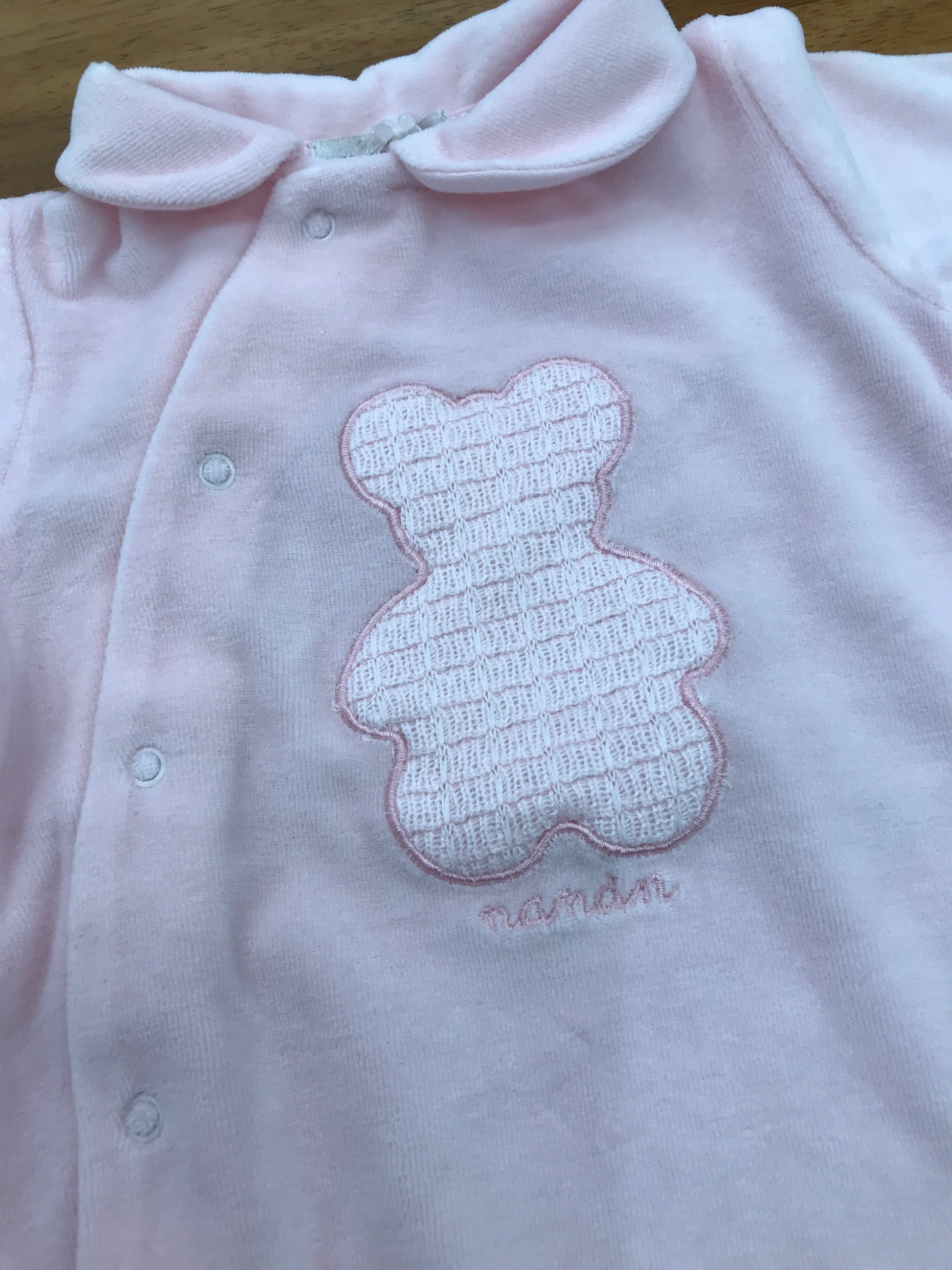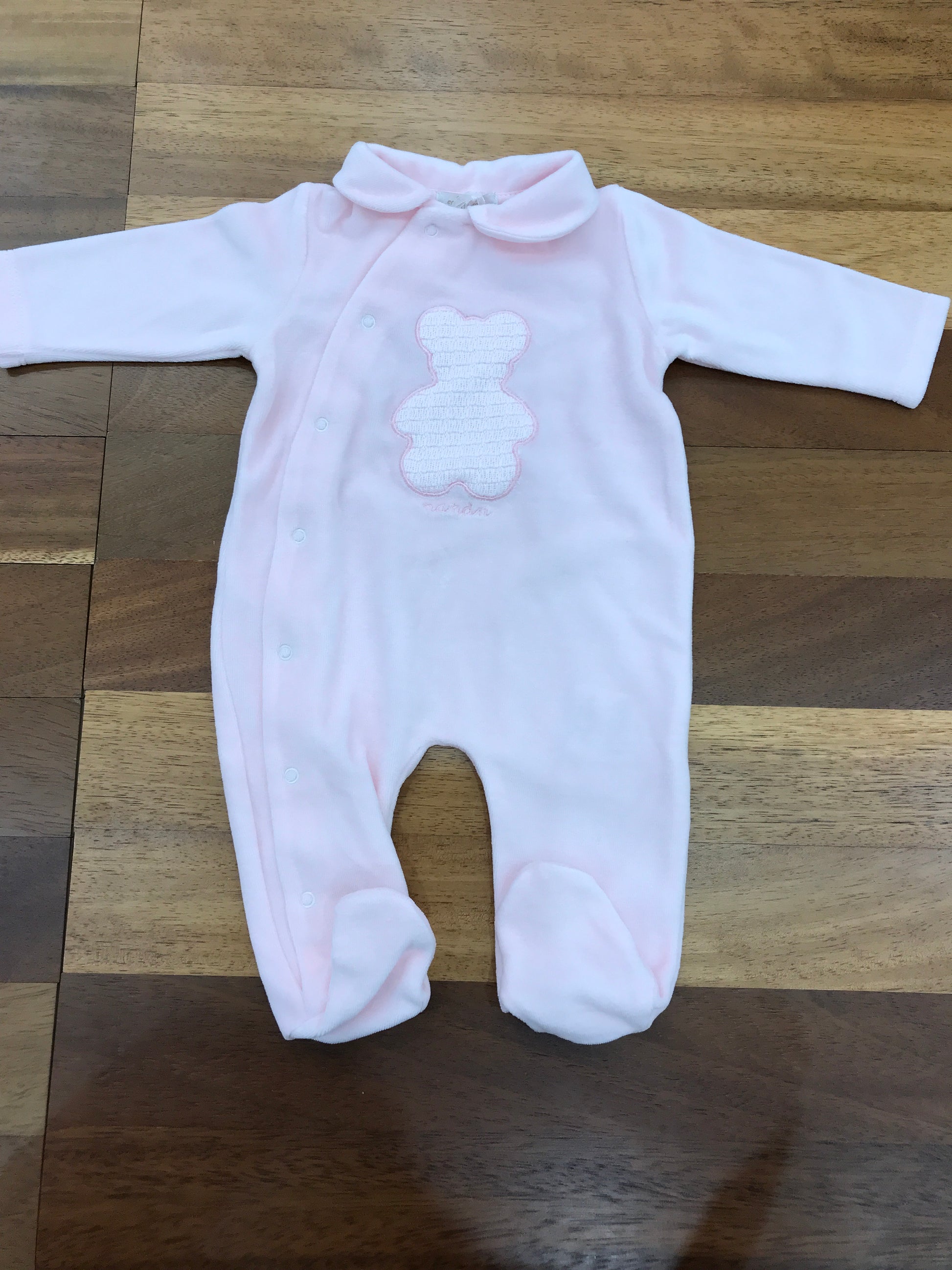 Tuta in ciniglia rosa con chiusura frontale laterale, piedini integrati e colletto. Presenta un elegante orsetto ricamato in rilievo tono su tono sul davanti.