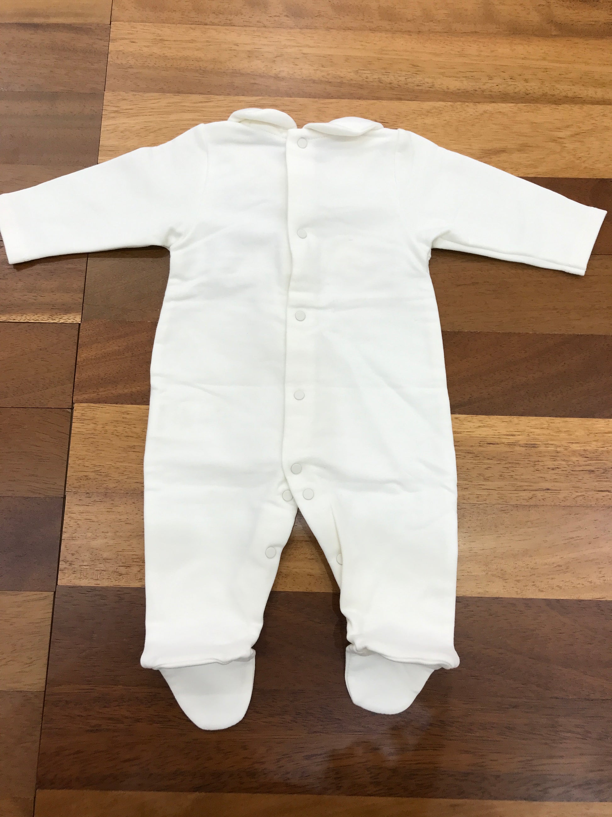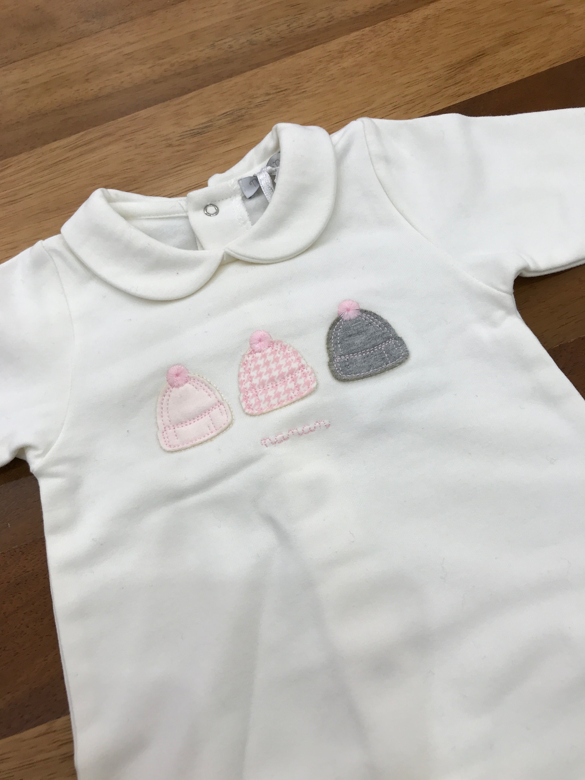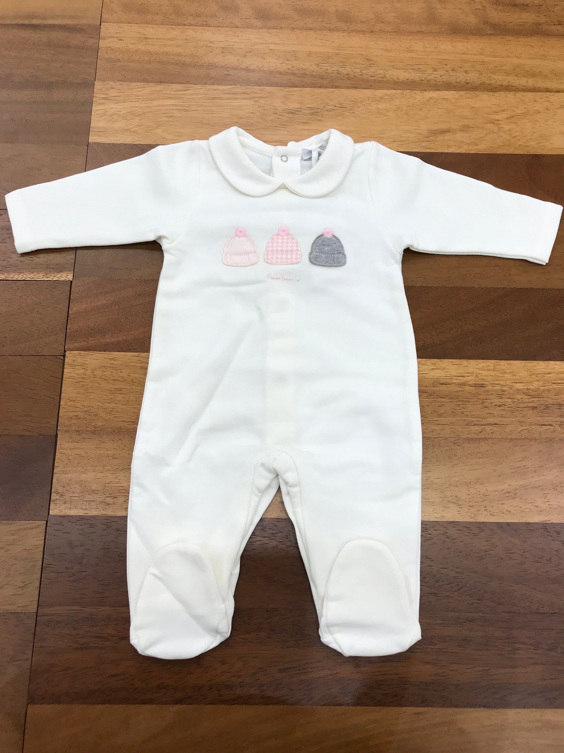 Tutina realizzata in caldo cotone color panna, completa di colletto e piedini. Sul davanti si distingue per la raffinata decorazione composta da tre cappellini ricamati in rilievo, che conferiscono un tocco elegante e sofisticato.