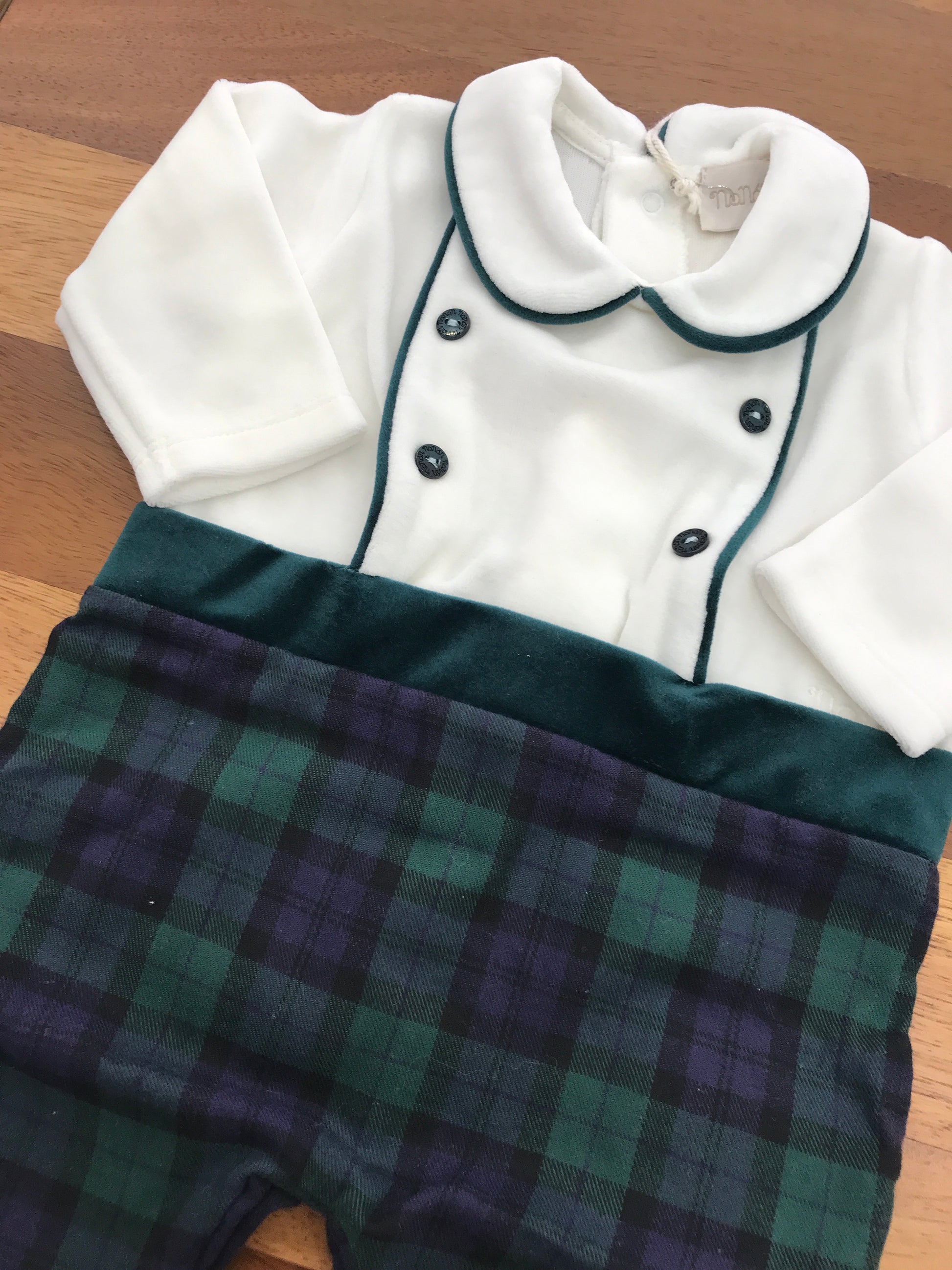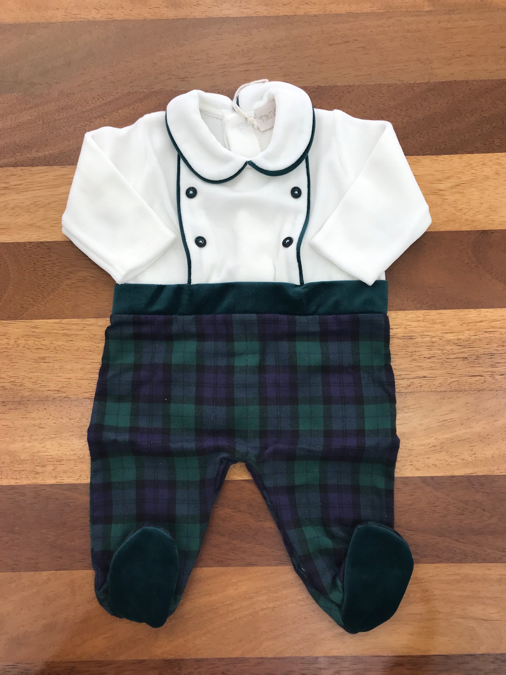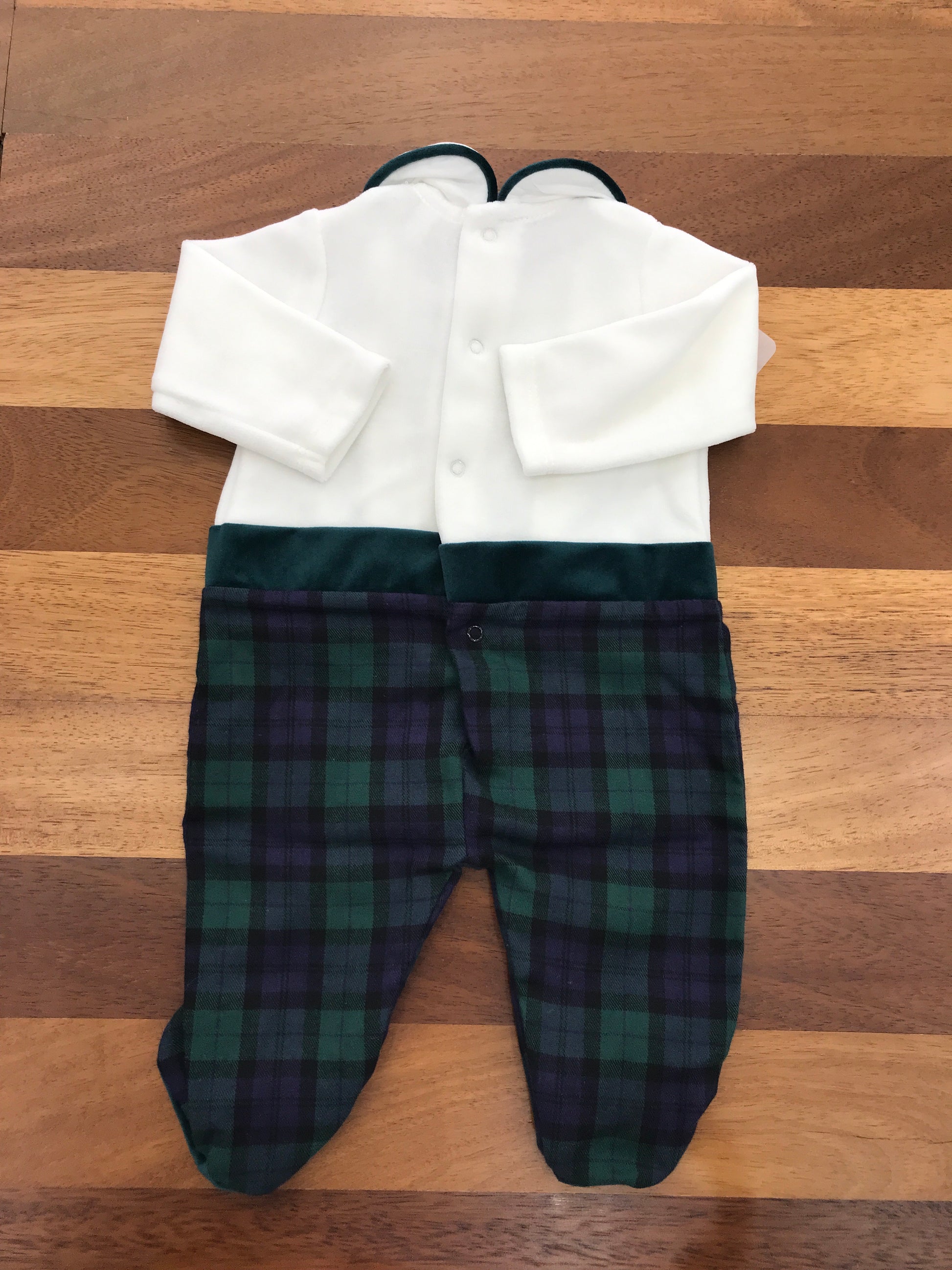 Elegante tutina intera che combina la praticità di un completo coordinato. La parte superiore presenta un raffinato bianco con bottoni e dettagli in verde, mentre la parte inferiore sfoggia un motivo scozzese nelle tonalità di verde e blu. I piedini integrati garantiscono comfort e praticità, perfetti per i più piccoli. Un capo versatile che unisce stile e funzionalità in un'unica soluzione.
