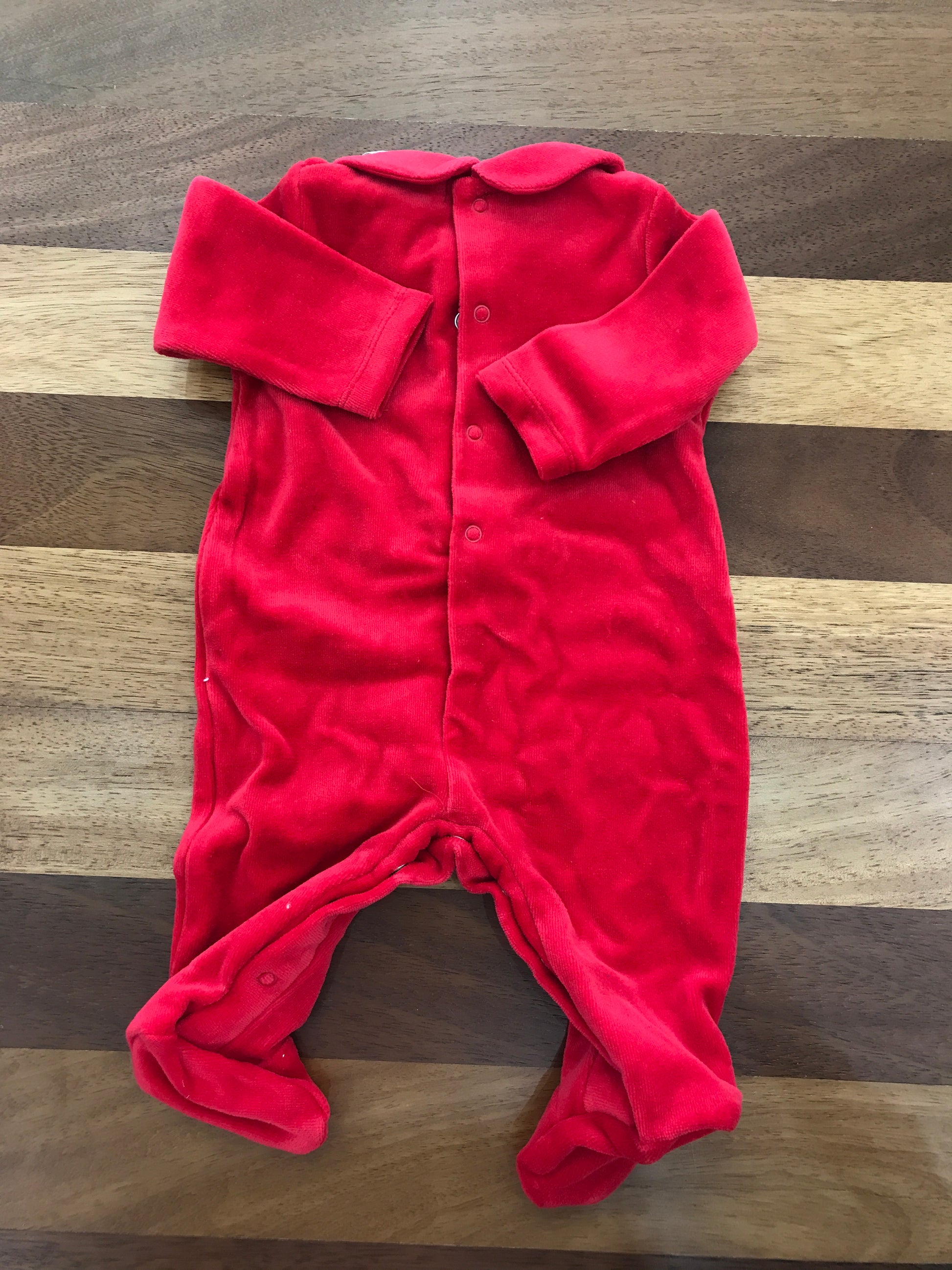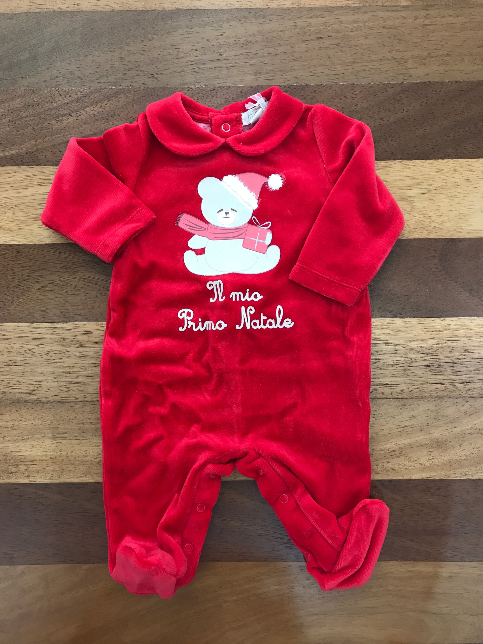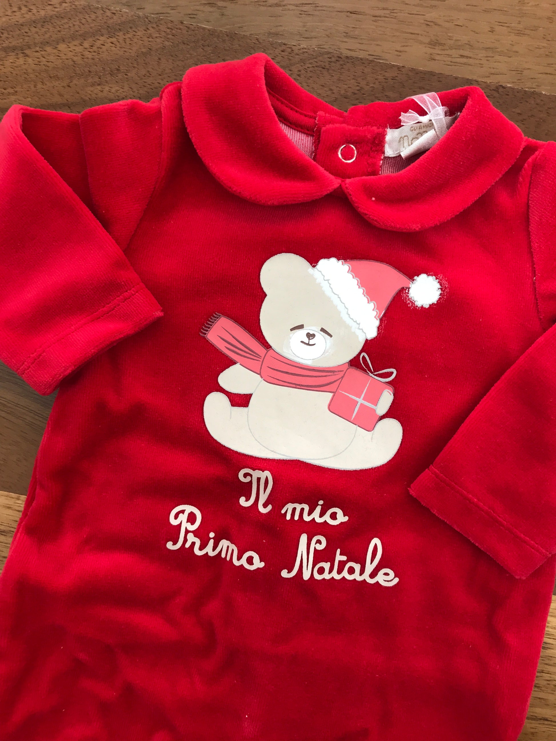 Elegante tutina intera realizzata in morbida ciniglia rossa, dotata di piedini integrati per maggiore praticità. Il capo presenta una delicata applicazione centrale raffigurante un tenero orsetto con cappellino festivo e la scritta "il mio primo natale", perfetto per celebrare questo momento speciale con stile e calore.