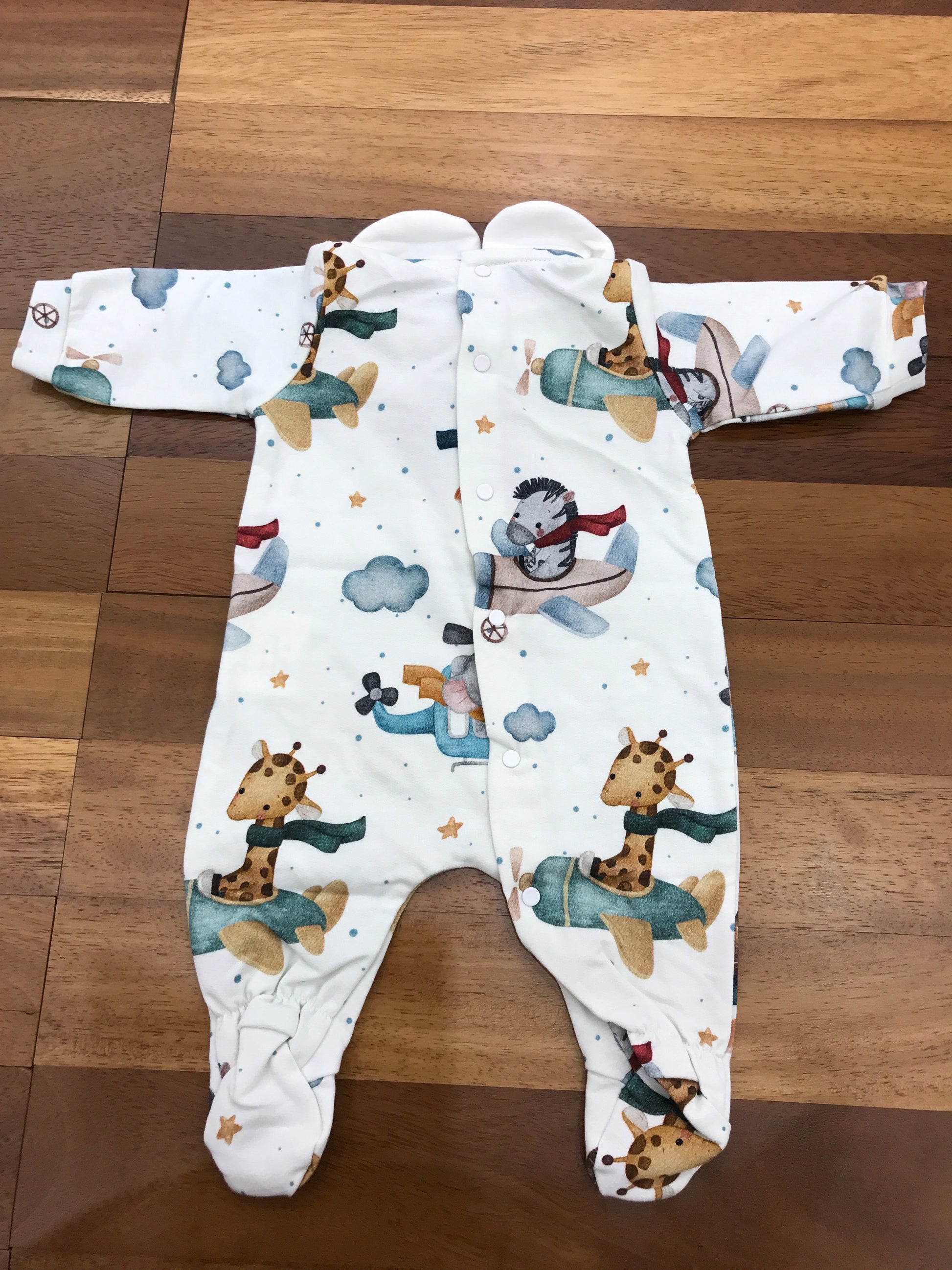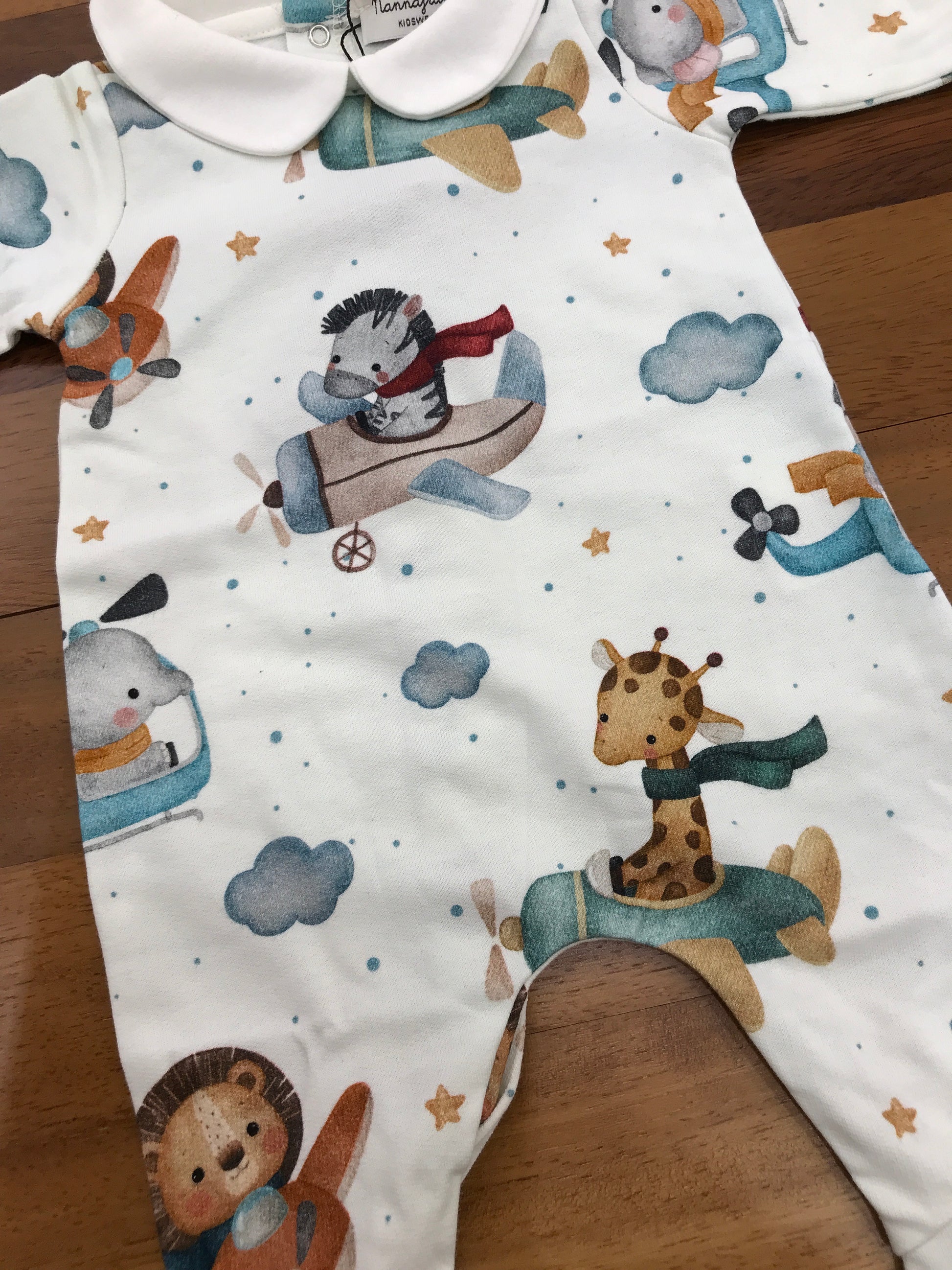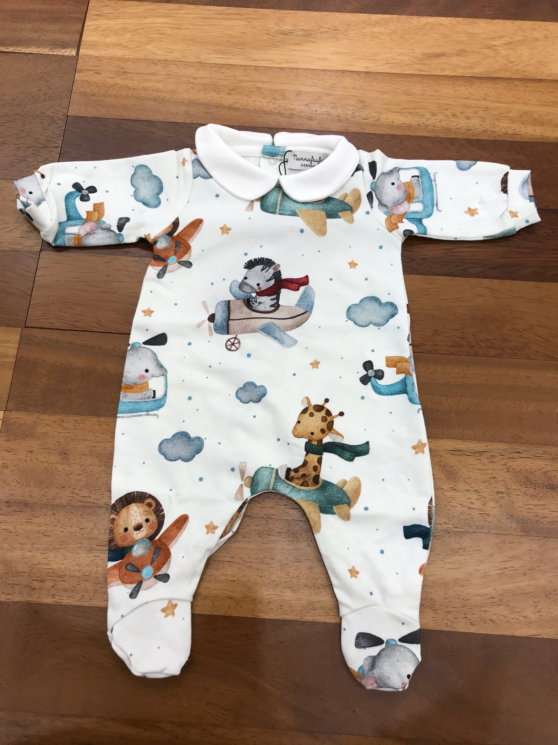 Questa tutina in caldo cotone offre una copertura completa con piedini e colletto progettati per assicurare il massimo comfort e calore al bambino. L’intero capo è decorato con un motivo giocoso che raffigura animali della savana come zebra, elefante, leone e giraffa, ciascuno rappresentato mentre vola su un colorato aereo, aggiungendo un tocco vivace e allegro al design, ideale per stimolare la fantasia e accompagnare il piccolo durante le sue prime avventure quotidiane.