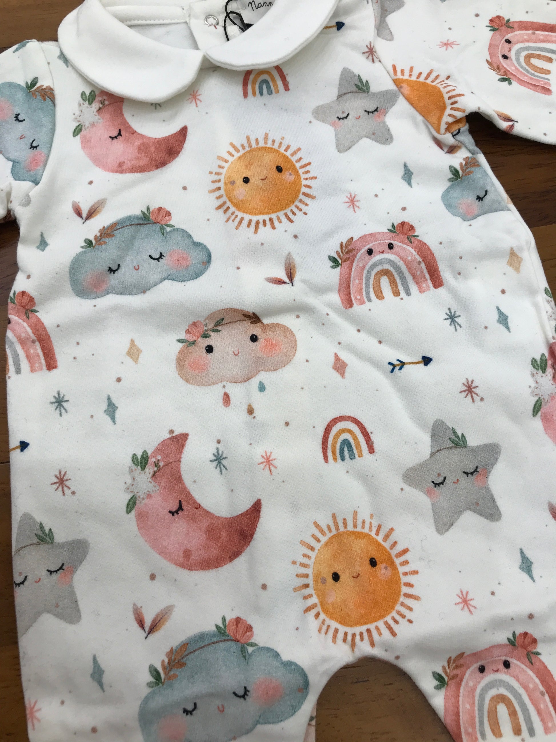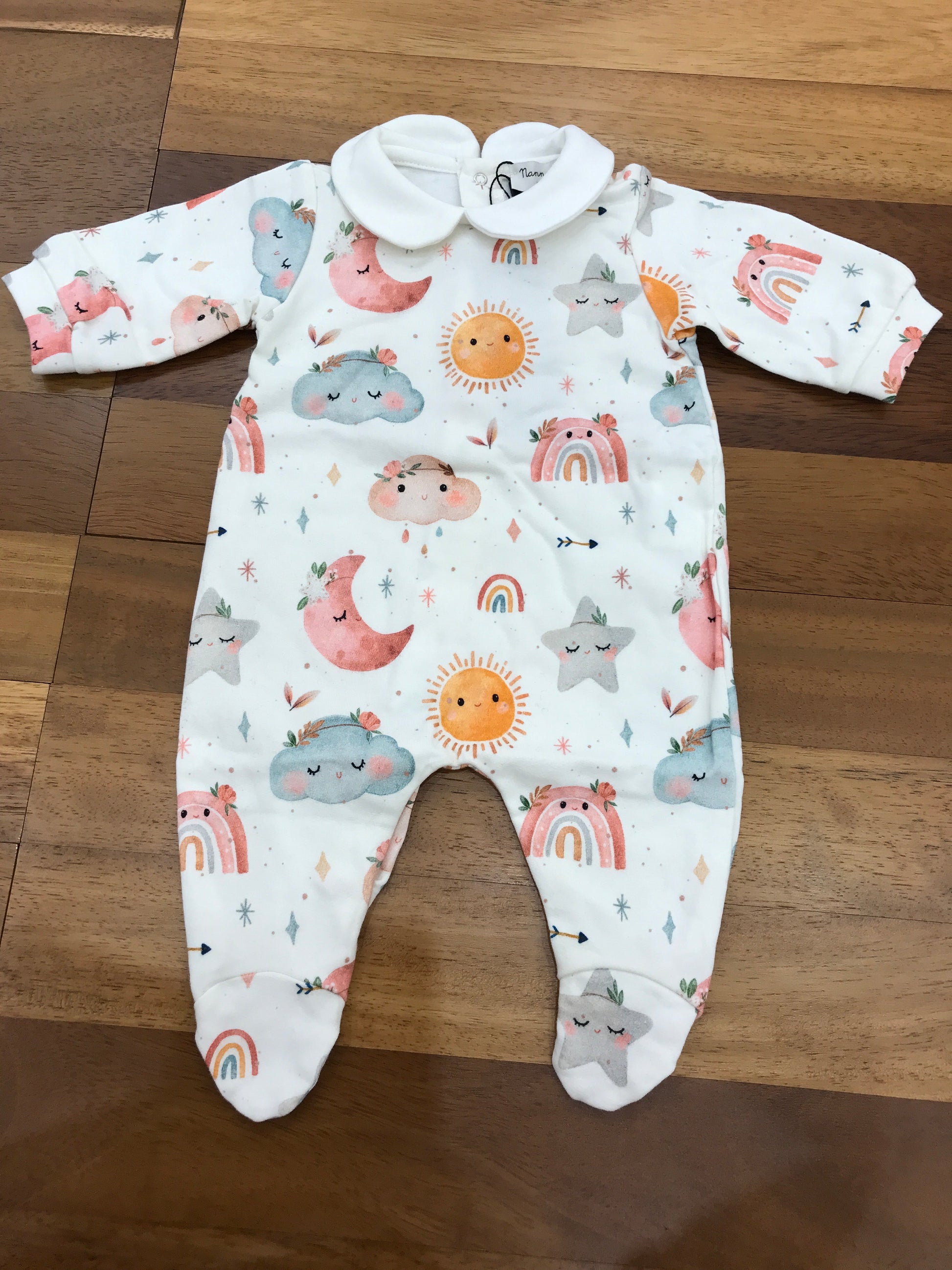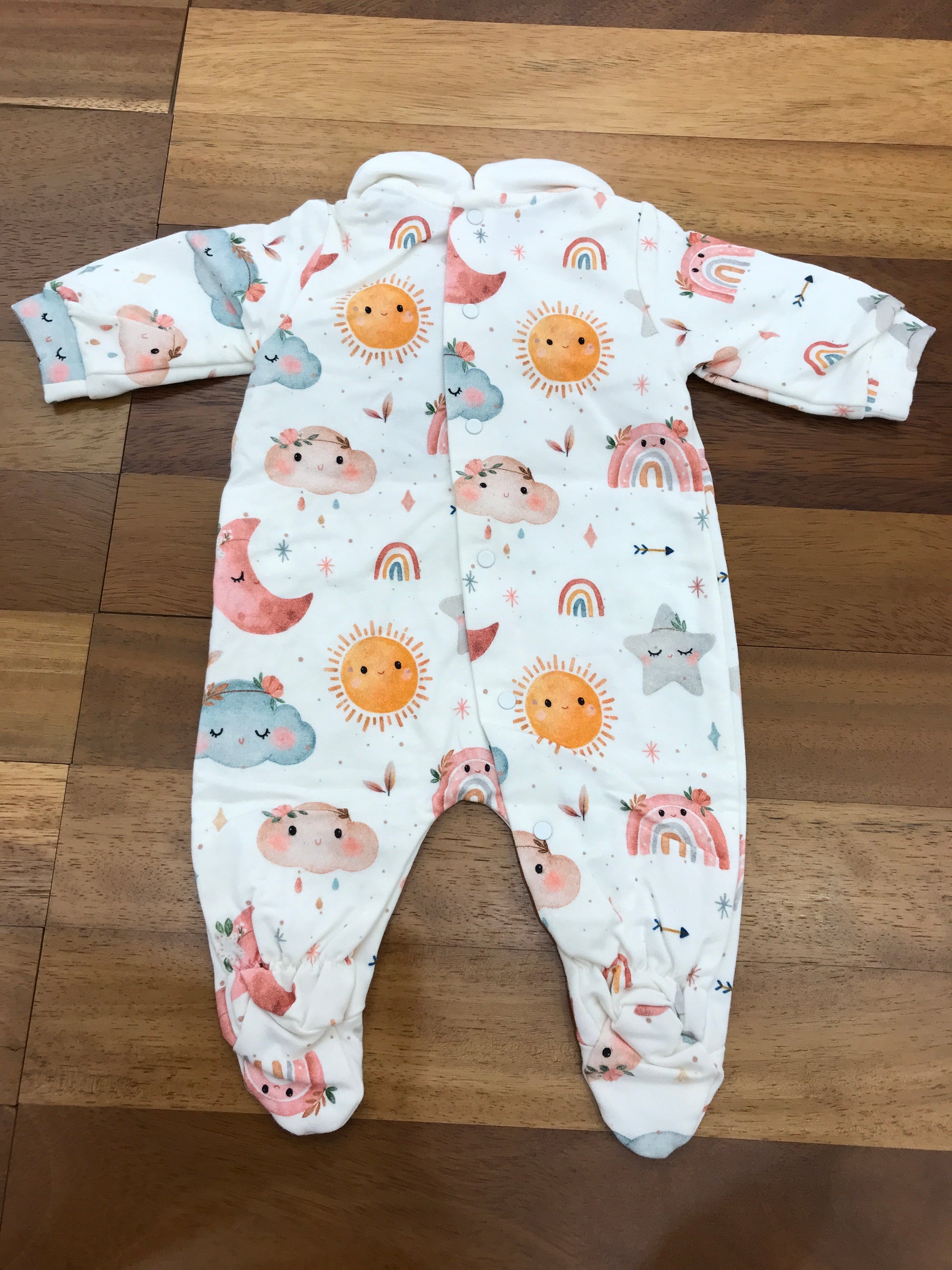 Realizzata in caldo cotone, questa tutina intera include piedini e colletto per assicurare comfort e protezione. Presenta una serie di disegni animati, tra cui nuvole, lune, soli, stelle e arcobaleni, disponibili in una varietà di colori vivaci, che donano un tocco allegro e accattivante al capo. Ideale per garantire calore e stile ai più piccoli.