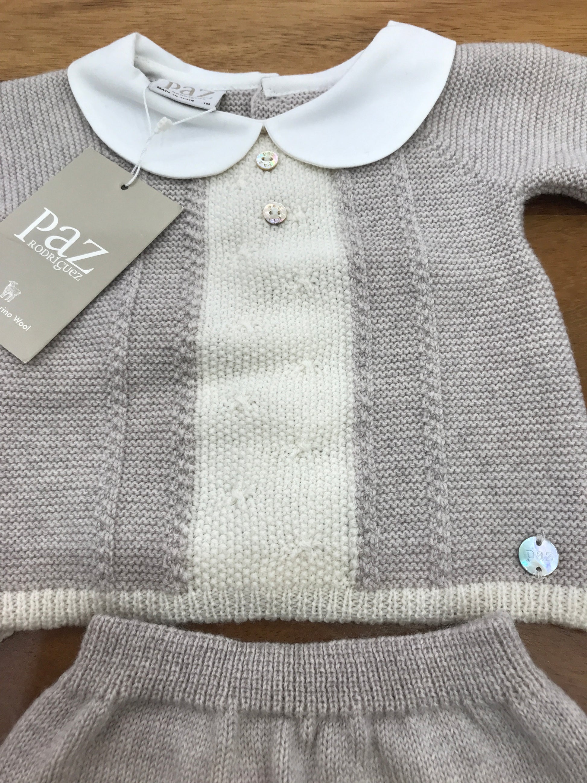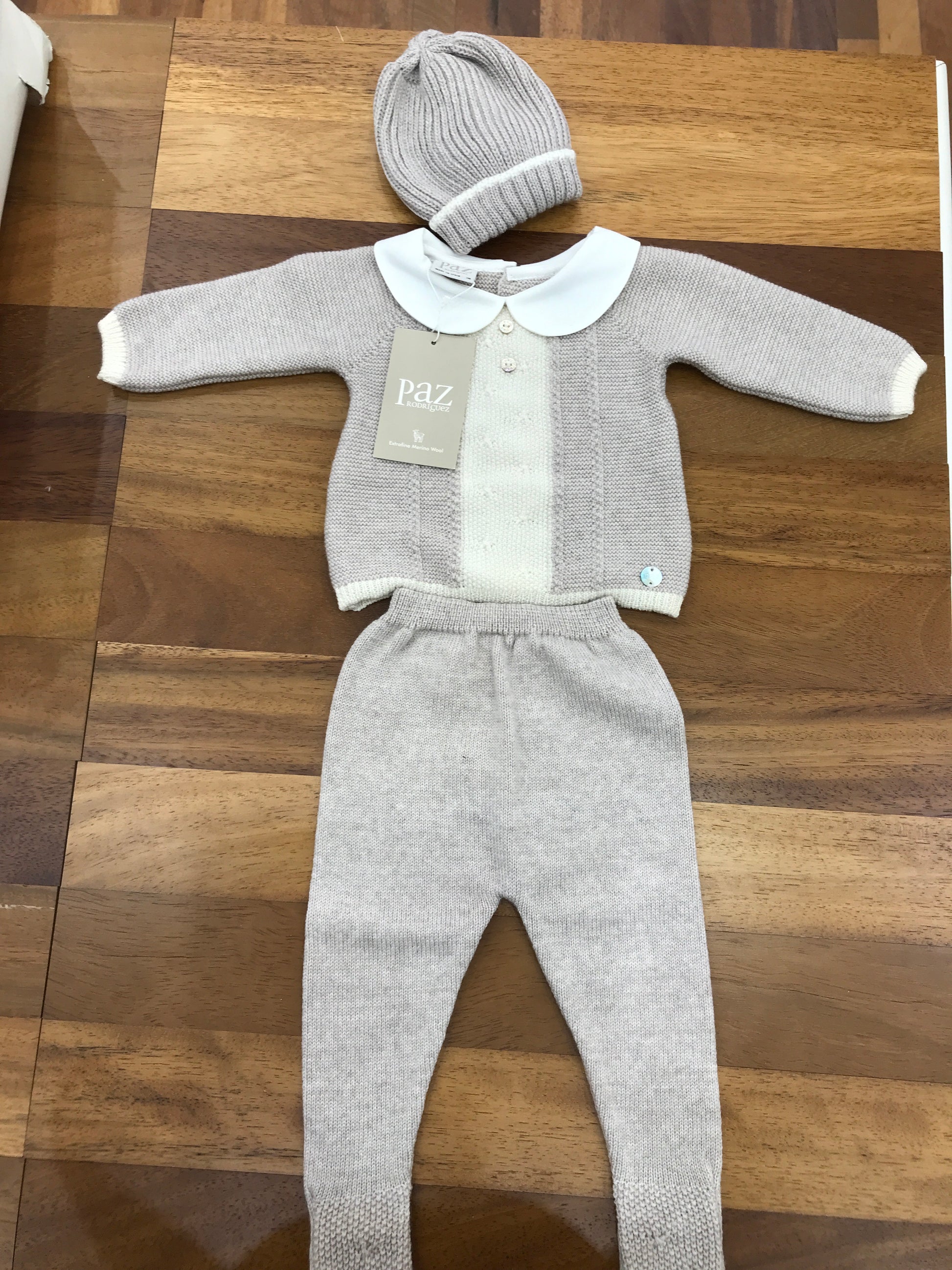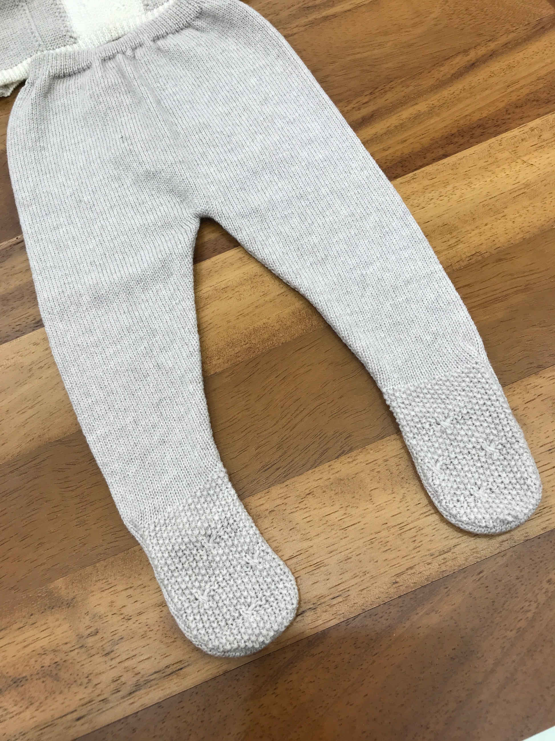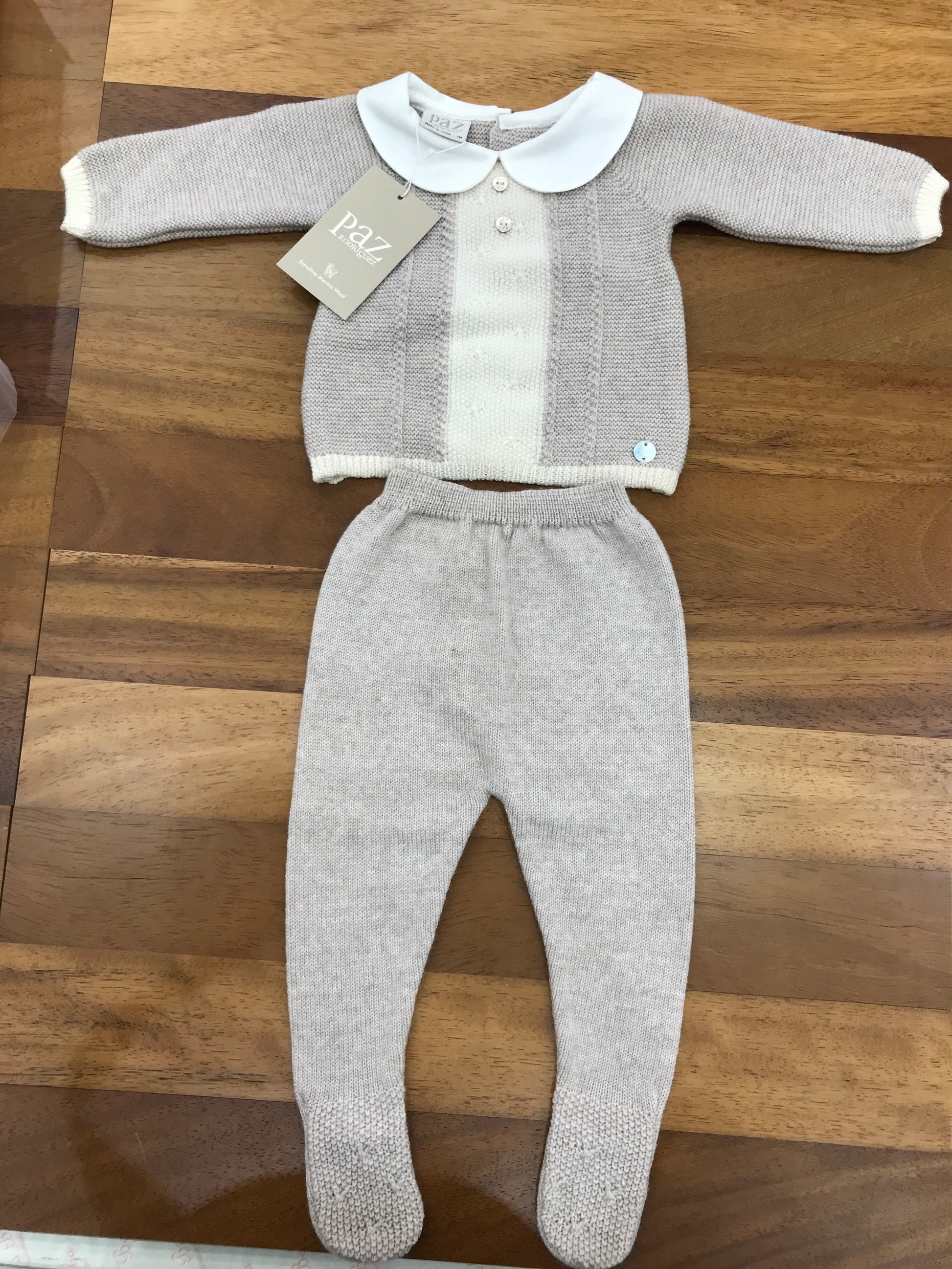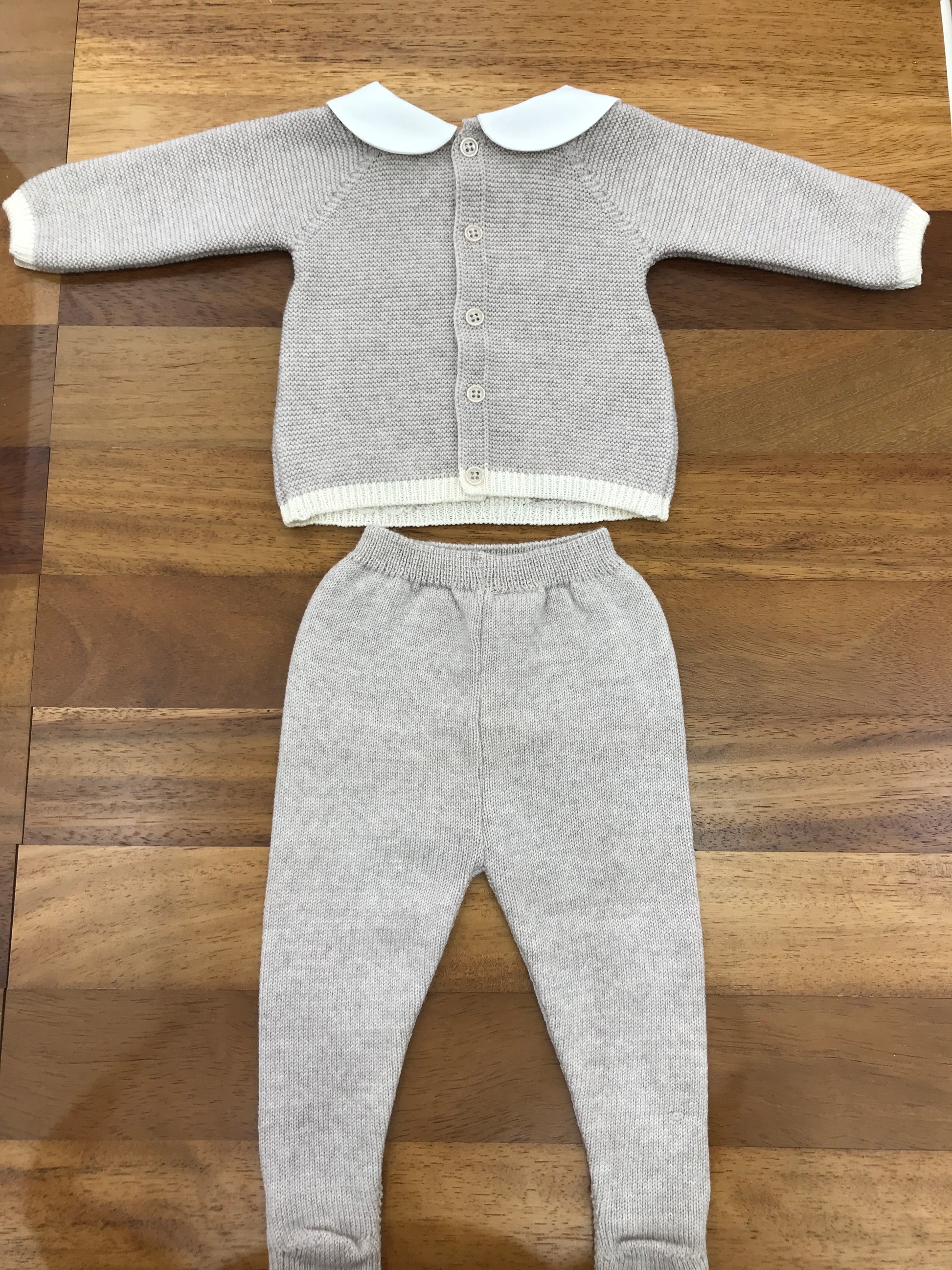 Completo composto da due pezzi: una maglietta a collo tondo con dettagli intrecciati e un pantalone basico con piedini integrati.