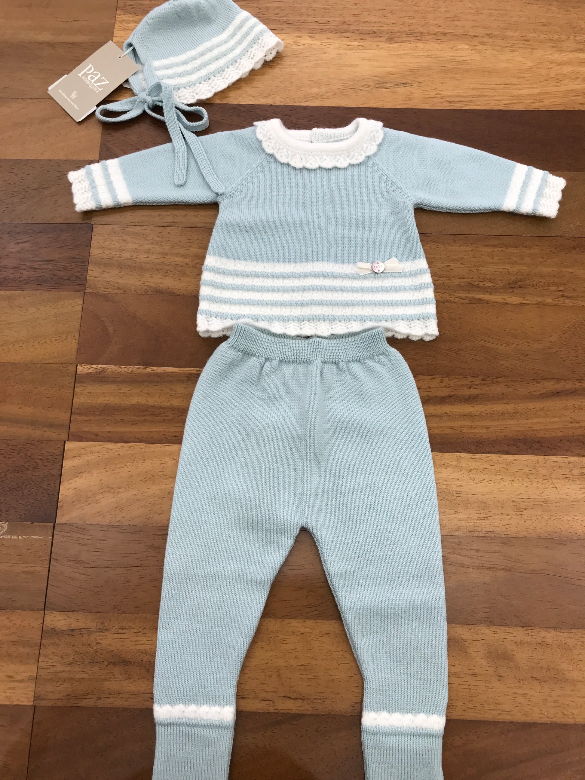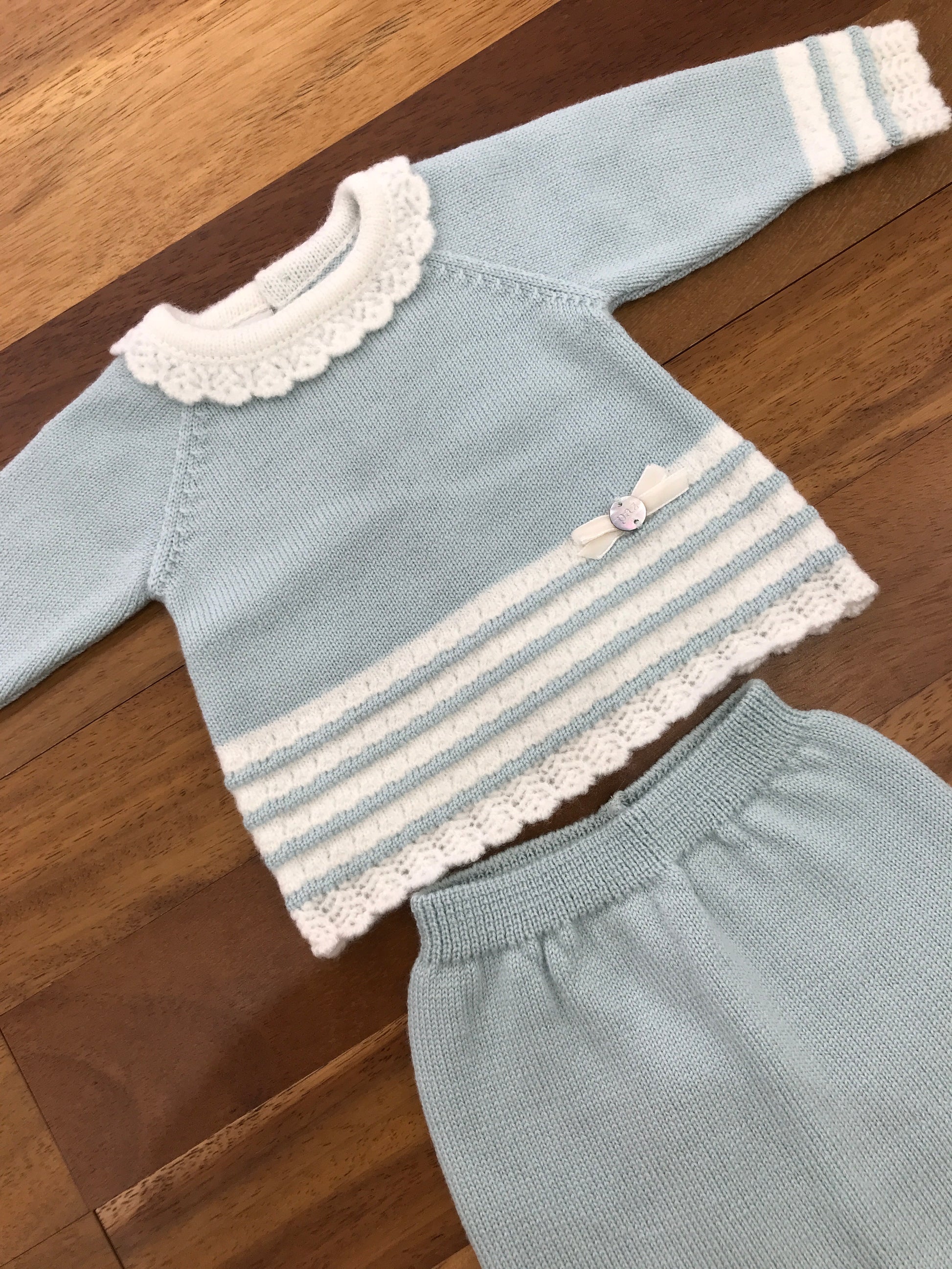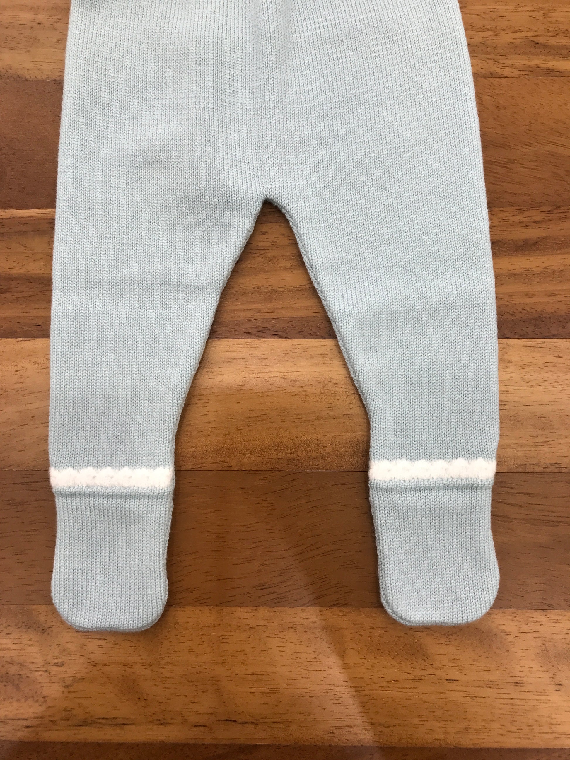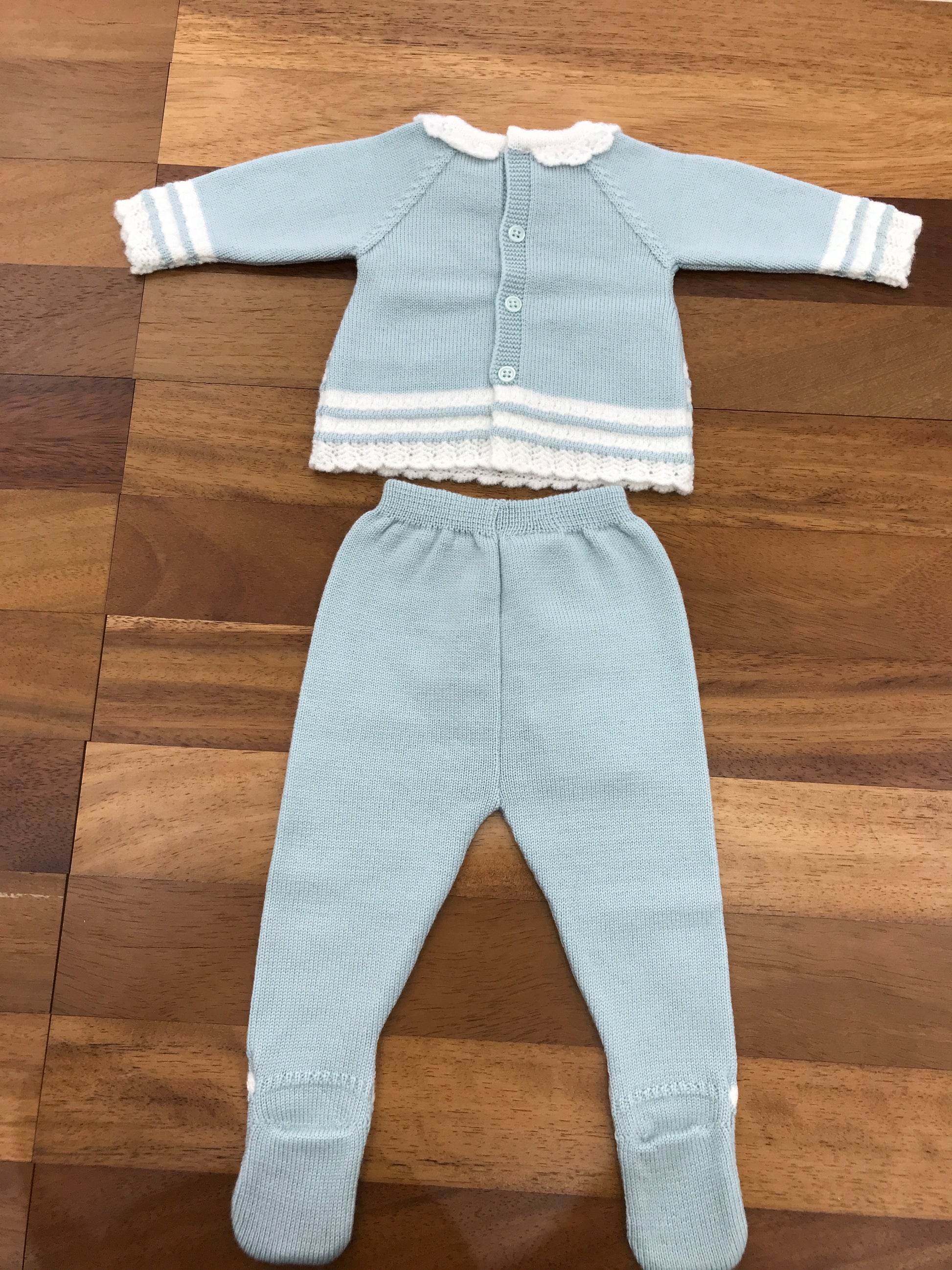 Completo in lana composto da due pezzi con piedini integrati, caratterizzato da un collo ricamato e ulteriori dettagli decorativi in bianco.