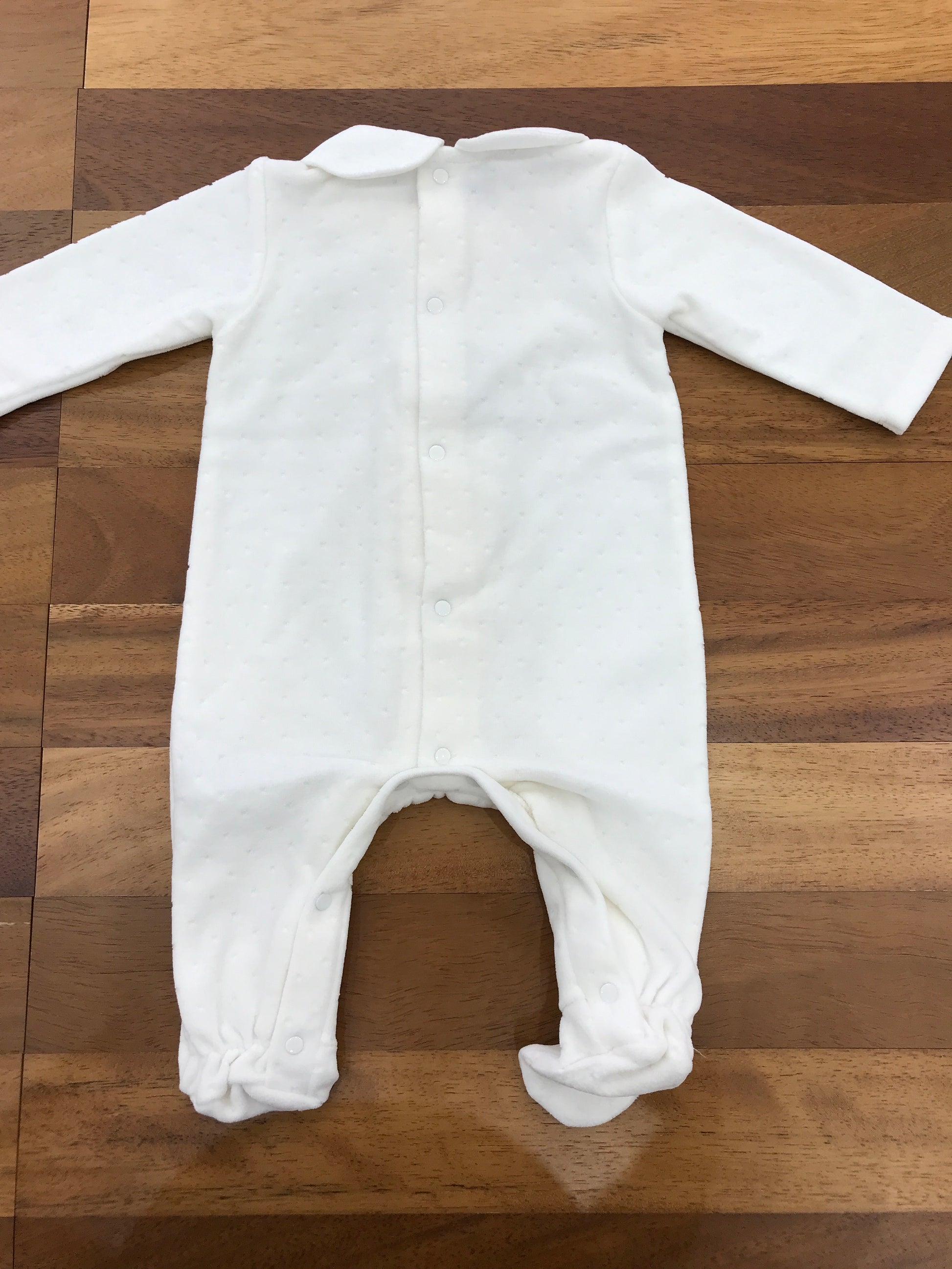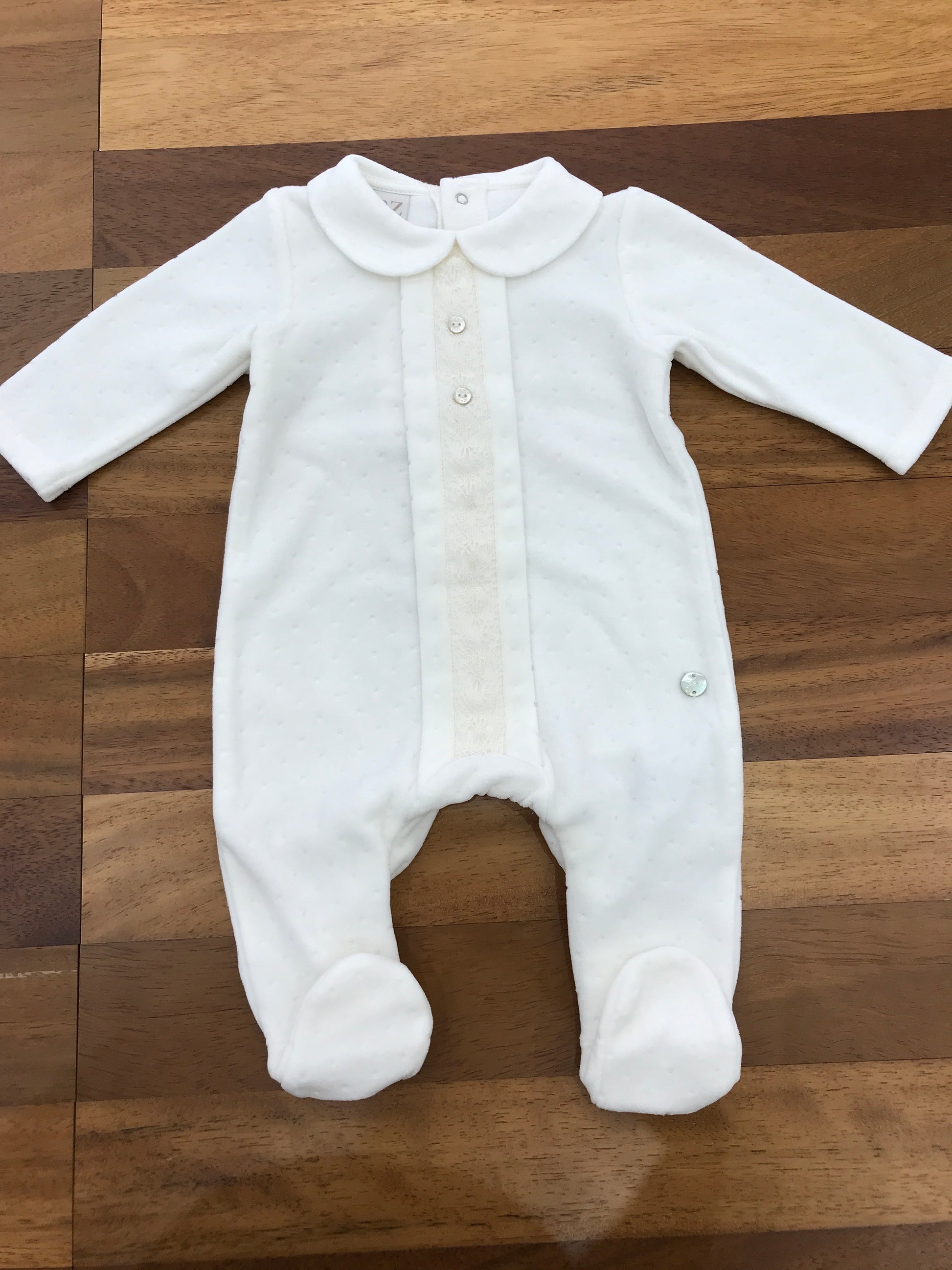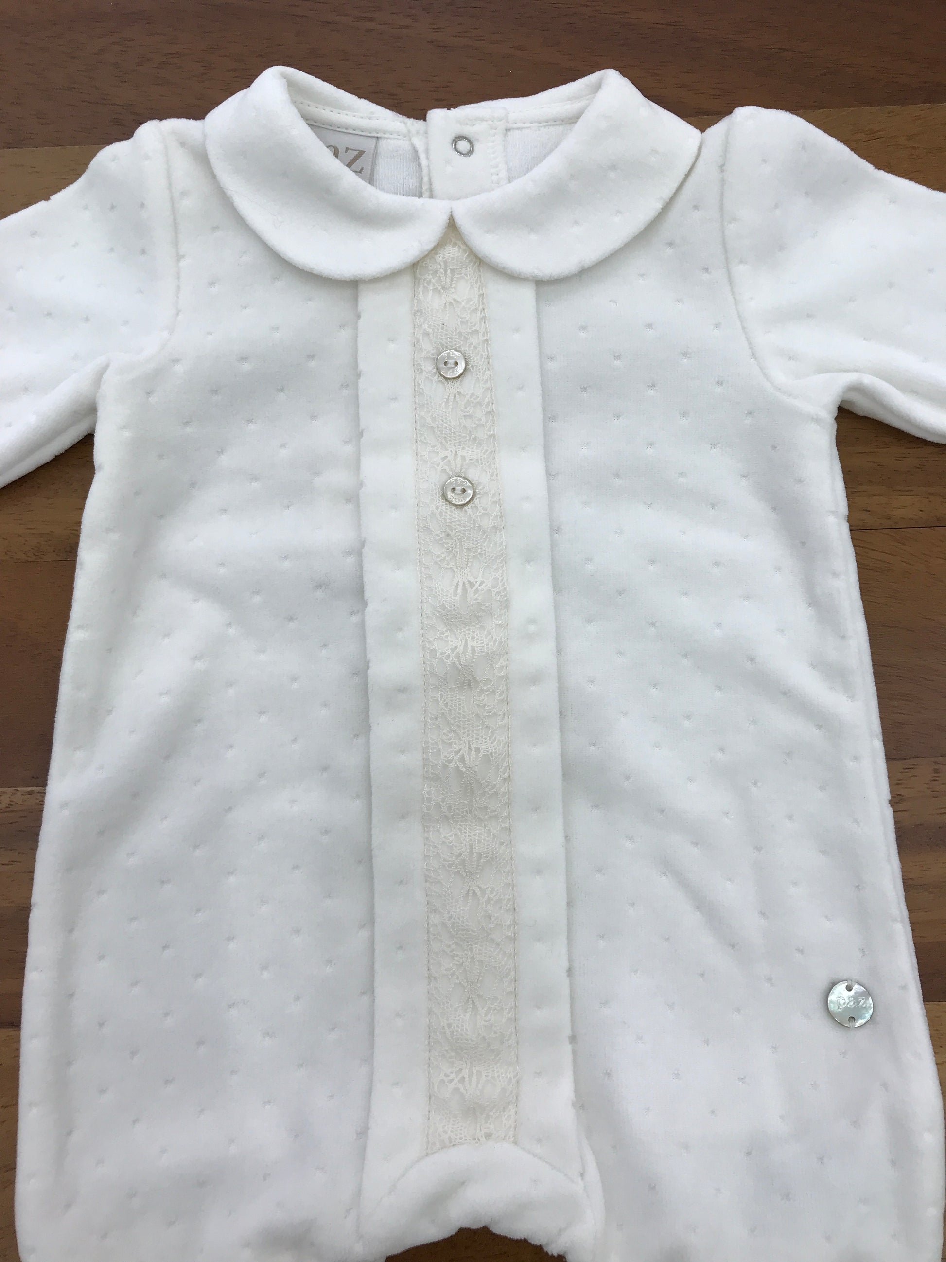 Intera tutina in ciniglia con piedini e colletto inclusi, decorata al centro da un inserto in merletto con bottoni decorativi. Sul retro è dotata di chappette per la chiusura.
