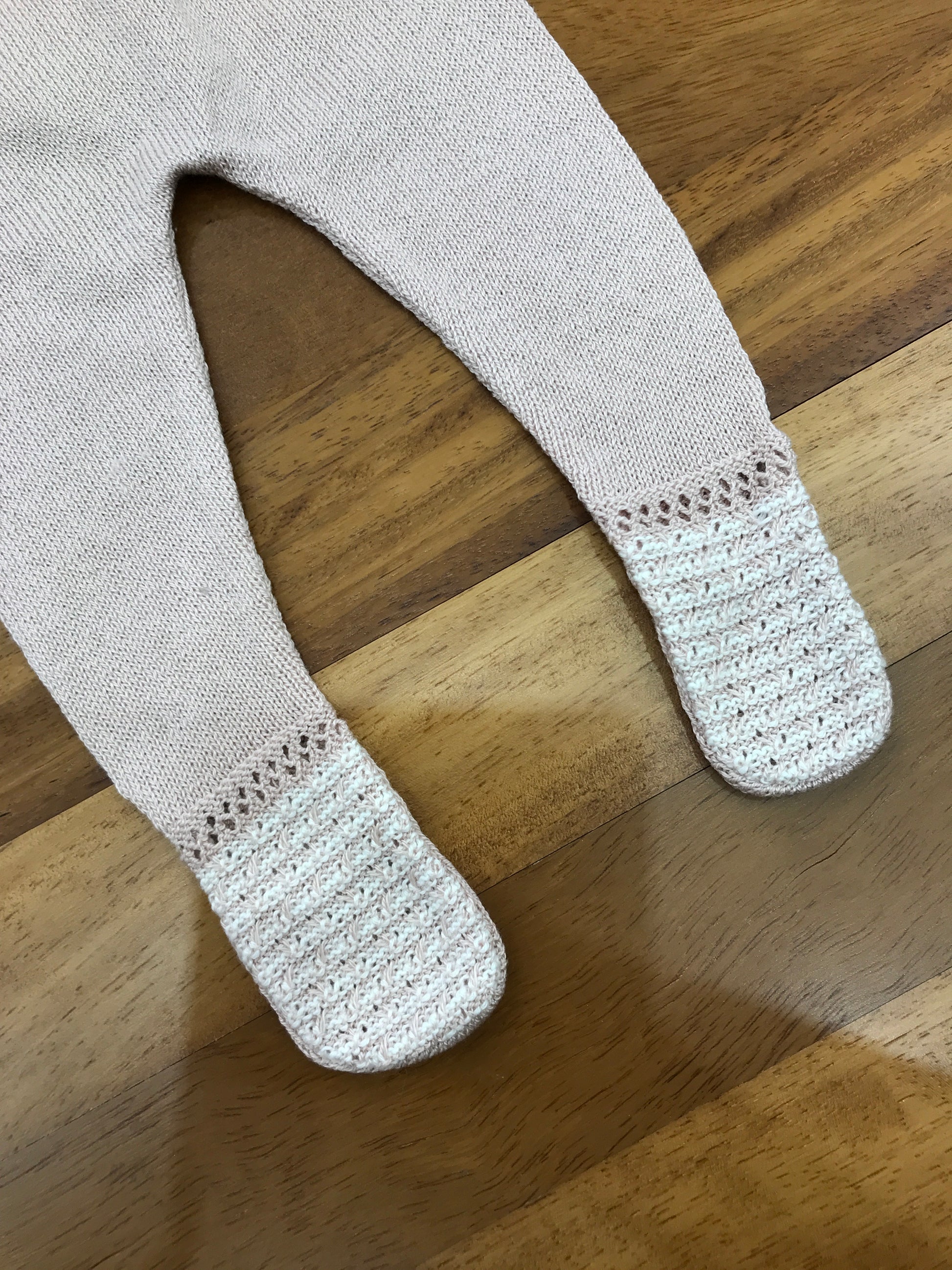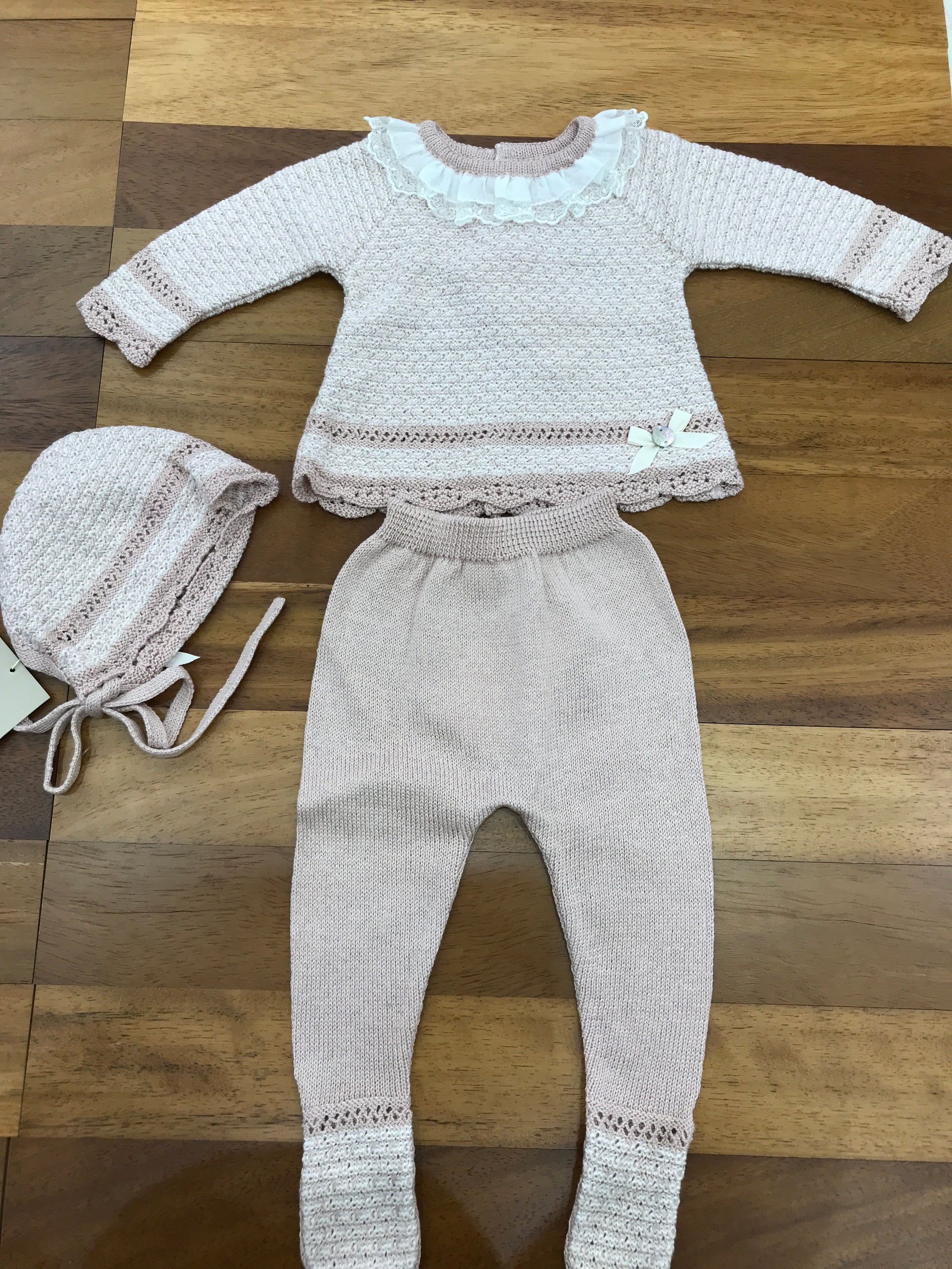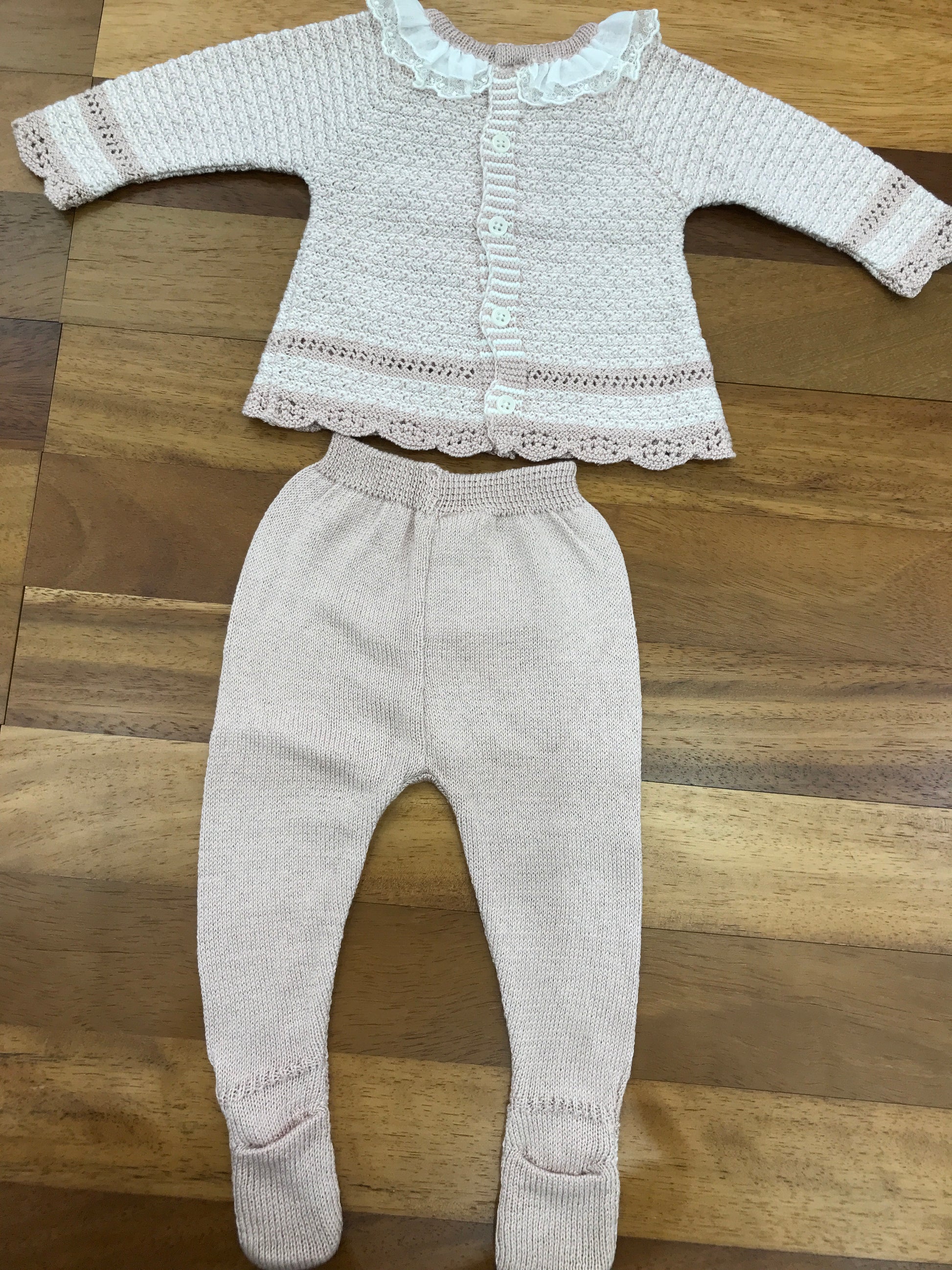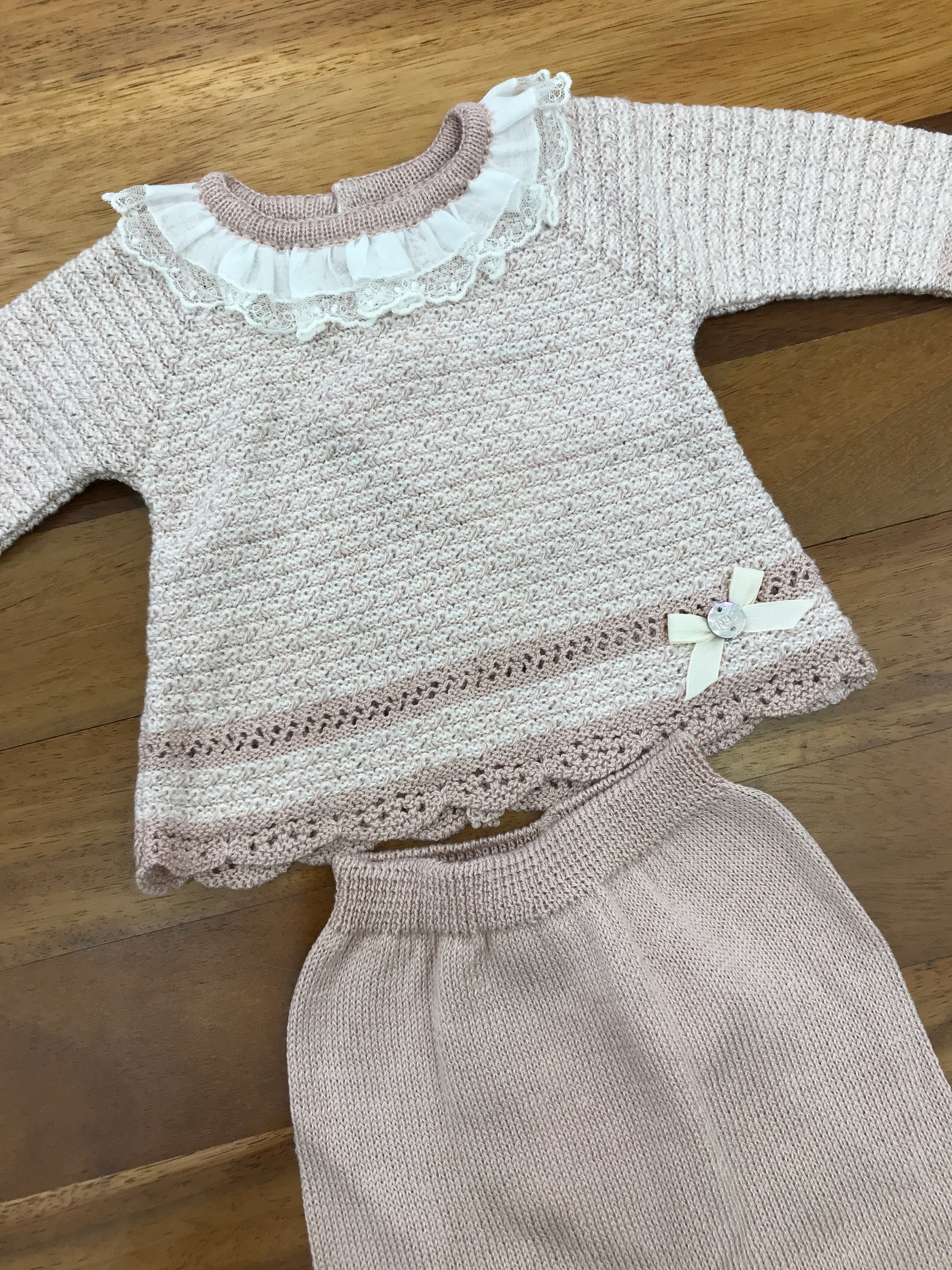 Completo due pezzi in lana con piedini ricamati, decorazione ricamata sulla parte superiore e applicazione di merletto sul collo.