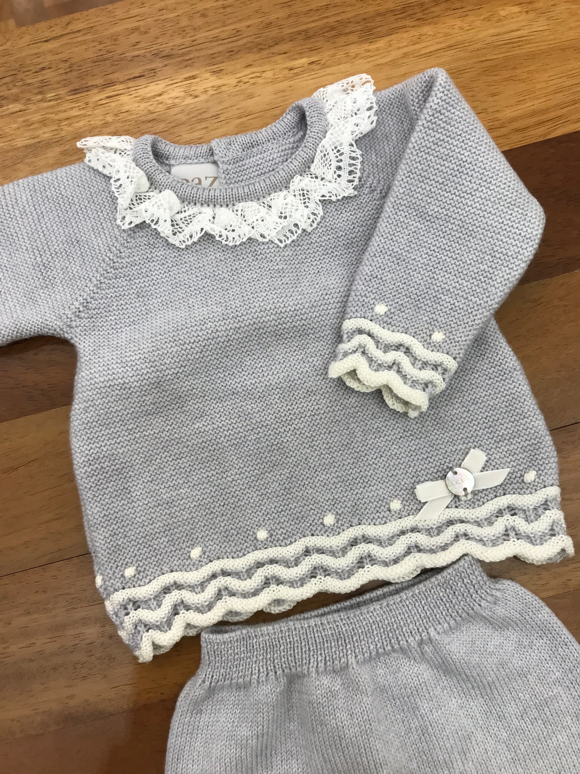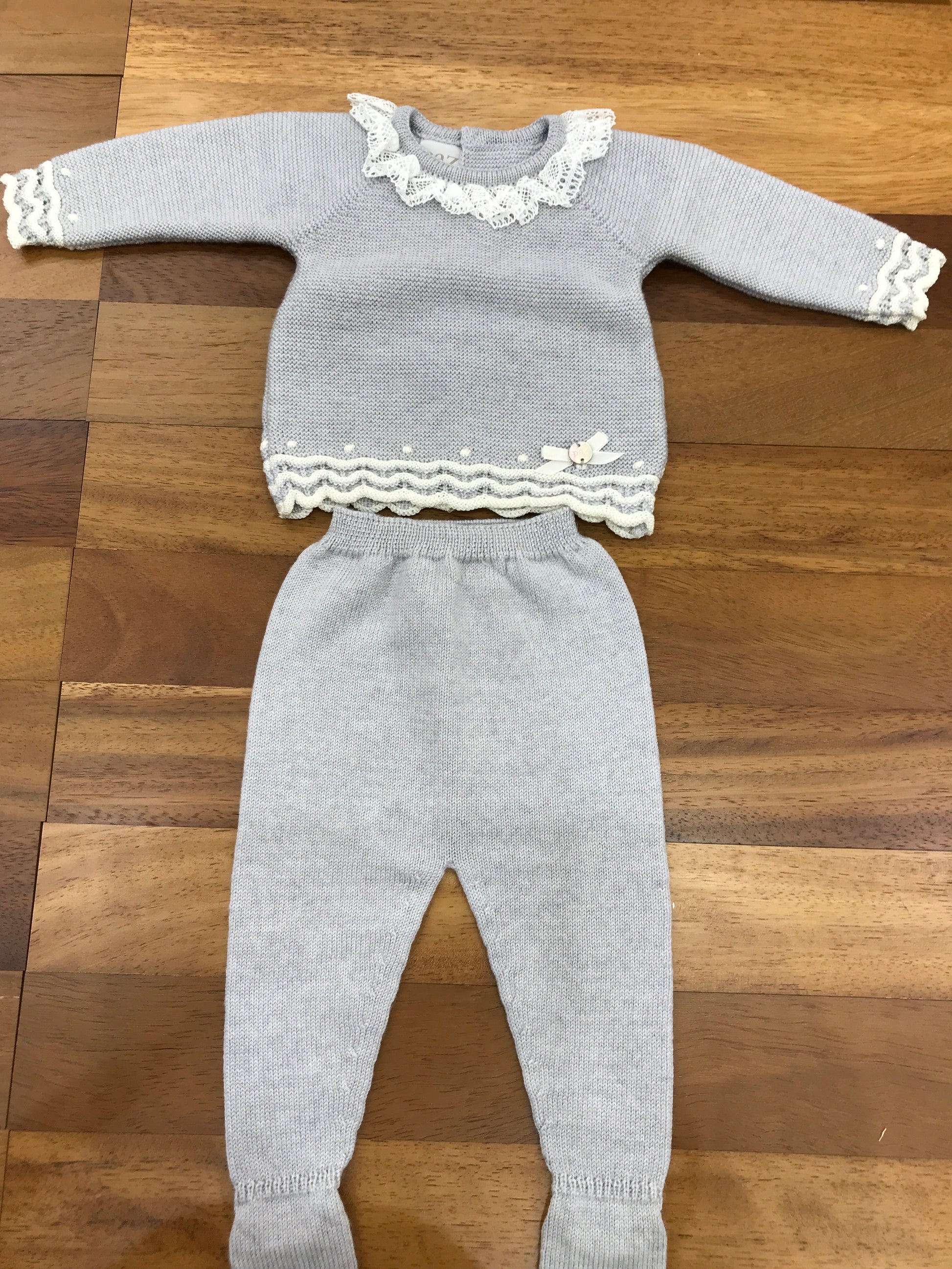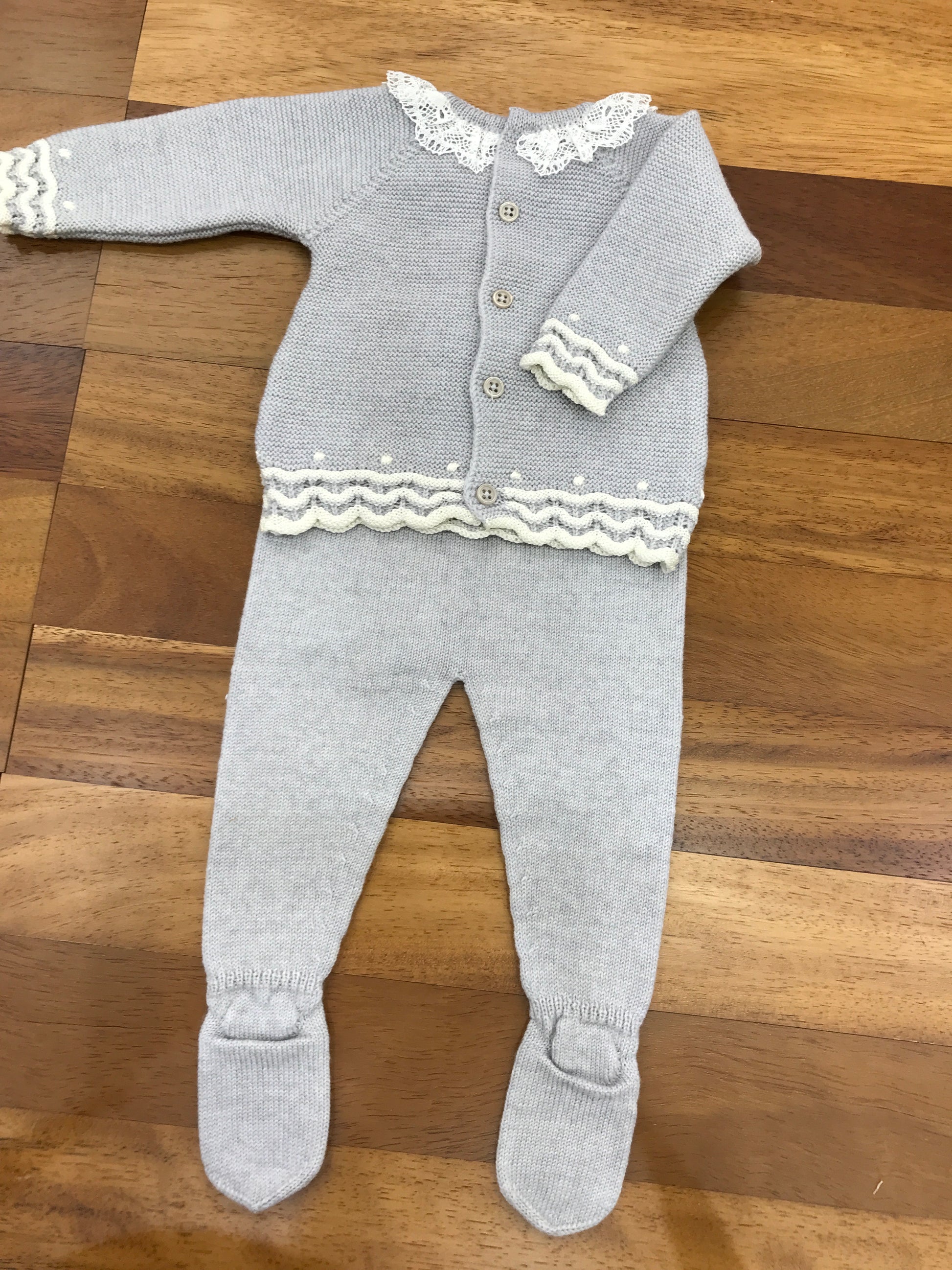Completo due pezzi in lana, dotato di piedini e collo decorato con merletto, con ricami raffinati sulla parte superiore.