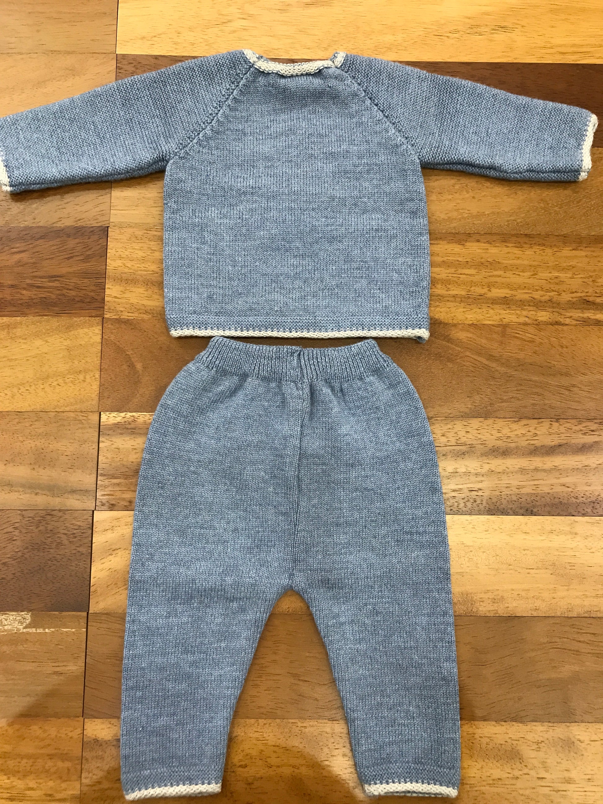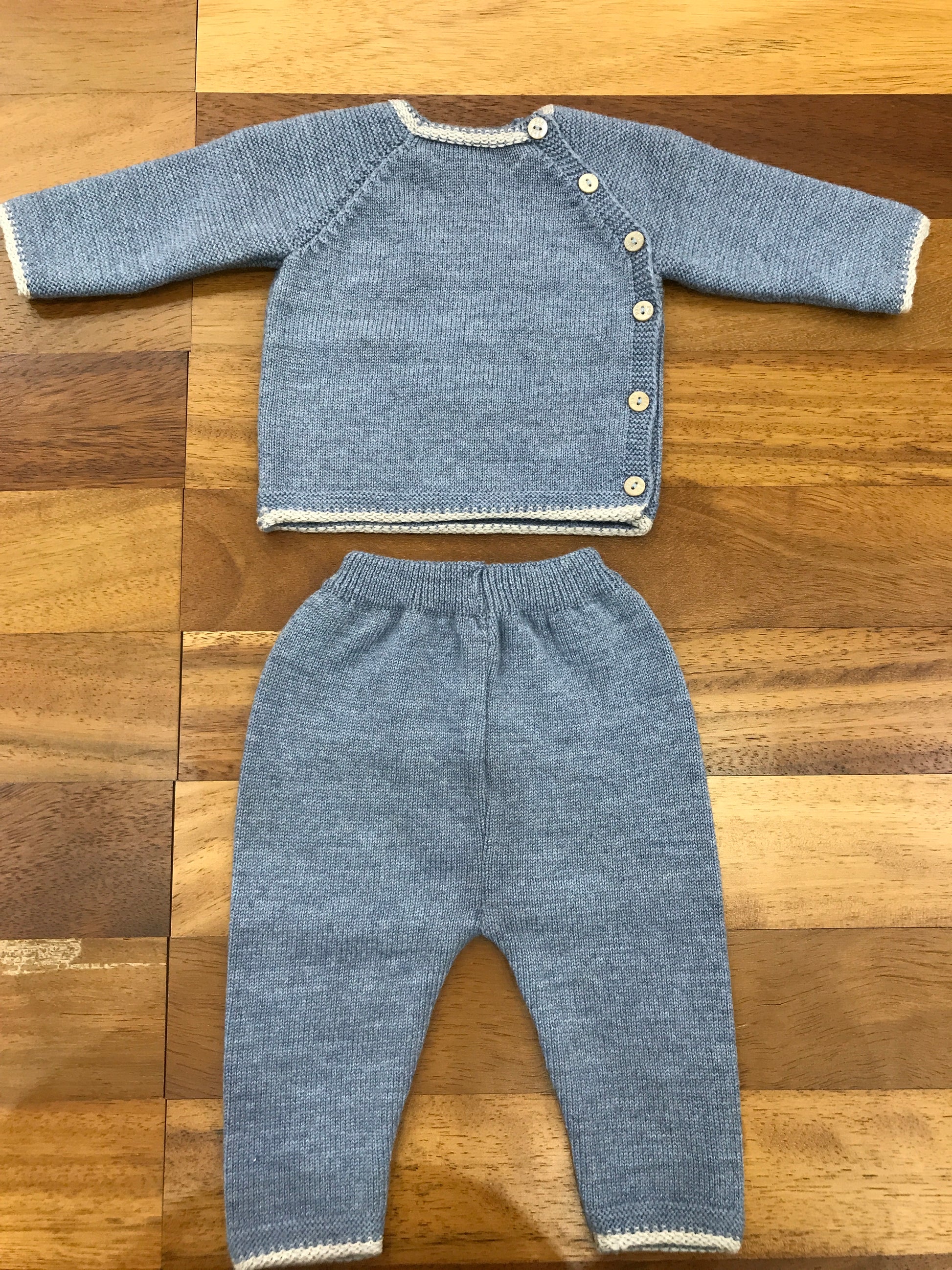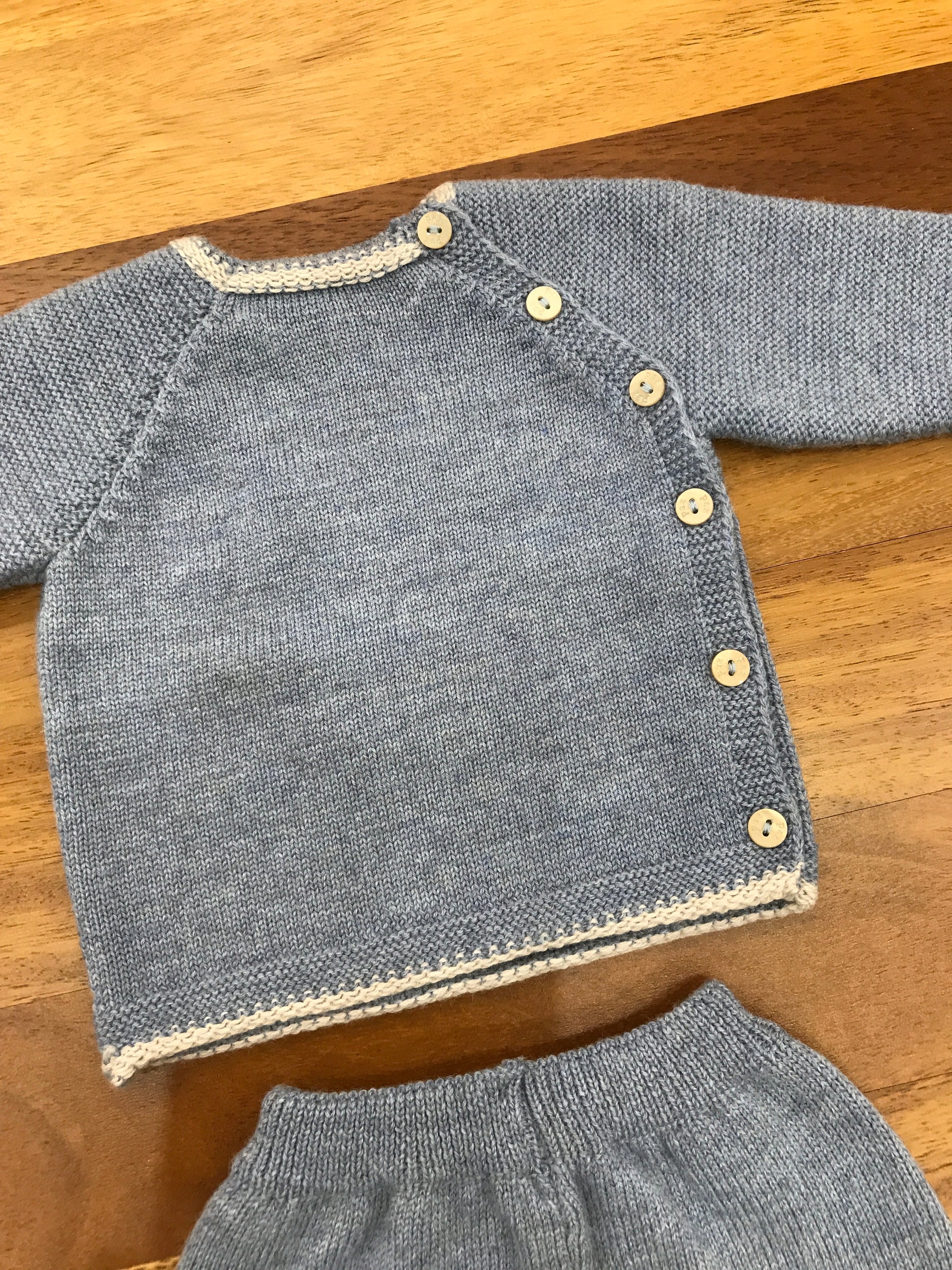 Completo in due pezzi realizzato in lana, privo di piedini e senza collo, con la parte superiore dotata di bottoncini laterali per una facile apertura.