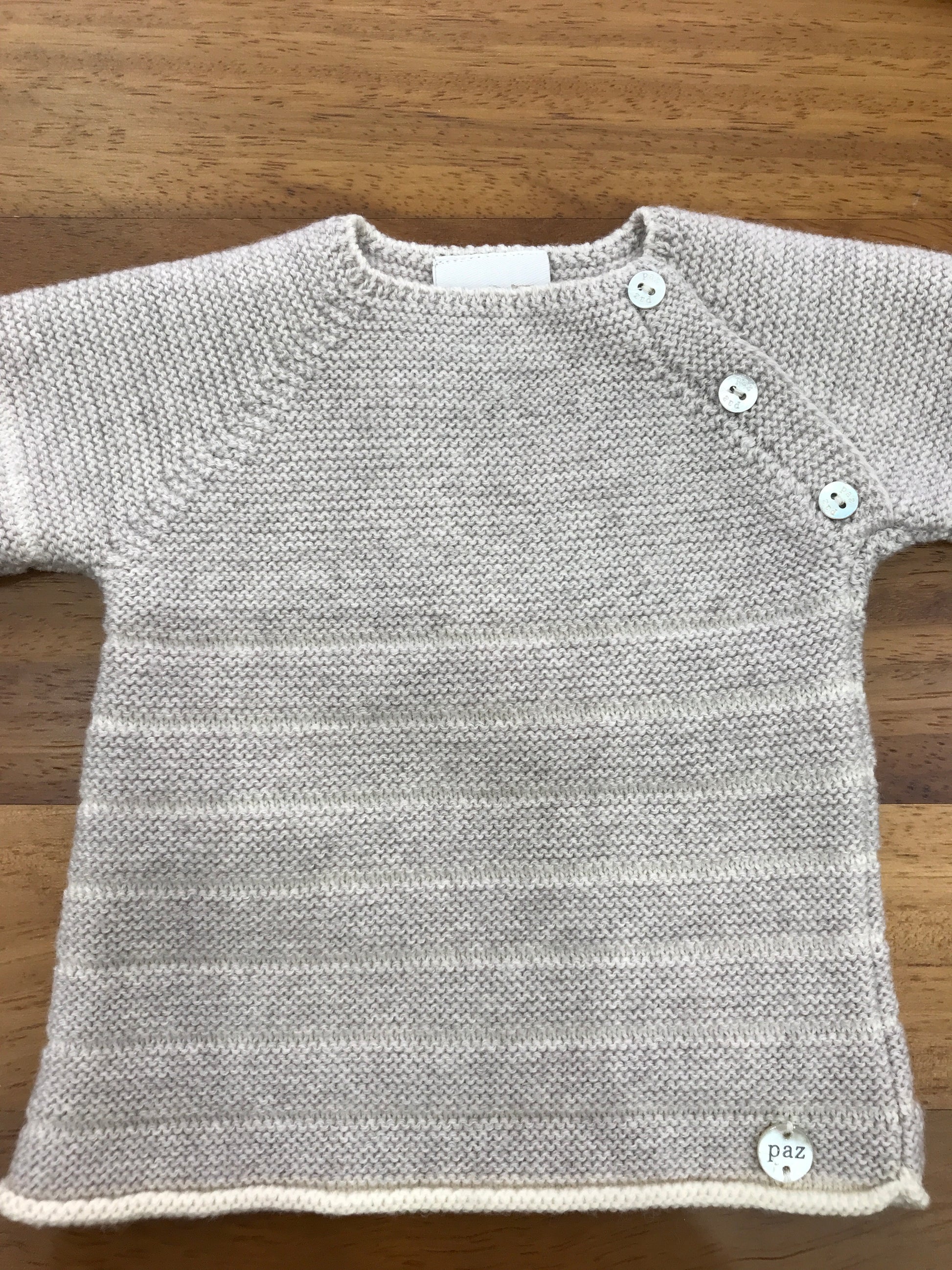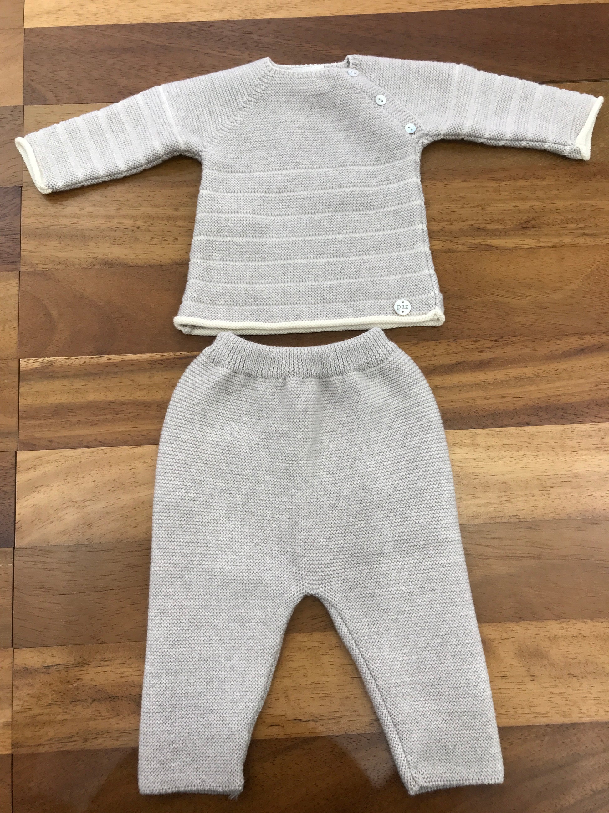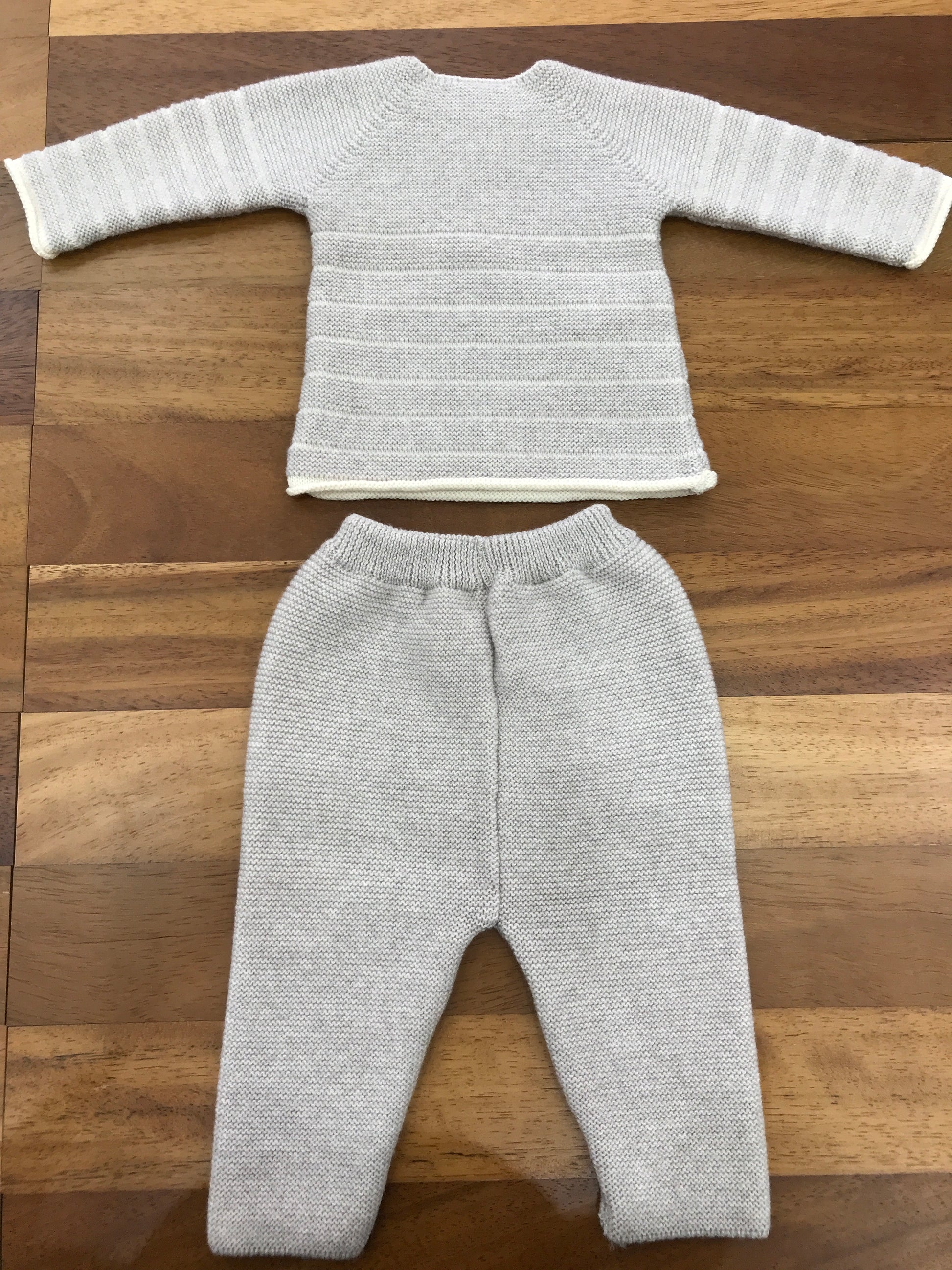 Completo due pezzi in lana privo di piedini e collo, con la parte superiore caratterizzata da strisce di tonalità più chiara.