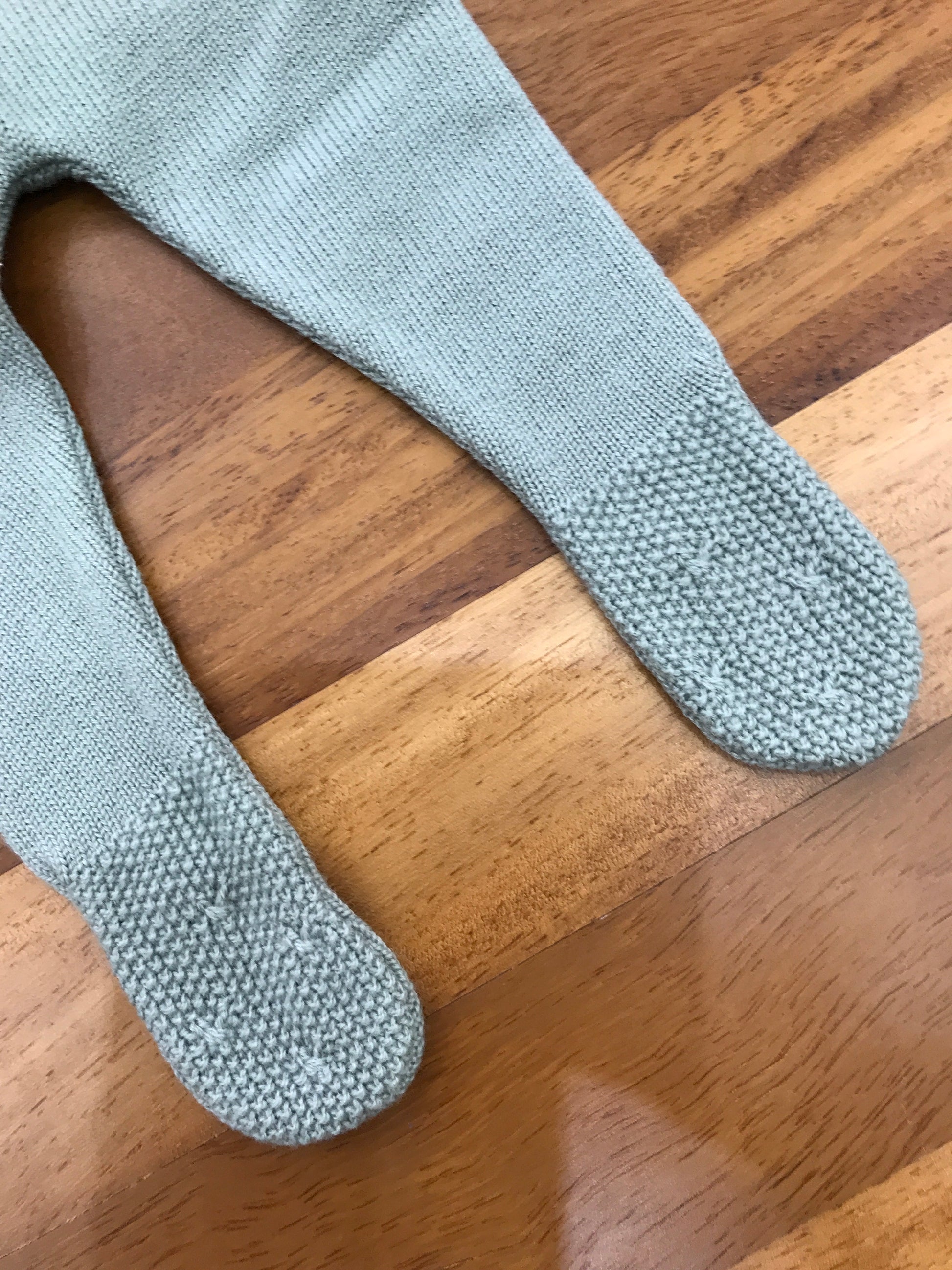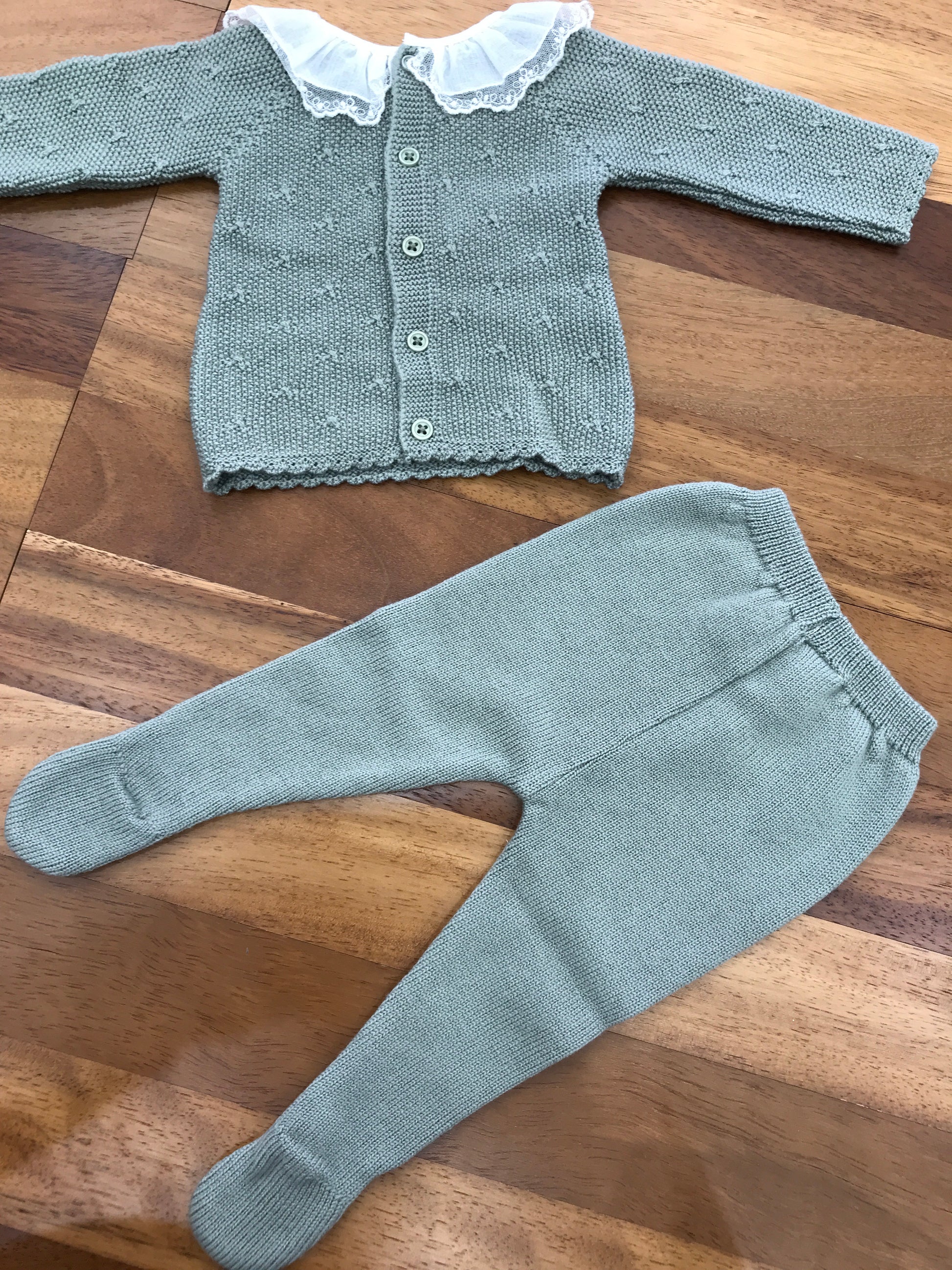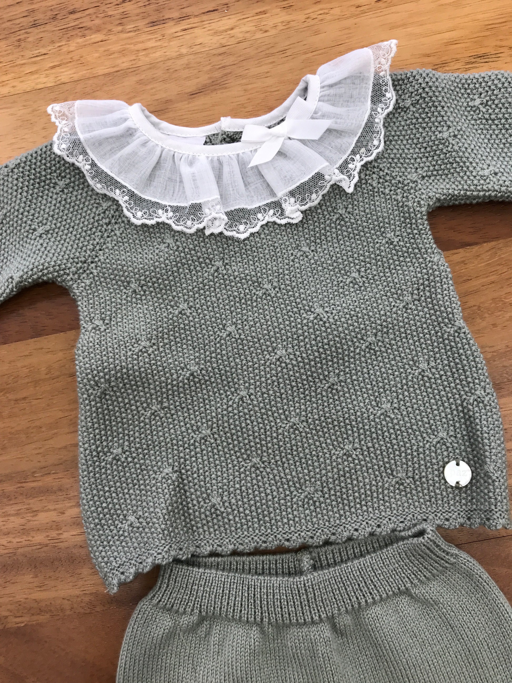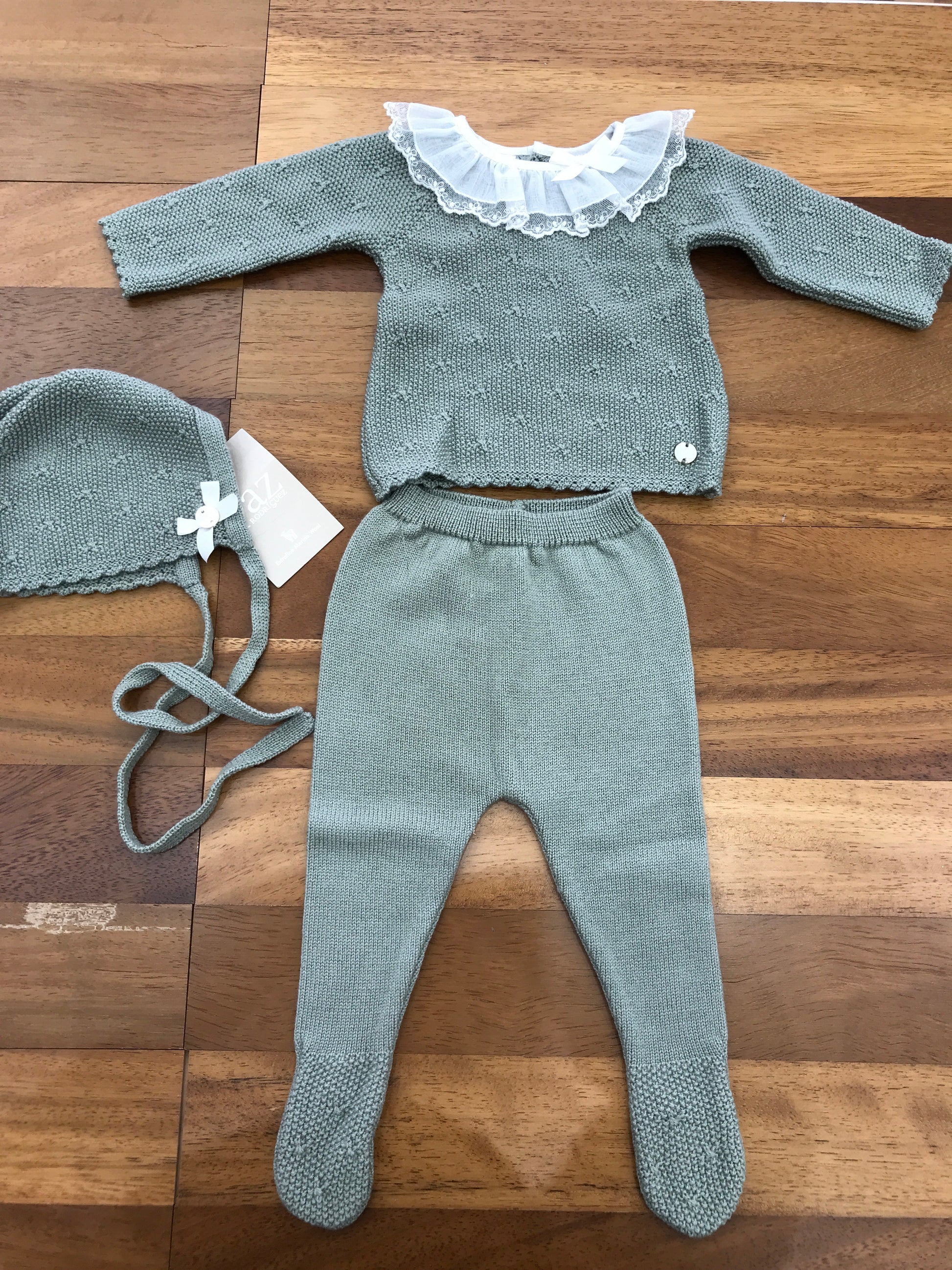 Completo tre pezzi Paz Rodriguez in maglia, composto da body con colletto in pizzo bianco ricamato e copripiedi coordinati. Include una cuffietta abbinata con chiusura a fiocco, anch’essa realizzata a maglia, per un look elegante e confortevole.