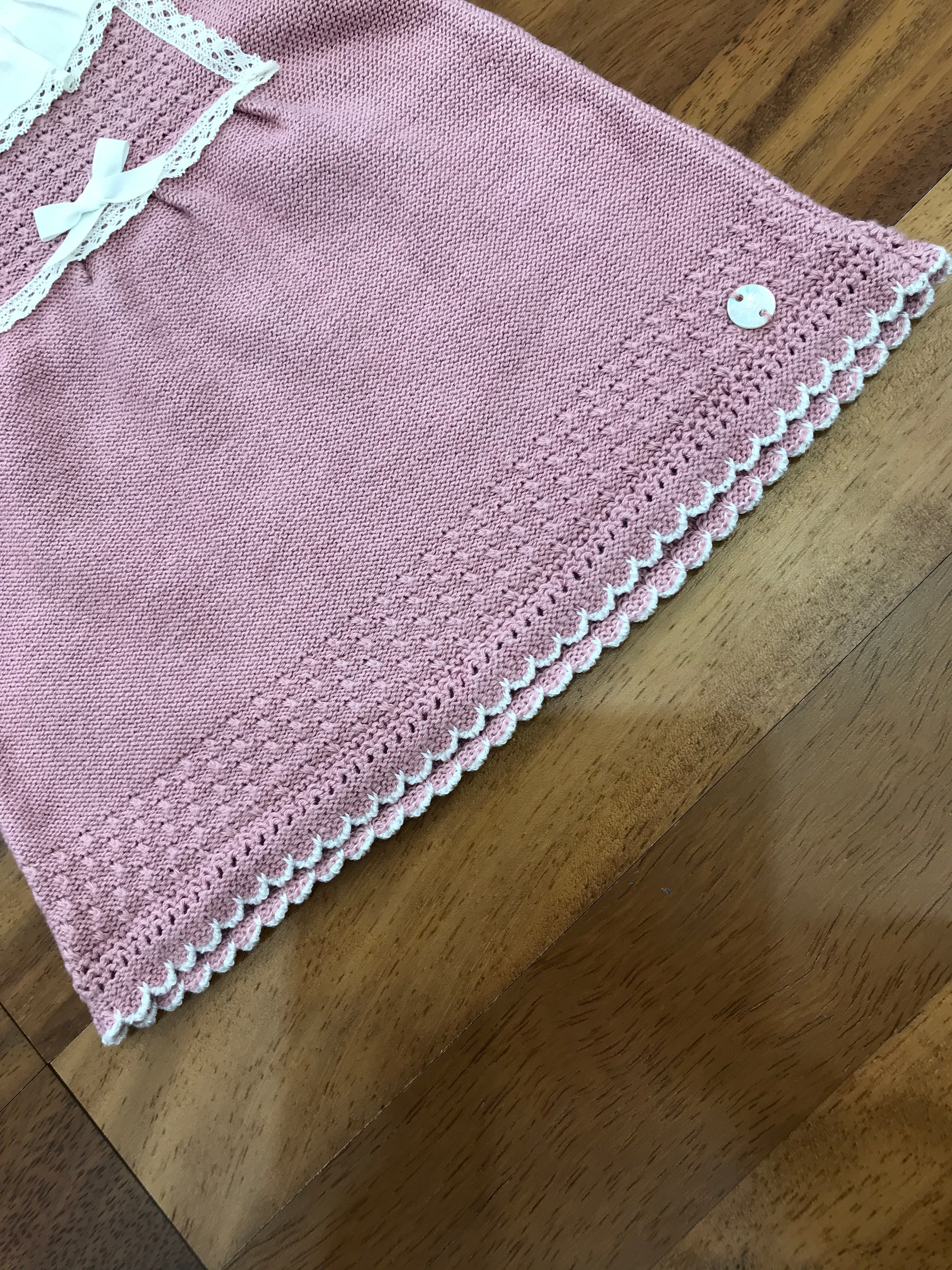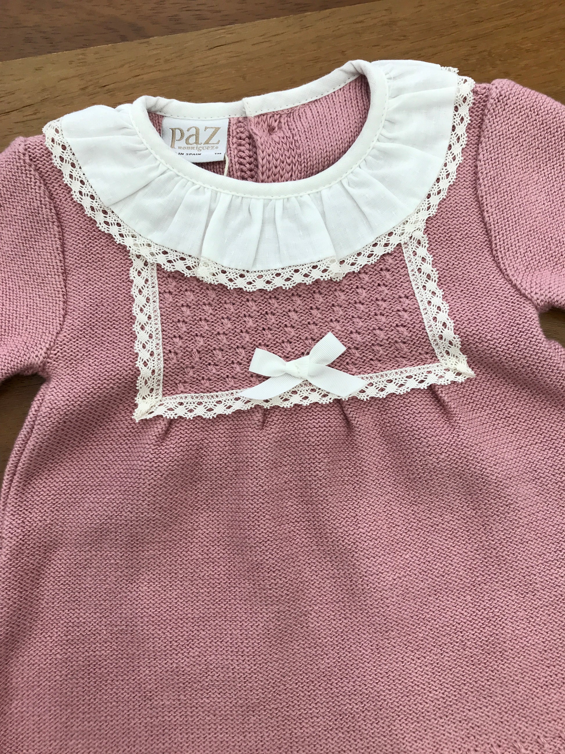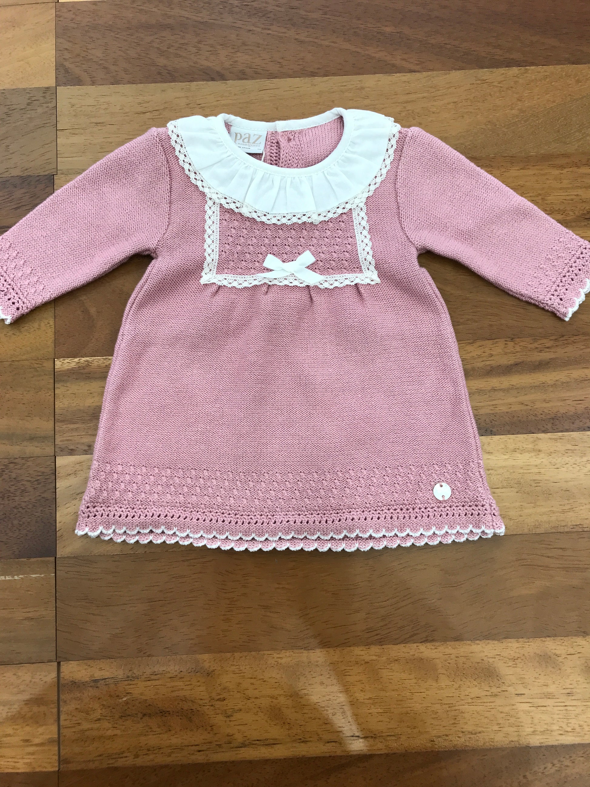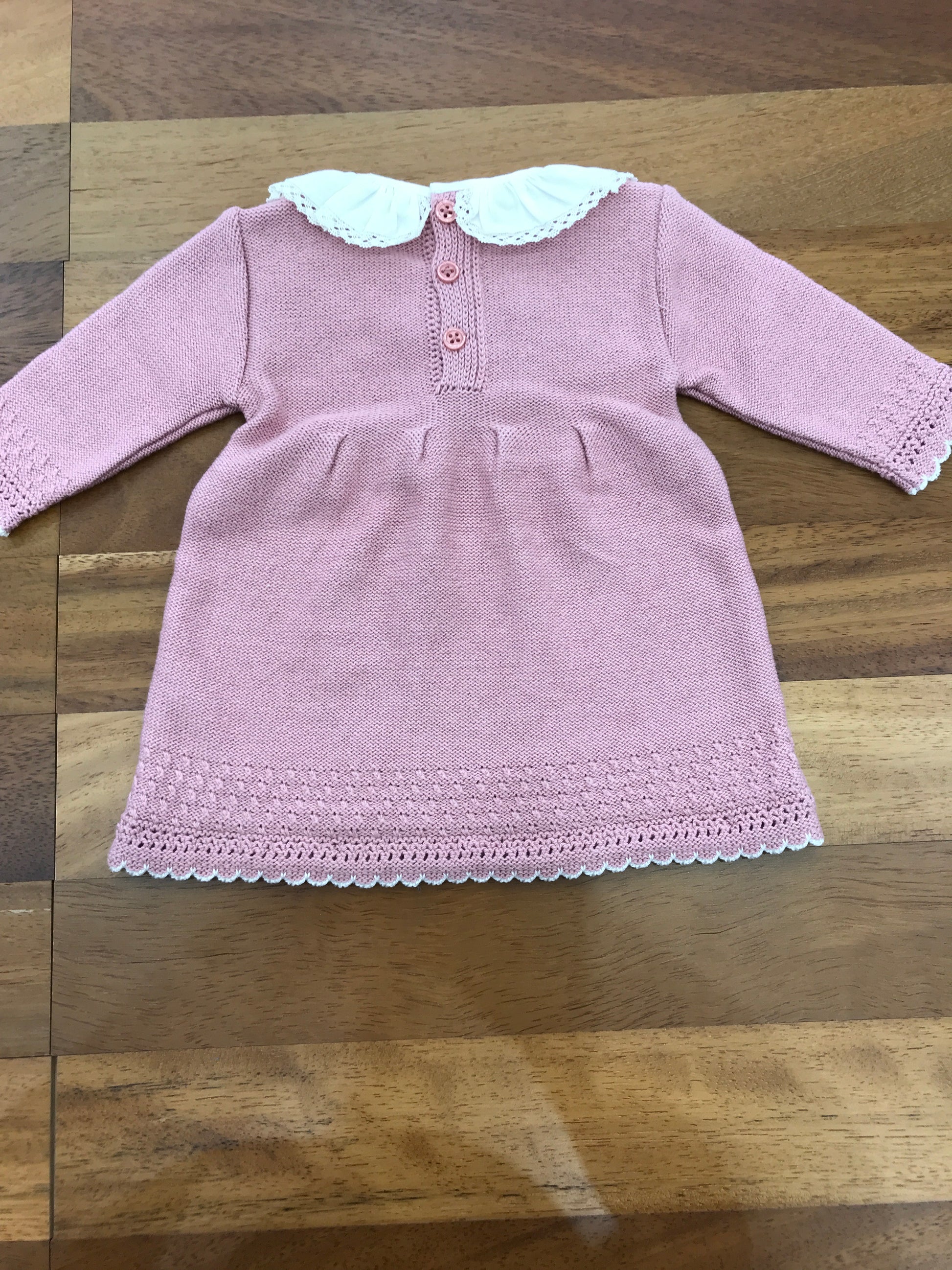 Questo vestitino in lana presenta una lavorazione a maglia sul fondo, impreziosita da un raffinato bordo in merletto. Il colletto bianco, anch’esso decorato con merletto, aggiunge un tocco di eleganza, mentre la parte frontale centrale è arricchita da dettagli a maglia e merletto, conferendo un design sofisticato e curato.