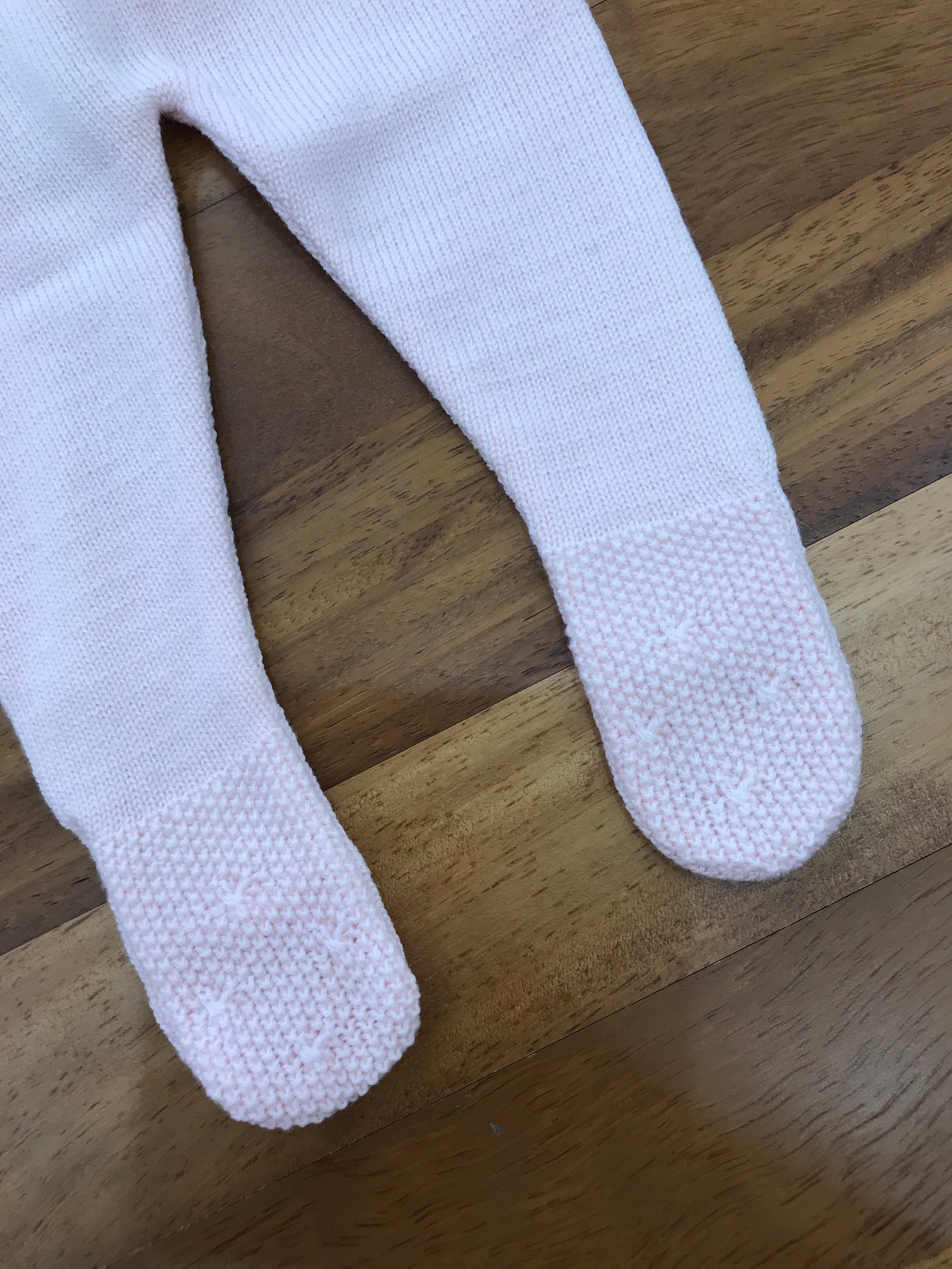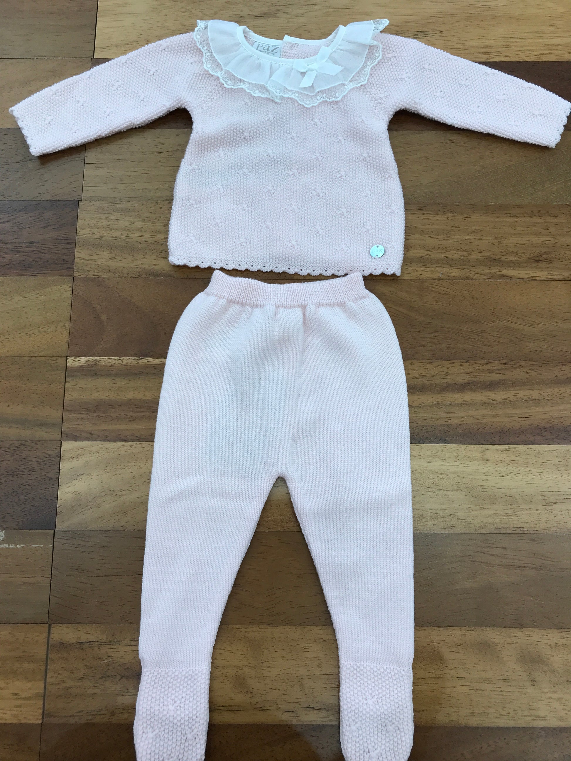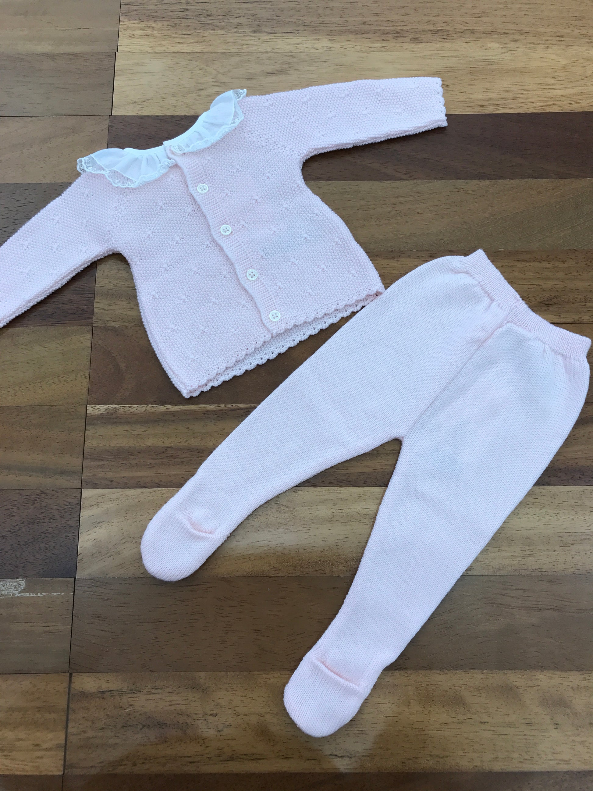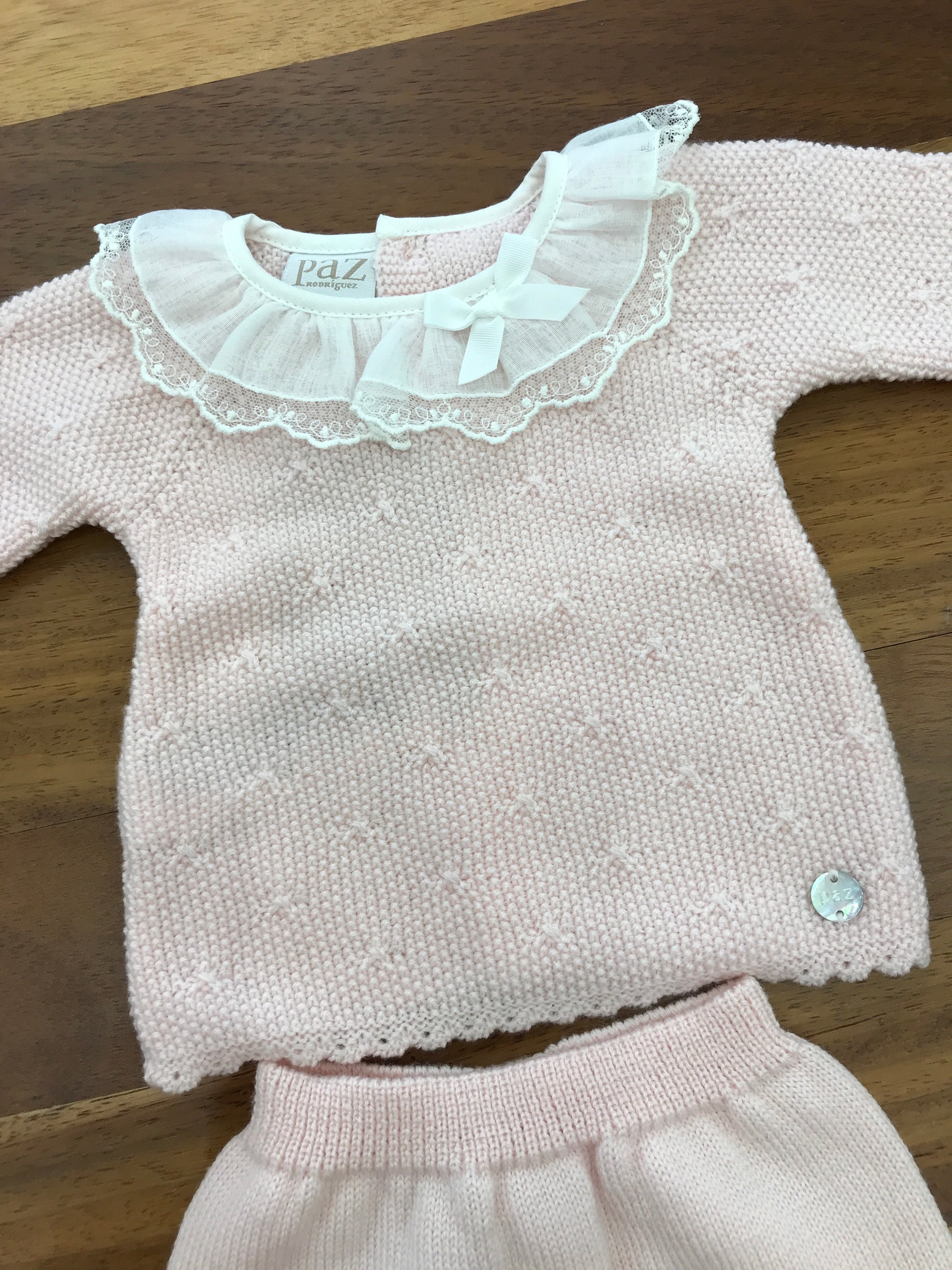 Completo due pezzi in lana con piedini lavorati a maglia, caratterizzato da un colletto decorato con merletto e un piccolo fiocco sulla parte superiore. La maglietta presenta una lavorazione a maglia uniforme su tutta la superficie, garantendo comfort e stile raffinato.