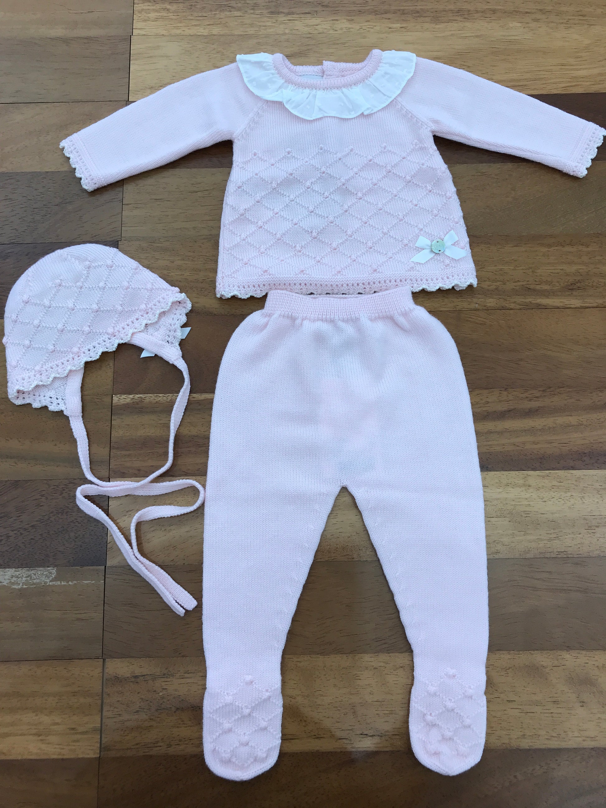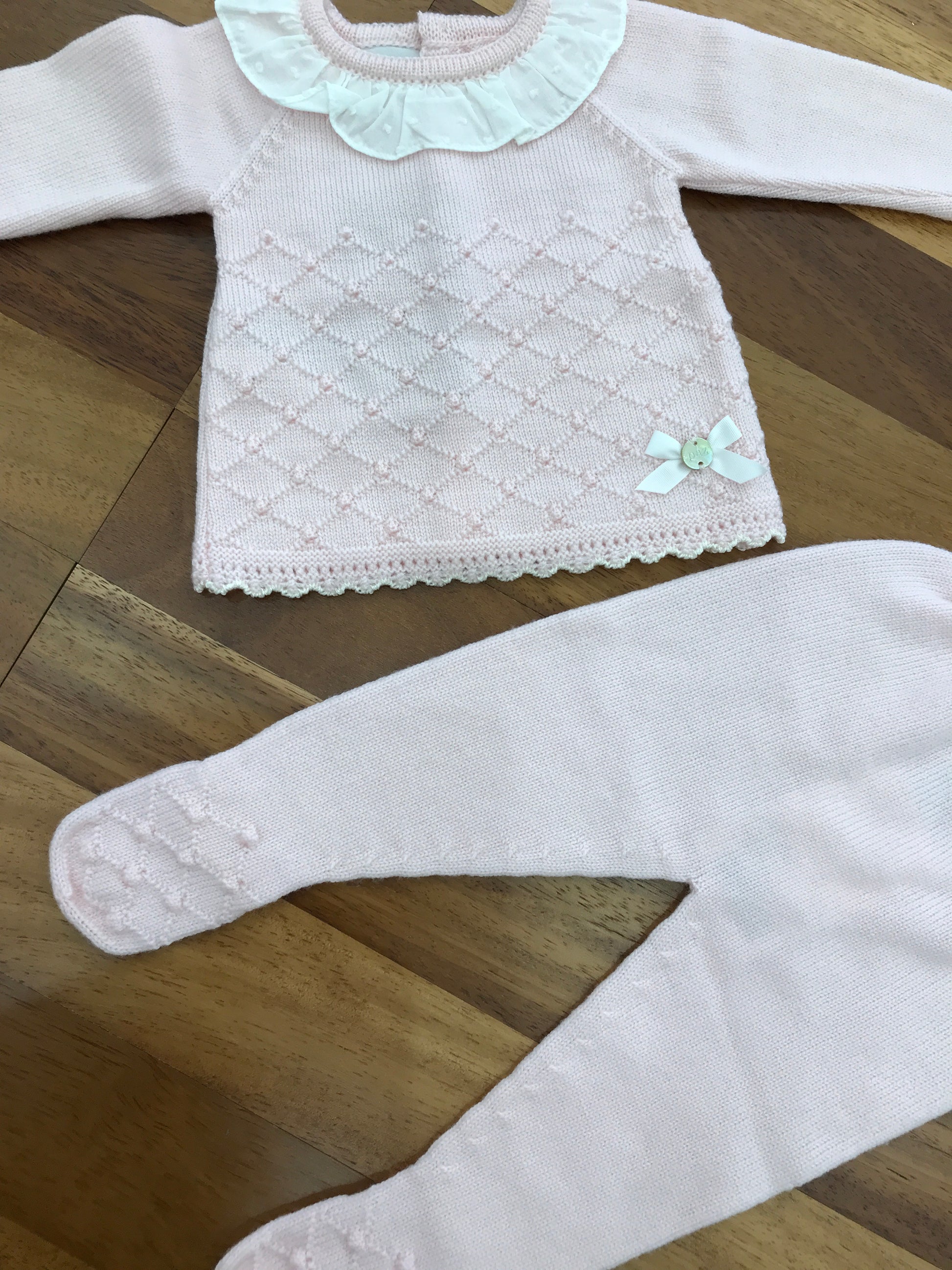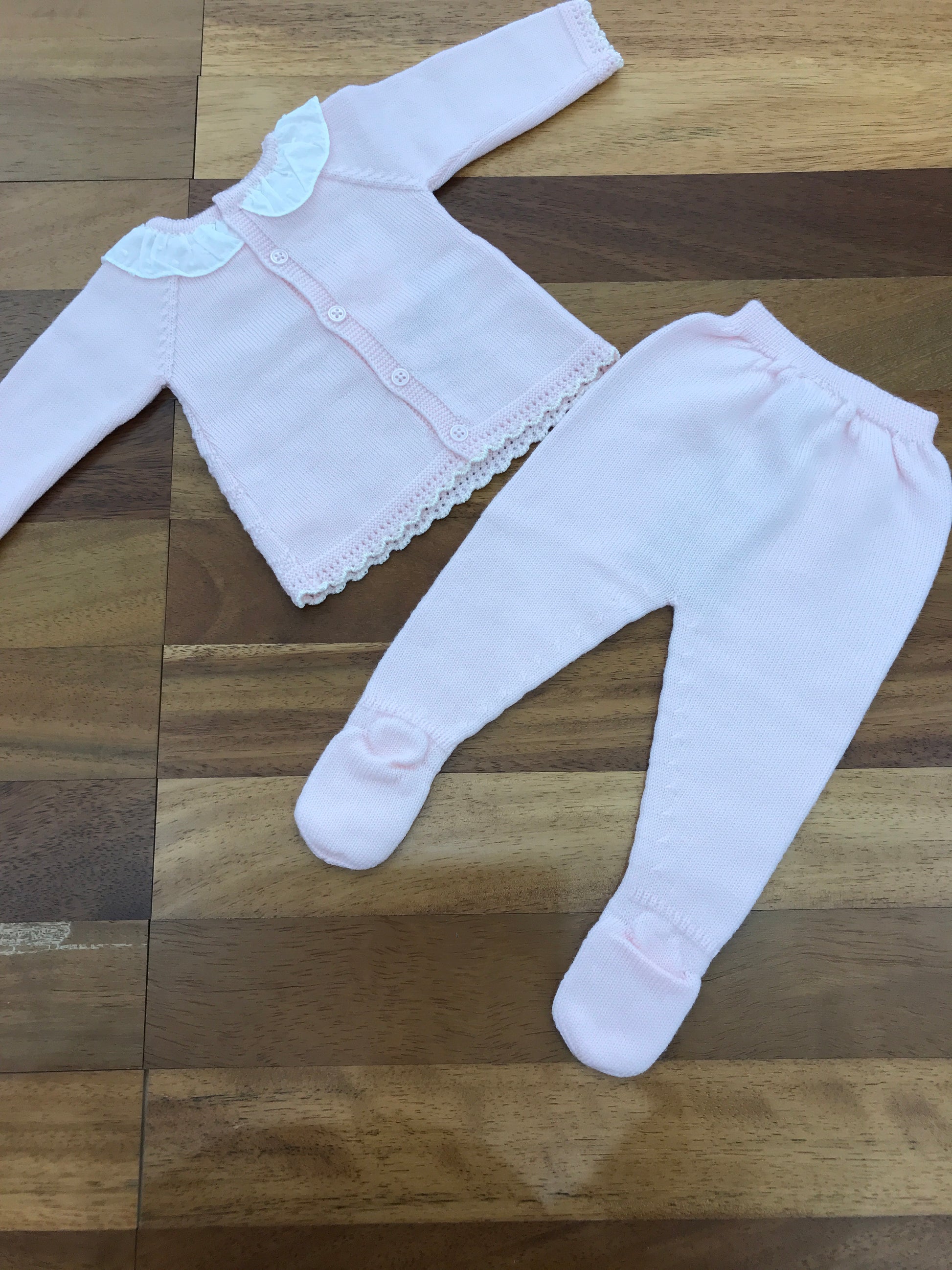 Completo due pezzi in lana caratterizzato da una raffinata lavorazione a maglia sui piedini, che aggiunge un tocco di eleganza e comfort. La parte superiore è impreziosita da un colletto delicatamente rifinito con merletto, mentre l’intera superficie del sopra presenta una lavorazione a maglia uniforme, garantendo un design armonioso e una vestibilità confortevole per il bambino.